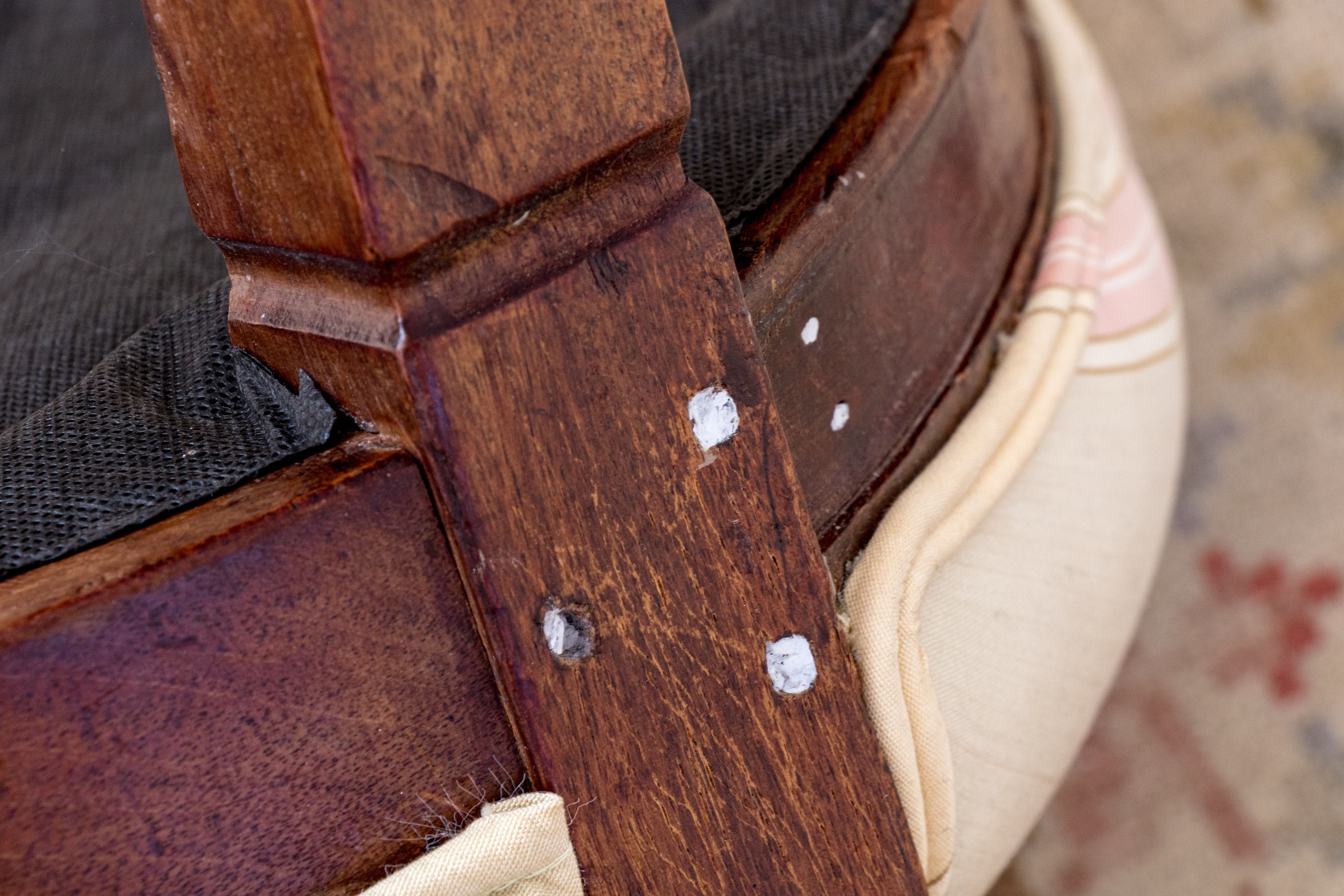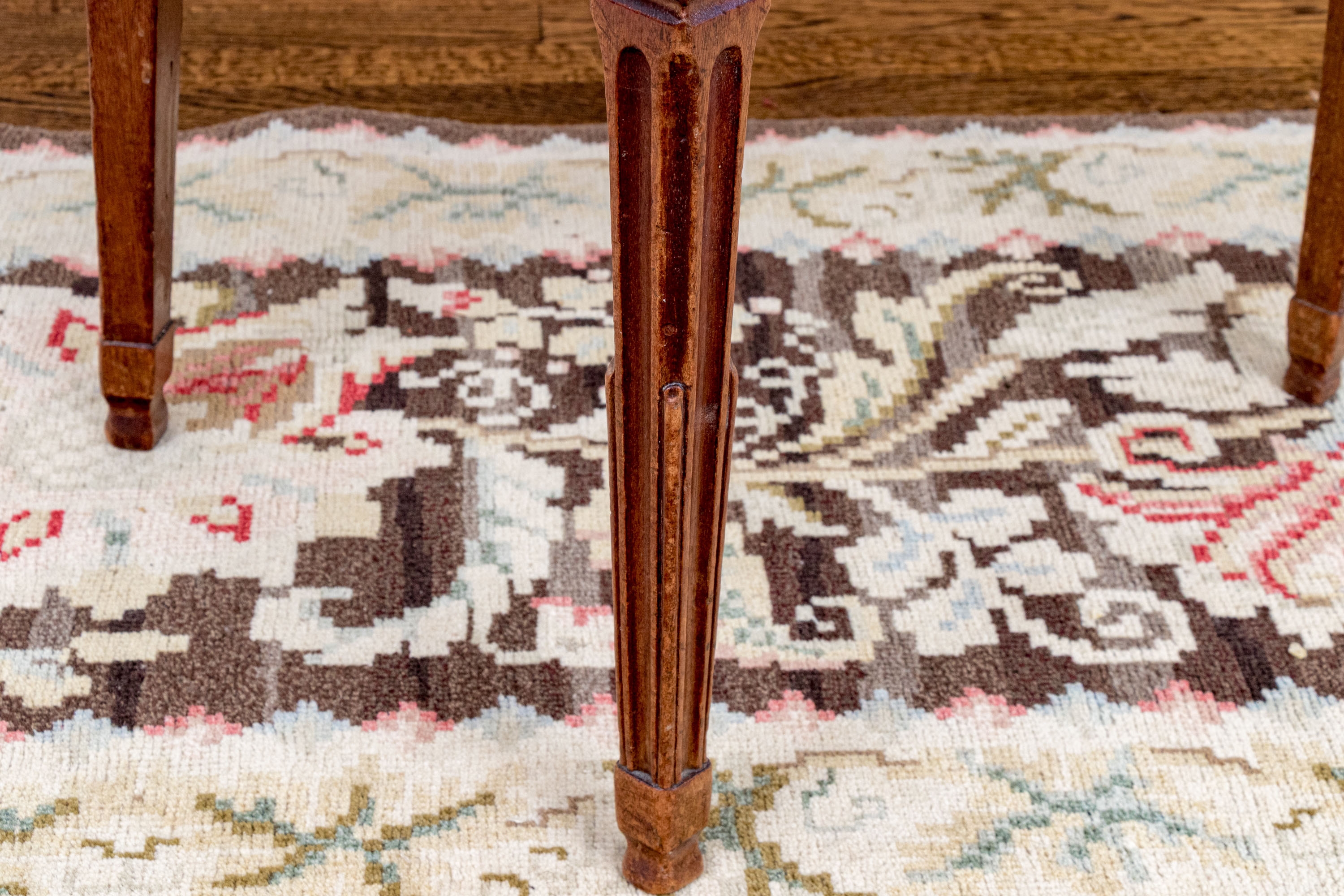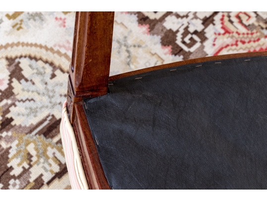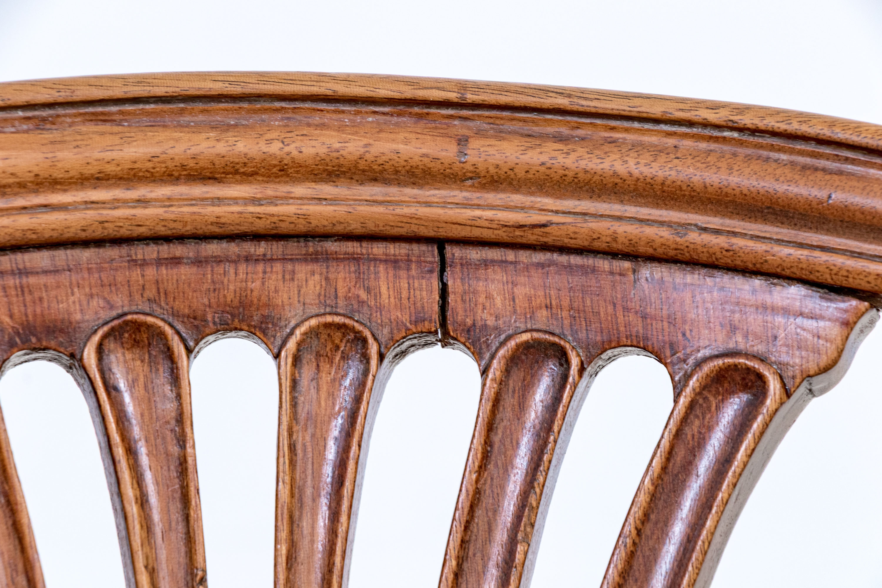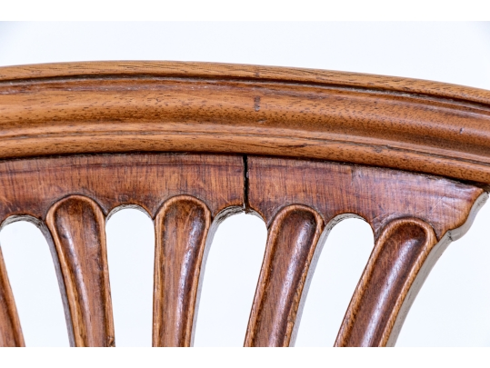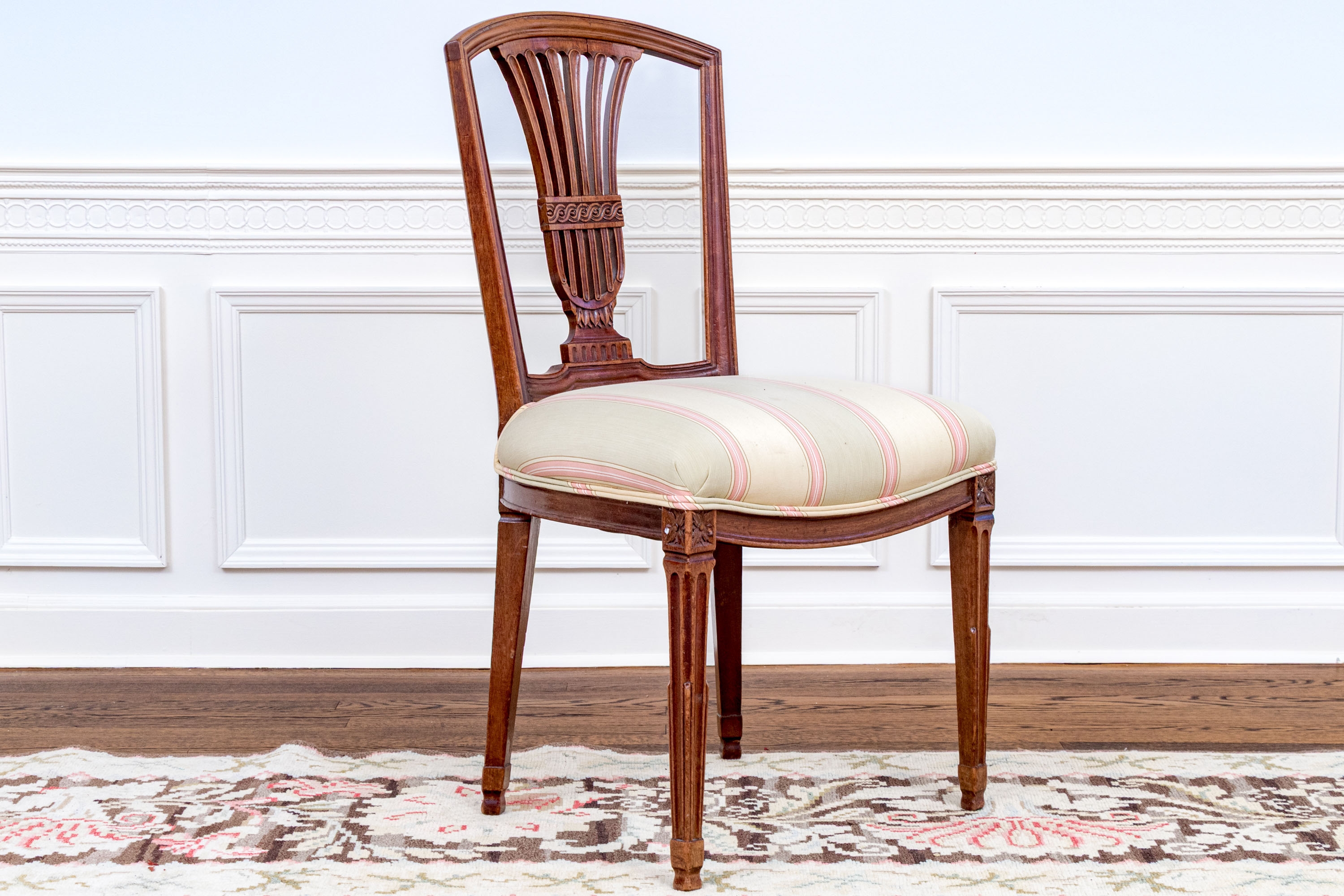 Condition: Please review the detail photos. Various signs of age and use include a repair to one back leg with dowels retouched. Cracks and a small loss to one crest rail. Some expected scrapes to some legs and feet. Stains on most seats. Fine finishes on the gently used frames.