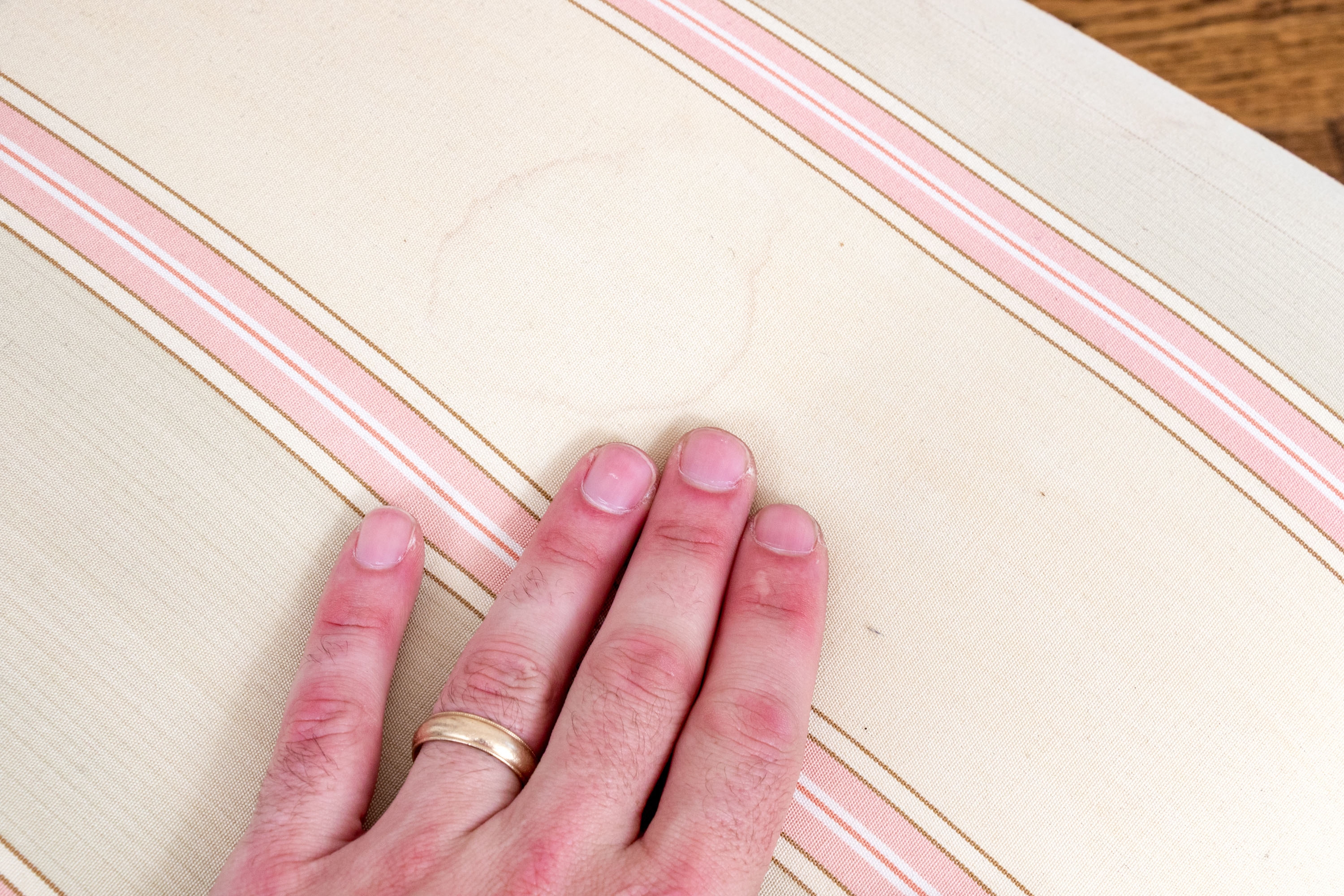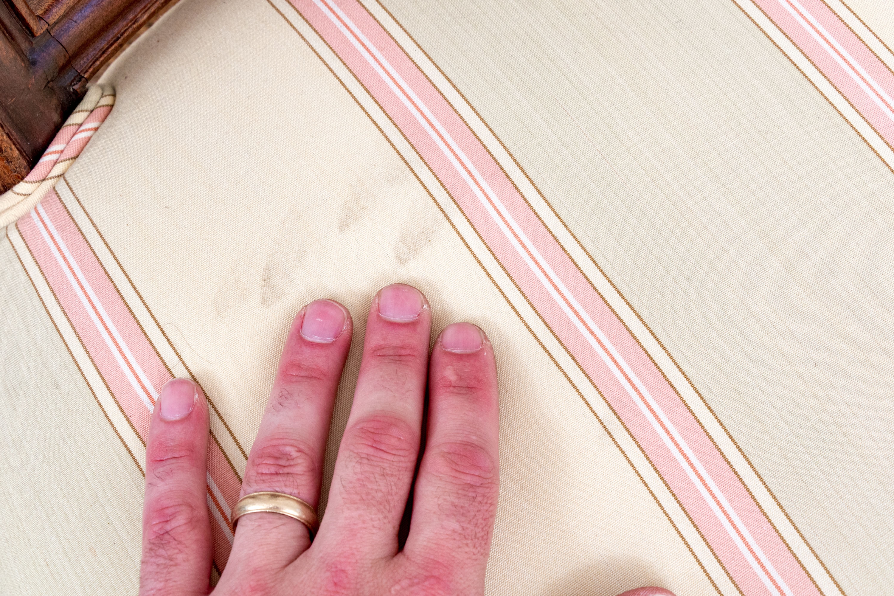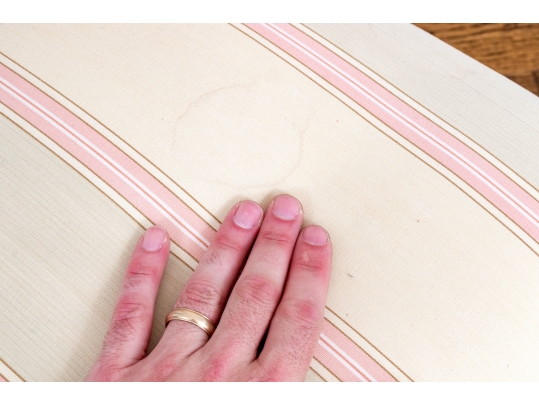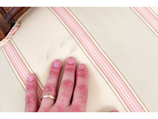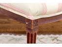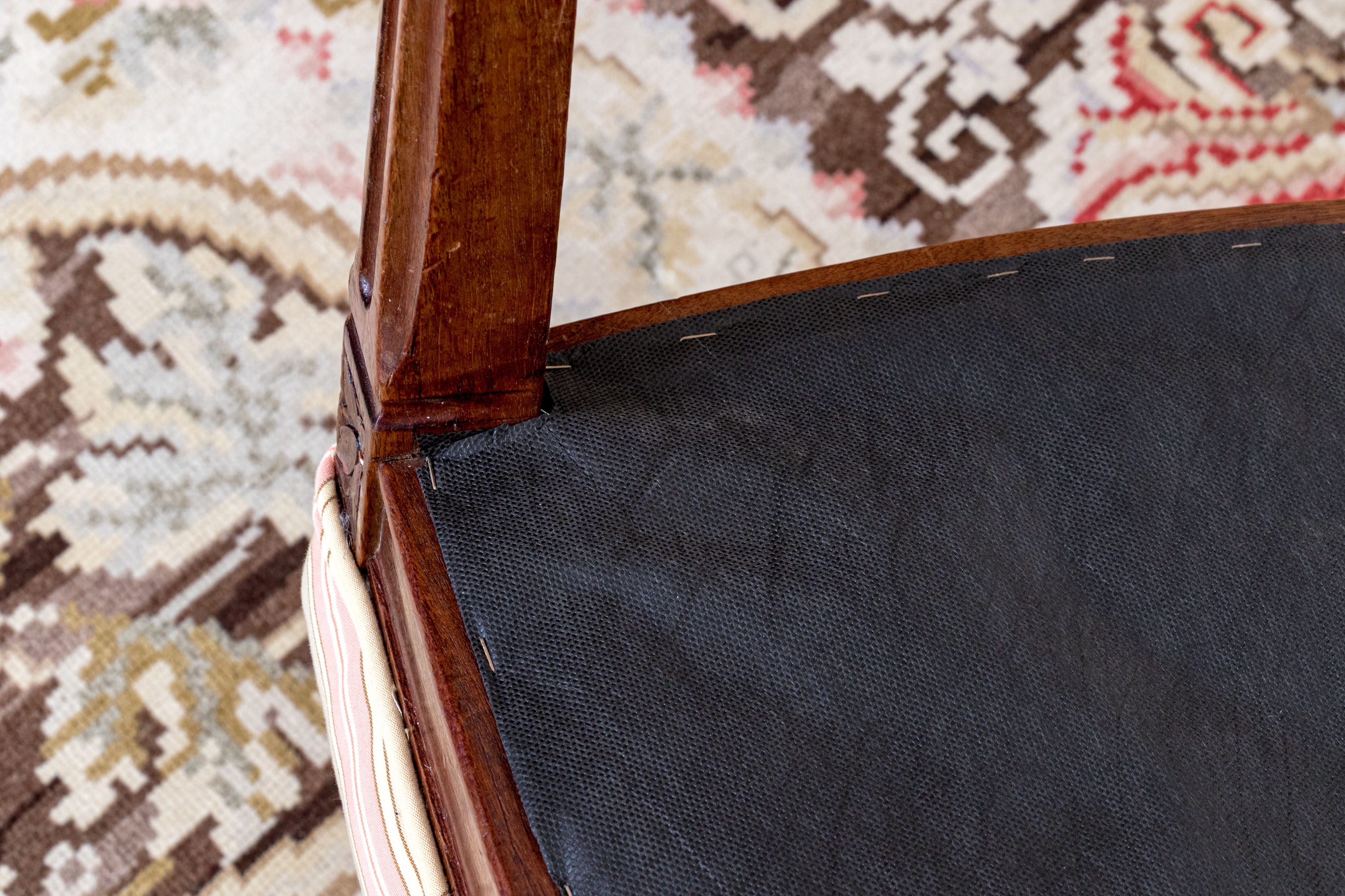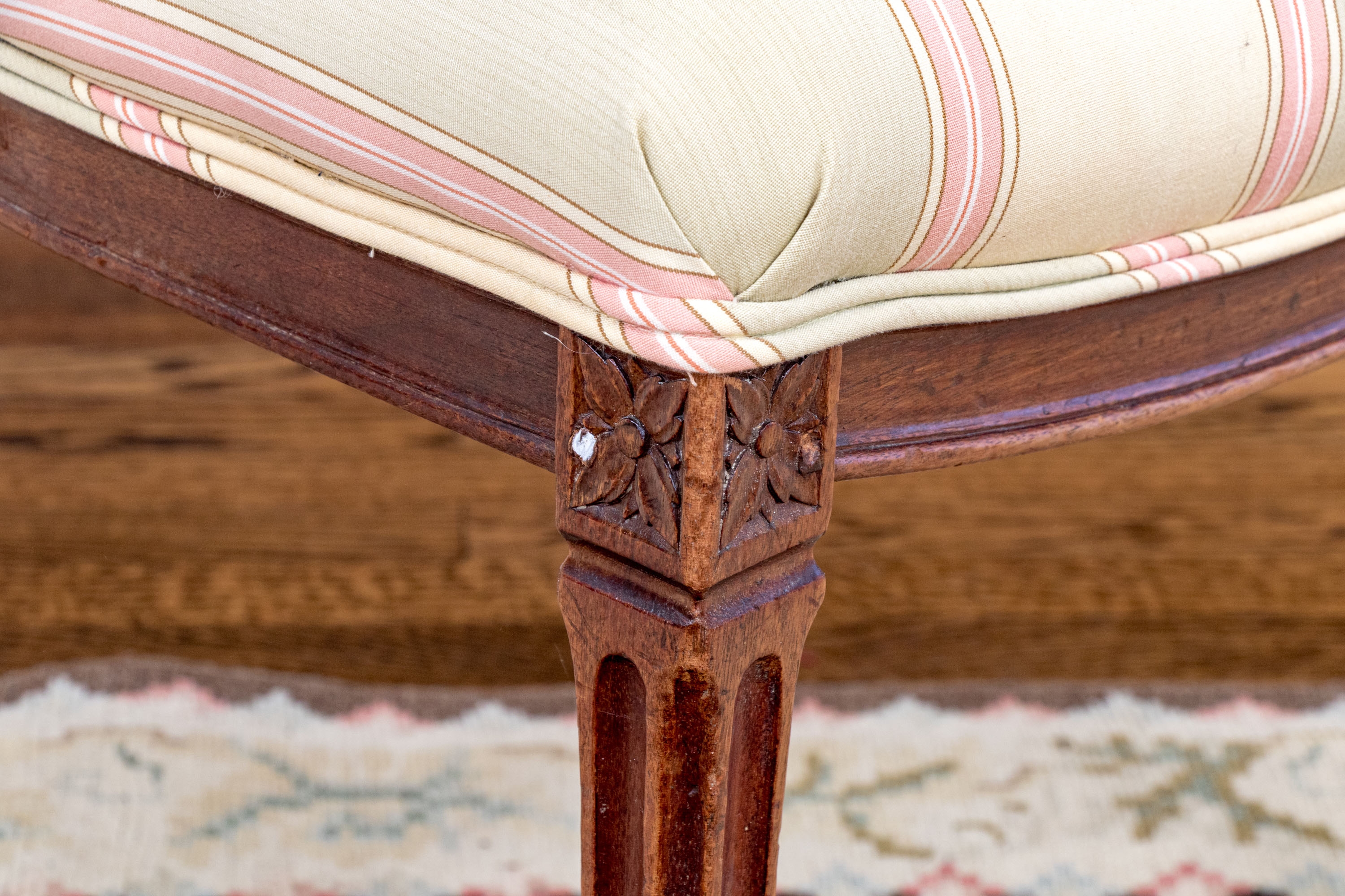 Condition: Please review the detail photos. Various signs of age and use include a repair to one back leg with dowels retouched. Cracks and a small loss to one crest rail. Some expected scrapes to some legs and feet. Stains on most seats. Fine finishes on the gently used frames.
