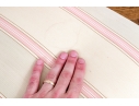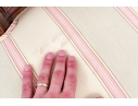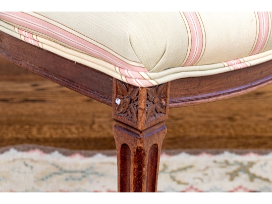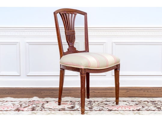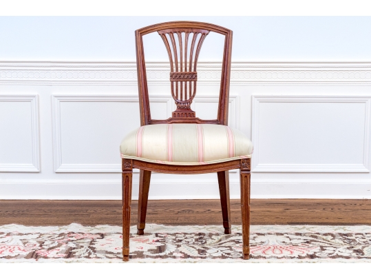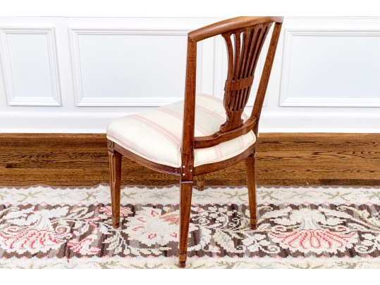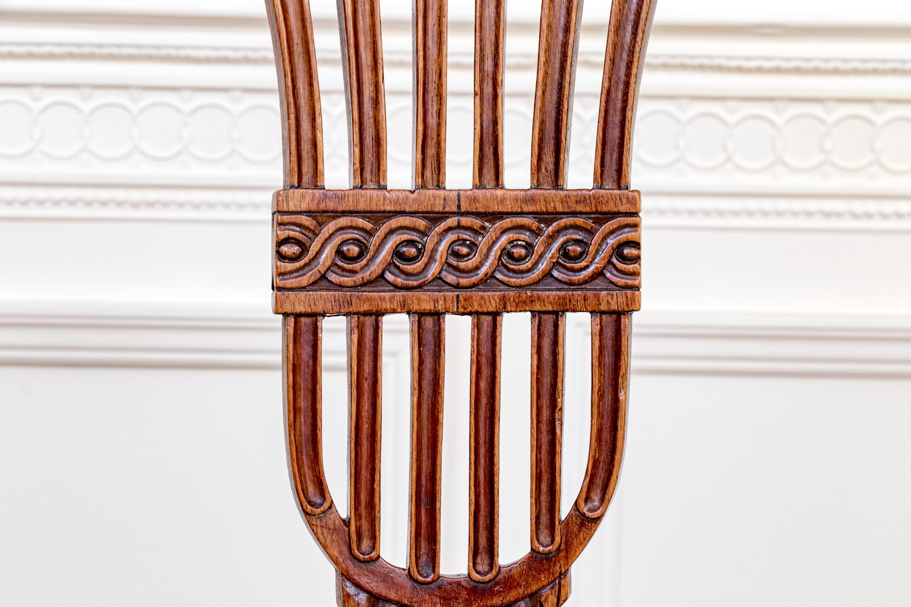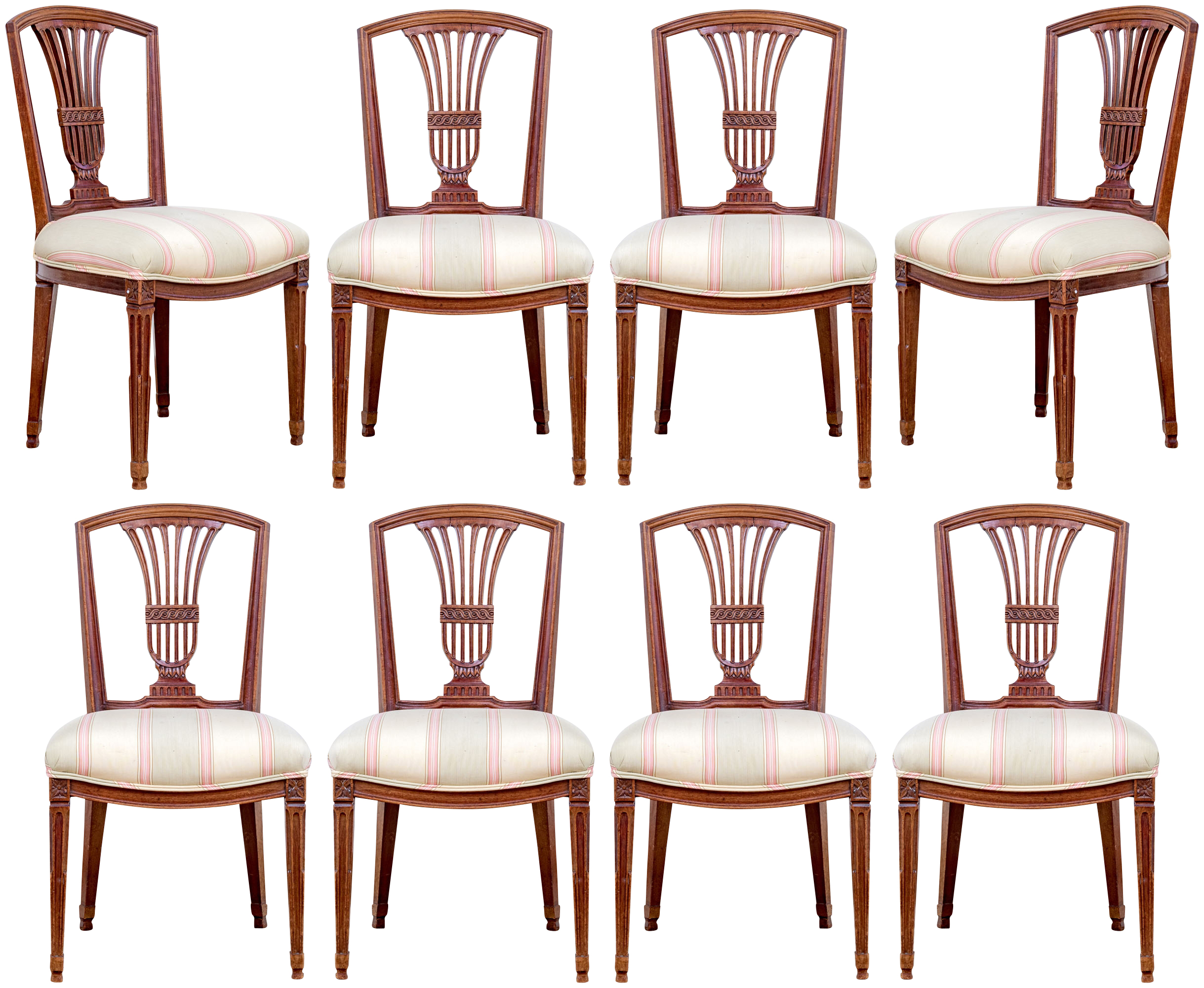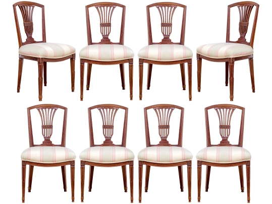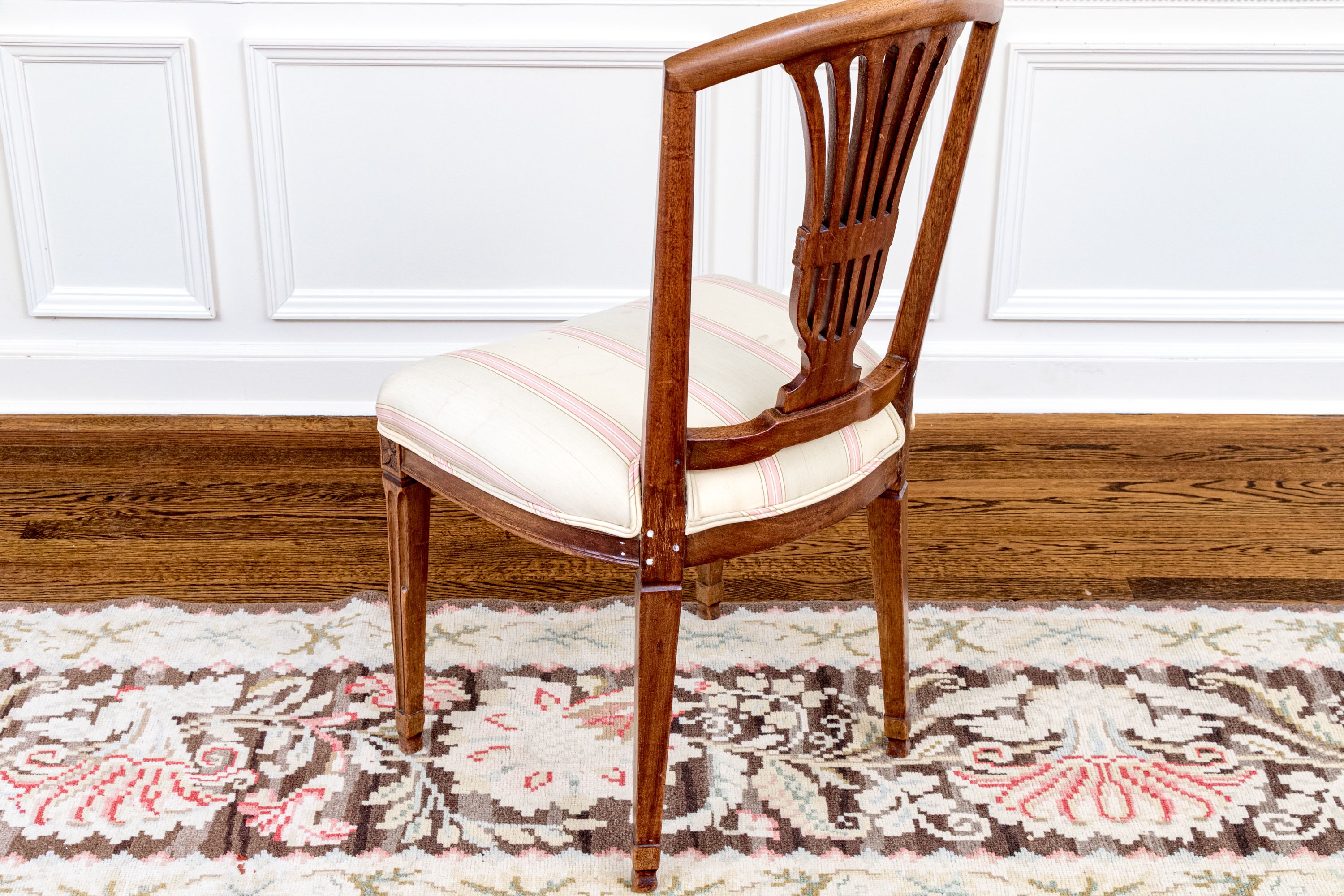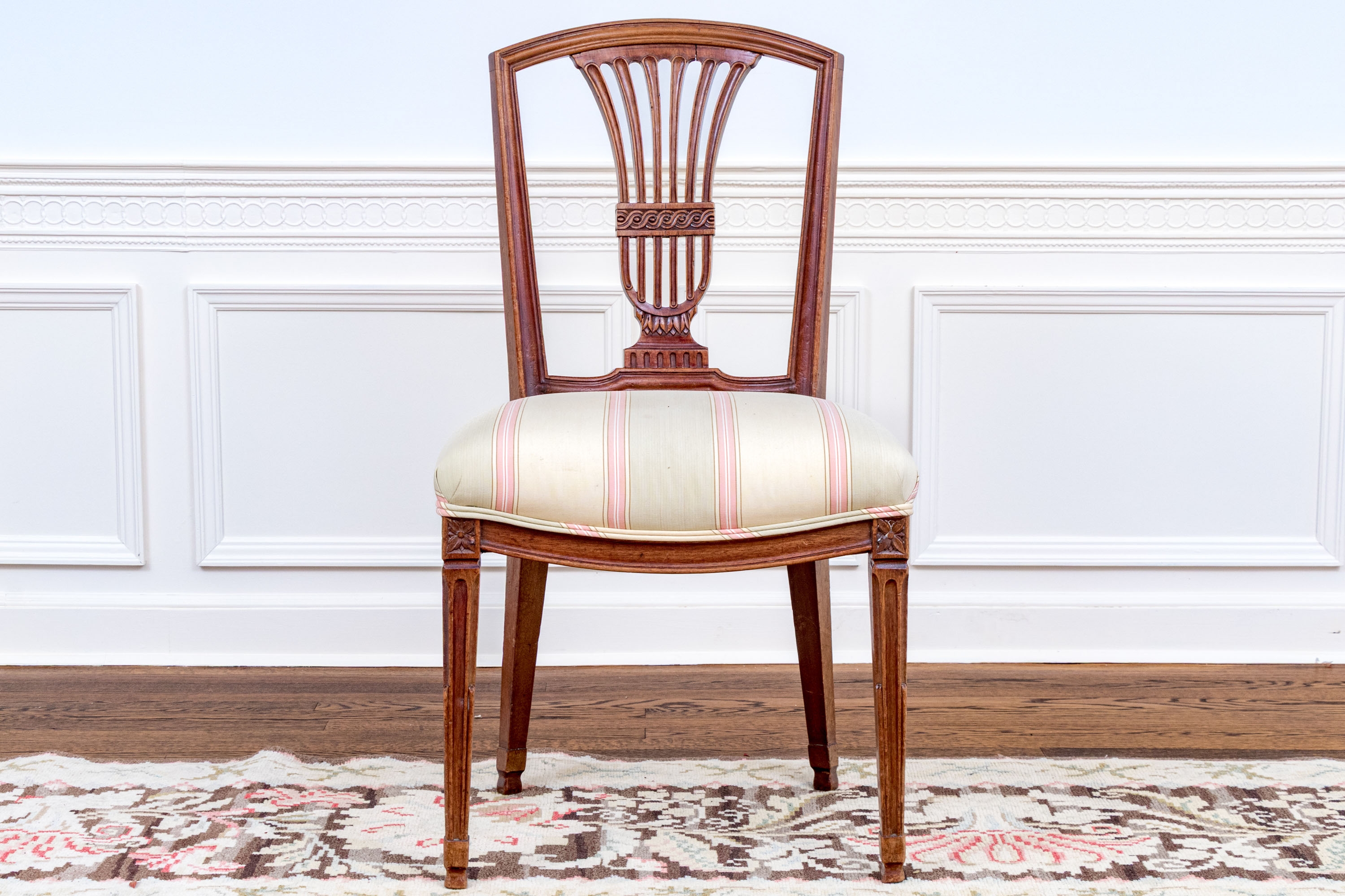 A set of eight finely crafted Hepplewhite style mahogany dining side chairs. Each with carved frames and openwork back splats with a running scroll band and leaves. Raised on square tapering legs, the front ones fluted with leaves at the tops. With custom upholstered seats in a pale yellow and pink stripe.