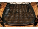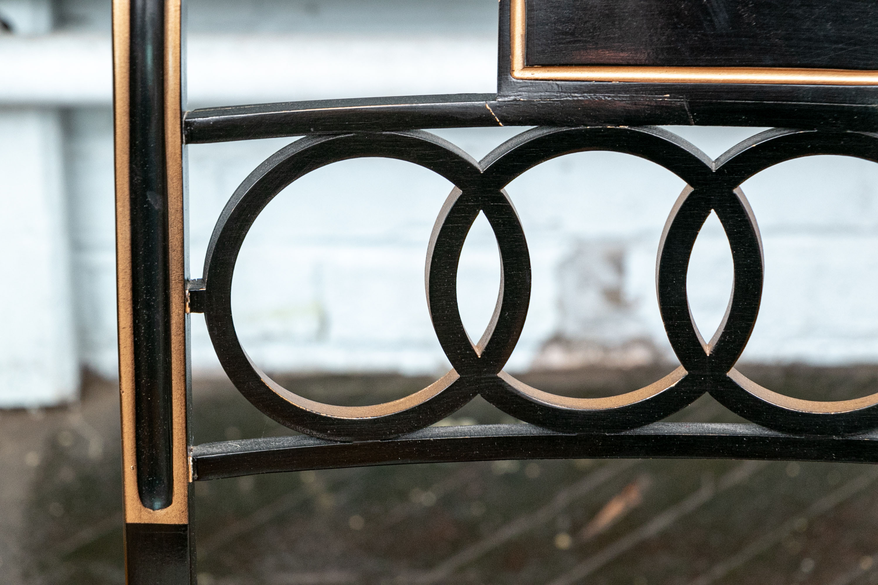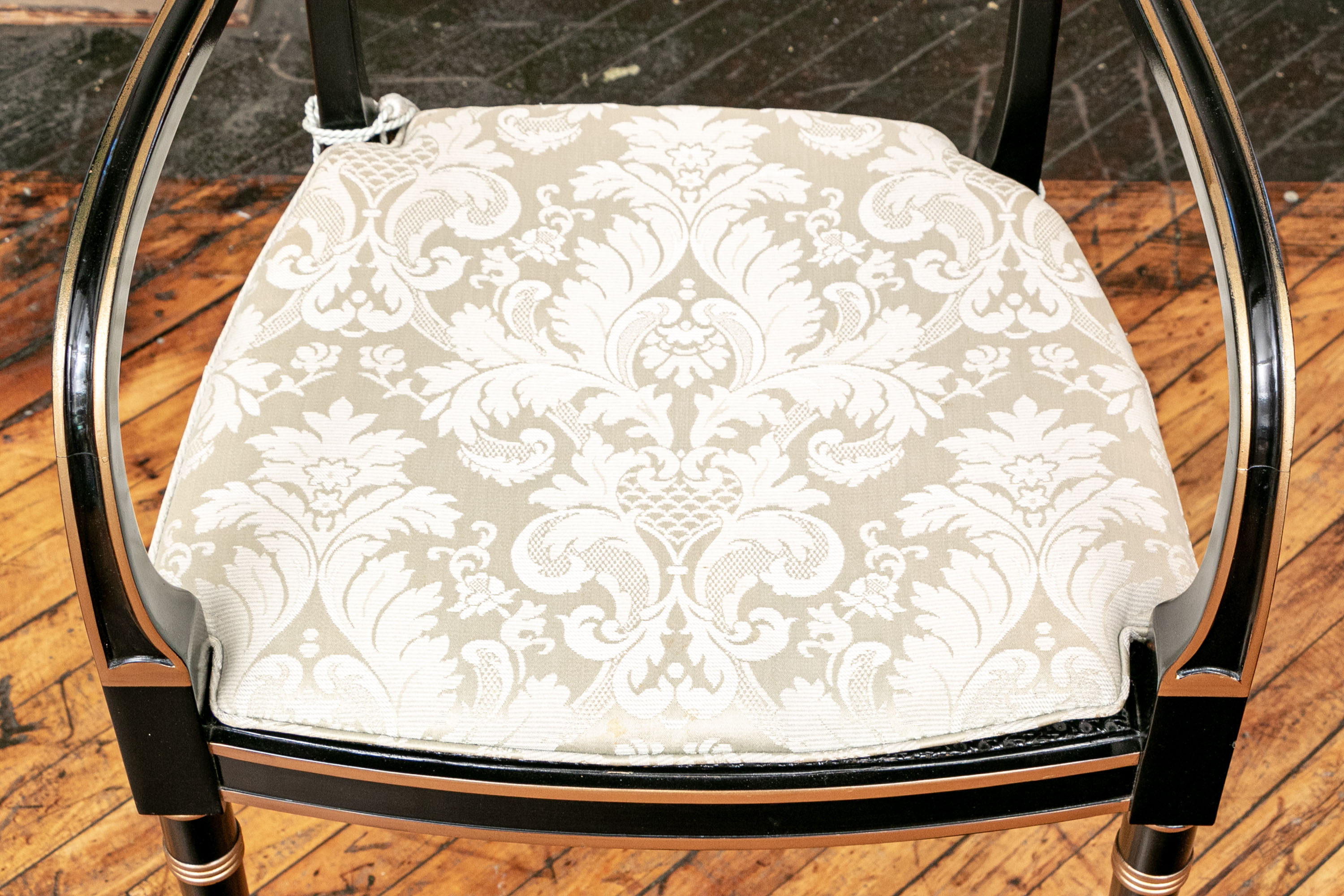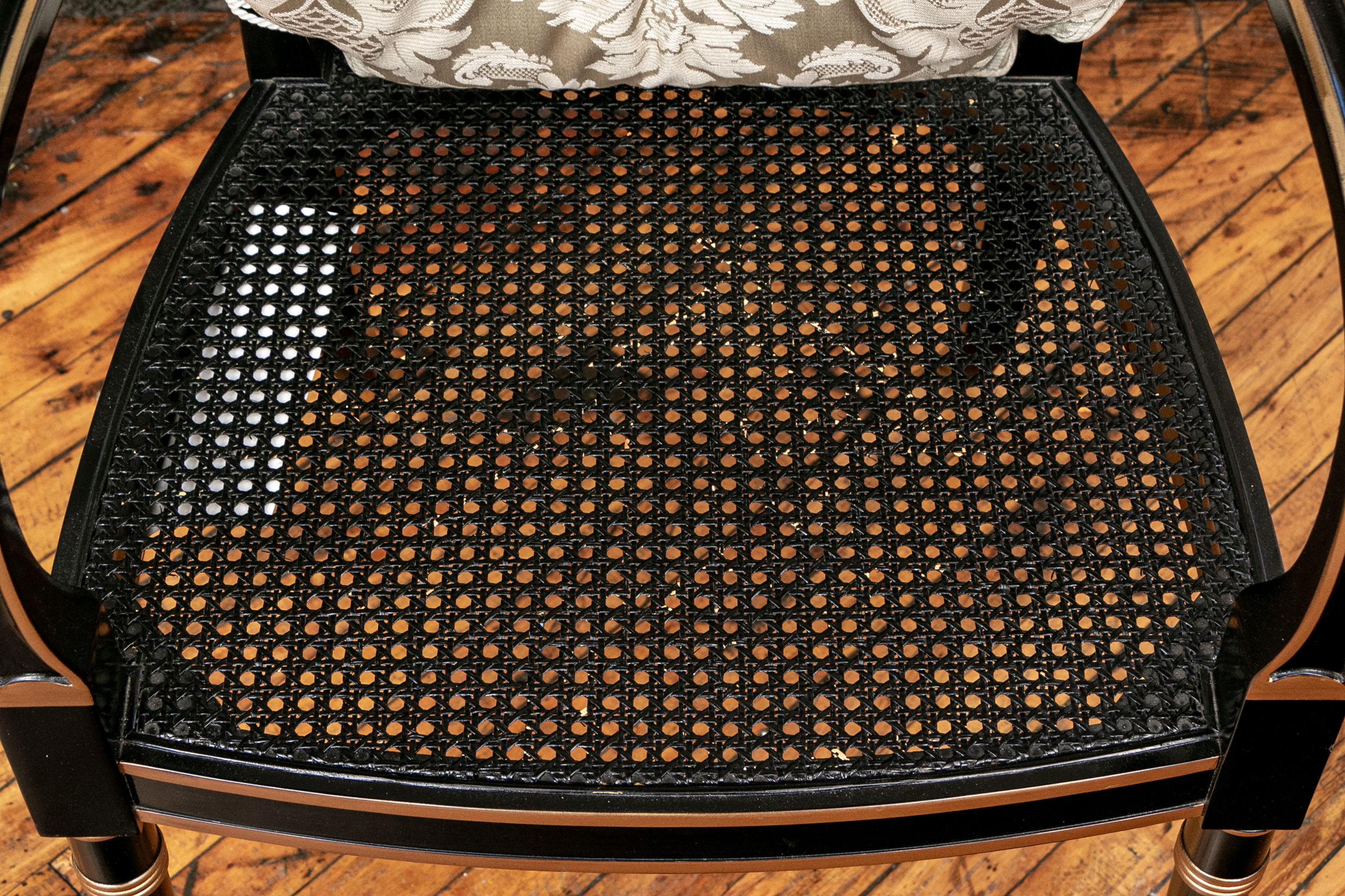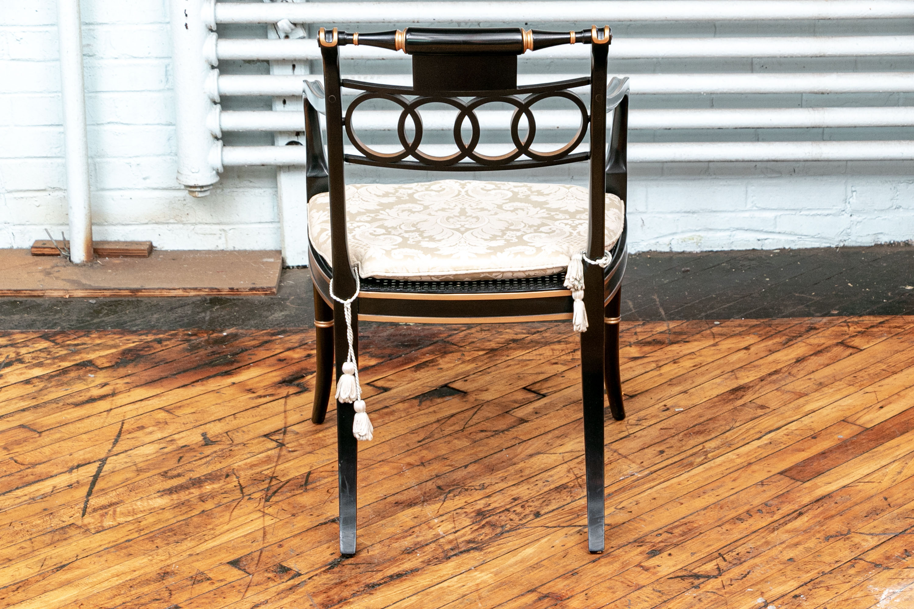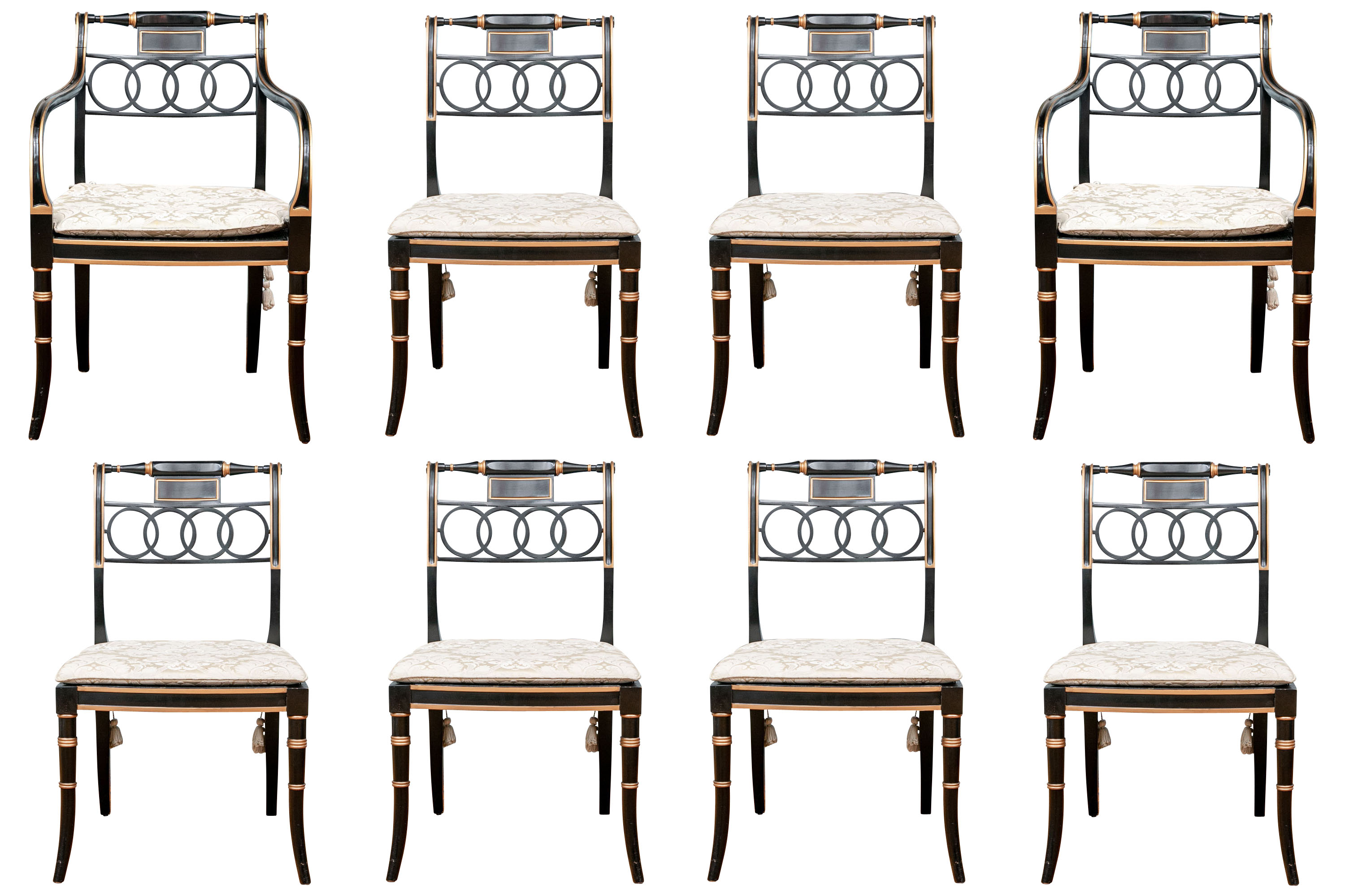 A fine set of Classic and very well made Baker Ebonized dining chairs. Including two arm and six side chairs. The black lacquered chairs in a glossy finish with fine gilt details. With turned crest rails, and decorative rectangles on the backs linking the five open overlapping circles as back supports. The arms curve into the splayed back legs, turned and splayed front legs. The black caned seats with separate cushions in a pale damask type fabric with ties and tassels.
