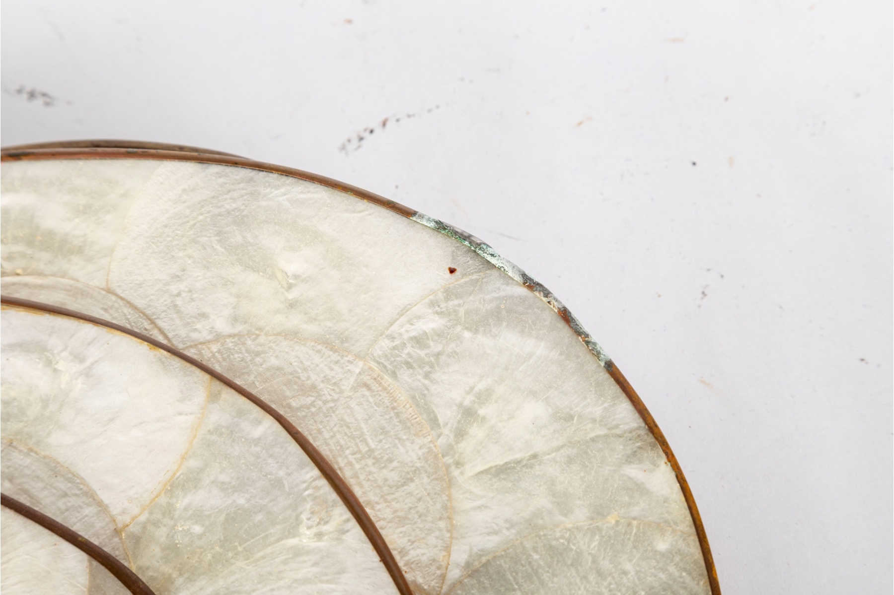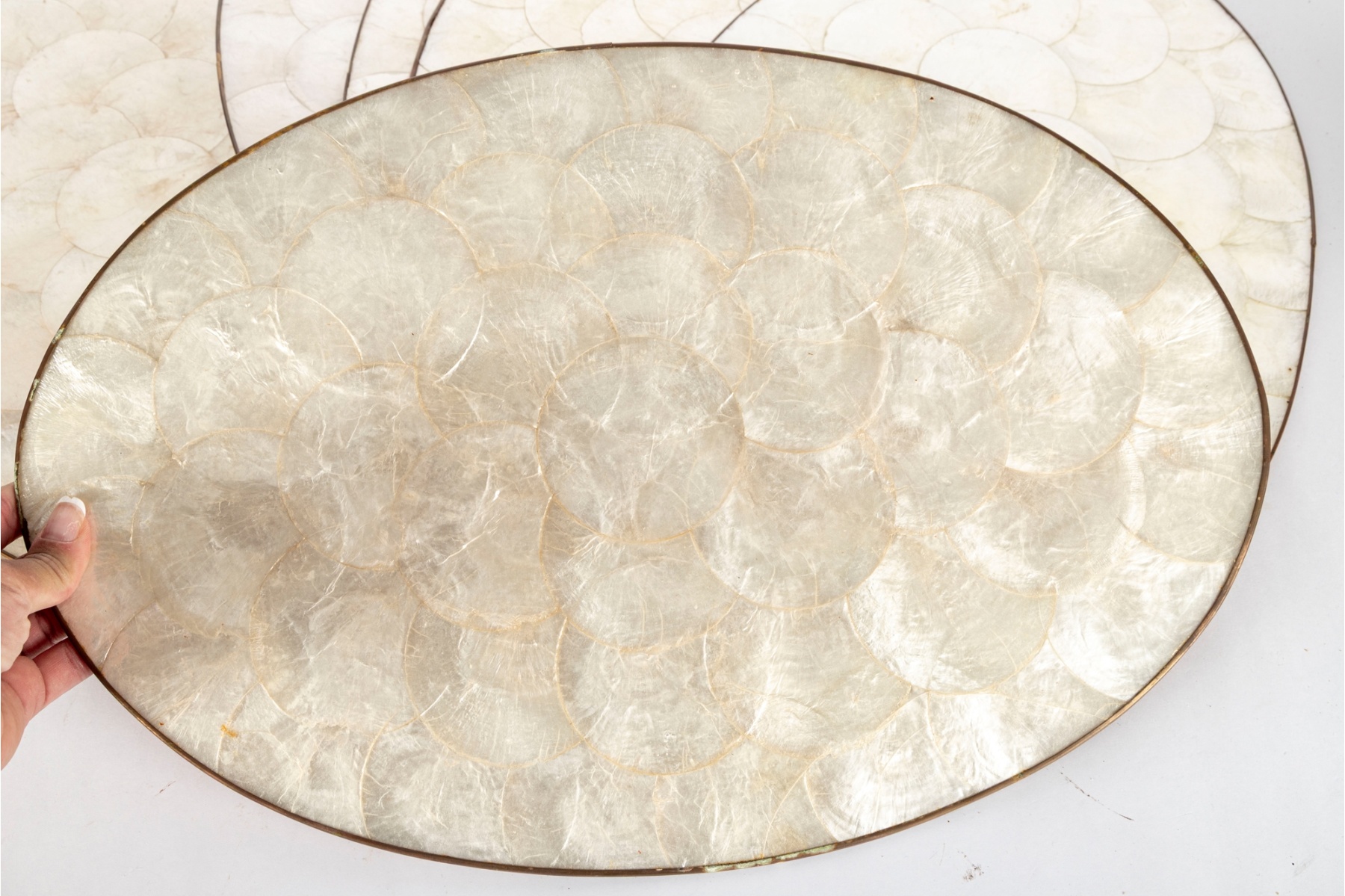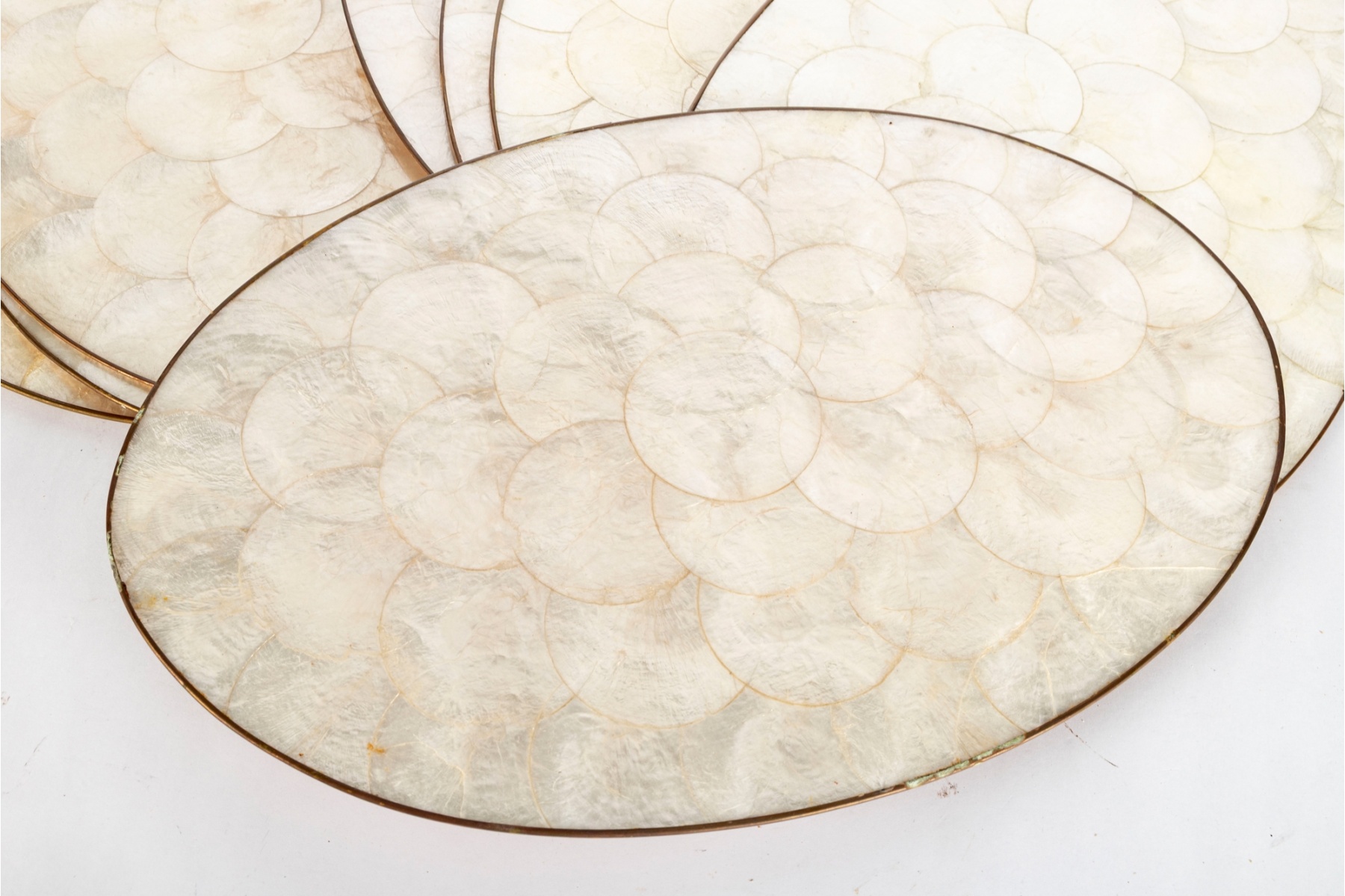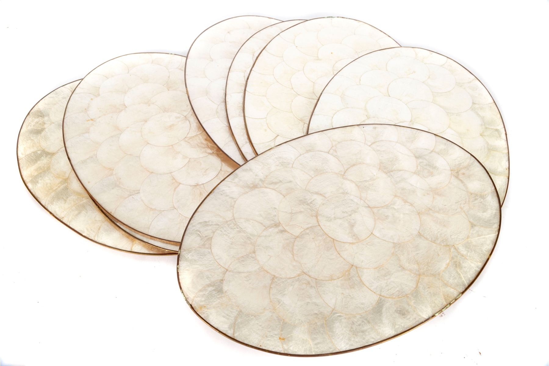 Elegant set of eight round Capiz shell table mats, each featuring natural iridescent panels framed by polished brass trim.