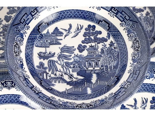 A wonderful set of eight Churchill Blue Willow coupe soup bowls in traditional design with ornate transferware scenes of Asian architecture in lush nature surrounded by richly patterned geometric borders in dark blue against bright white bodies. Marked underfoot.