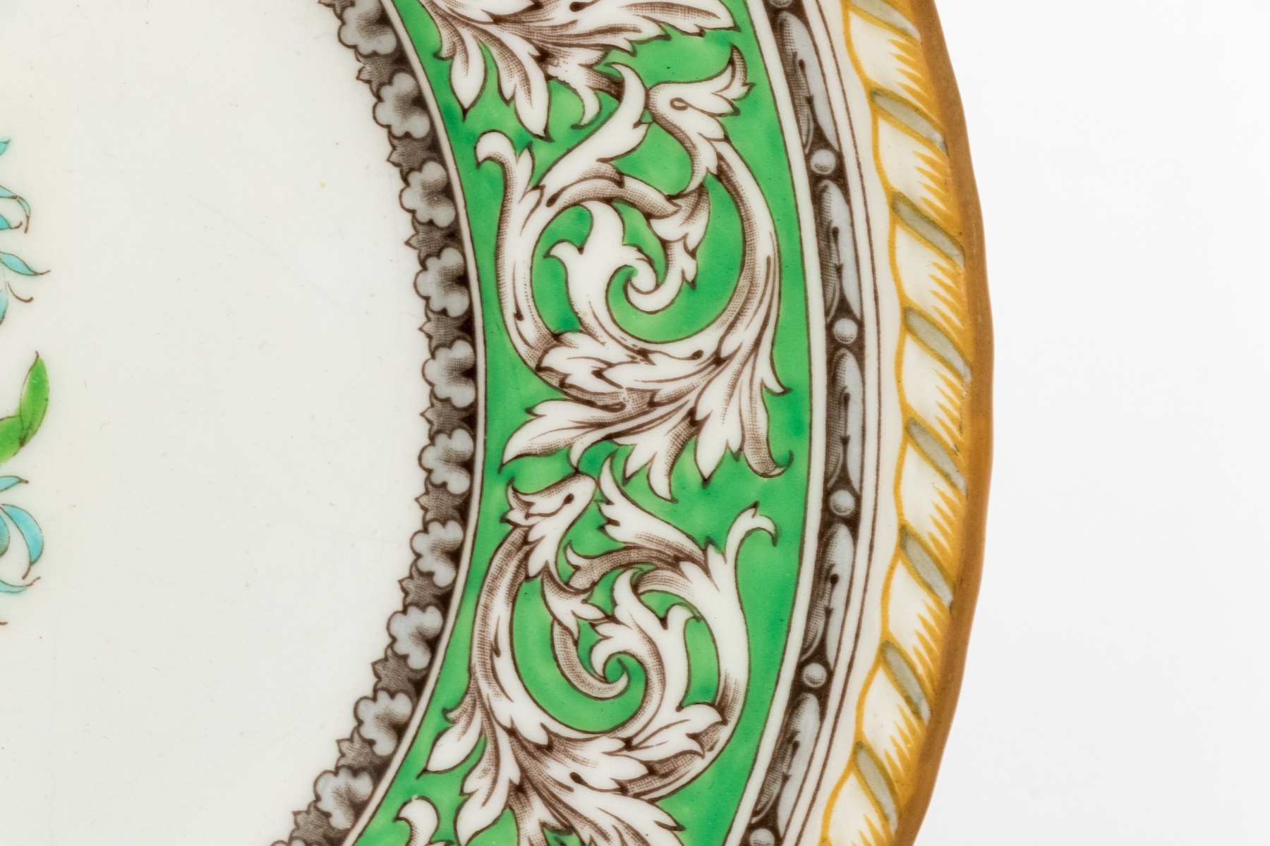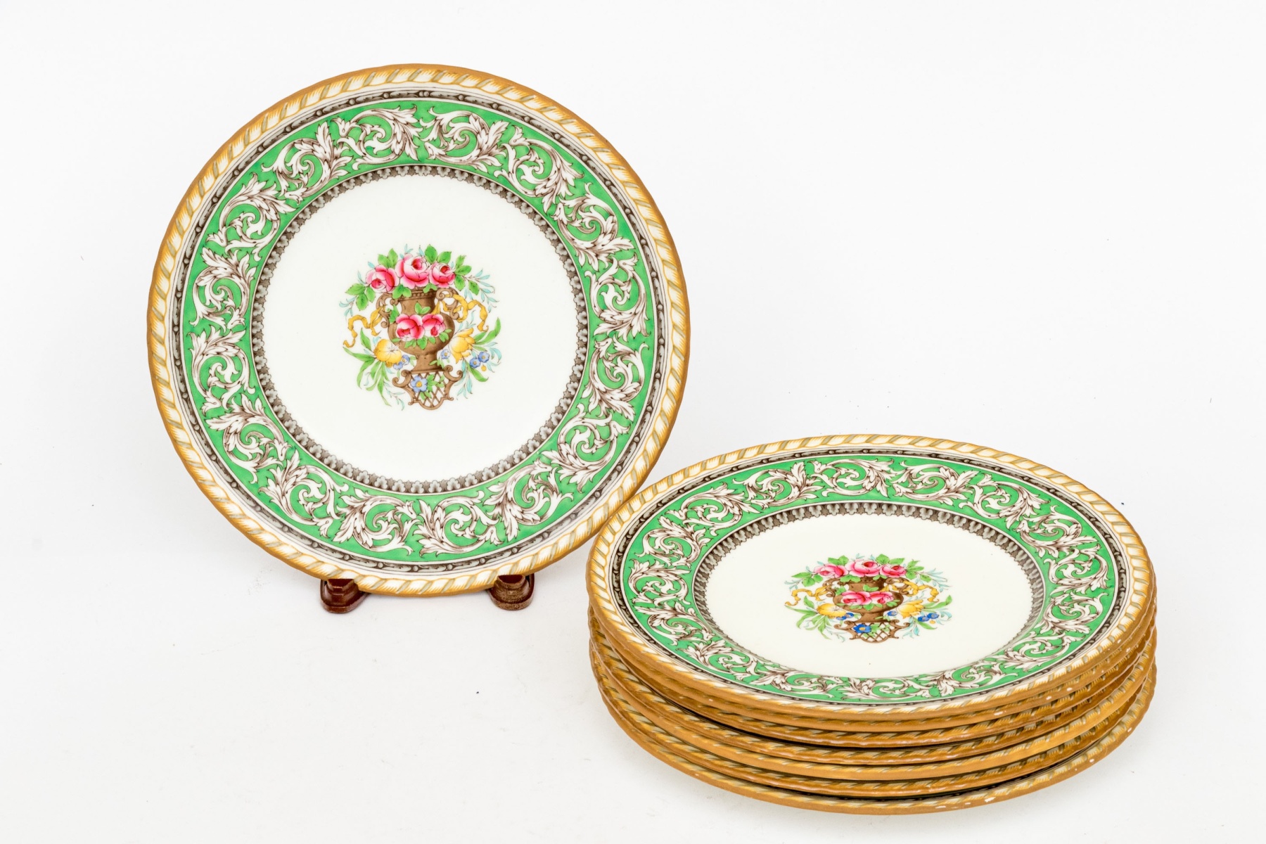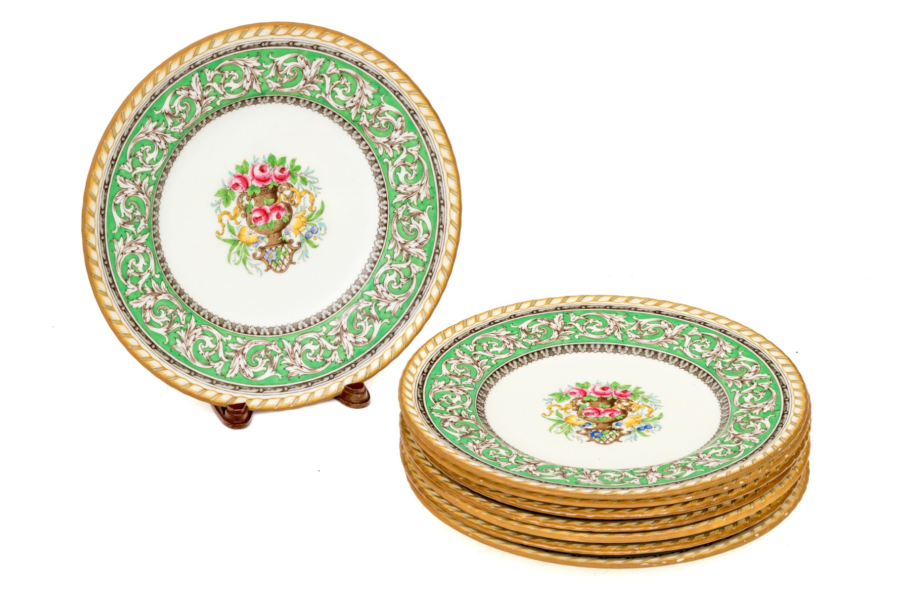A wonderful set of eight Minton ceramic dinner plates lavishly decorated with central reserved of floral urns surrounded by wide green borders of rocaille scrolling foliage finishing with yellow rope twist motif borders. Marked underfoot.