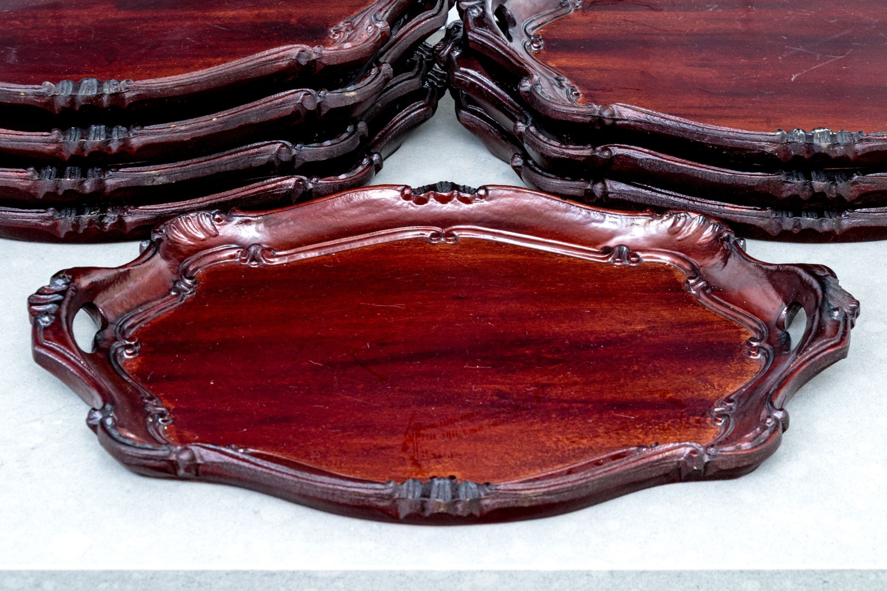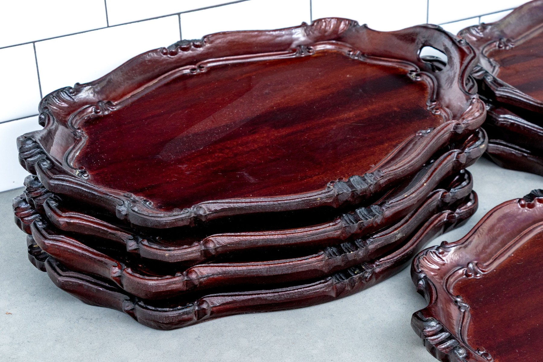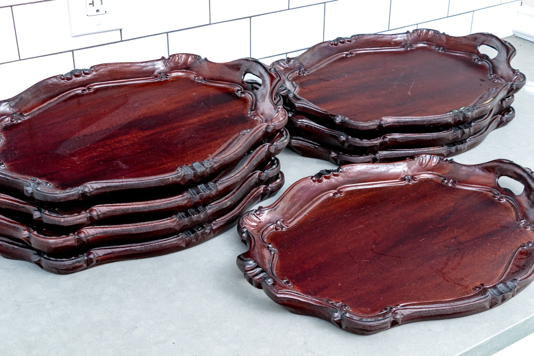 A gorgeous set of eight high quality Neiman Marcus serving trays in rich red-brown wood, showcasing serpentine oval trims with foliate flourishes at the corners and integrated twin handles. Sticker labels underfoot.