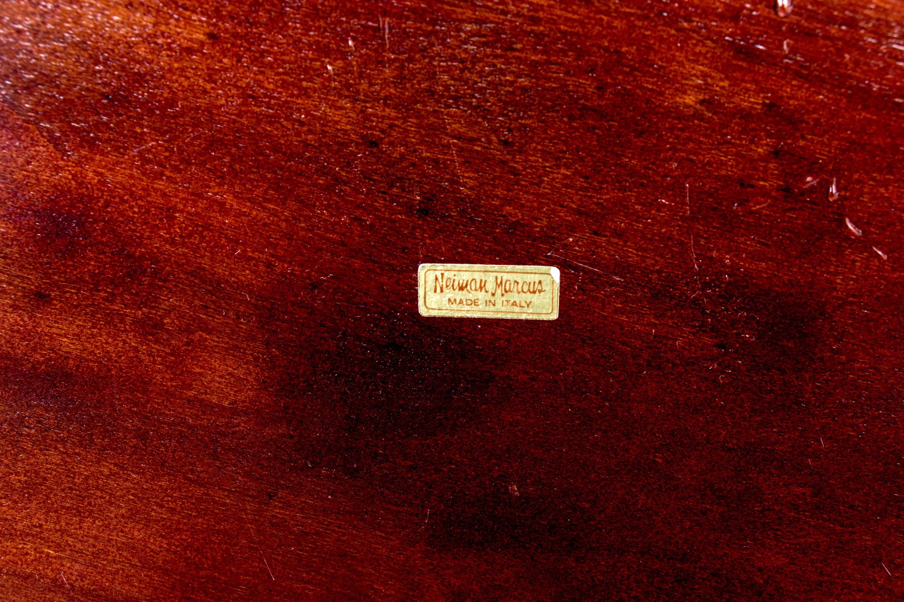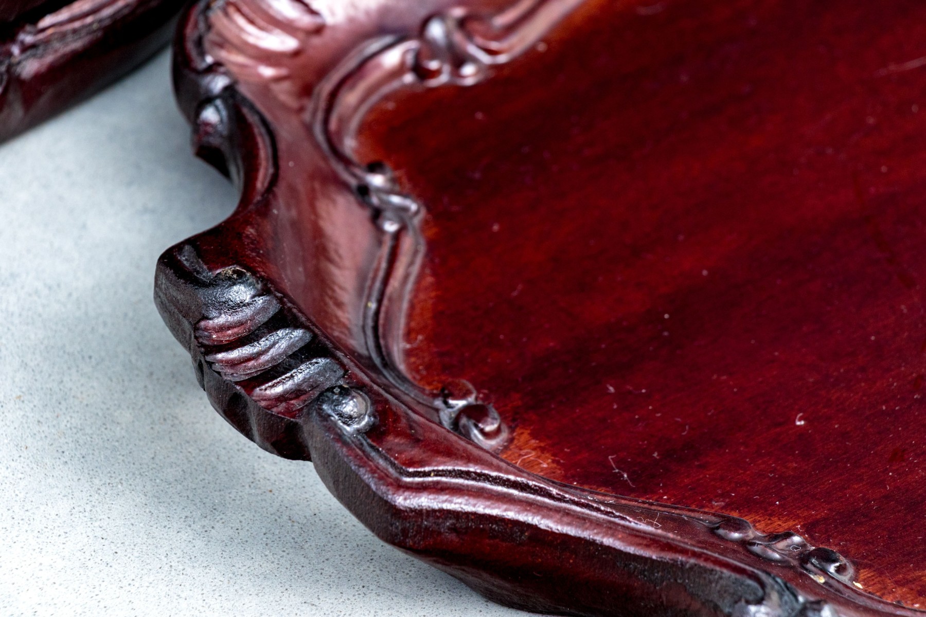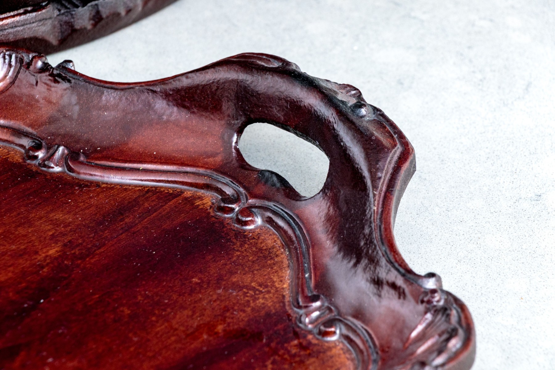 A gorgeous set of eight high quality Neiman Marcus serving trays in rich red-brown wood, showcasing serpentine oval trims with foliate flourishes at the corners and integrated twin handles. Sticker labels underfoot.