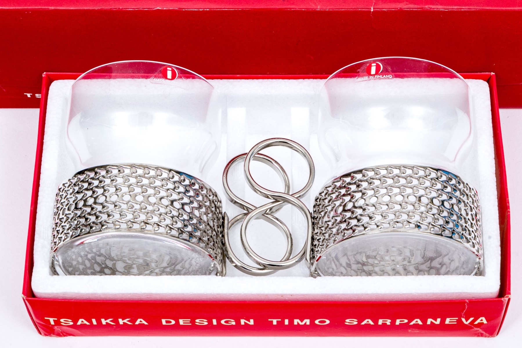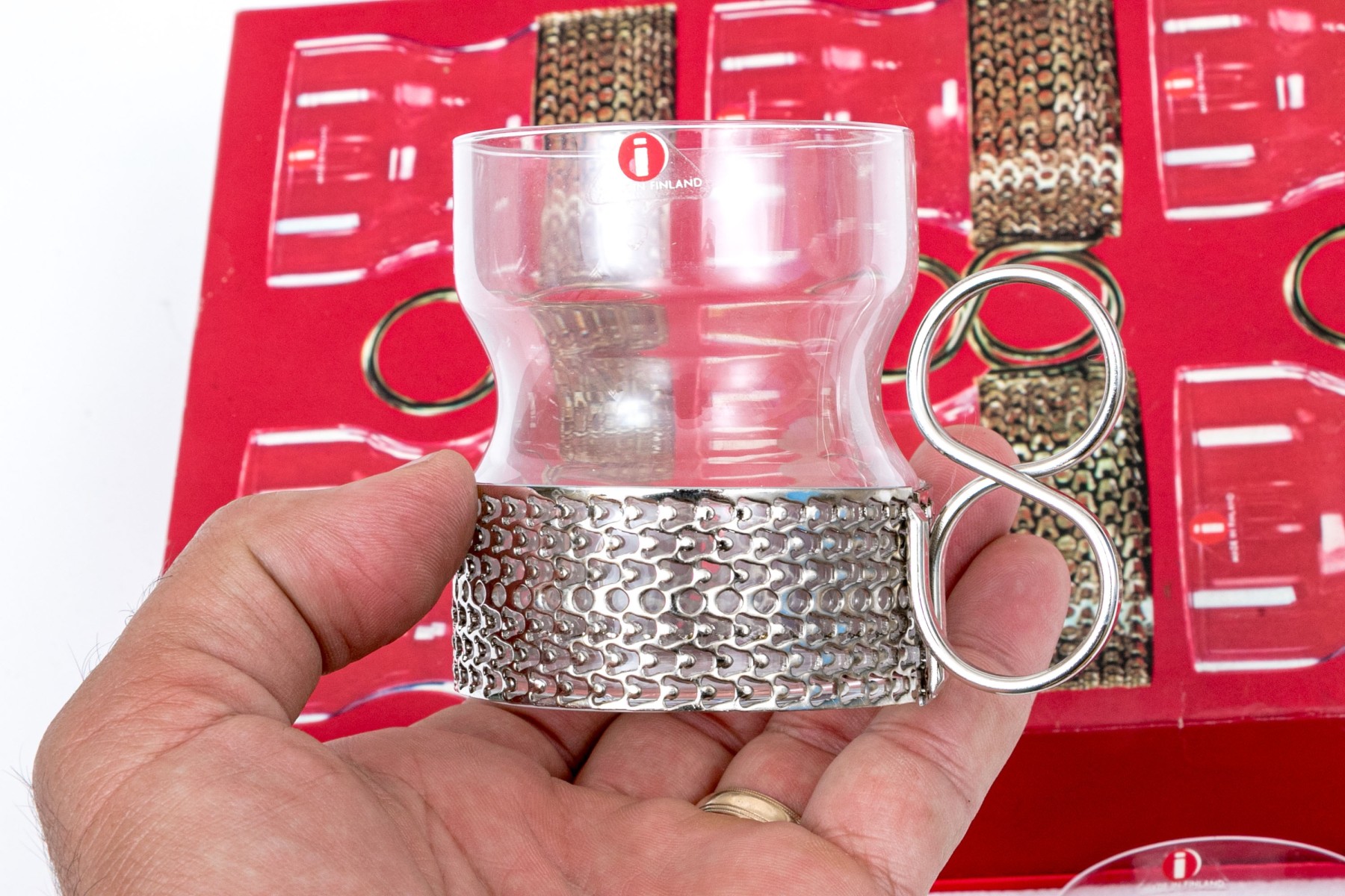 The eight glasses with stainless steel glass holders are wonderfully designed with openwork stainless bands that hold the cups from the bottom with modern double scrolled handles. The glasses of hourglass form.
