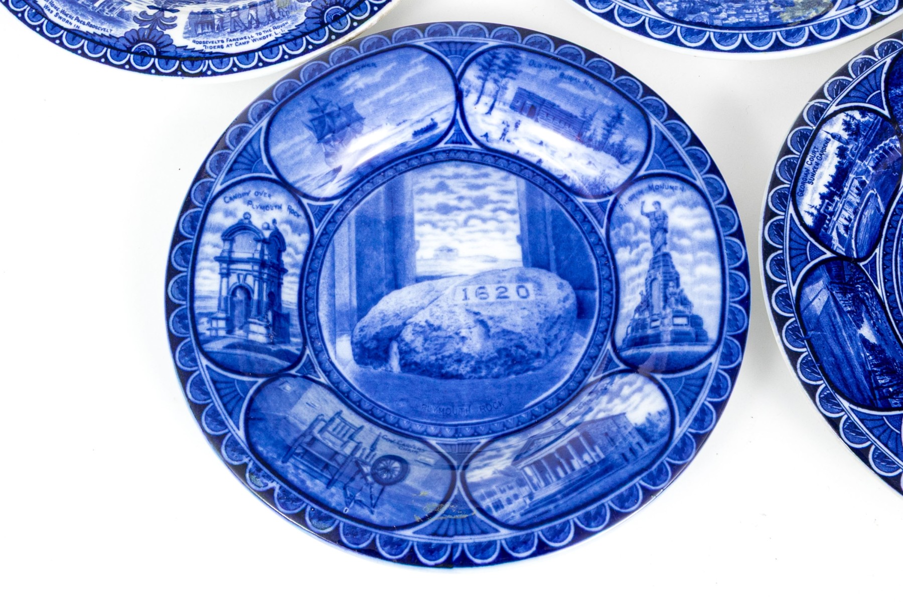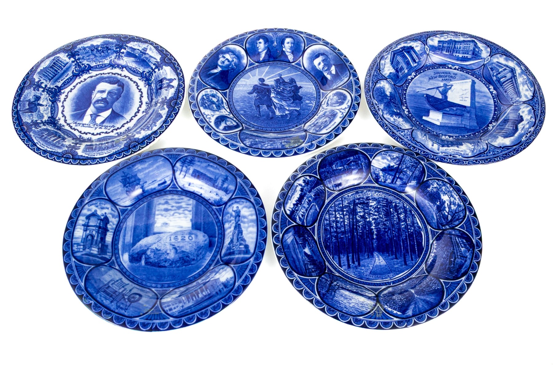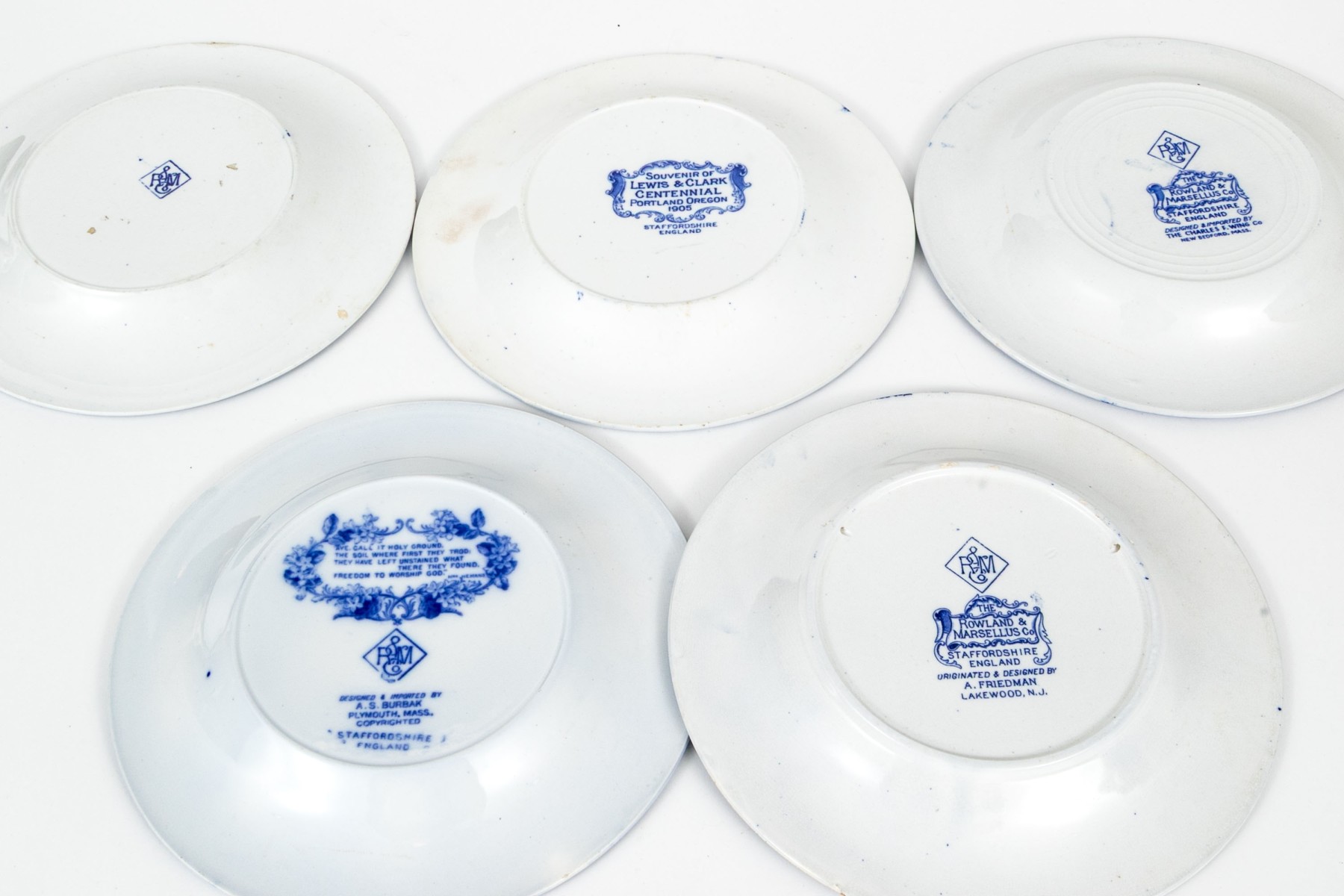 A wonderful collection of five antique Staffordshire ceramic plates, most imported by Rowland & Marsellus Co. Plates feature gorgeous monochromatic blue and white transferware designs including historic figures, monuments, and landscapes in excellent detail. Each marked underfoot.