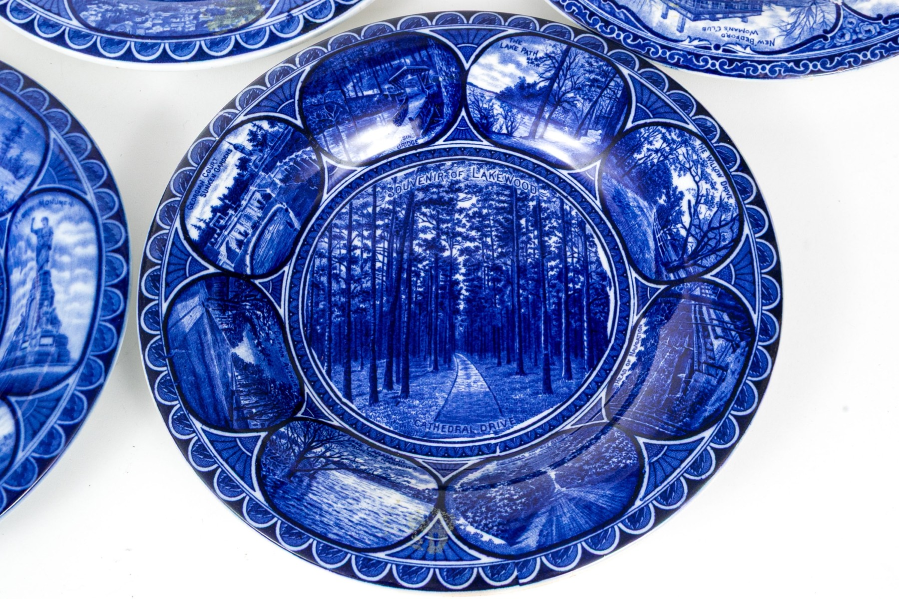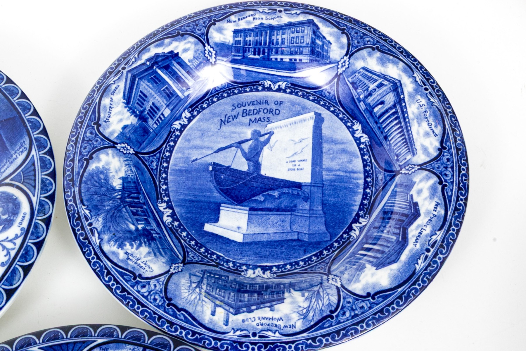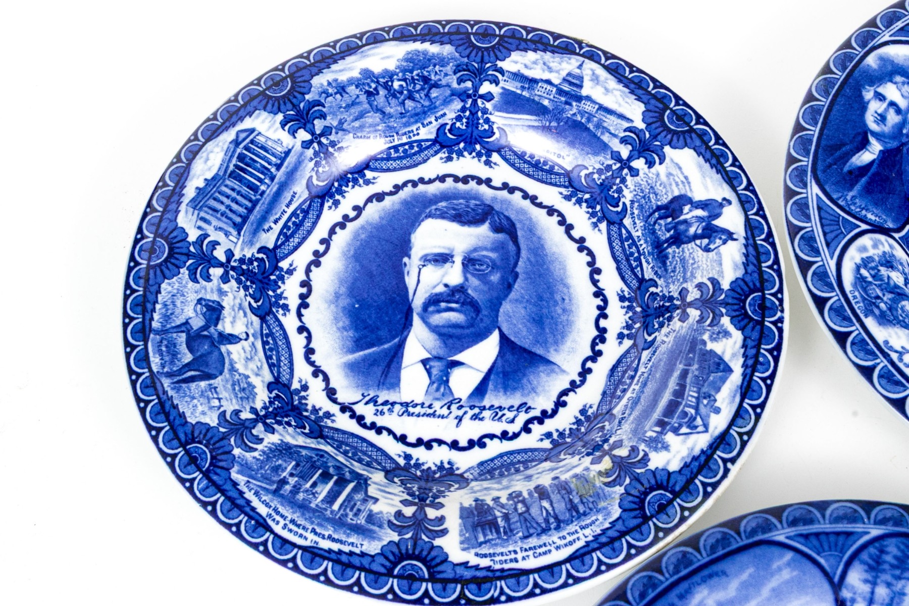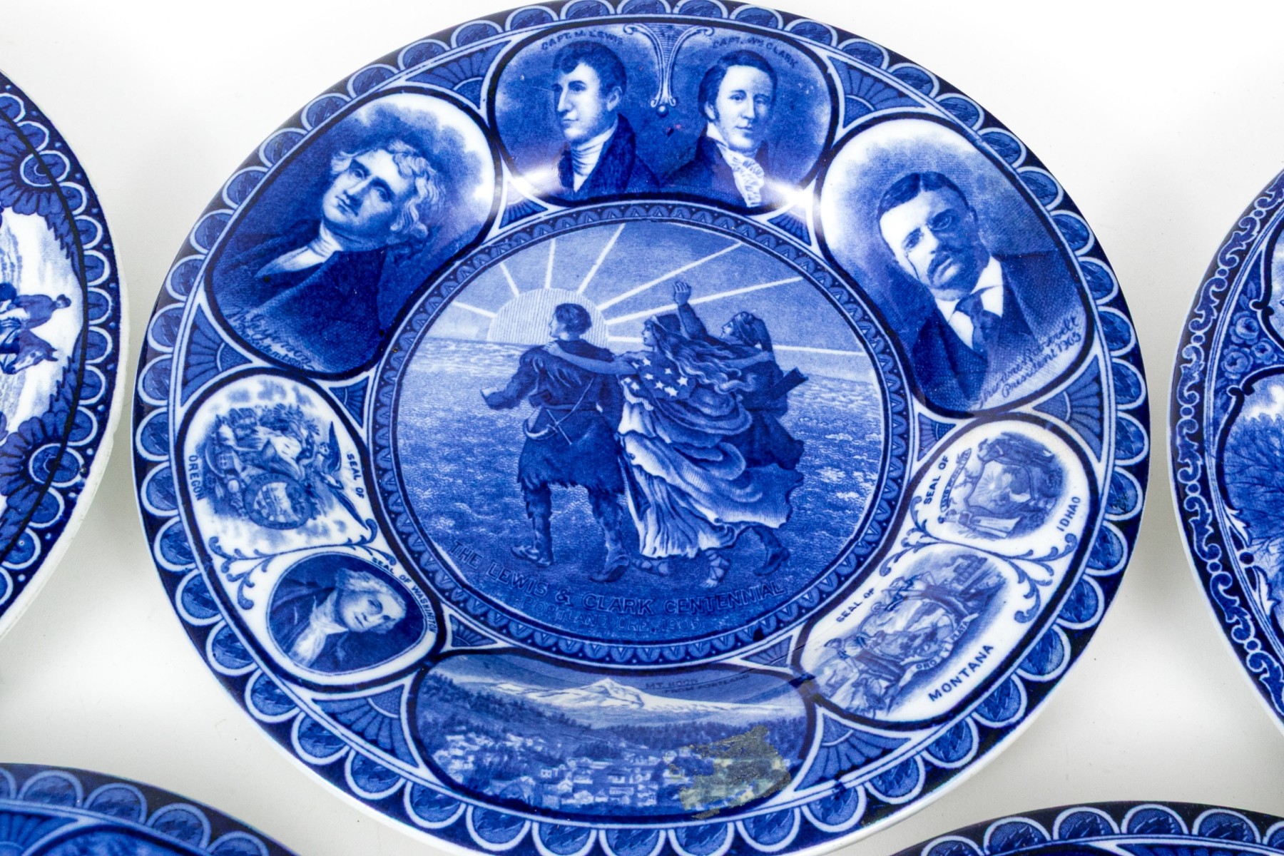 A wonderful collection of five antique Staffordshire ceramic plates, most imported by Rowland & Marsellus Co. Plates feature gorgeous monochromatic blue and white transferware designs including historic figures, monuments, and landscapes in excellent detail. Each marked underfoot.