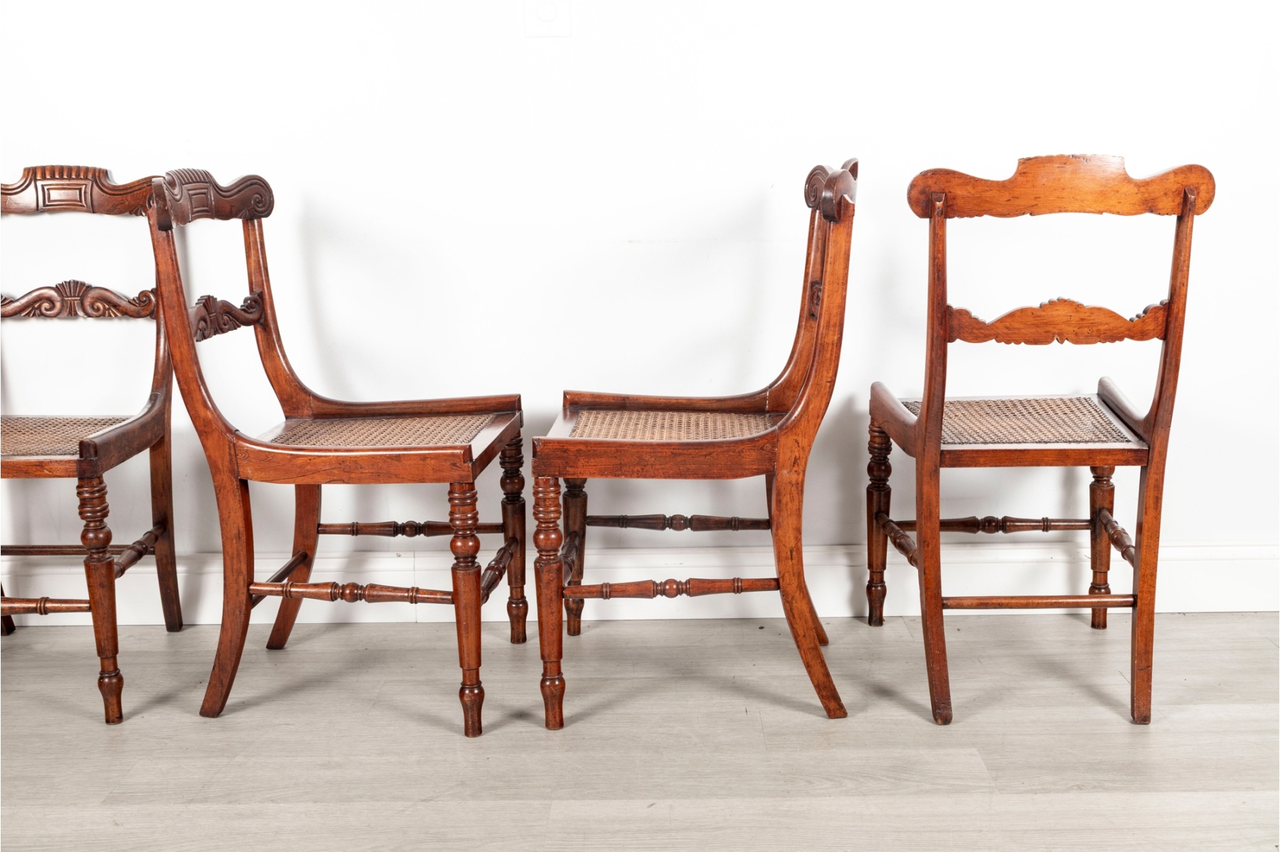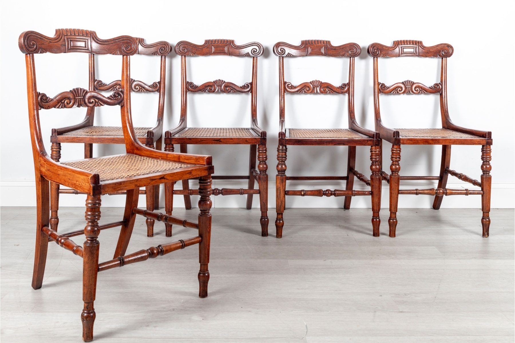Set of five antique carved wood side chairs featuring decorative crest rails with scroll and shell motifs, turned front legs, and caned seats. Elegant classical styling with warm patinated finish.