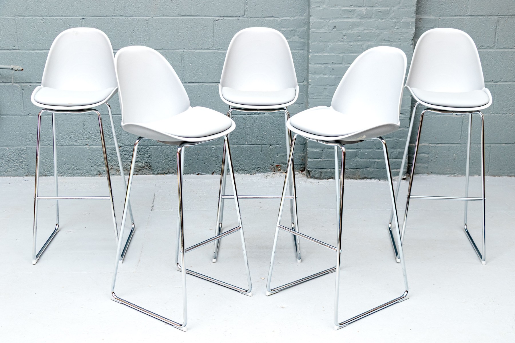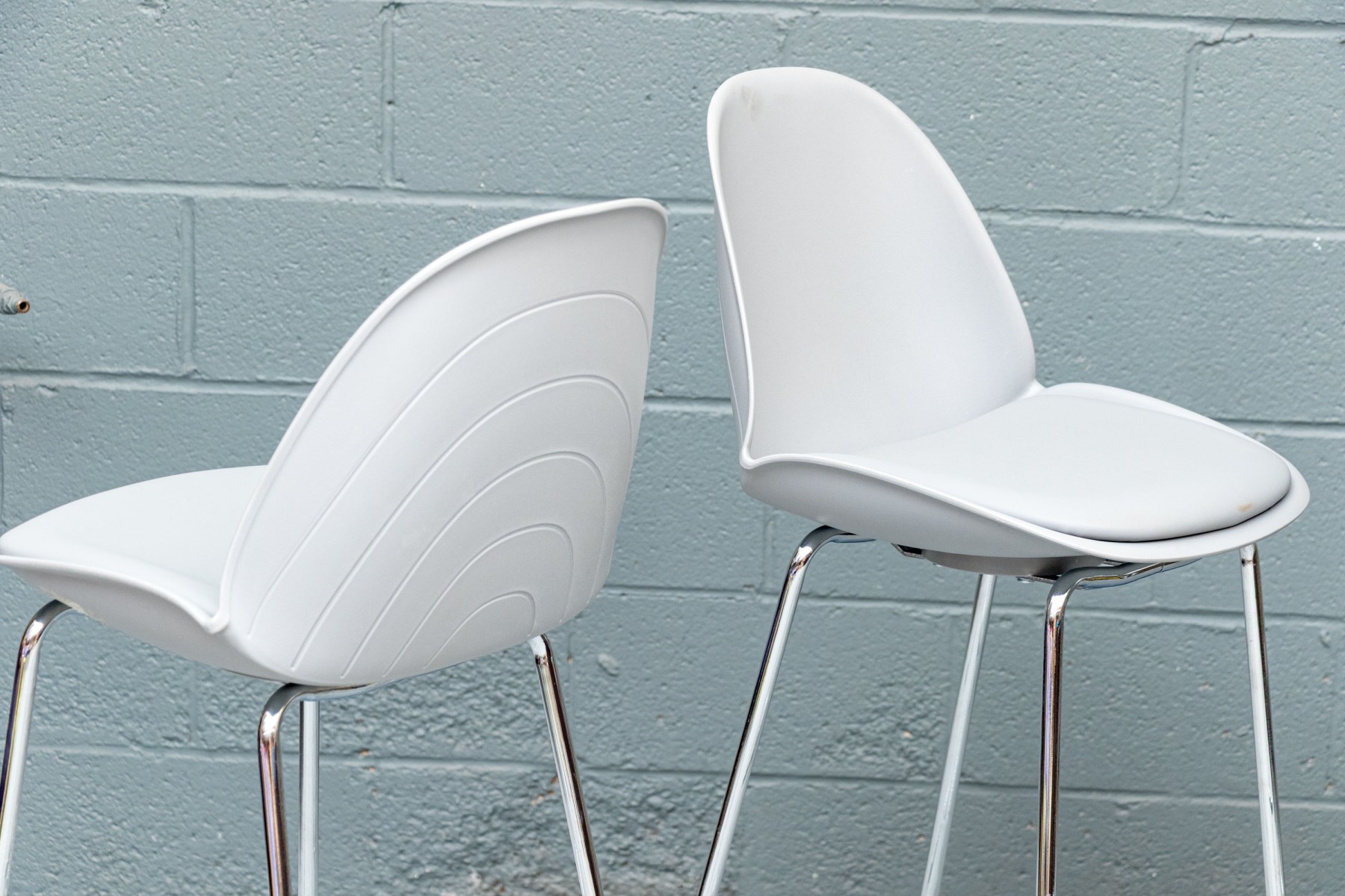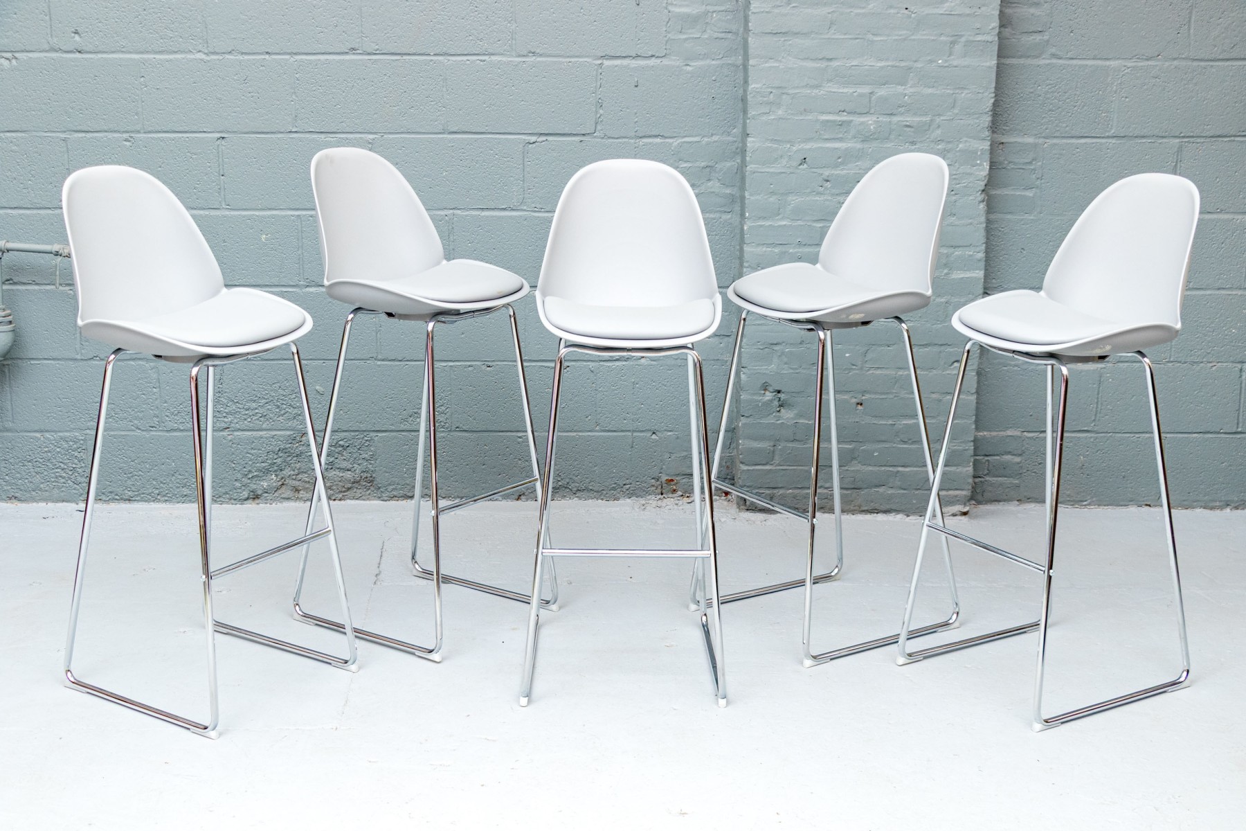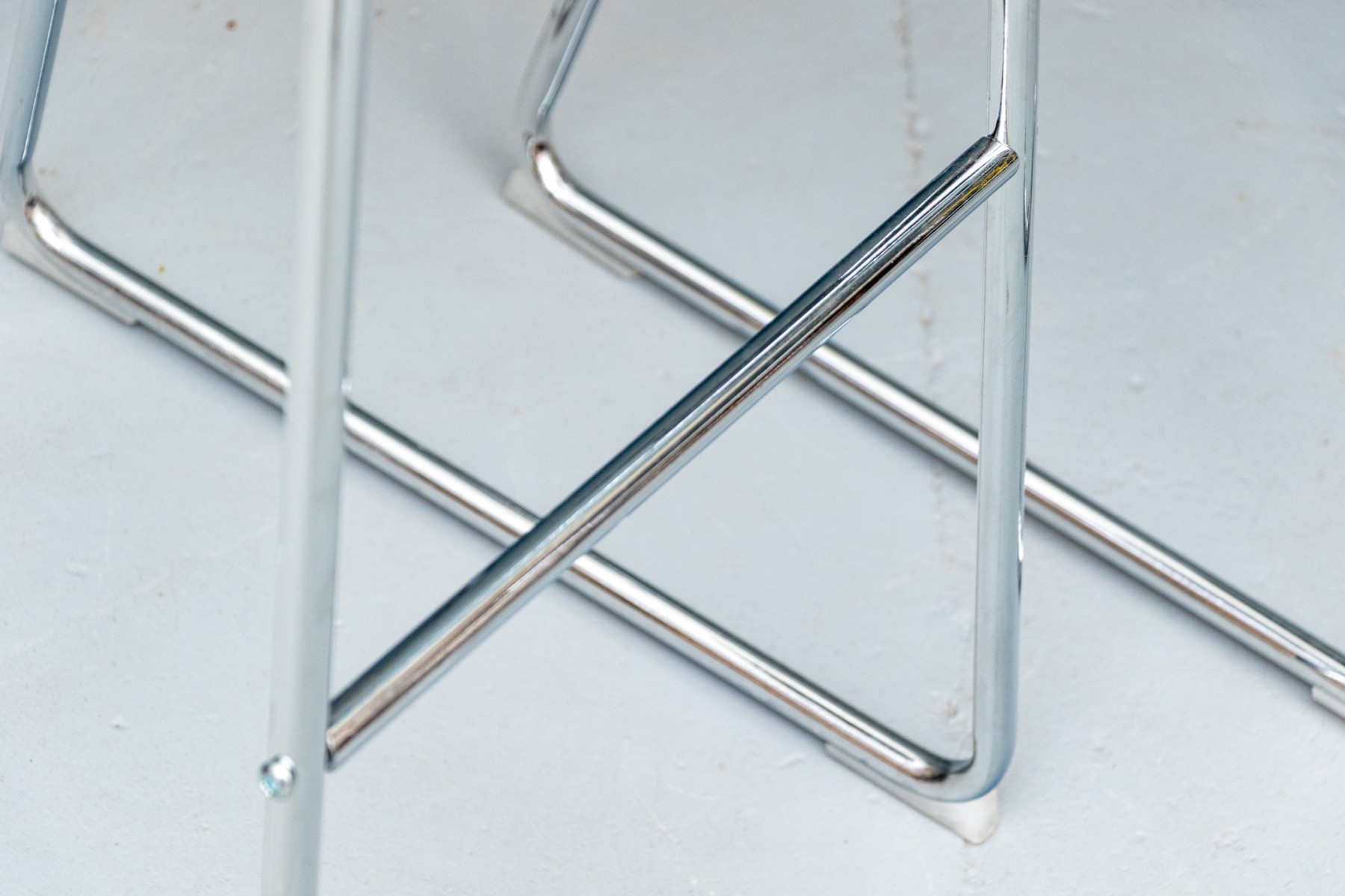 Each on tall chrome finished supports with stretcher support doubling as foot rest. Each with grey seats, seat backs and seat pads.