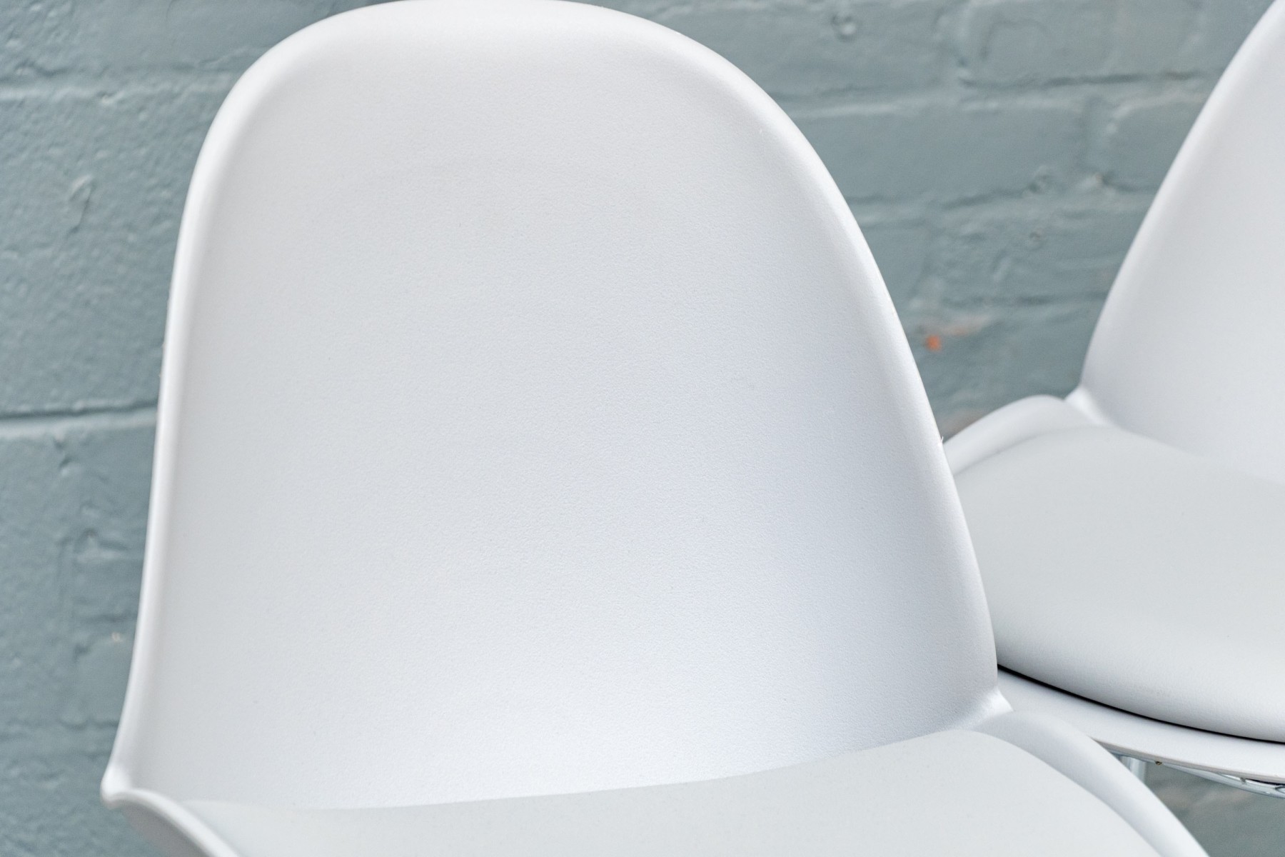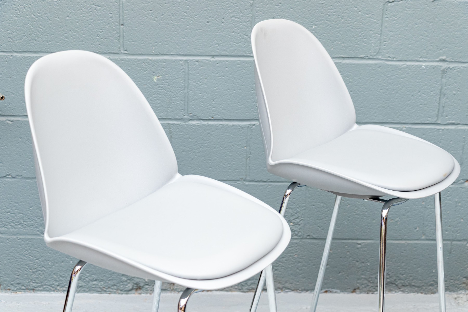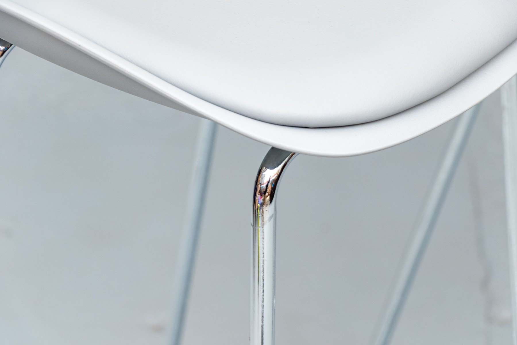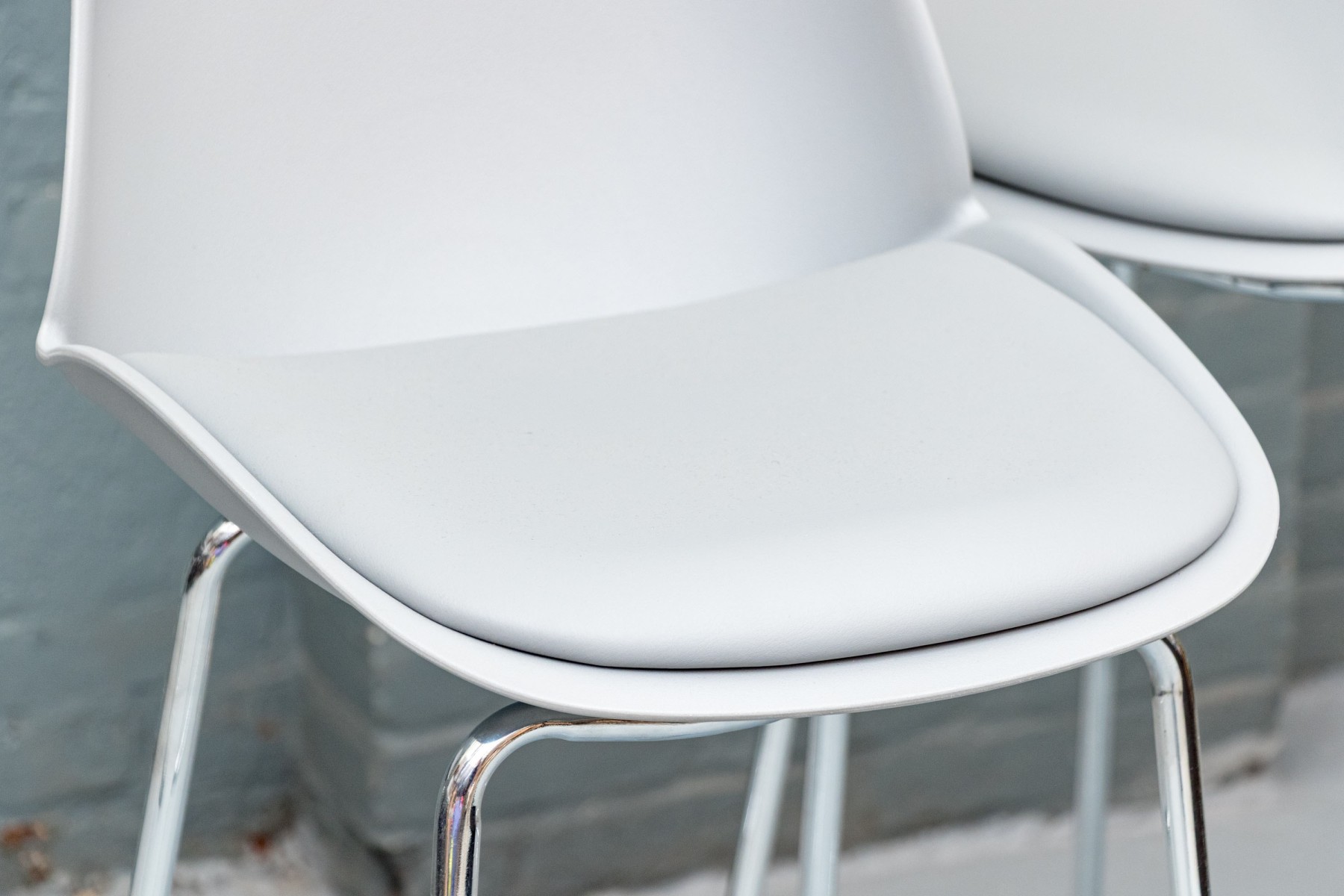 Each on tall chrome finished supports with stretcher support doubling as foot rest. Each with grey seats, seat backs and seat pads.