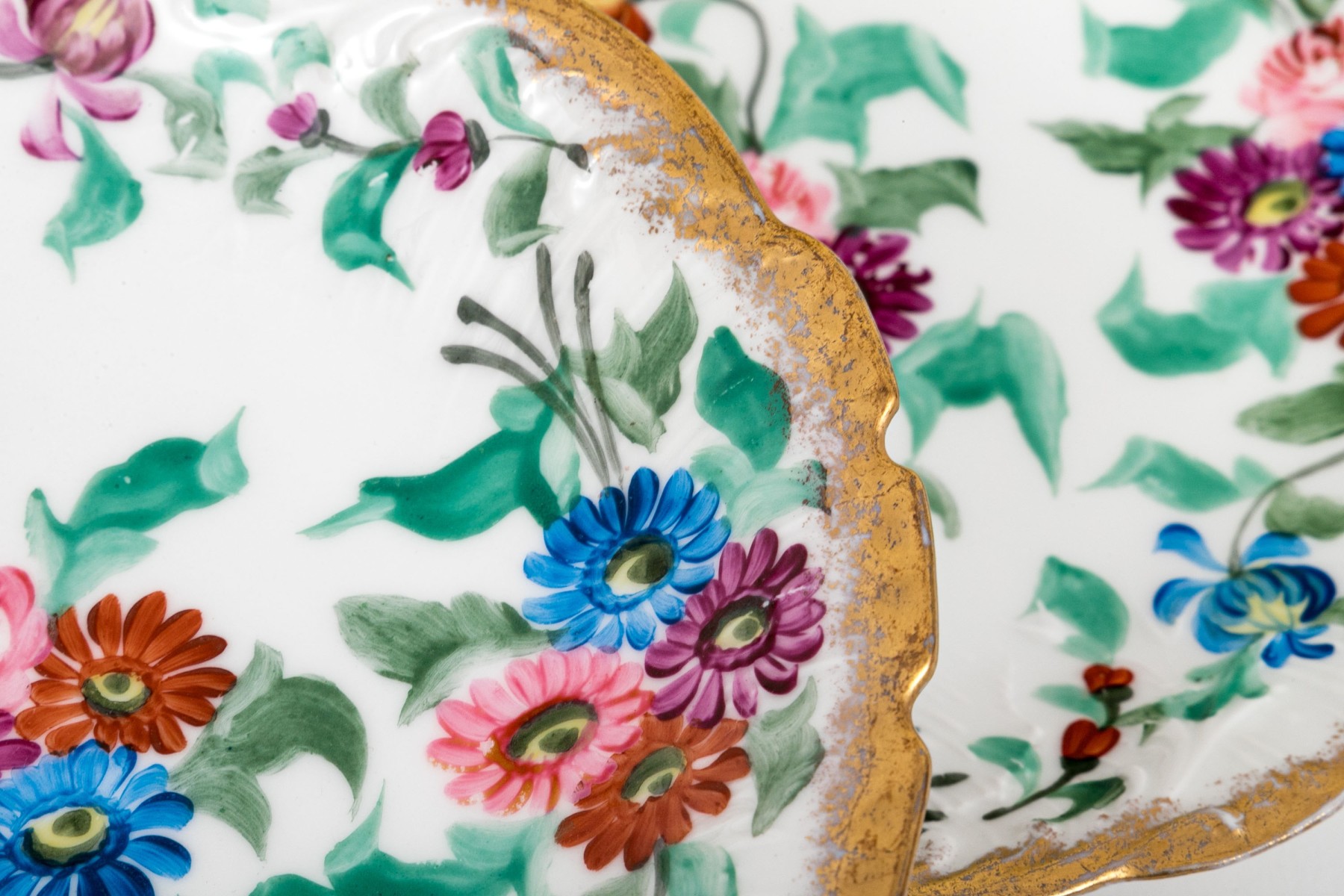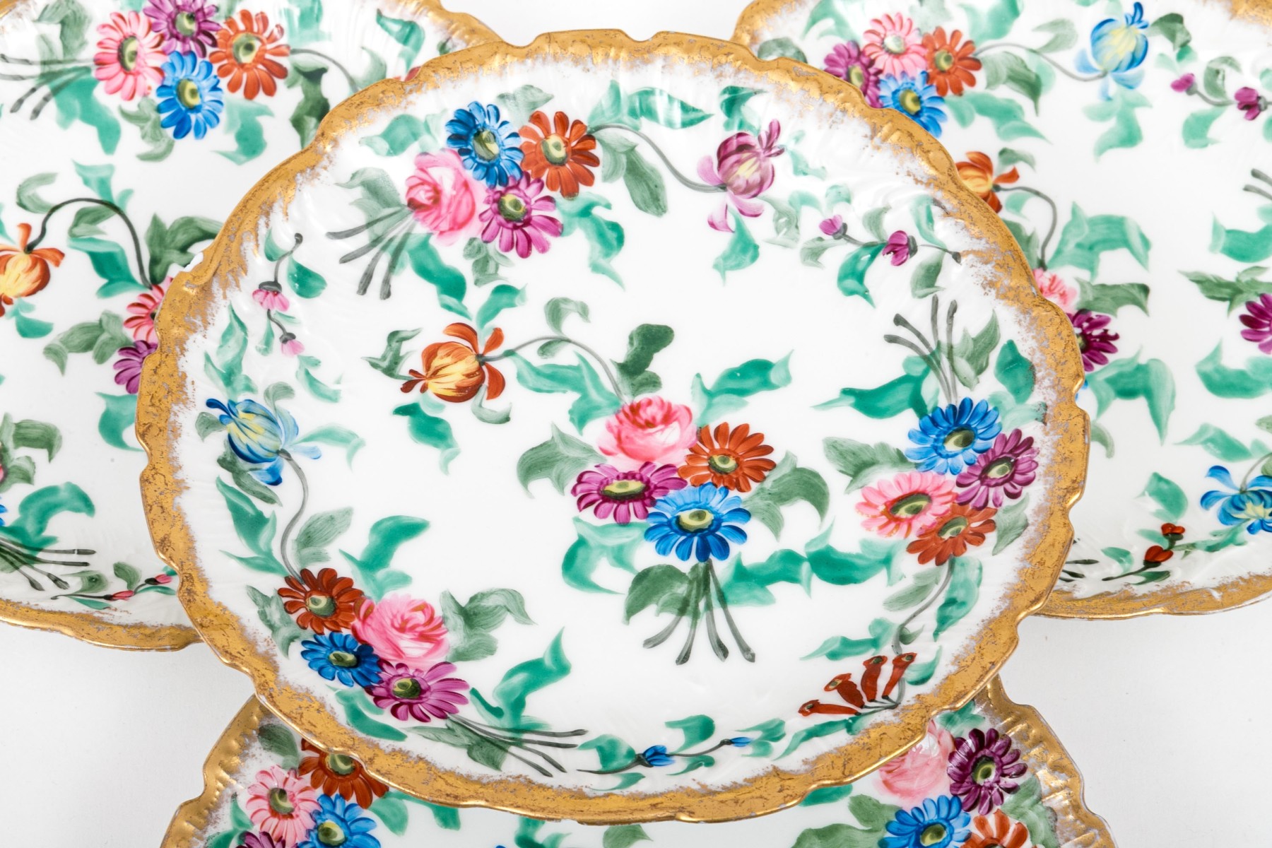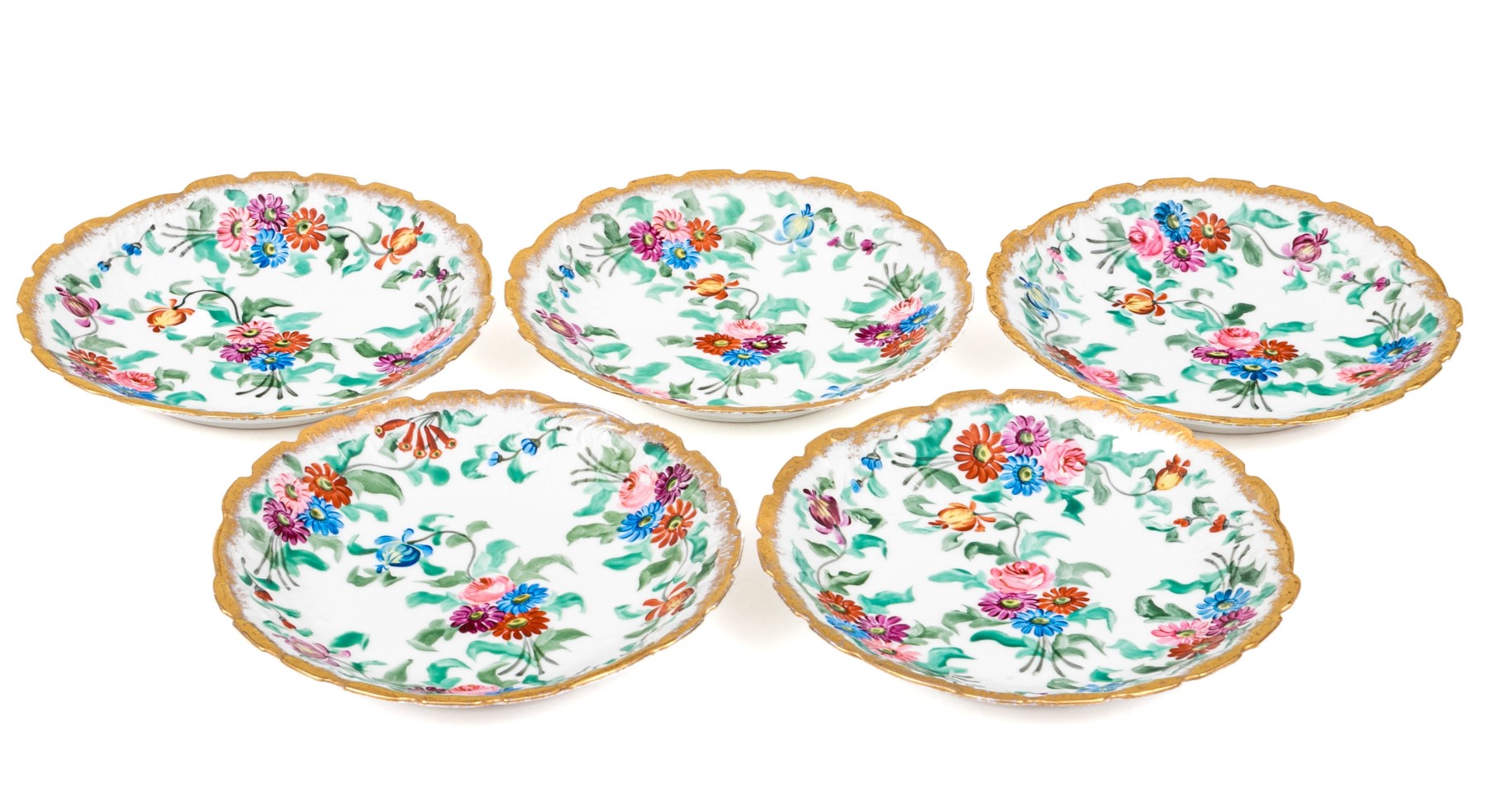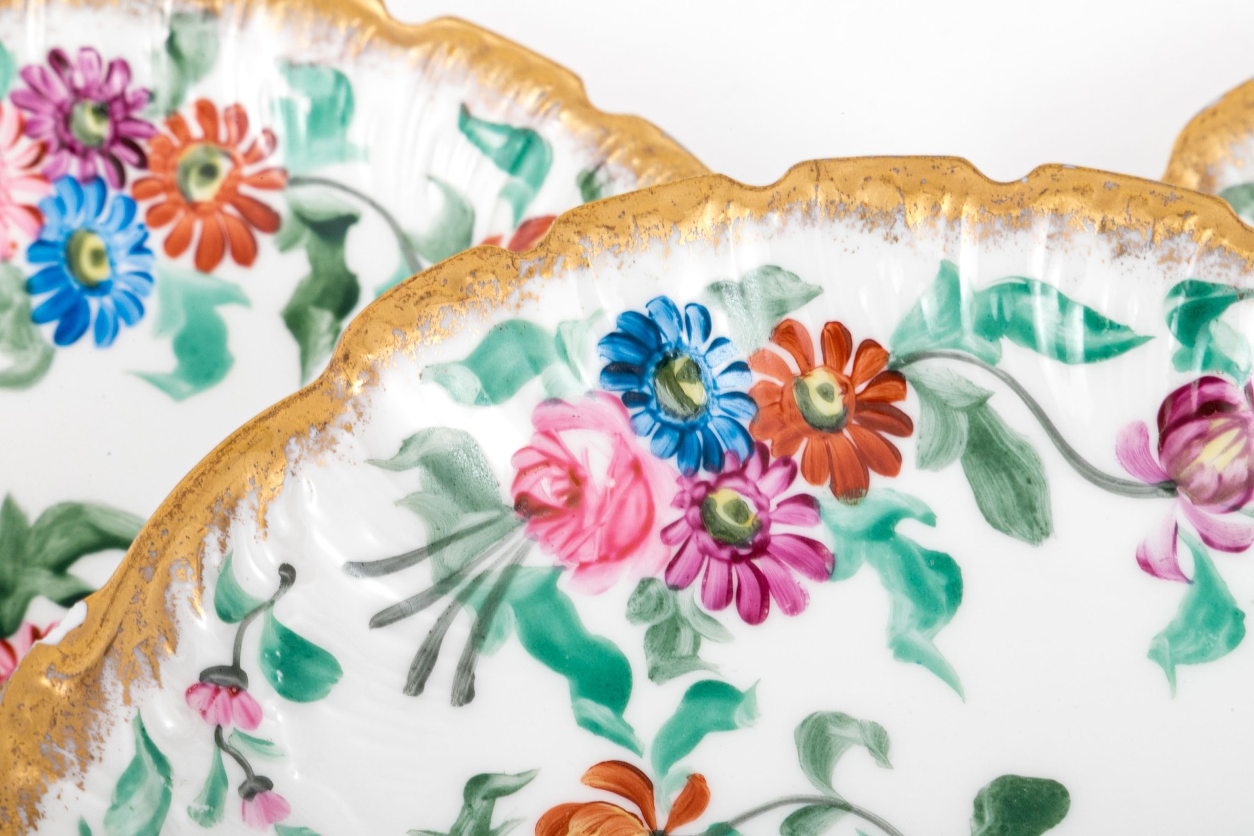 Each is marvelously formed with a floral petal formed trim with gilt finish around the outer band. The interior painted delightfully with floral sprays and greenery.