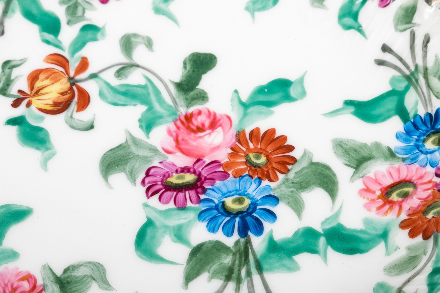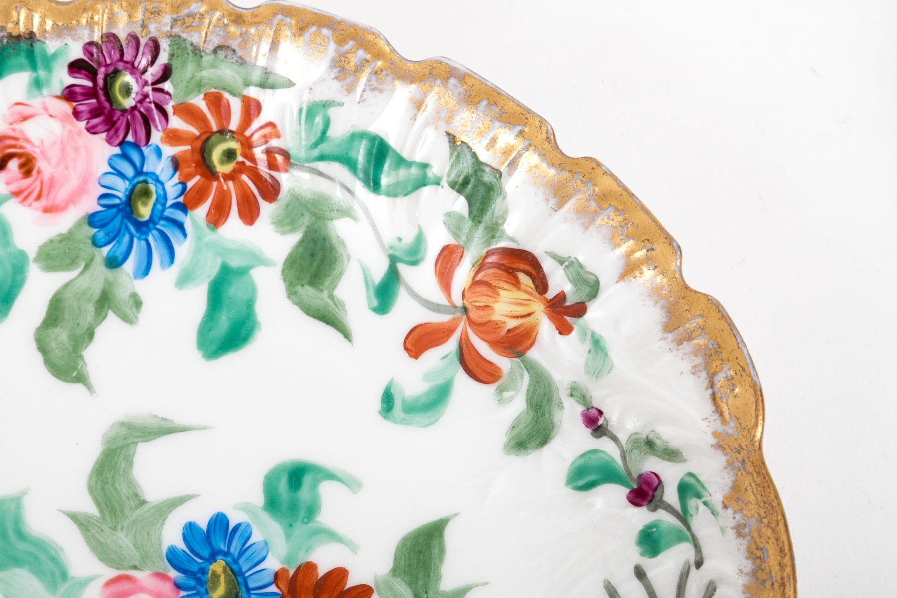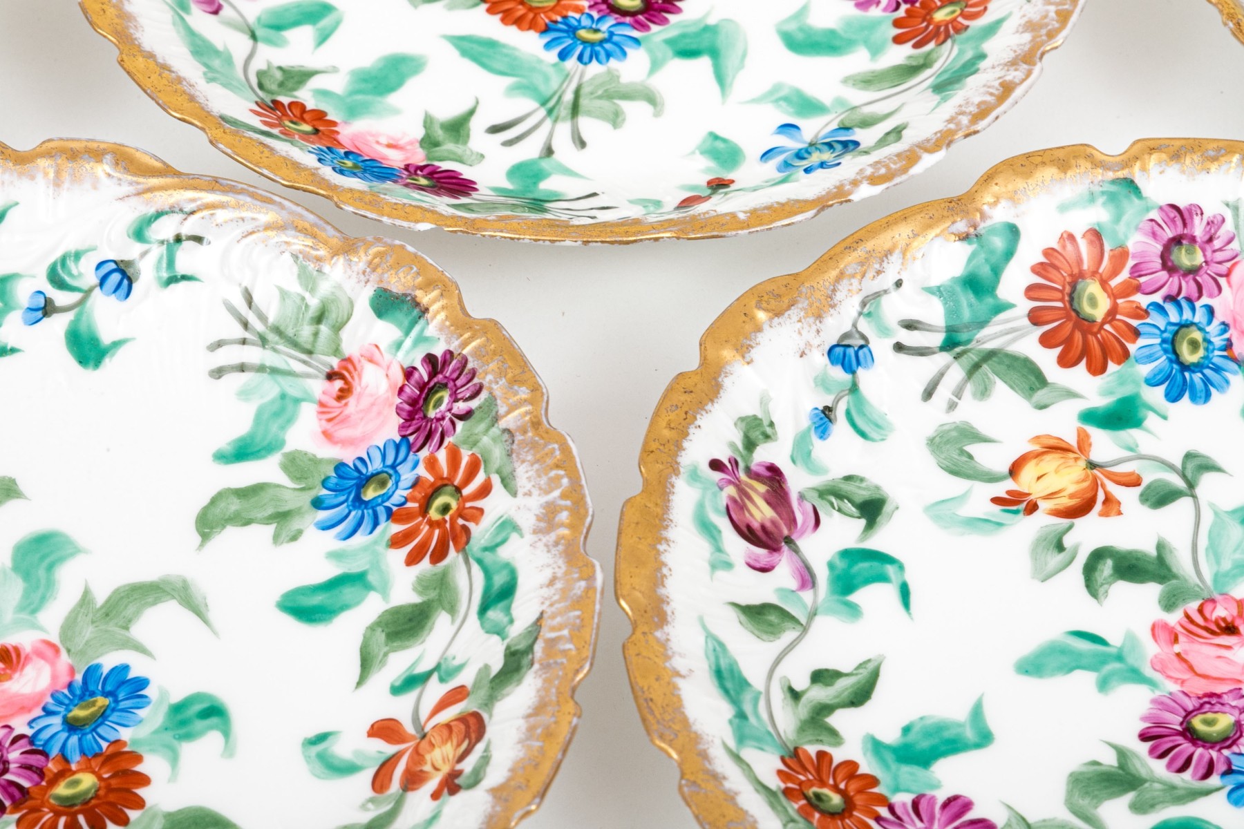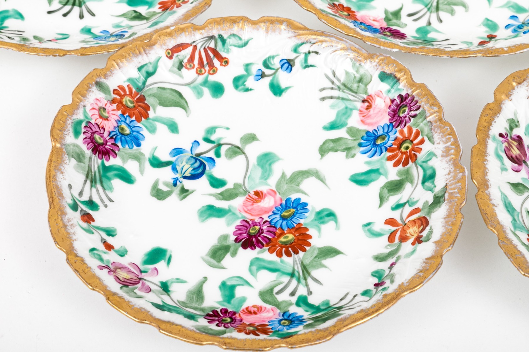 Each is marvelously formed with a floral petal formed trim with gilt finish around the outer band. The interior painted delightfully with floral sprays and greenery.