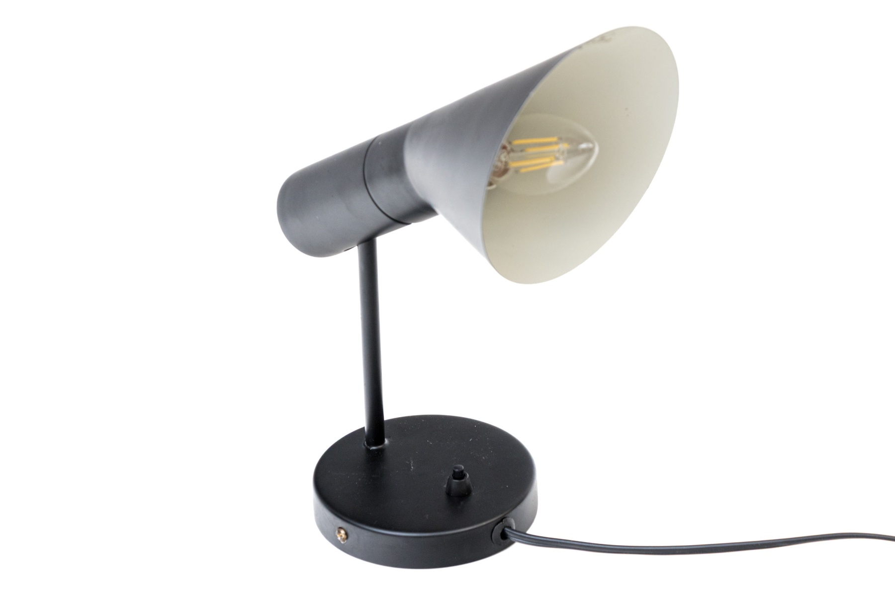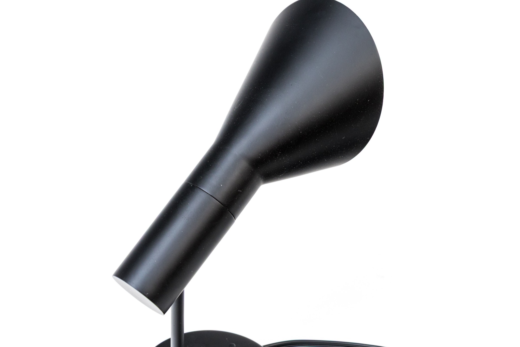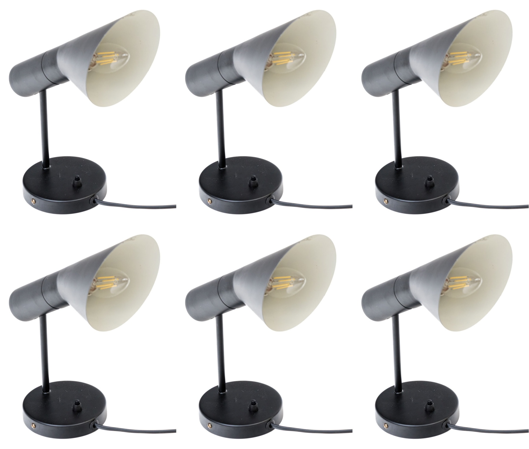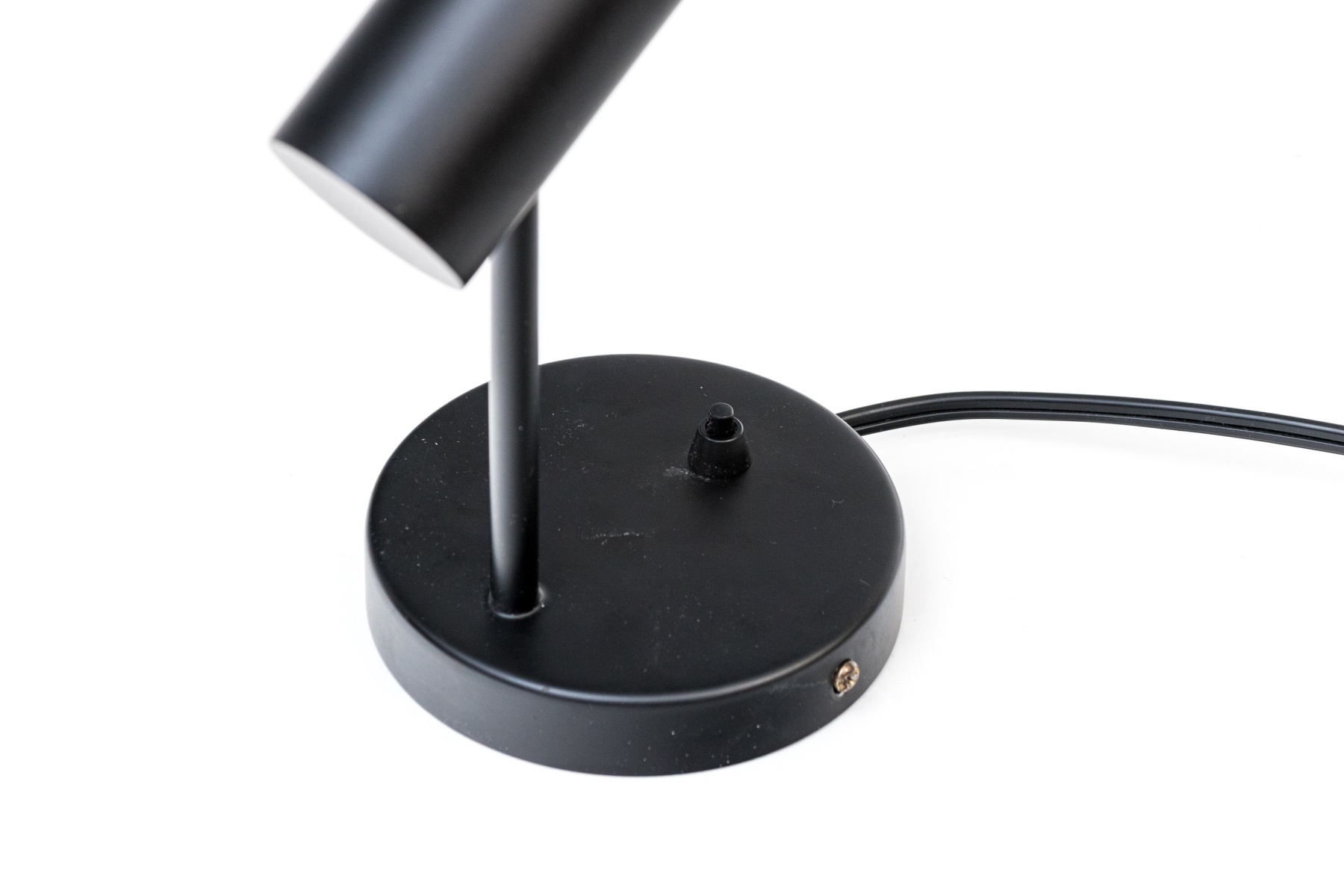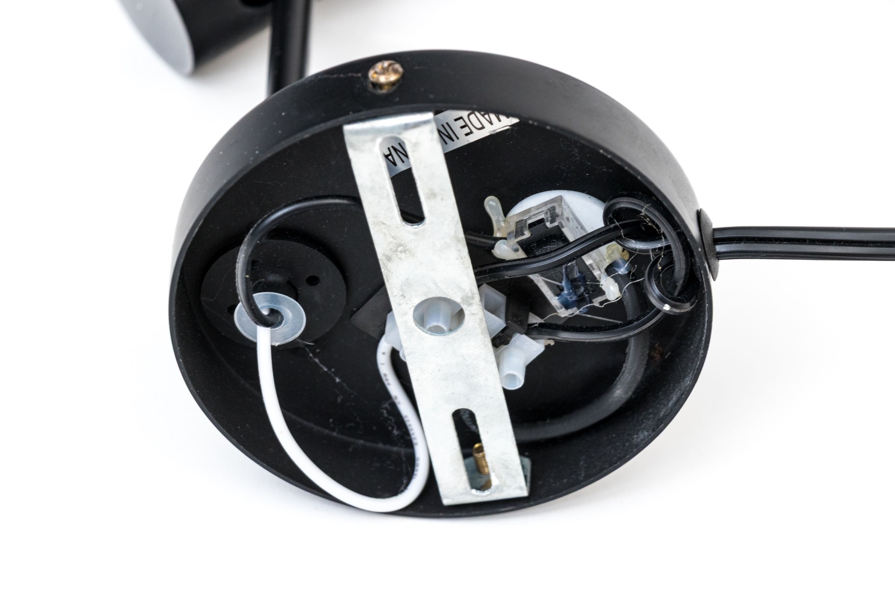With angled black shades with cylindrical ends attached to a short pole which attaches to ceiling mount.