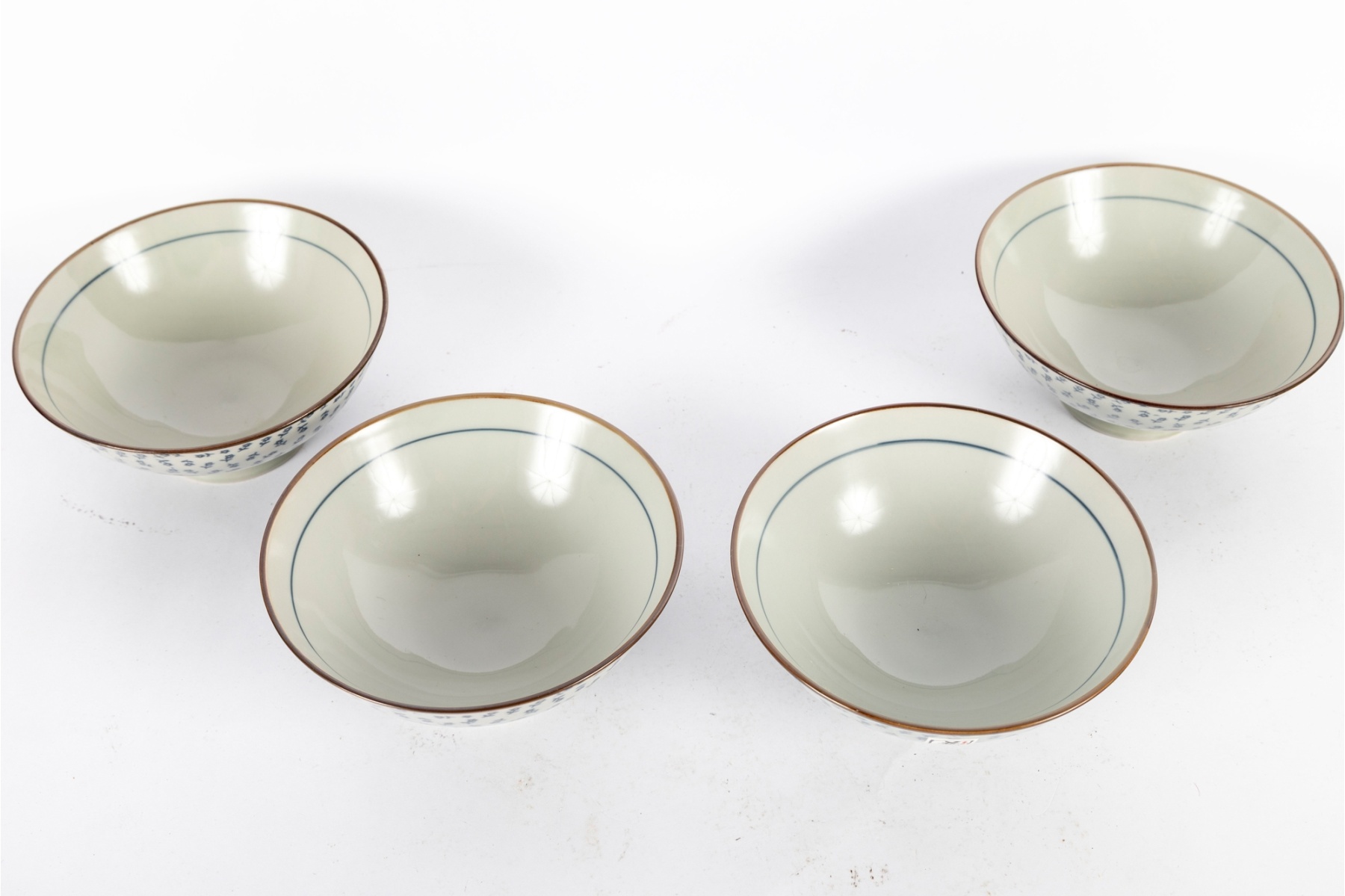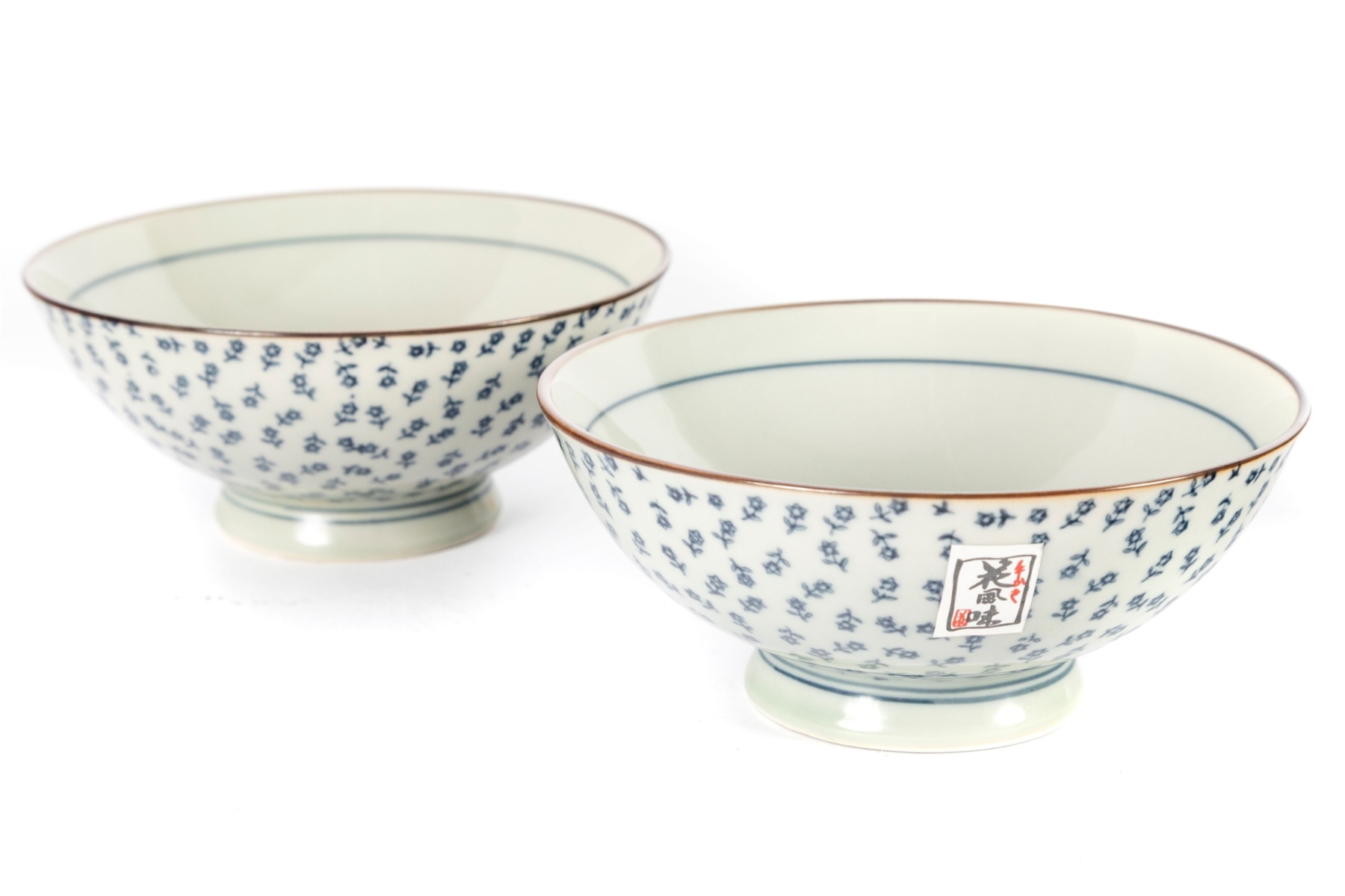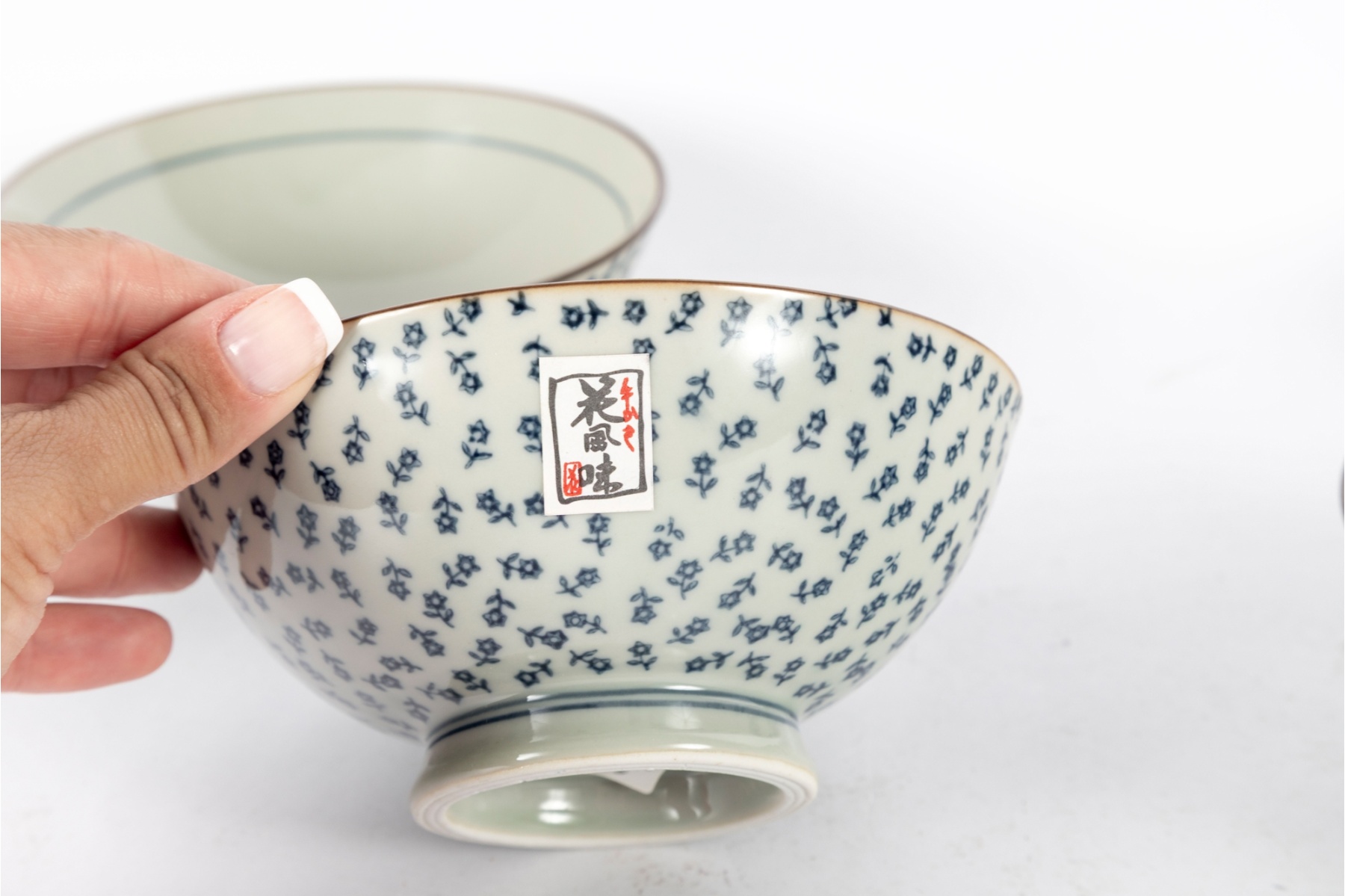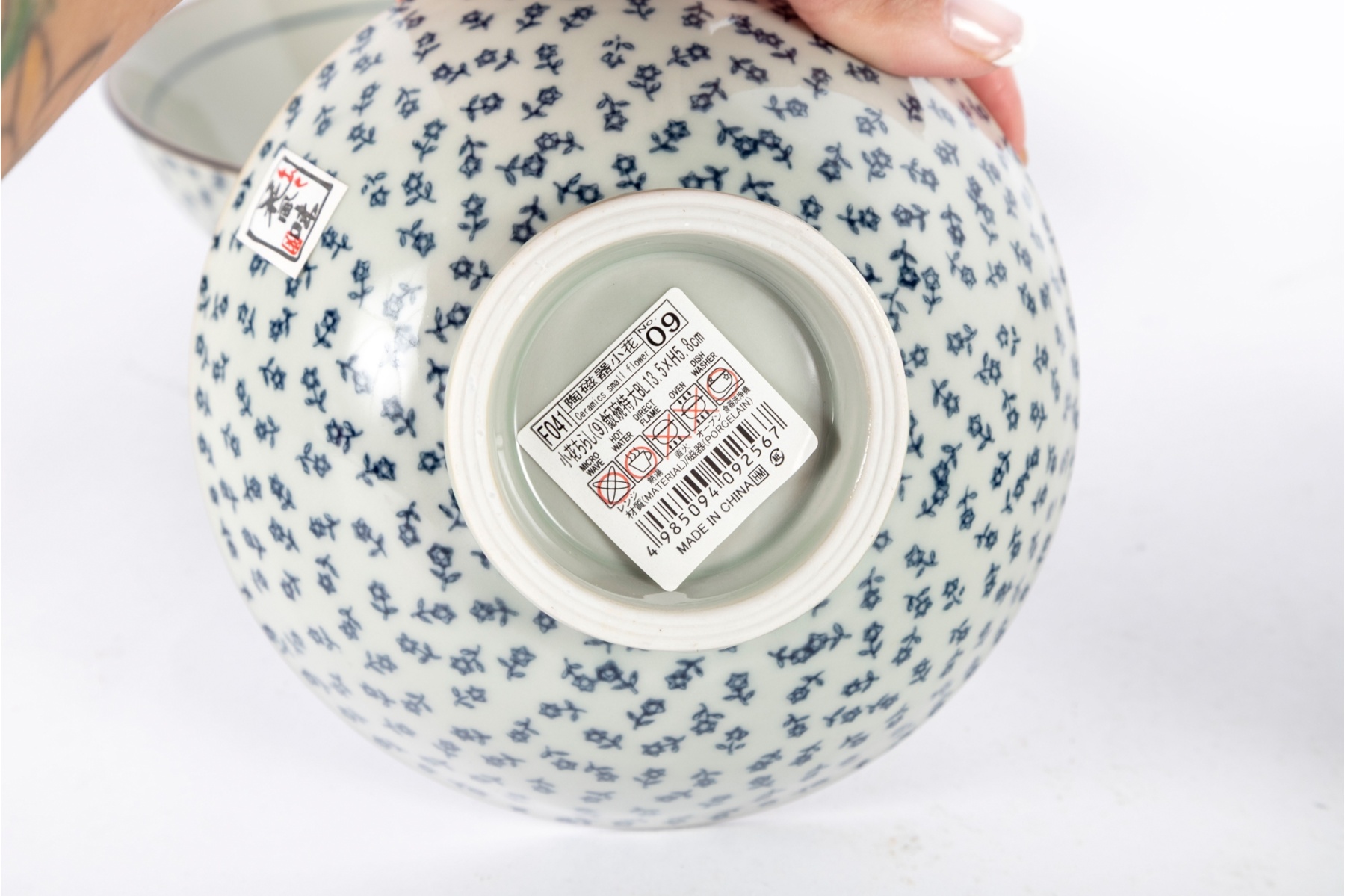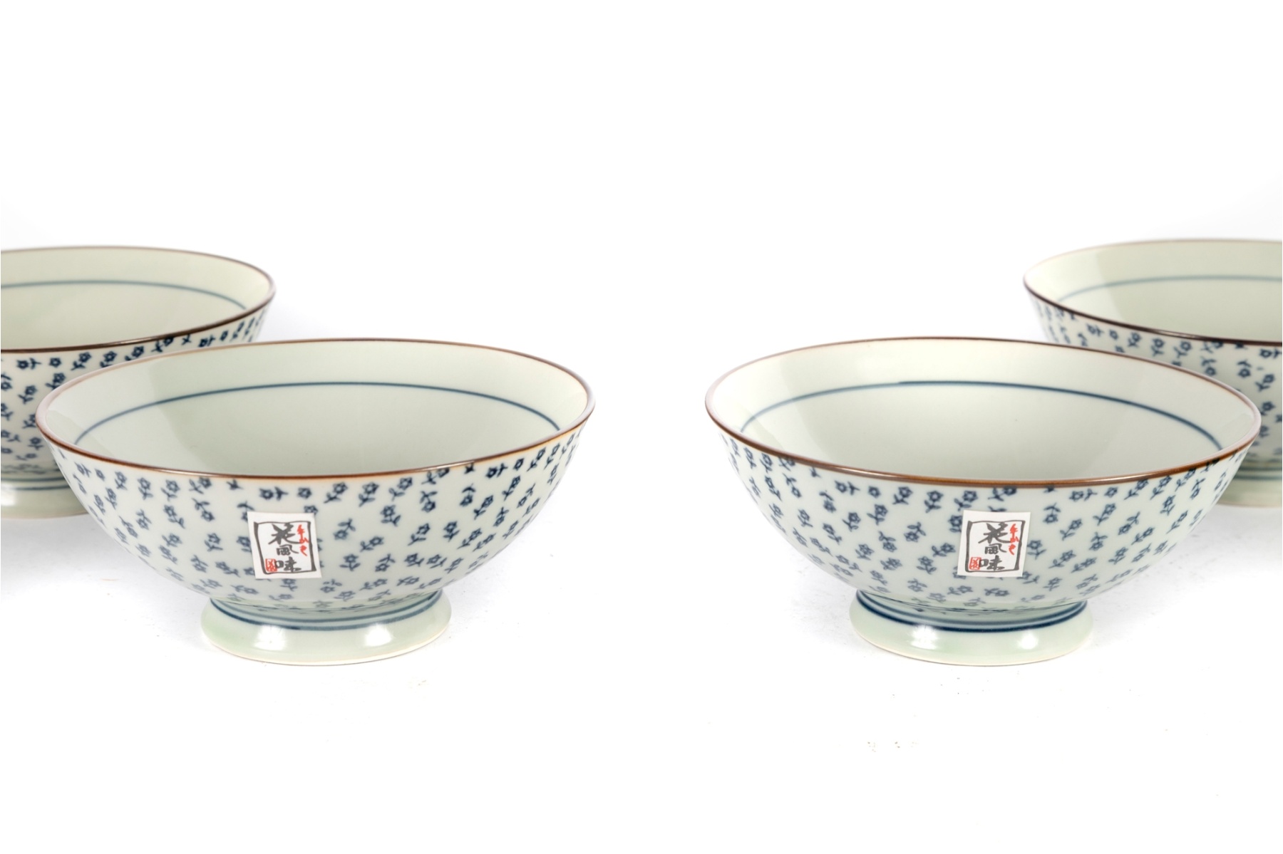 Elegant set of four blue and white porcelain bowls, each finely decorated with a repeating floral motif and double blue line accent around the rim and interior. The bowls feature a subtle celadon tone glaze with brown-edged rims and applied maker’s label to the side. Undersides retain original retail stickers marked Made in China.