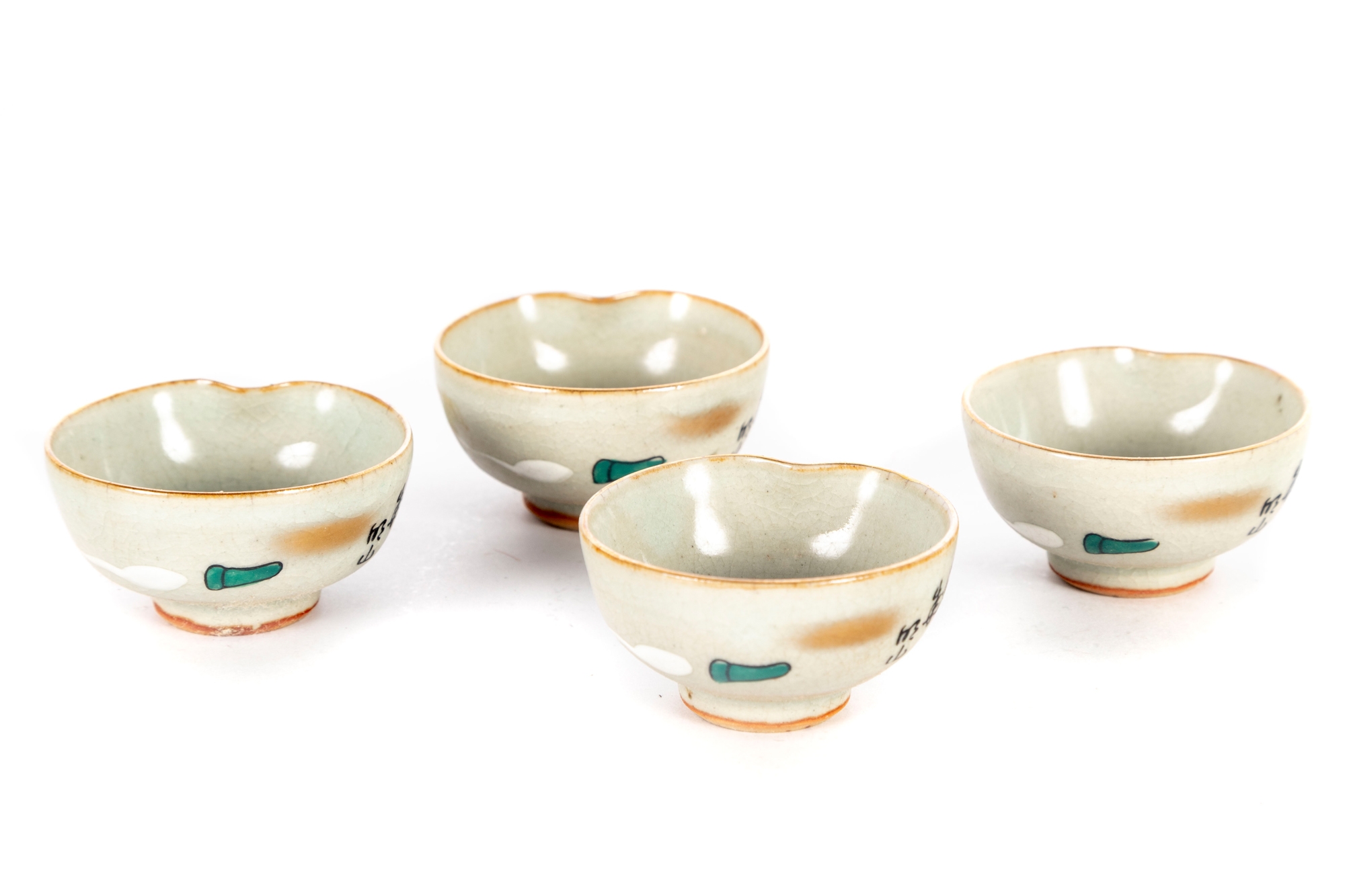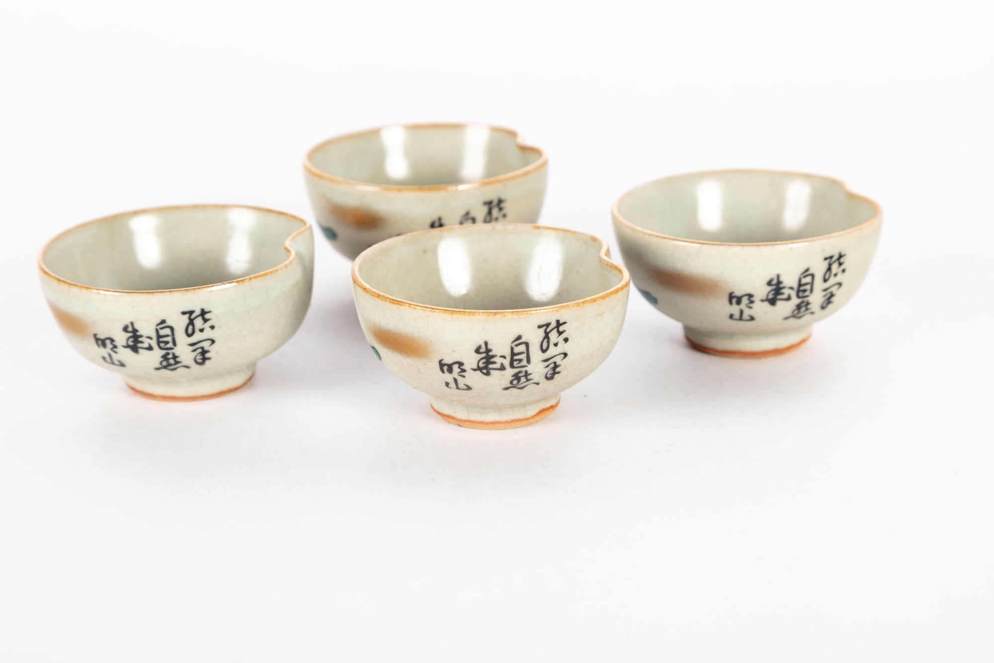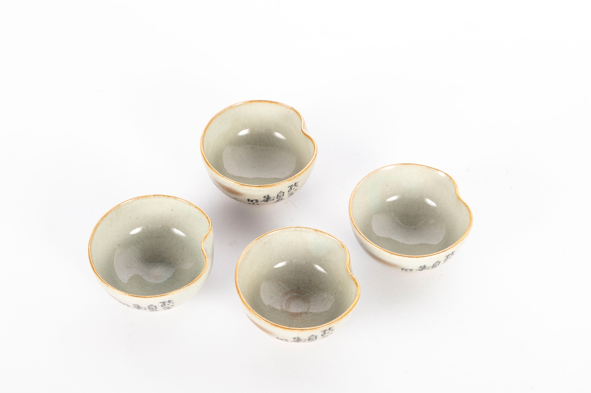 Delicate set of four small vintage Chinese porcelain cups, each featuring a classic crackle glaze with hand-painted calligraphy and subtle gold rim detailing.
