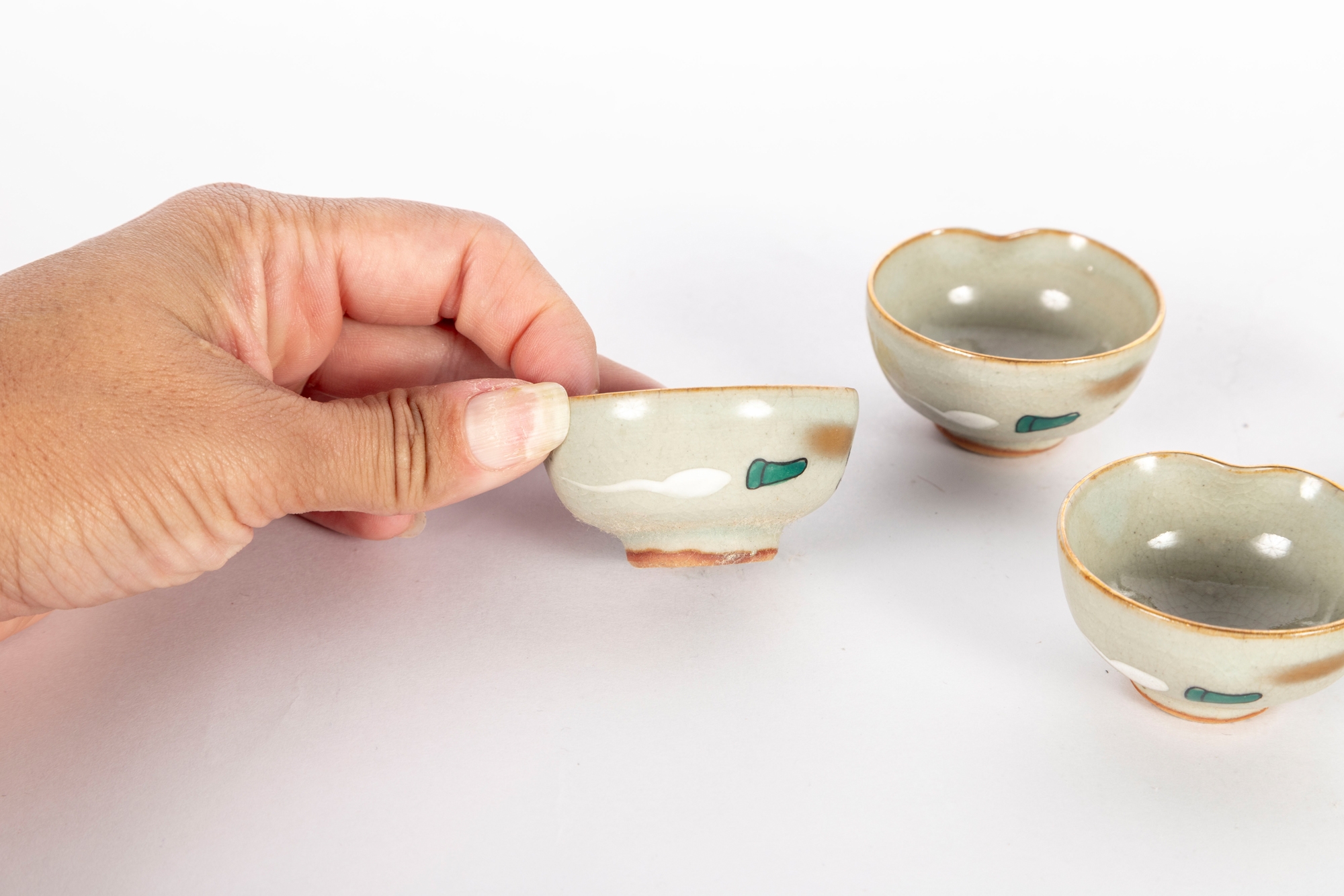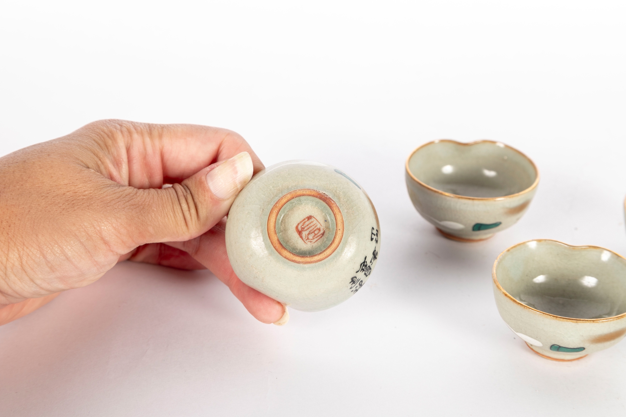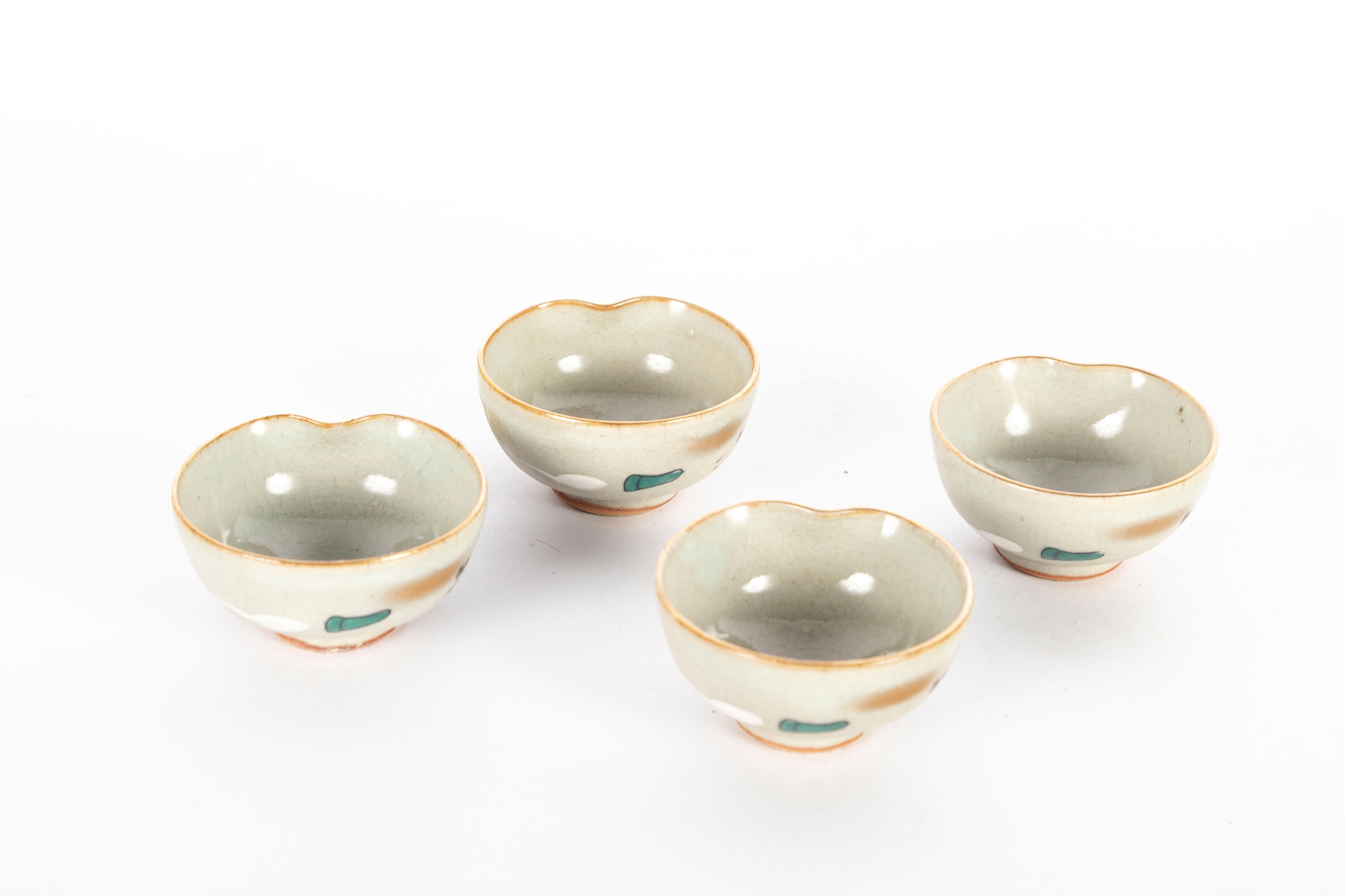Delicate set of four small vintage Chinese porcelain cups, each featuring a classic crackle glaze with hand-painted calligraphy and subtle gold rim detailing.