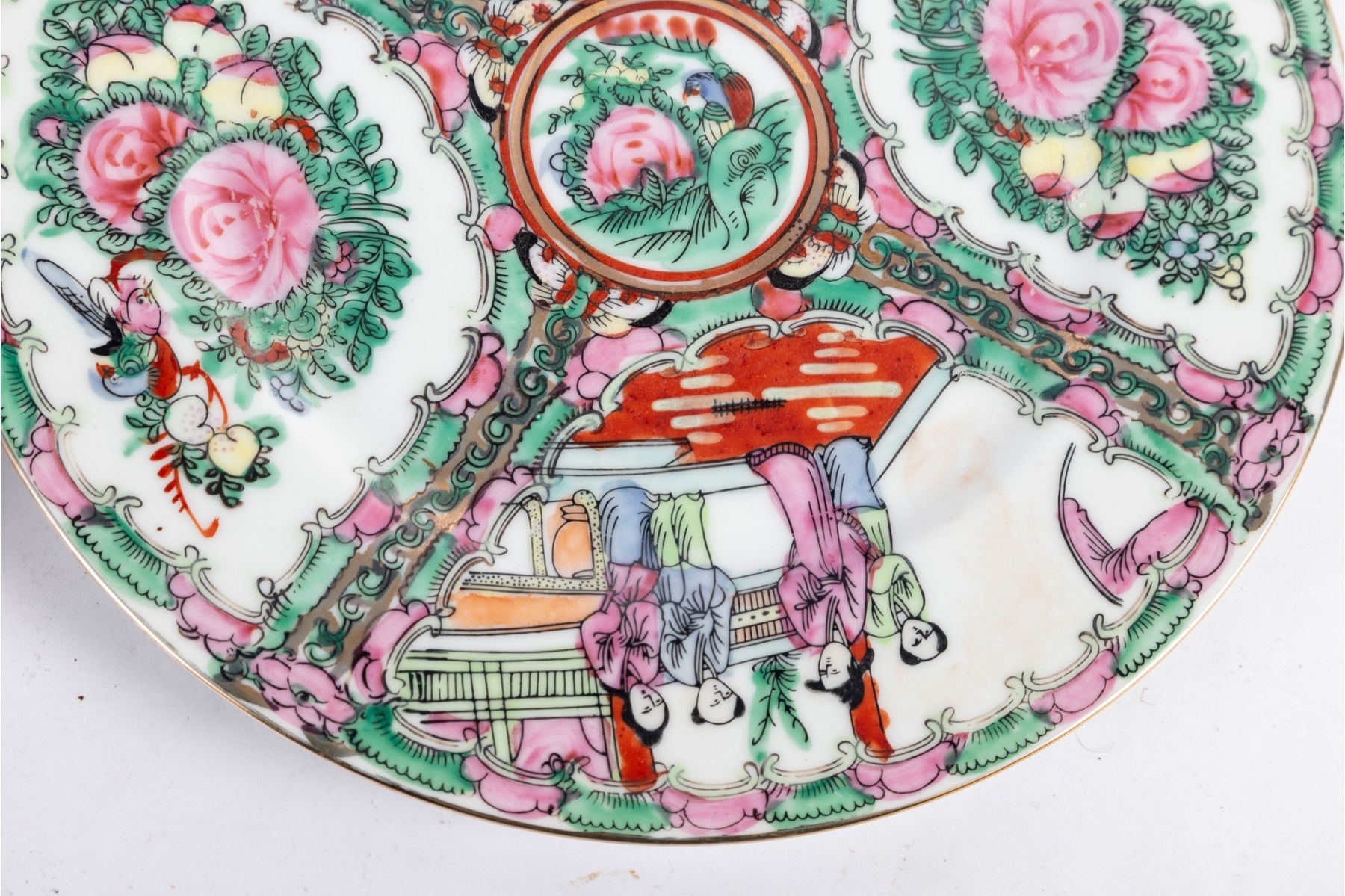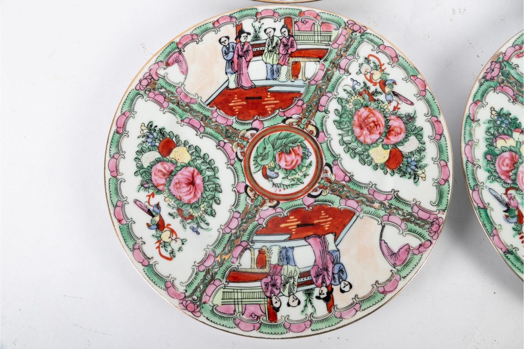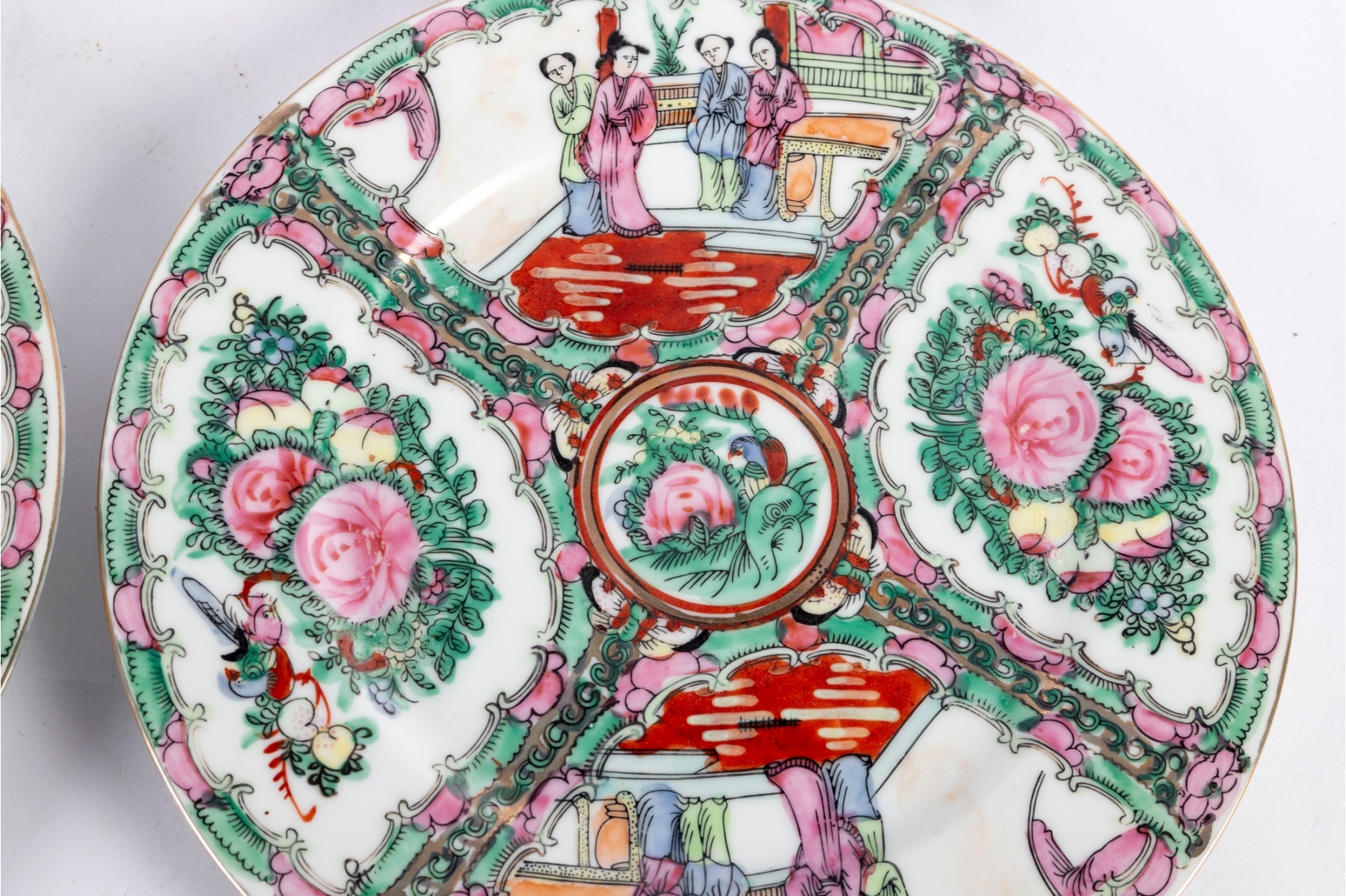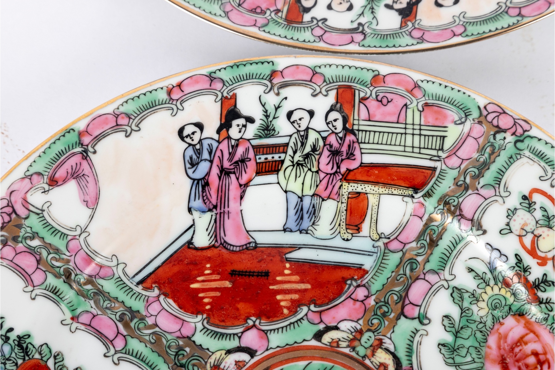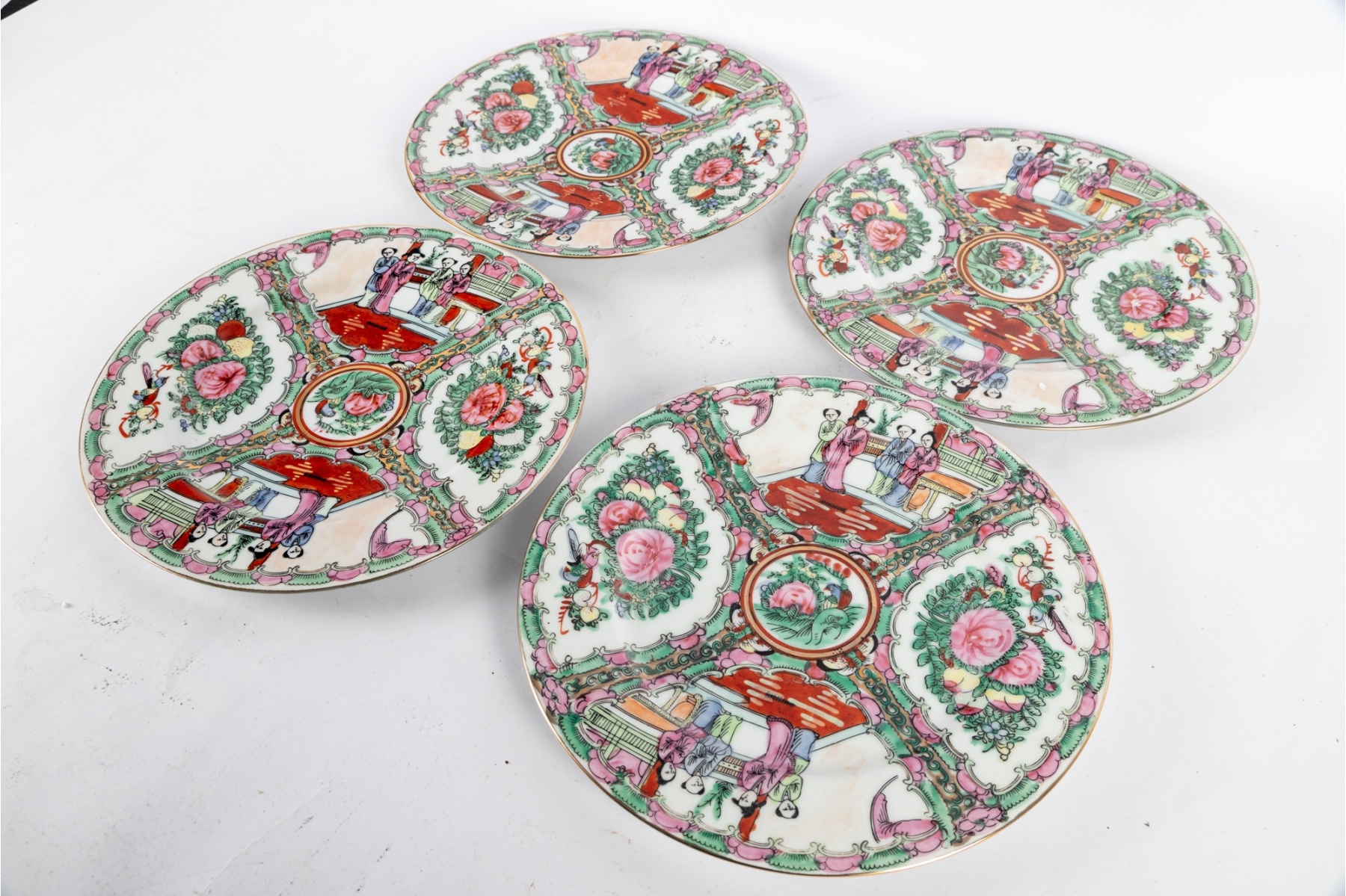 Beautiful set of four hand-painted Chinese Rose Medallion porcelain plates, each featuring alternating court and floral panels richly decorated in vibrant enamels of pink, green, red, and gold. The designs include figures in garden scenes, birds, butterflies, and peonies surrounding a central medallion of flowers and foliage. Each plate is finished with gilt accents and a red seal mark to the underside.
