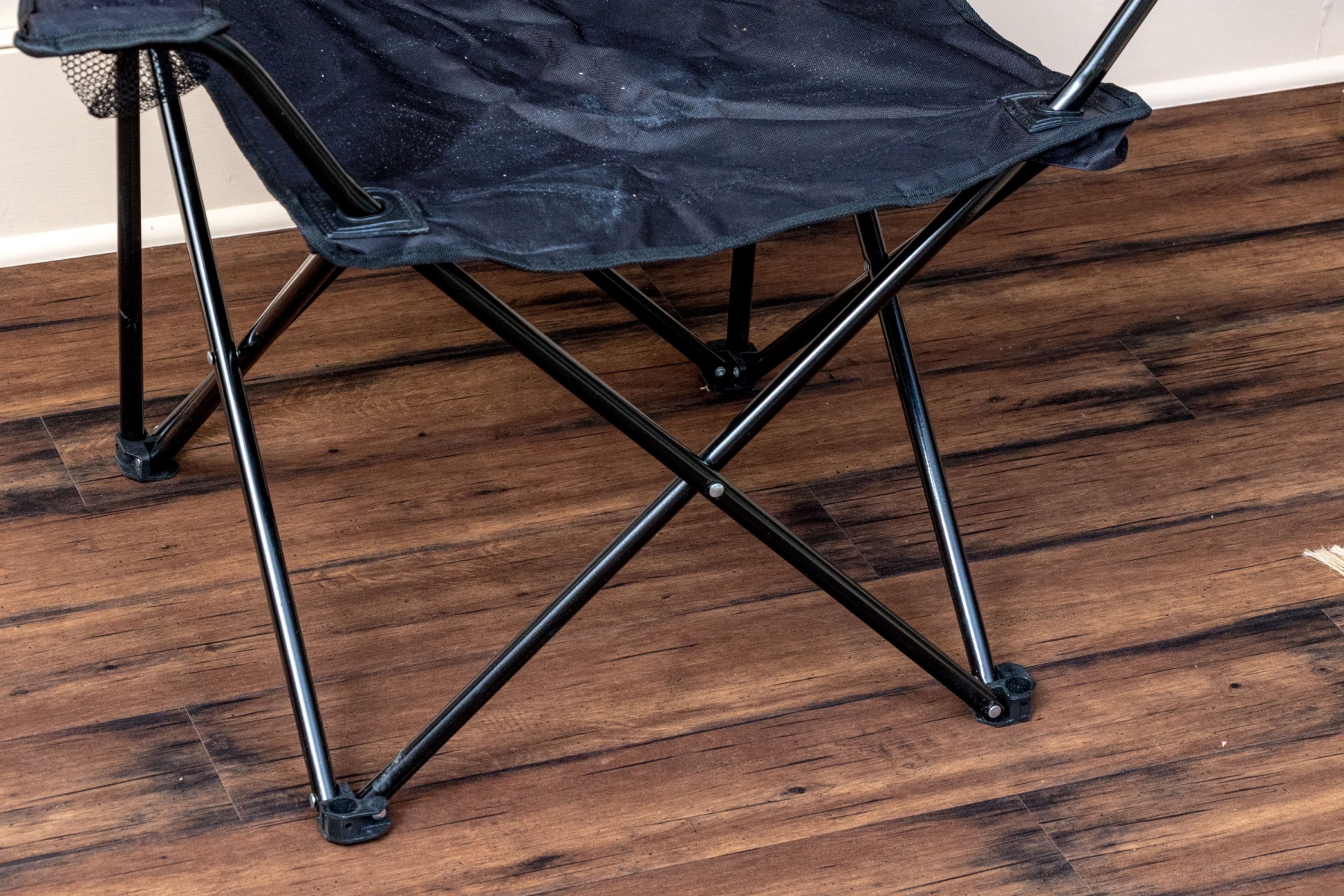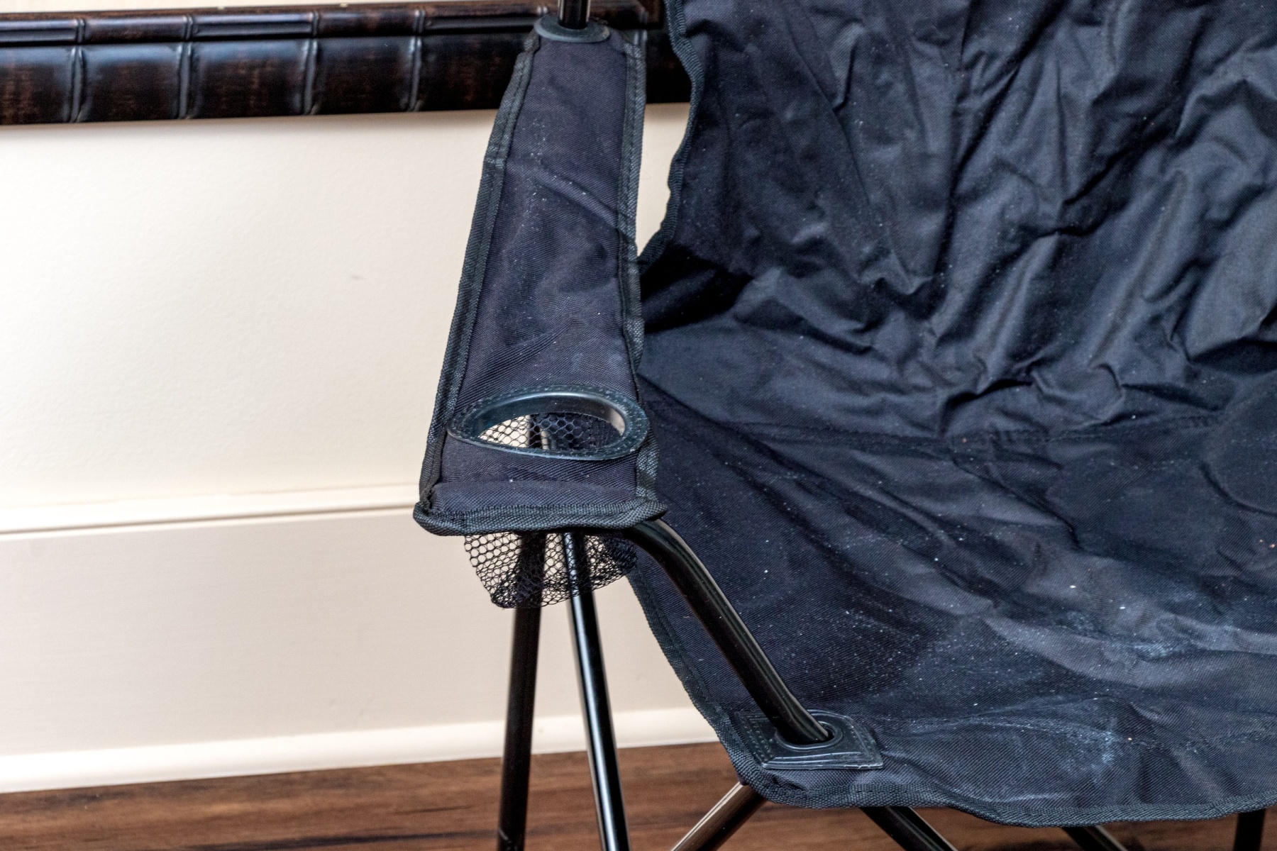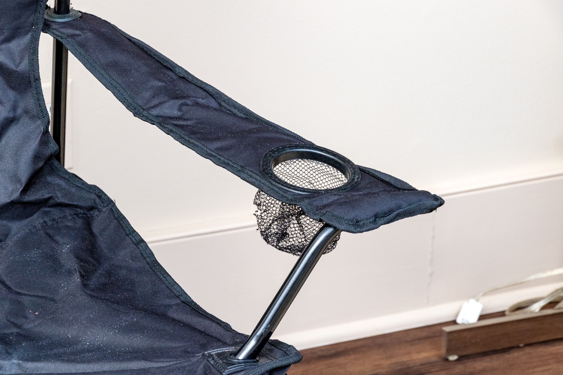 A handy set of four collapsible chairs with black slings, double cup holders, and black folding frames. Each with a storage case for protection and easy transportation.