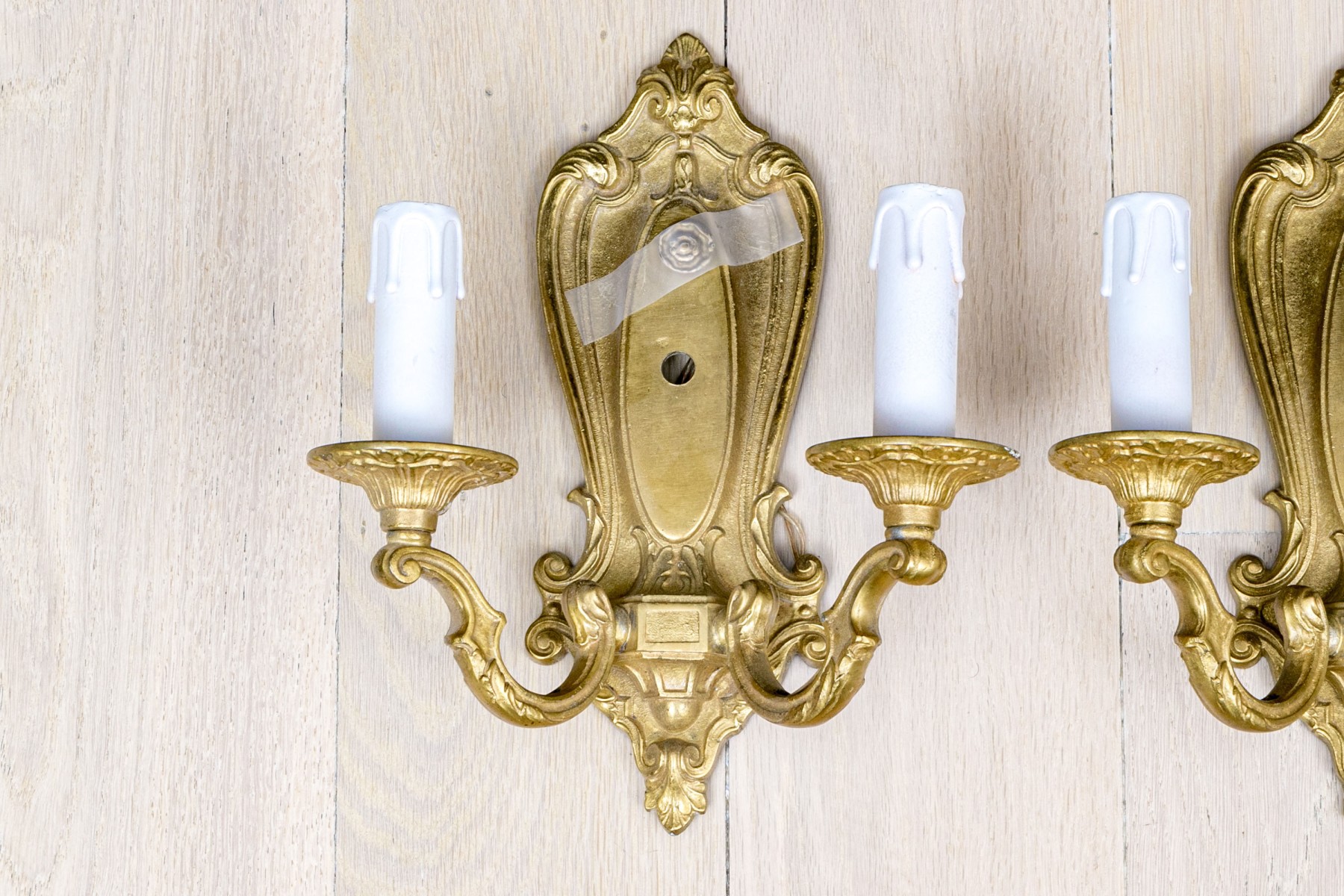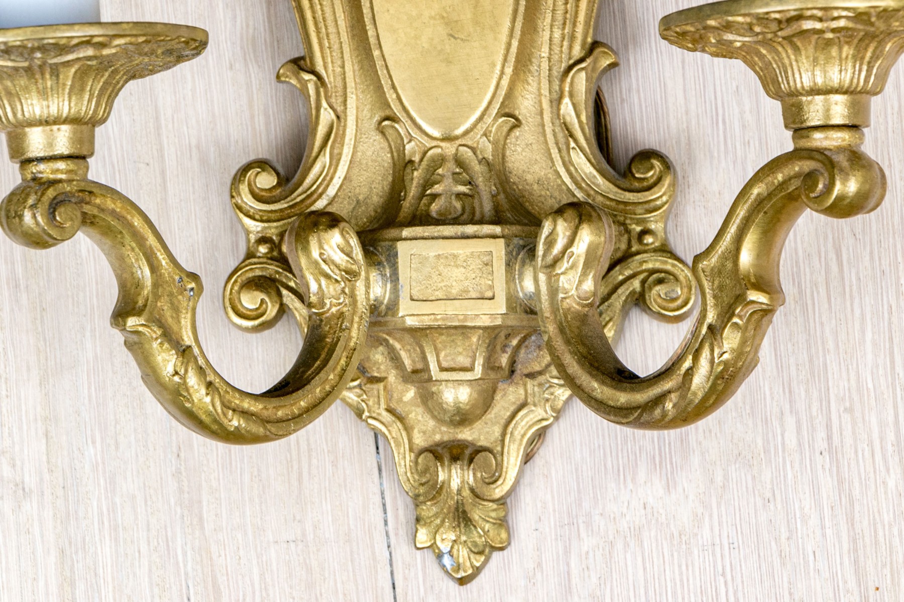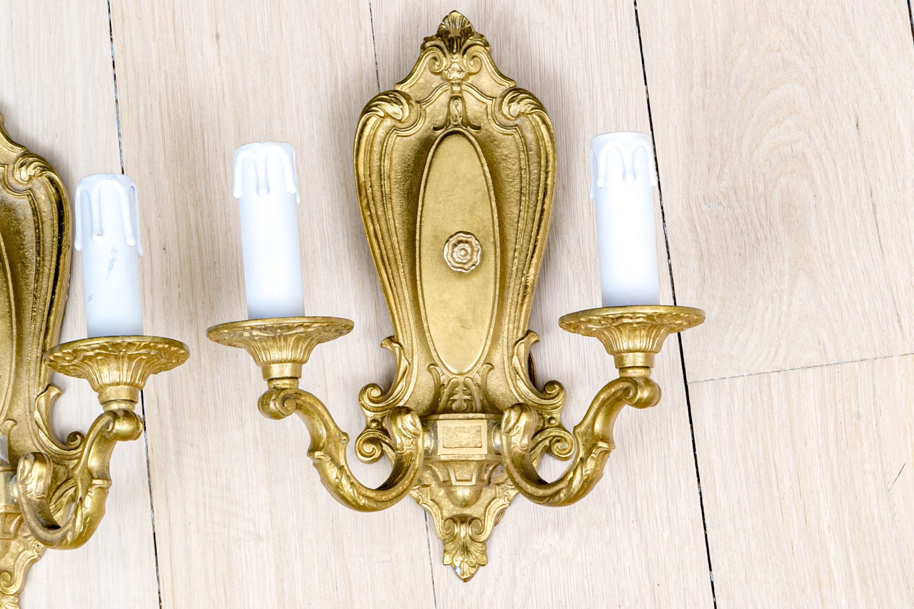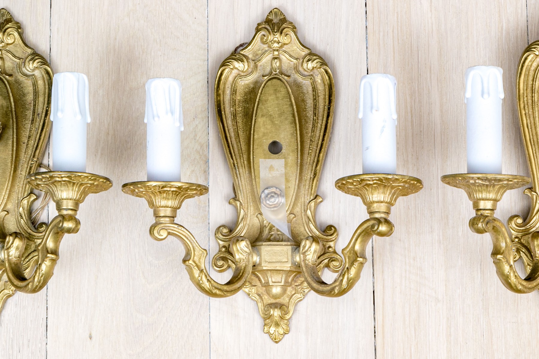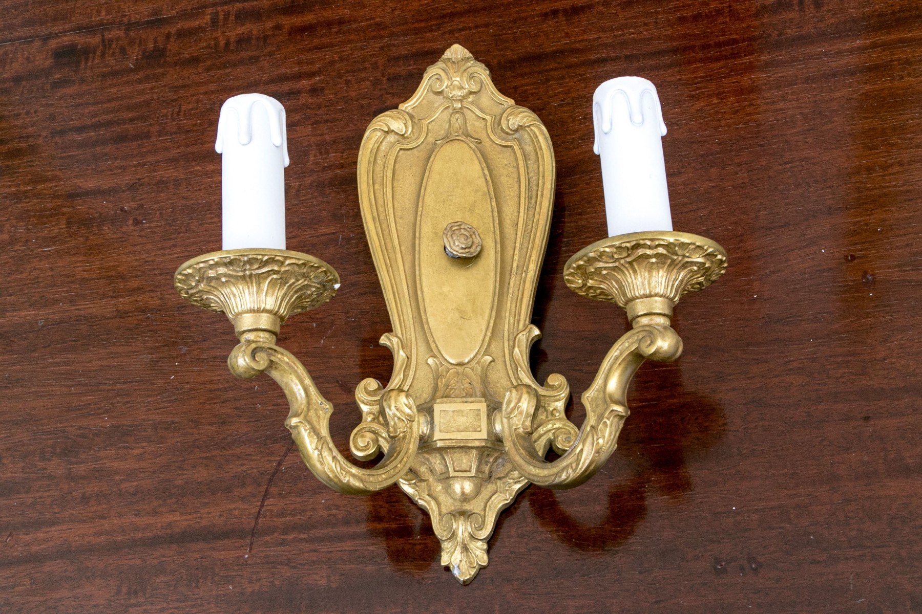 A fabulous set of four Crescent B.M. Co. electric wall sconces in semi-matte brass. Each features twin candle sockets over elegantly bracketed and scrolled arms attaching to elongated plaques with foliate relief borders and oval centers adorned with rosette buttons.