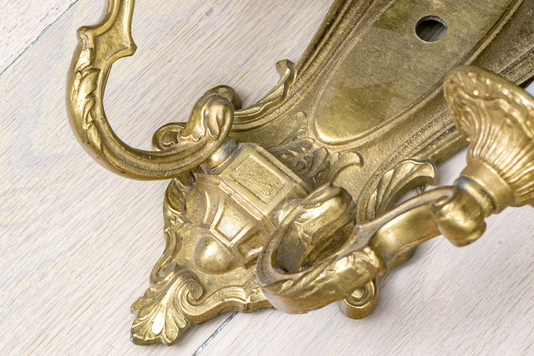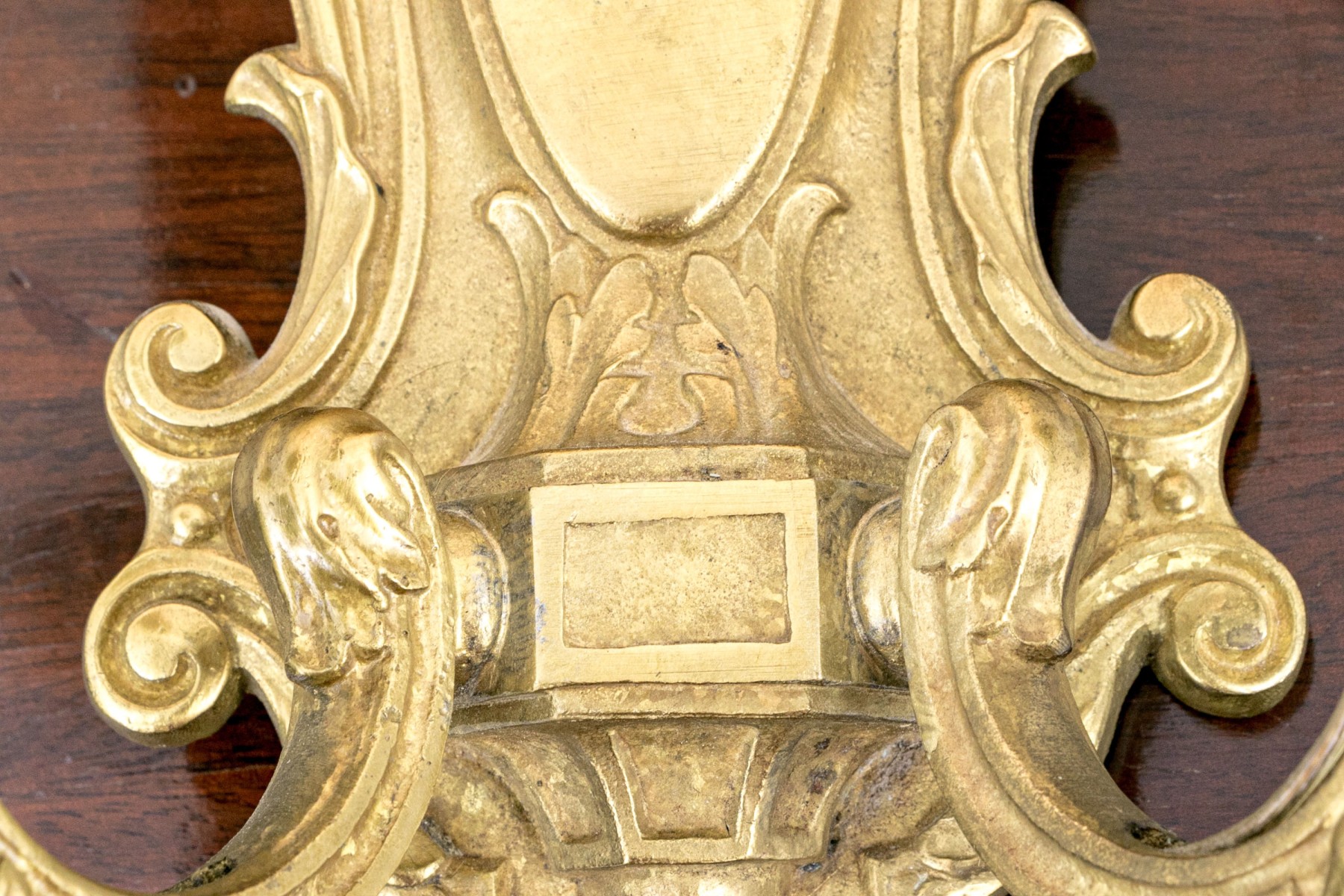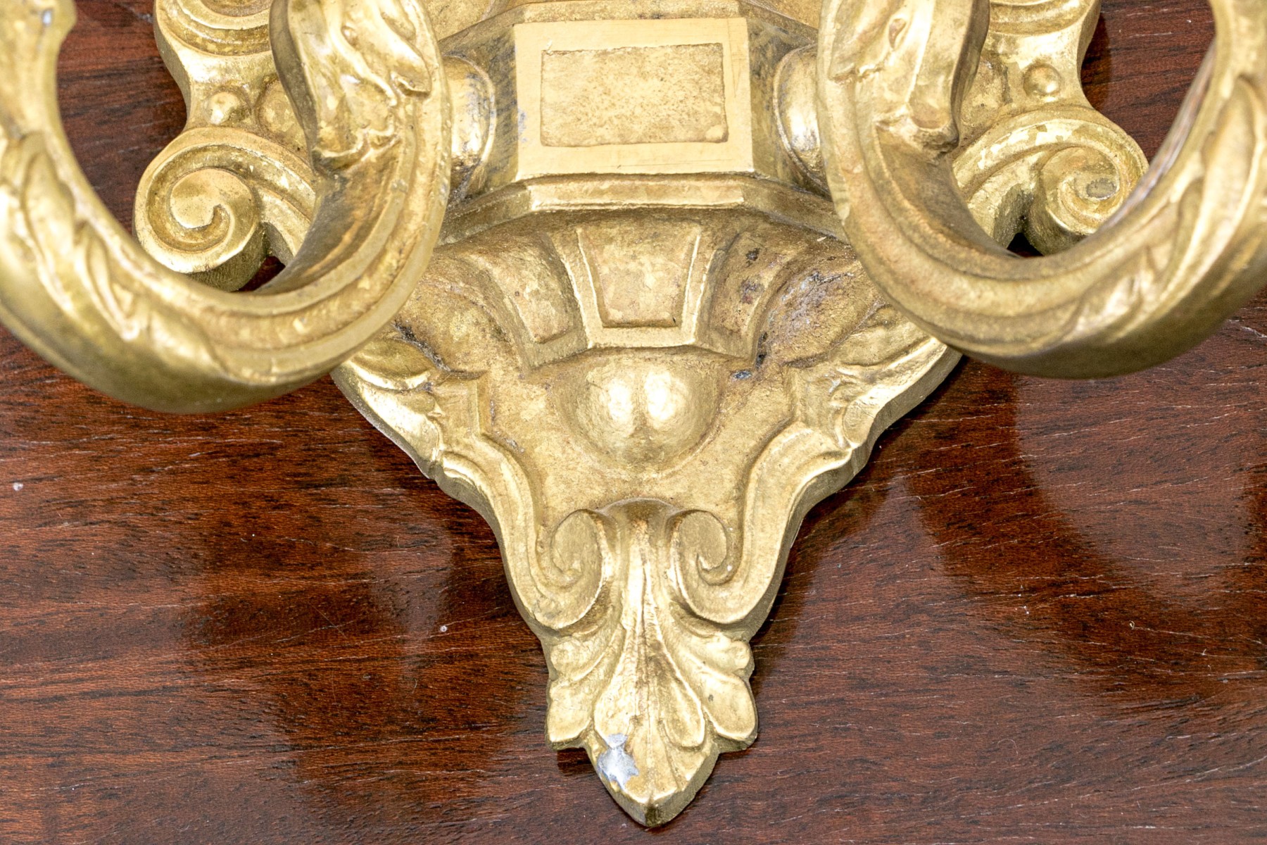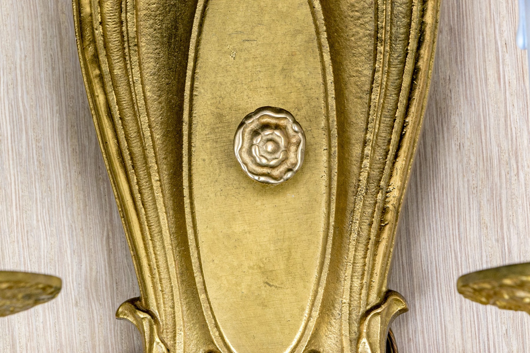 A fabulous set of four Crescent B.M. Co. electric wall sconces in semi-matte brass. Each features twin candle sockets over elegantly bracketed and scrolled arms attaching to elongated plaques with foliate relief borders and oval centers adorned with rosette buttons.