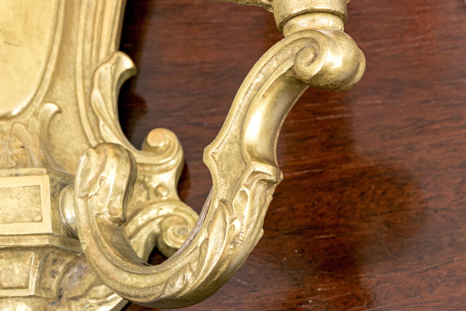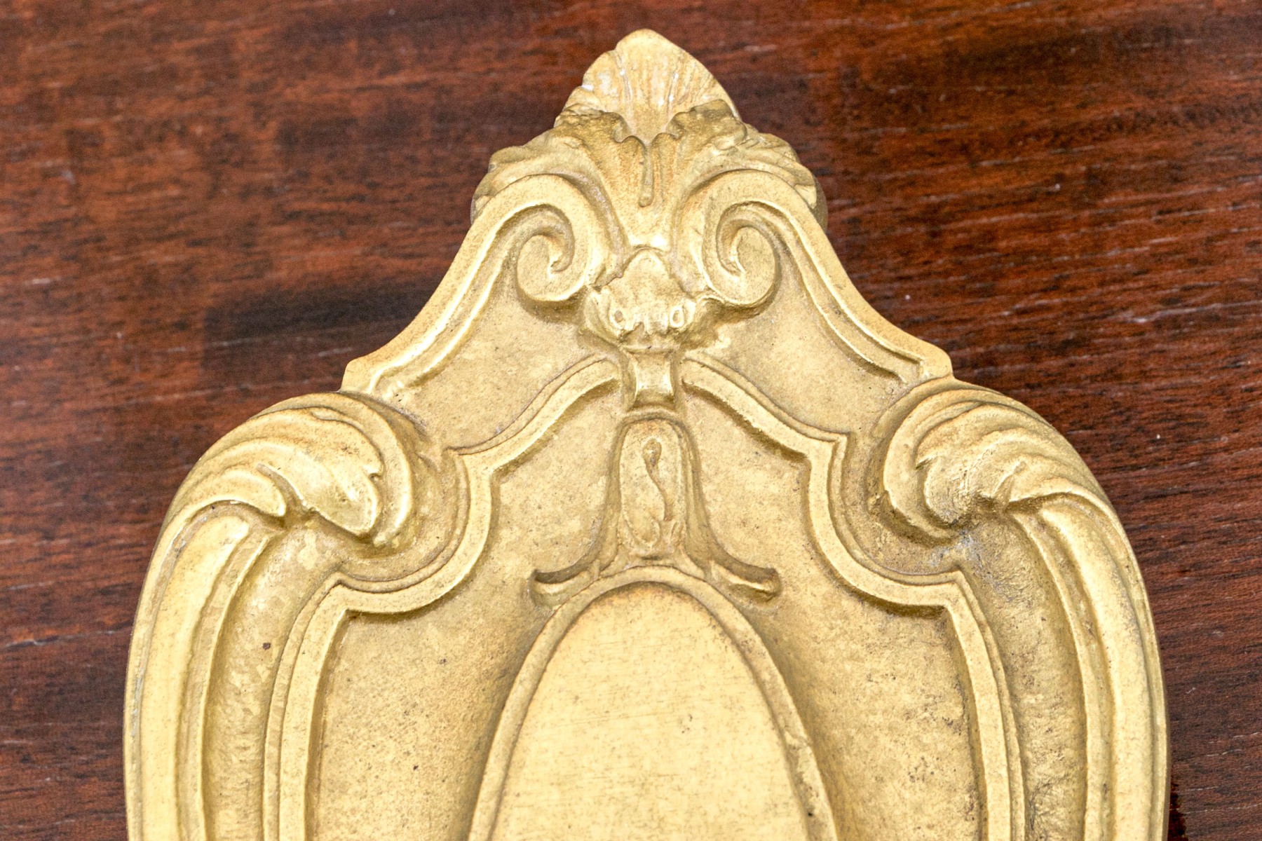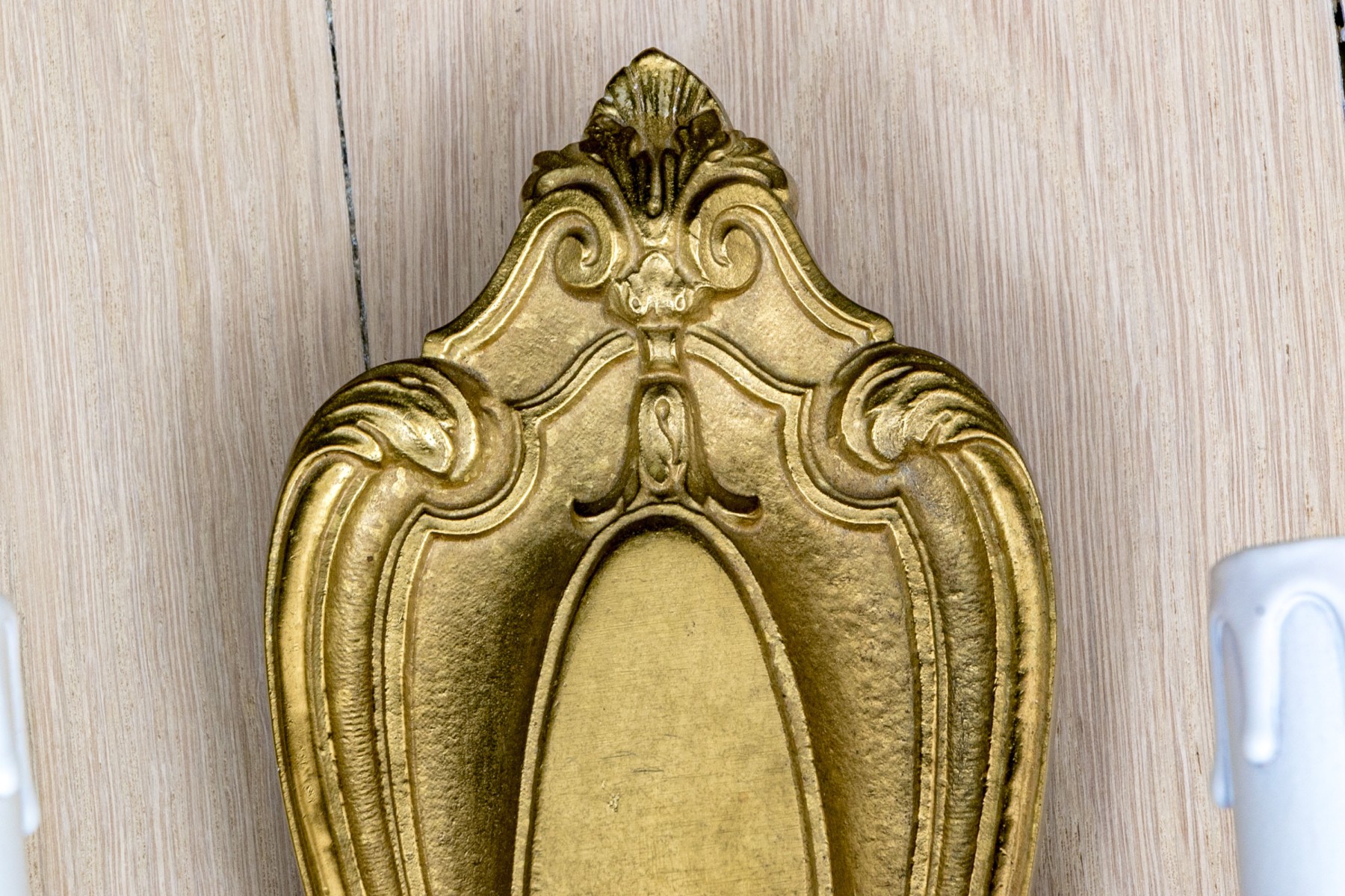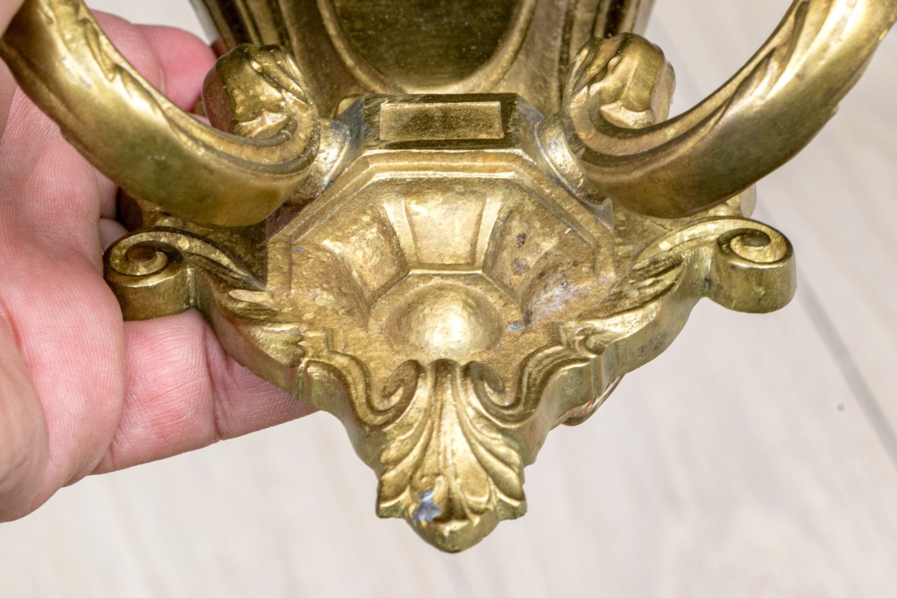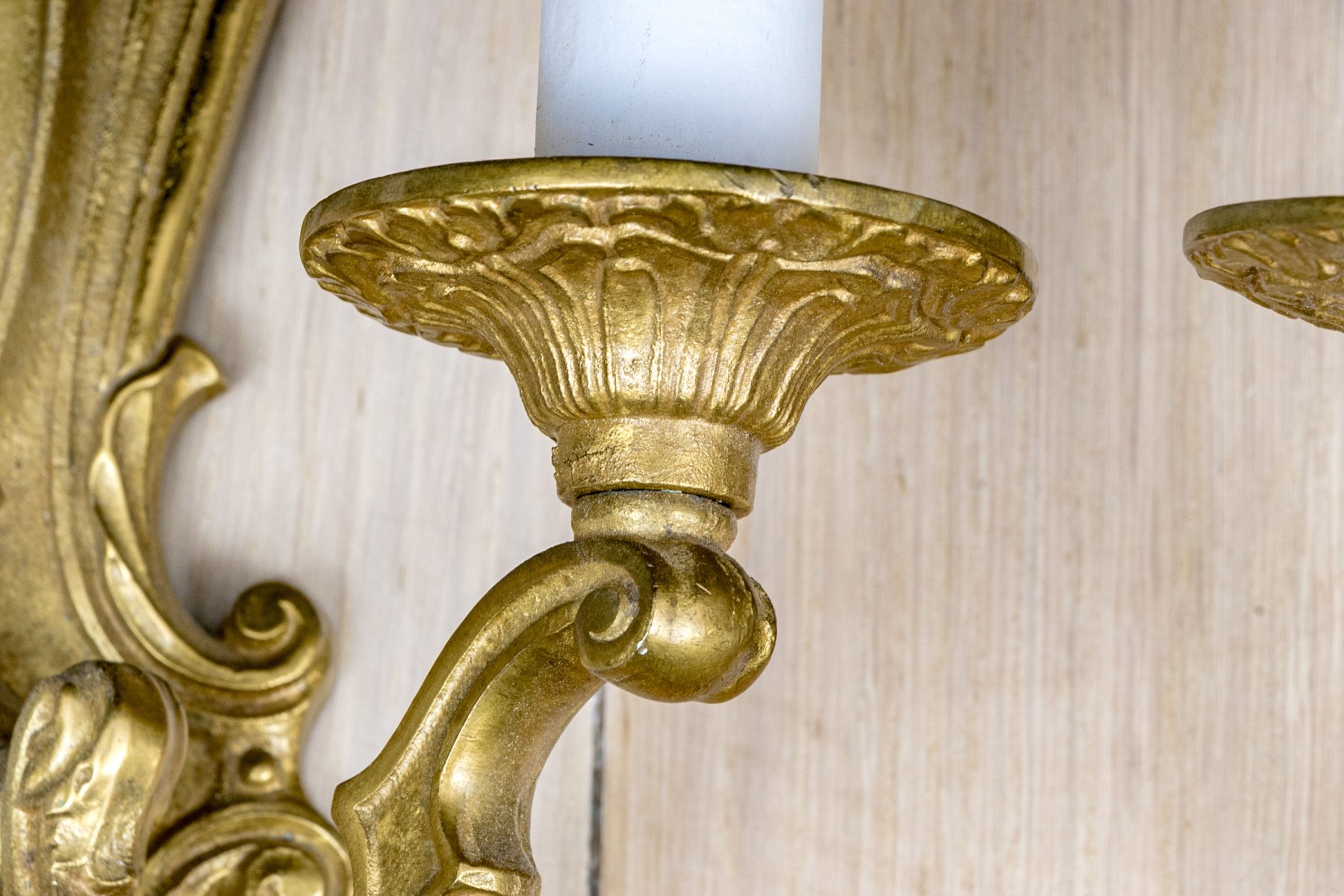 A fabulous set of four Crescent B.M. Co. electric wall sconces in semi-matte brass. Each features twin candle sockets over elegantly bracketed and scrolled arms attaching to elongated plaques with foliate relief borders and oval centers adorned with rosette buttons.
