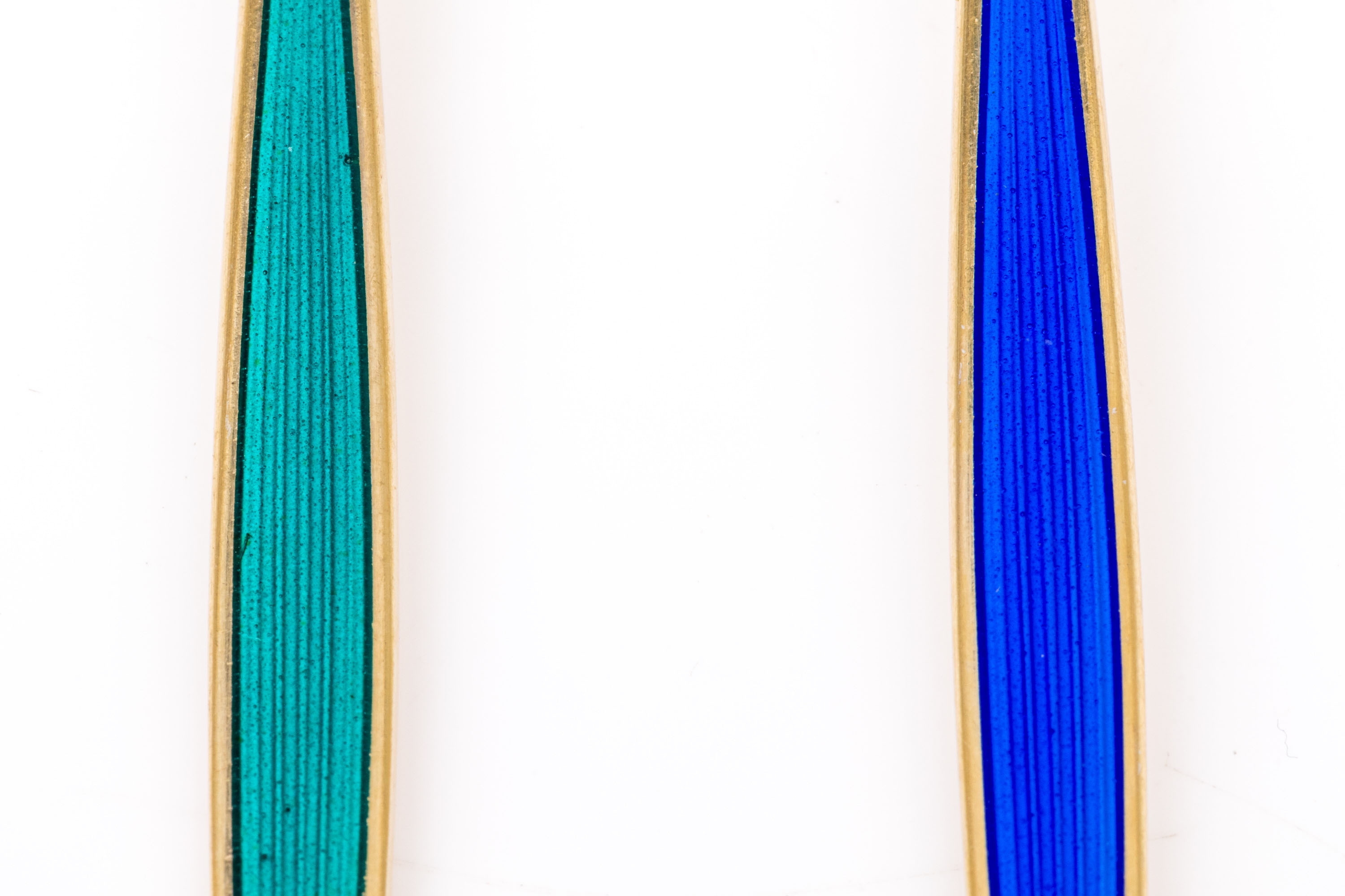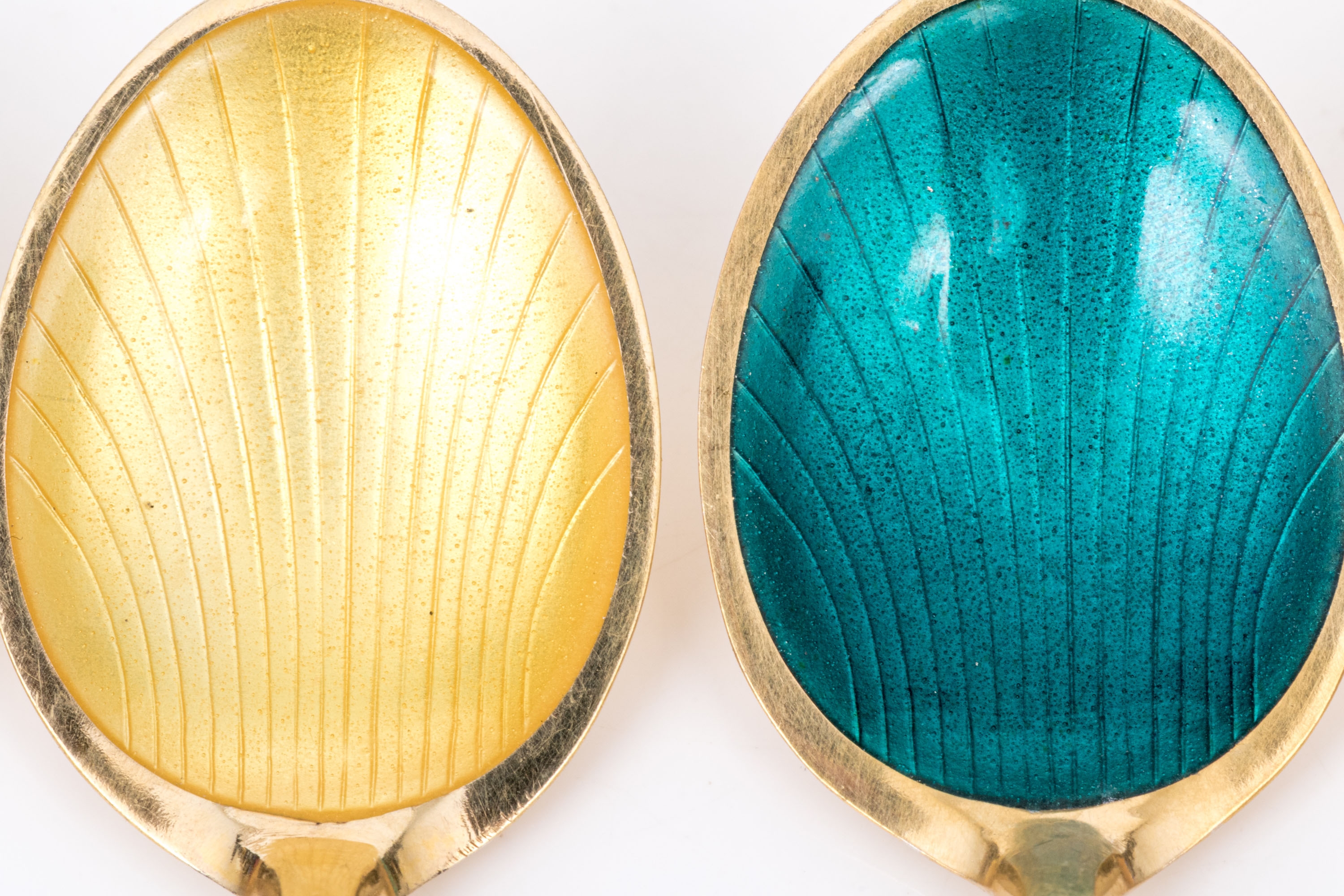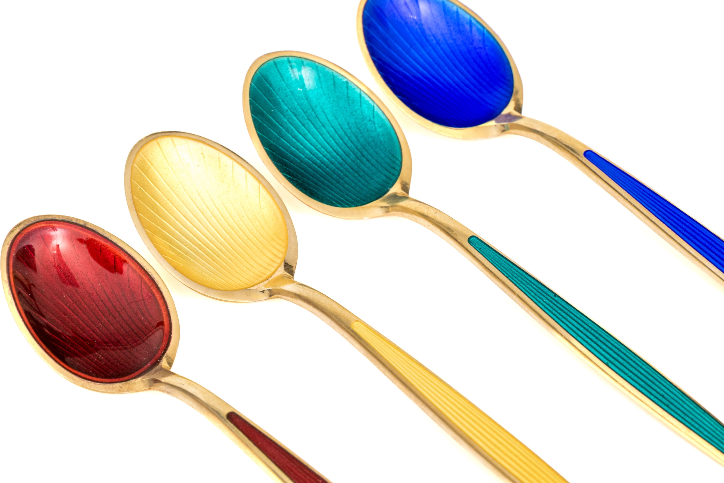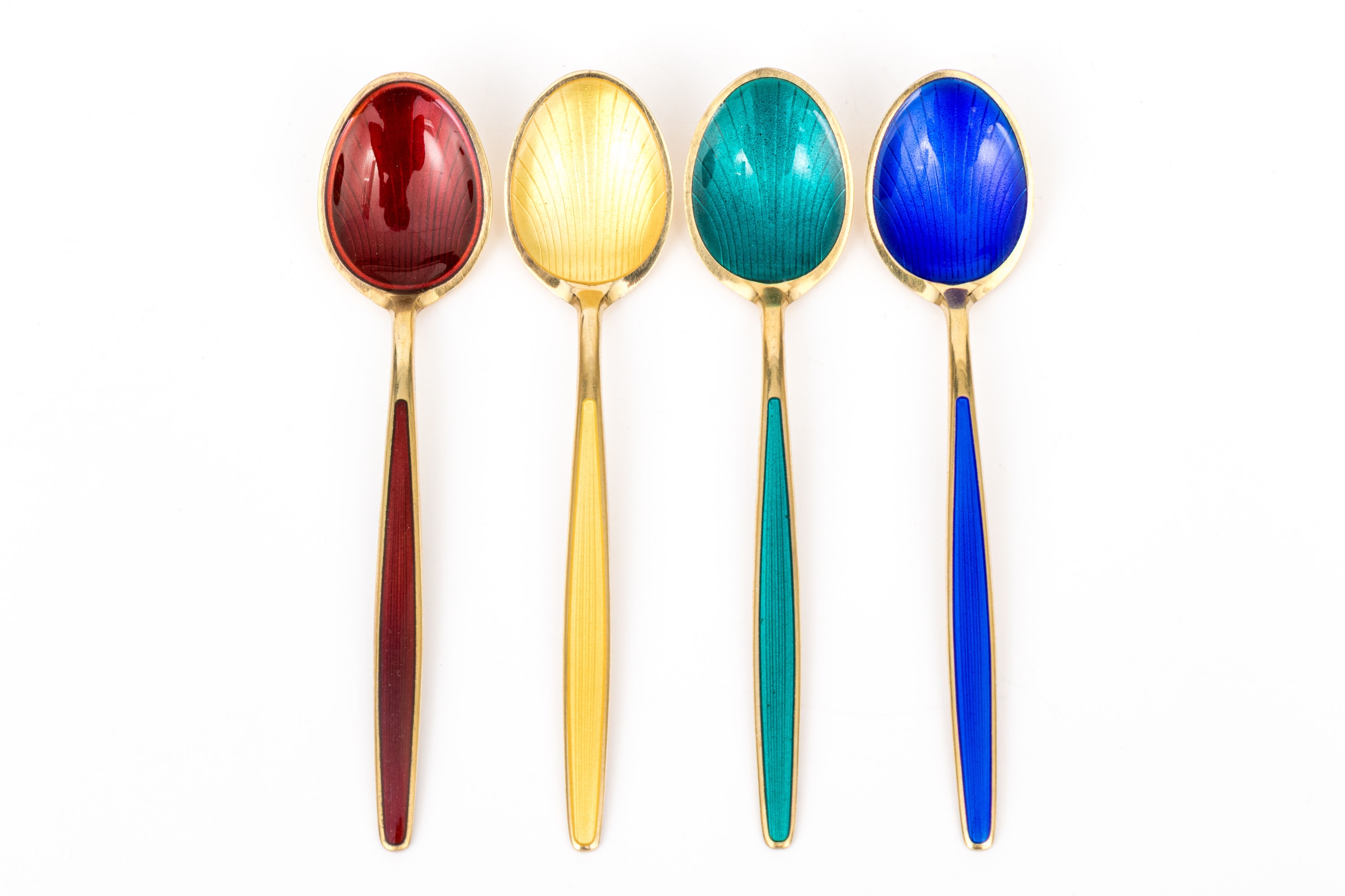 Each spoon in a different bright color enamel over the vermeil sterling silver.