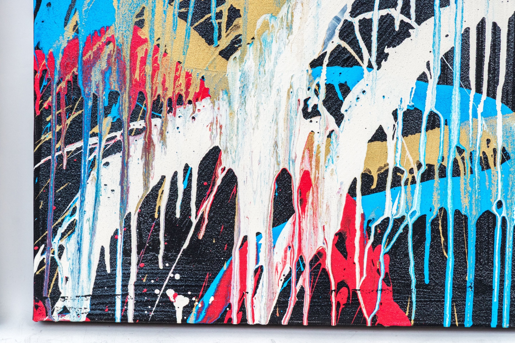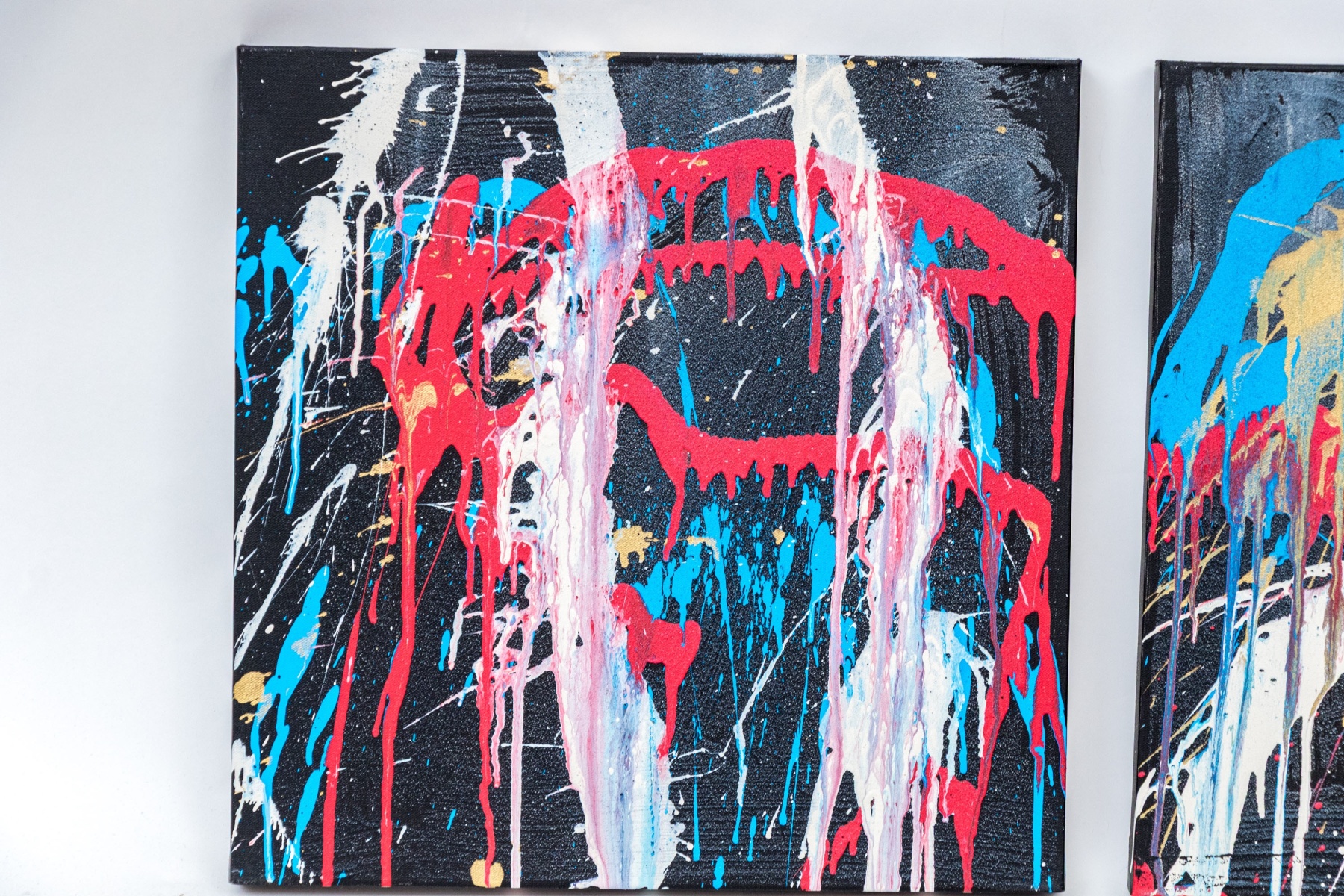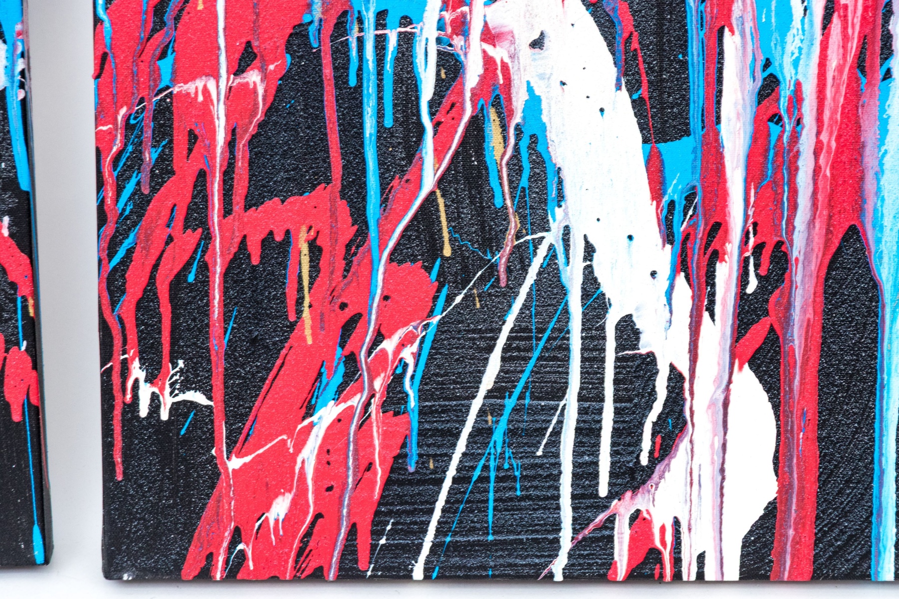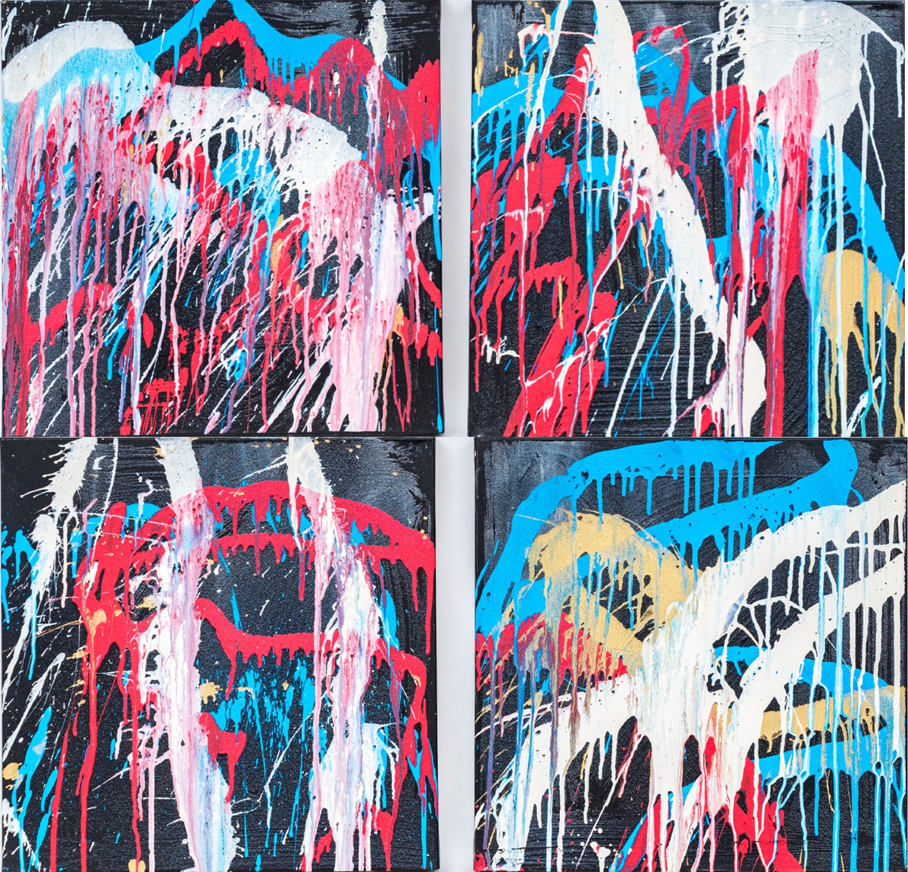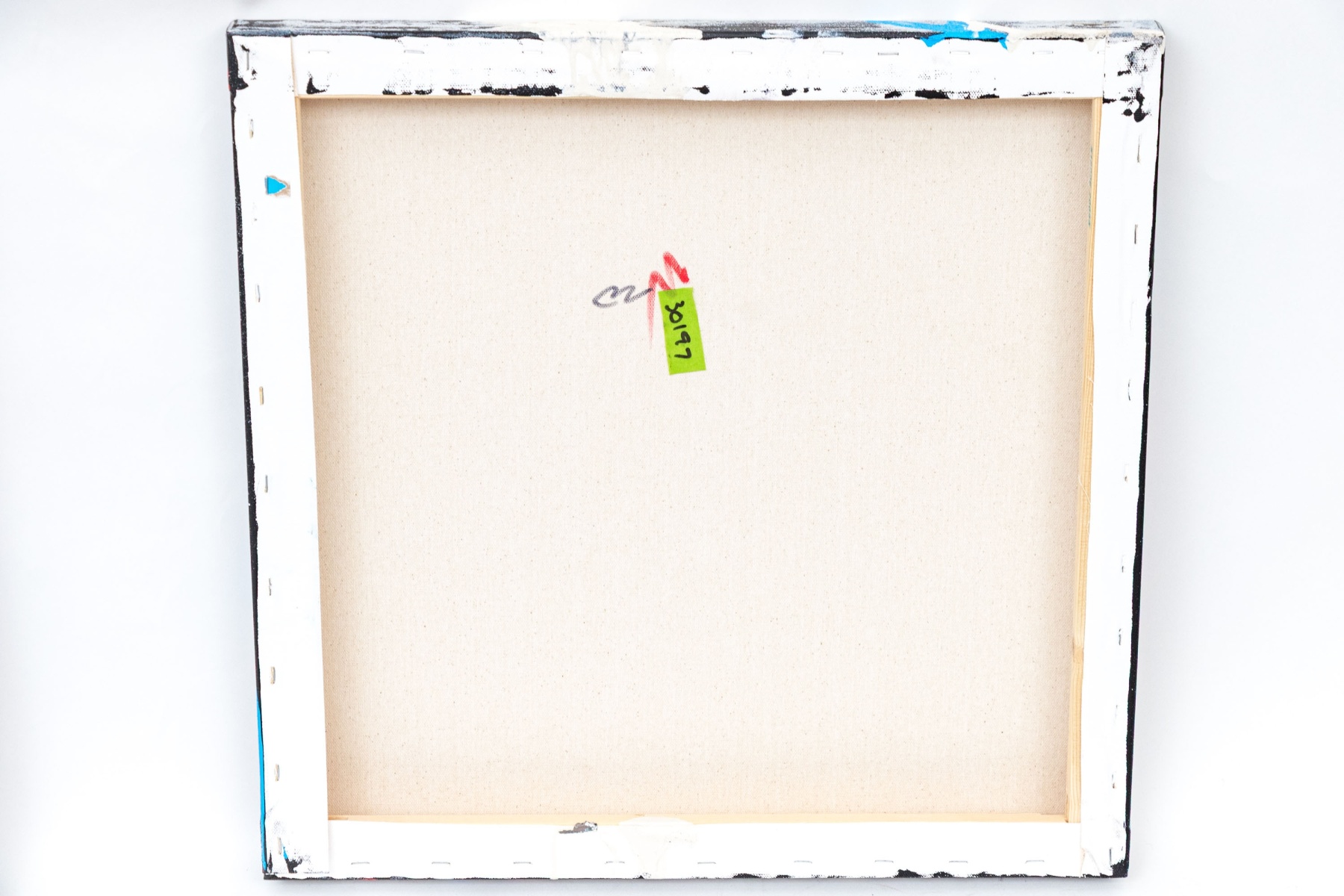 All are square form and feature abstract motifs. All presented on stretcher supports but unframed. All are unsigned.