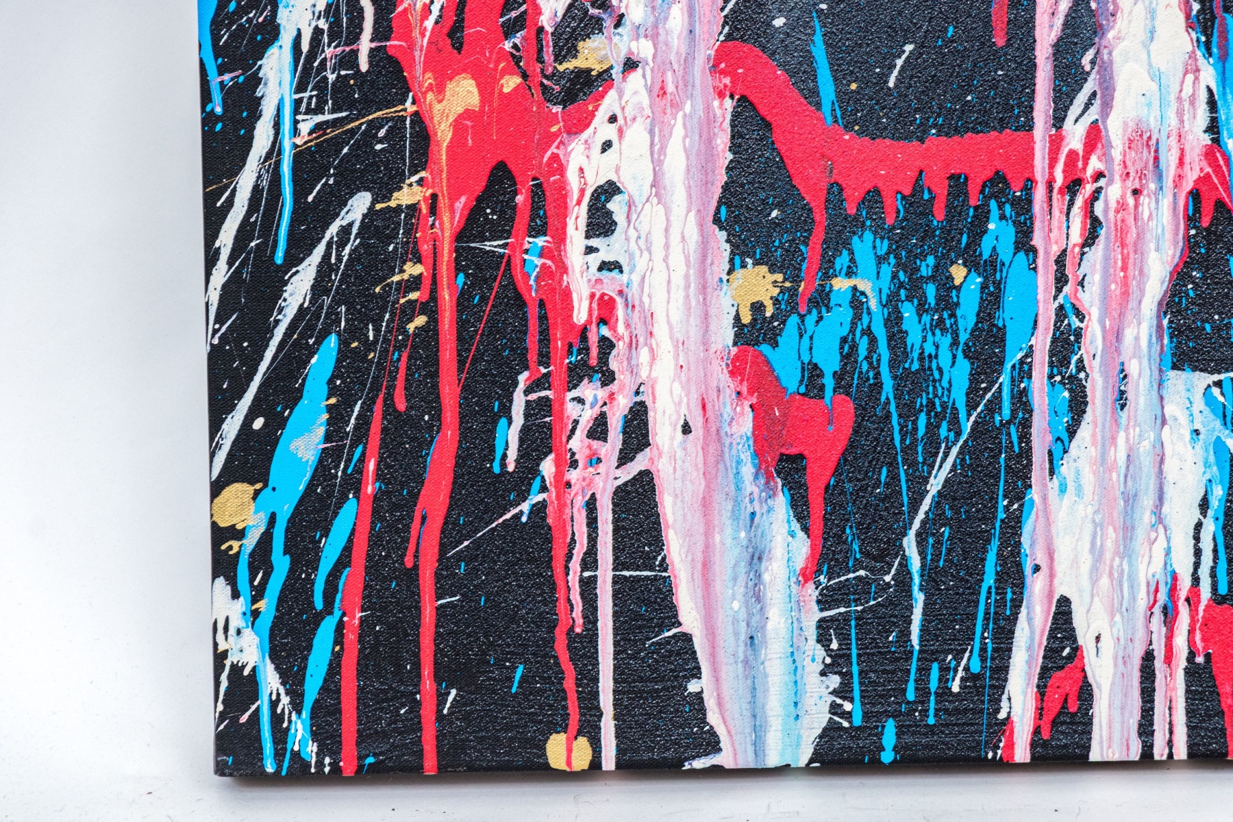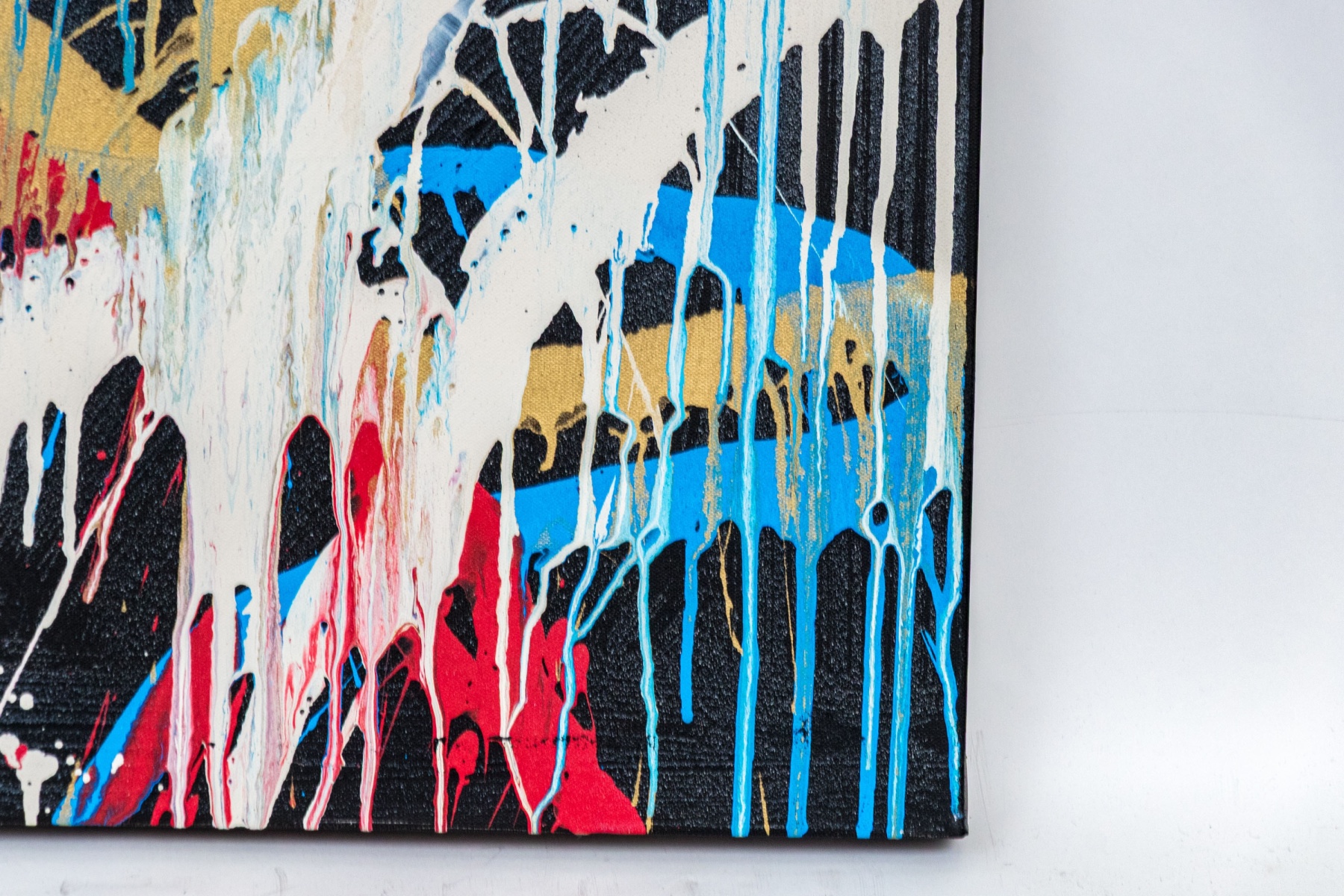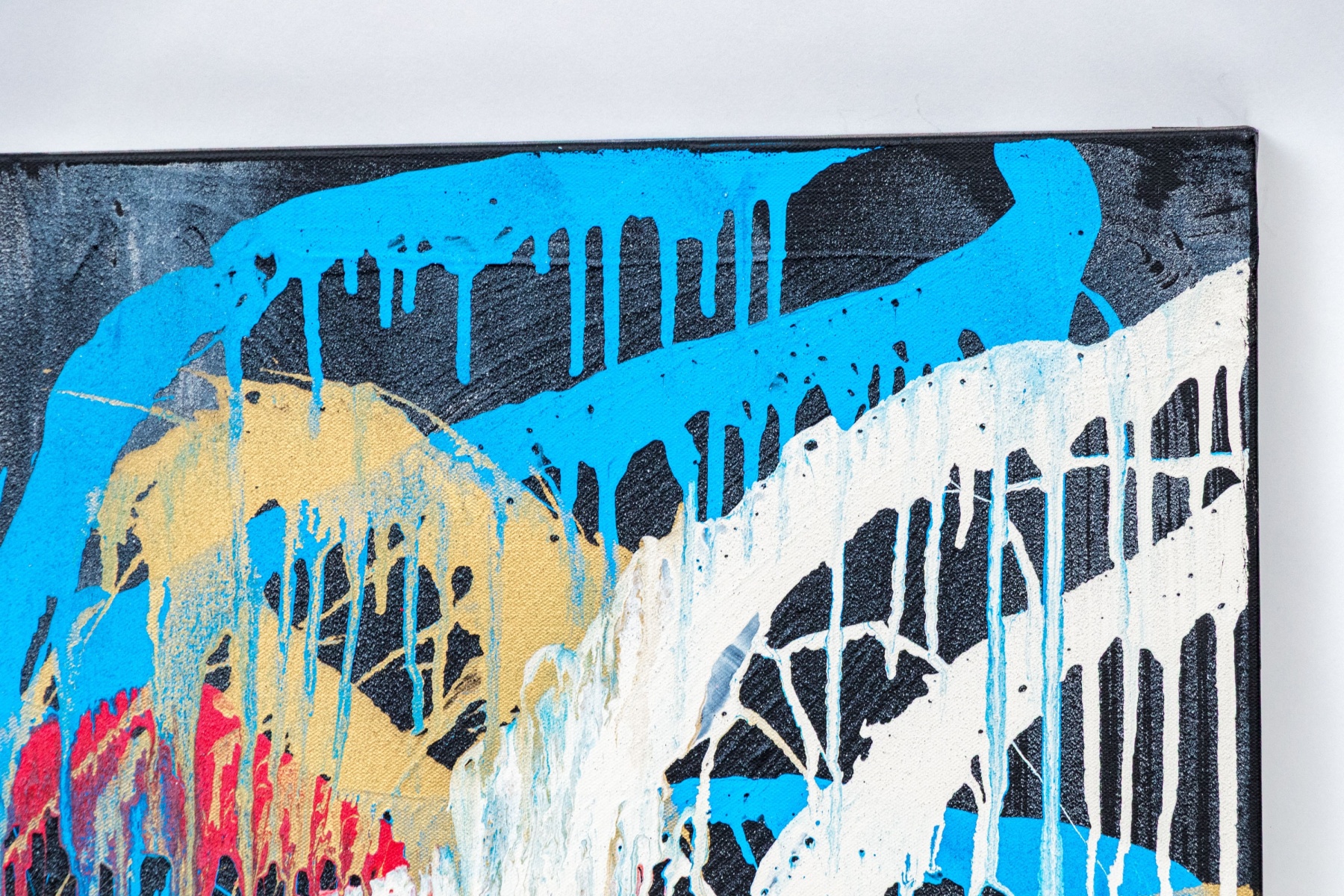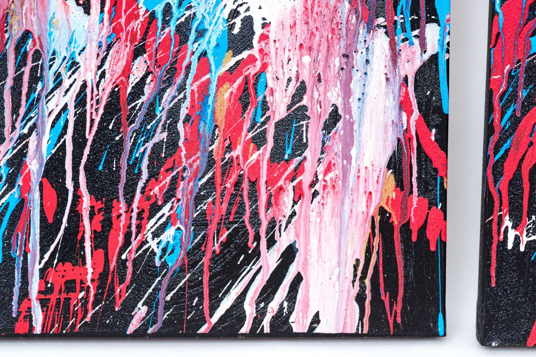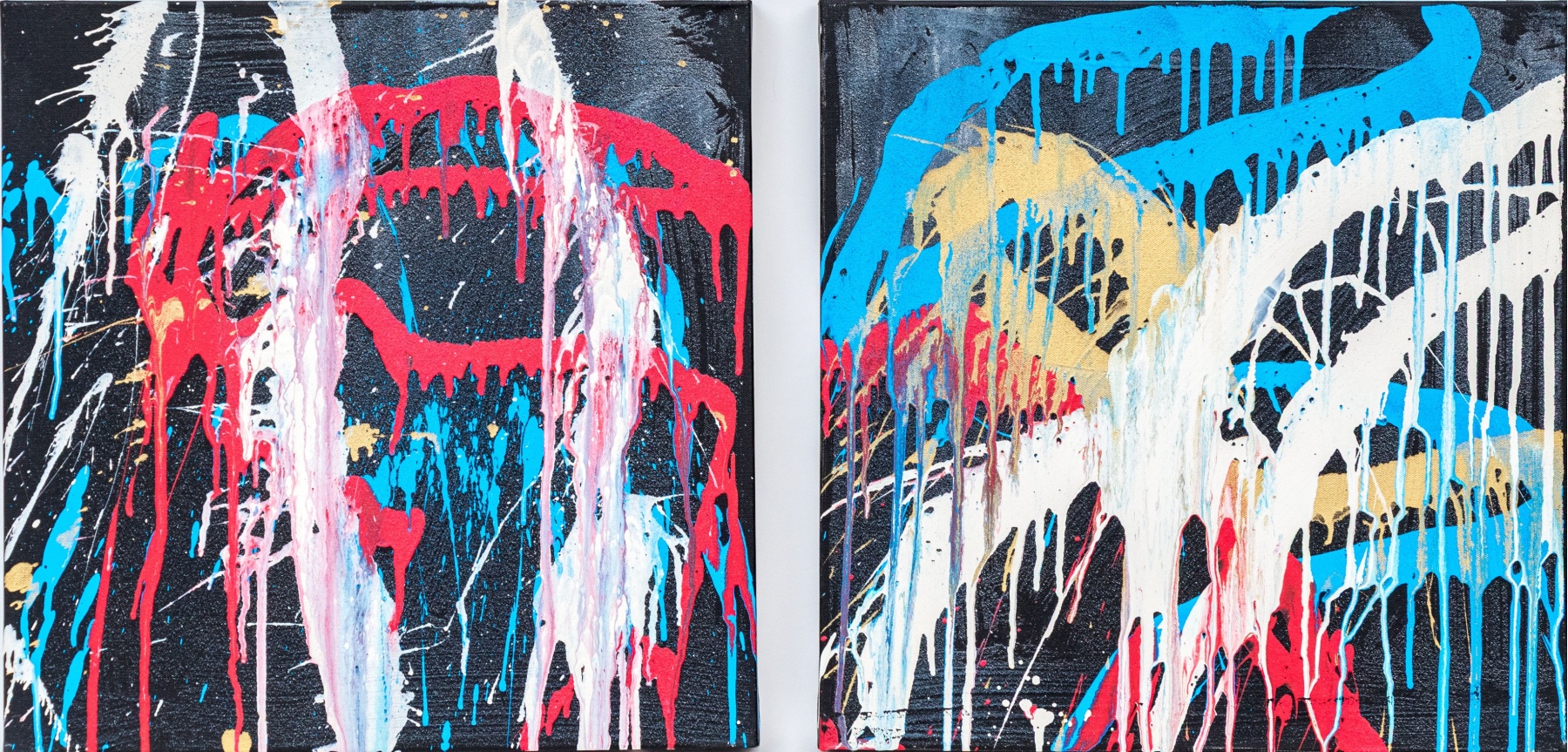 All are square form and feature abstract motifs. All presented on stretcher supports but unframed. All are unsigned.