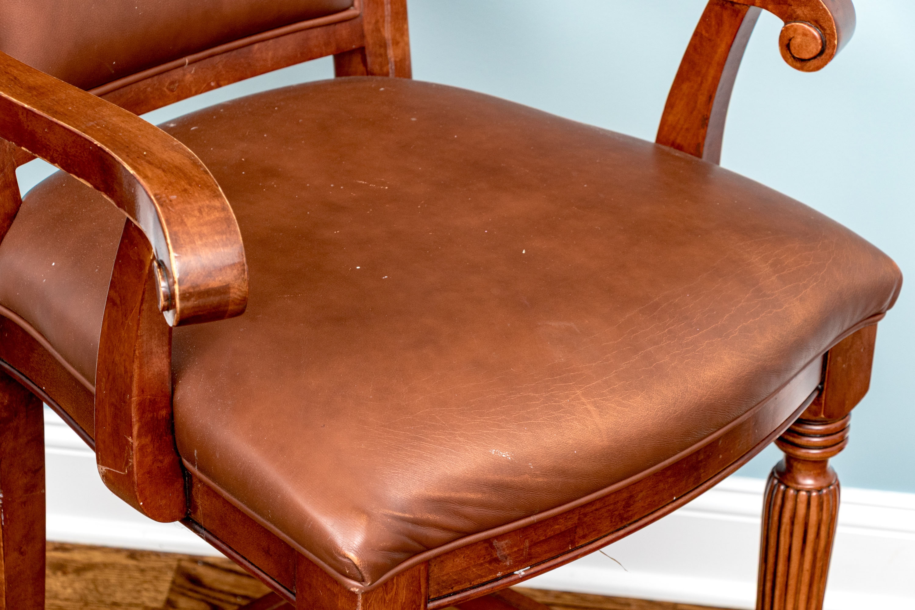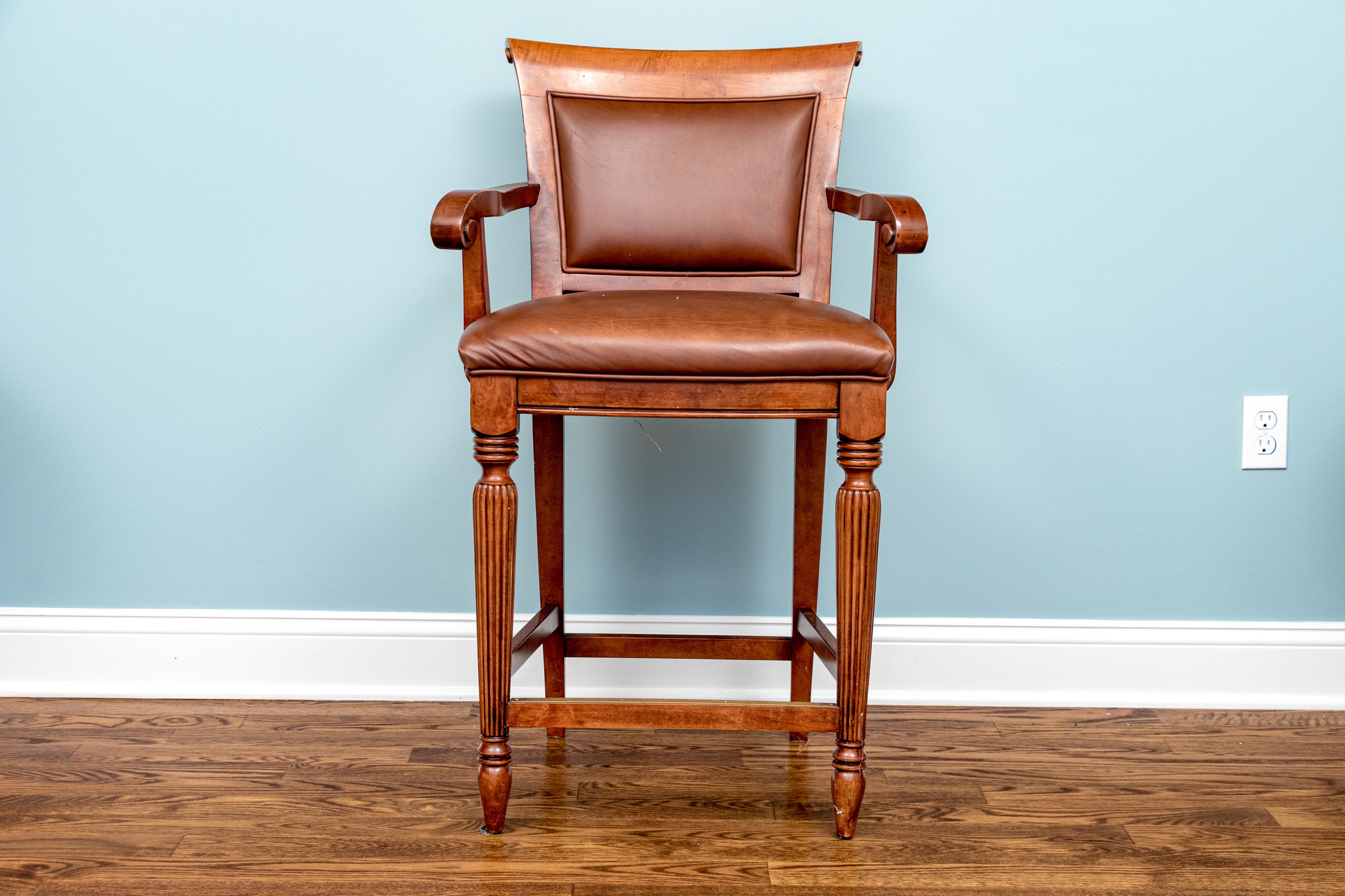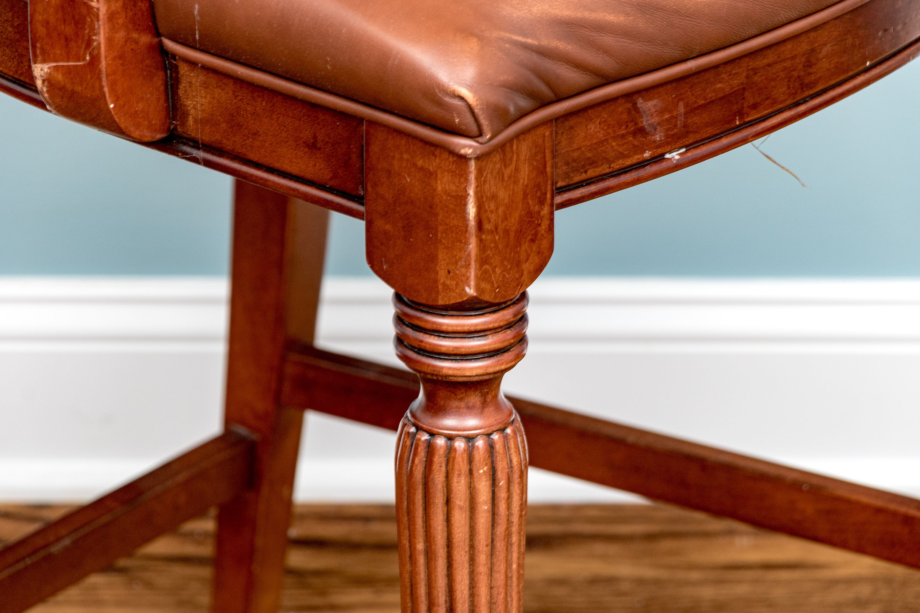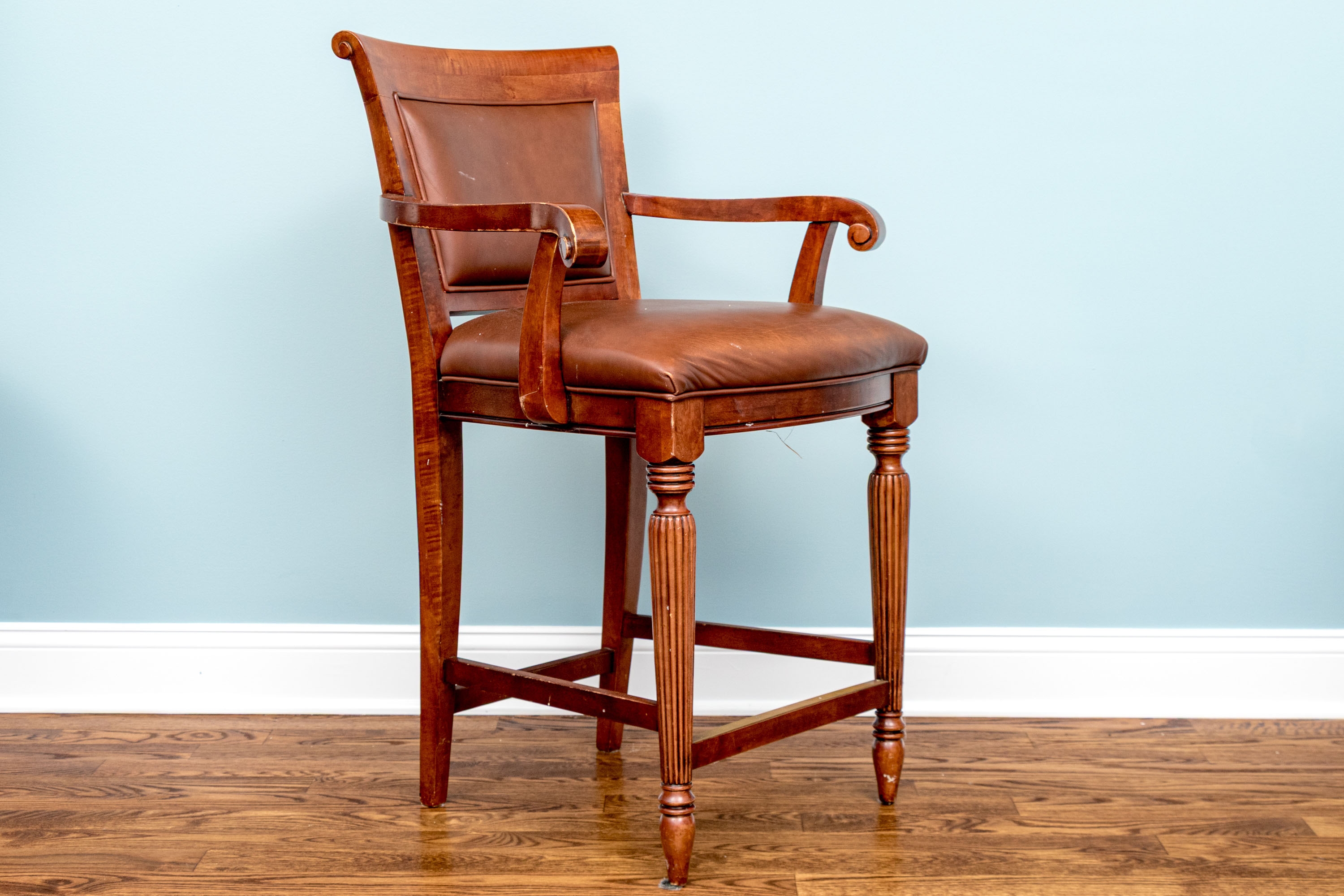 A handsome set of four Ethan Allen barstools with elegant classical influence, crafted in warm-toned medium brown veneered wood with matching leatherette upholstery. The backs are nicely scrolled and gently tapered, leading into curved arms with scrolled arm fronts. The seats feature subtle serpentine fronts supported by straight, tapered, and reeded legs with box stretchers over arrow feet.