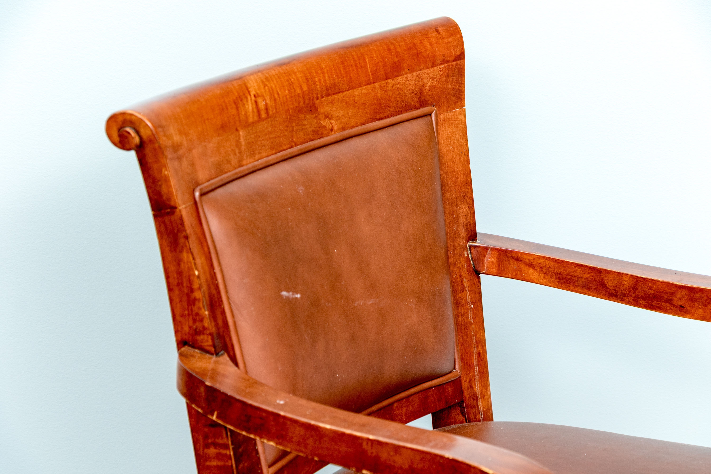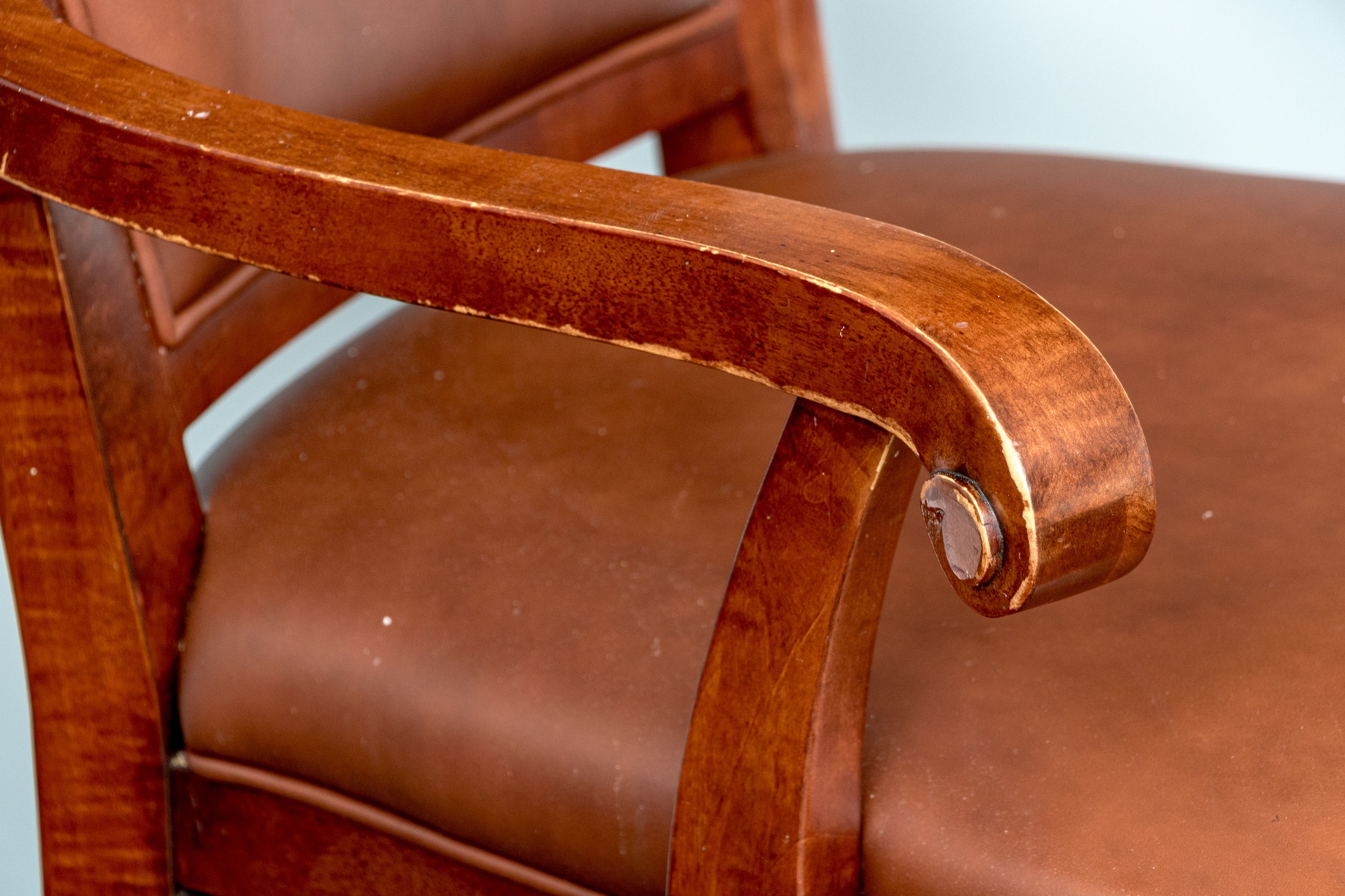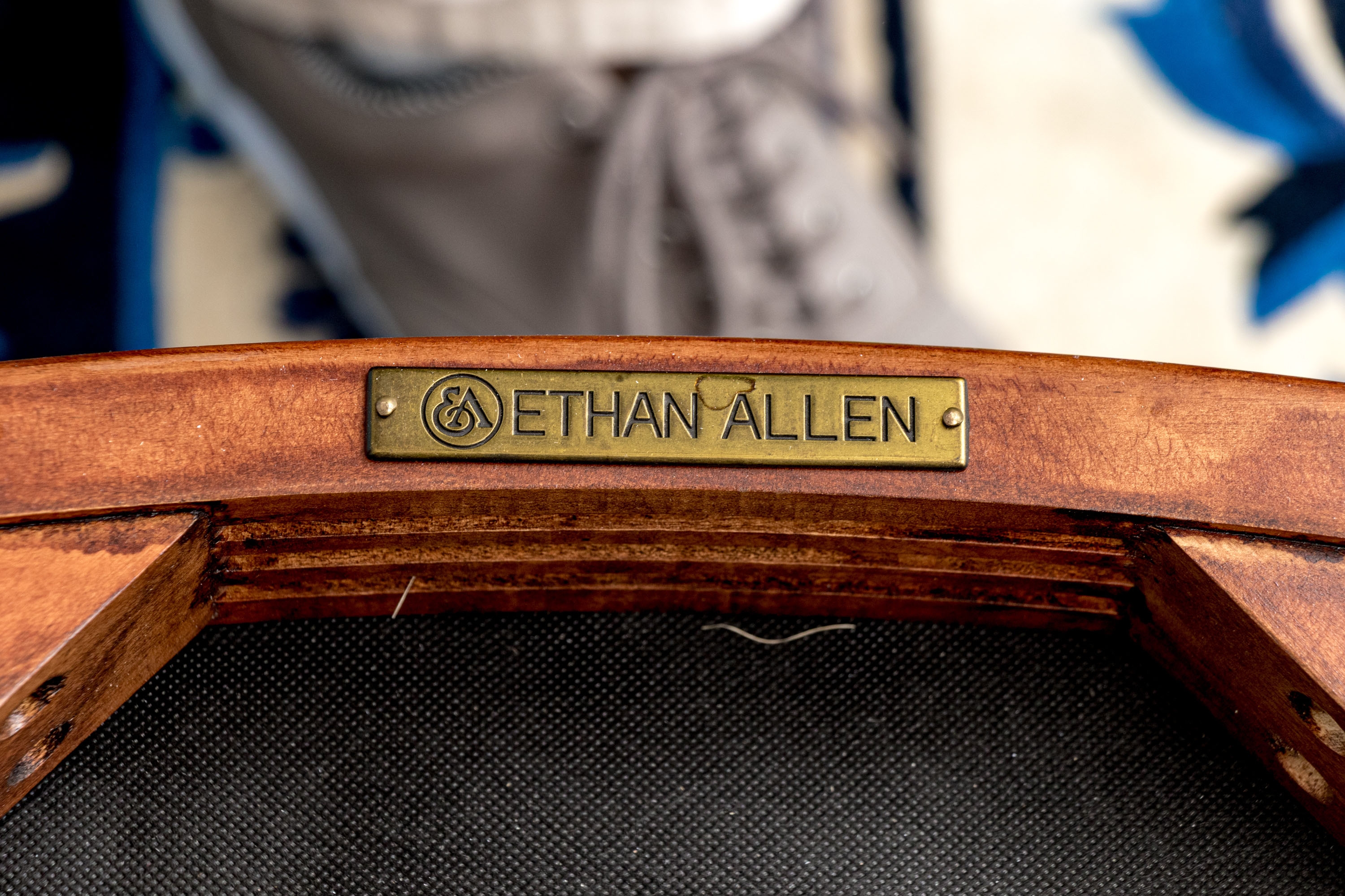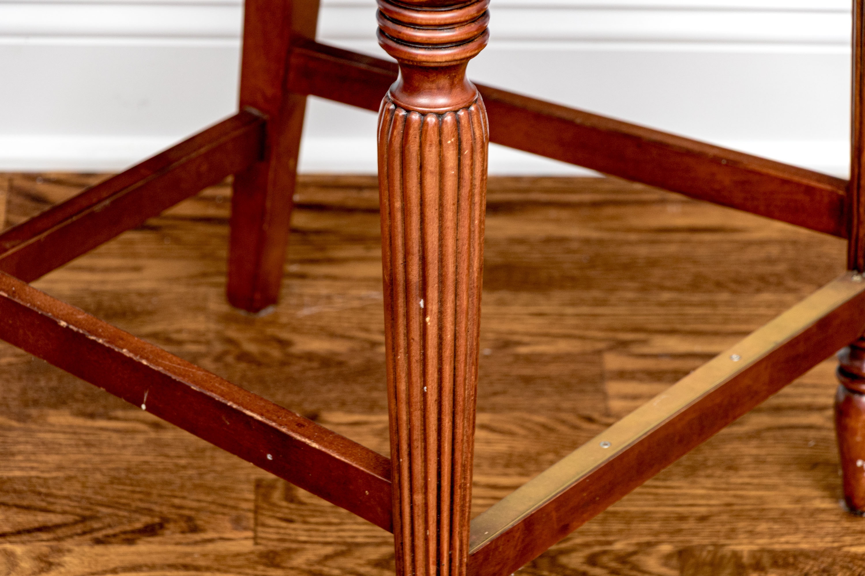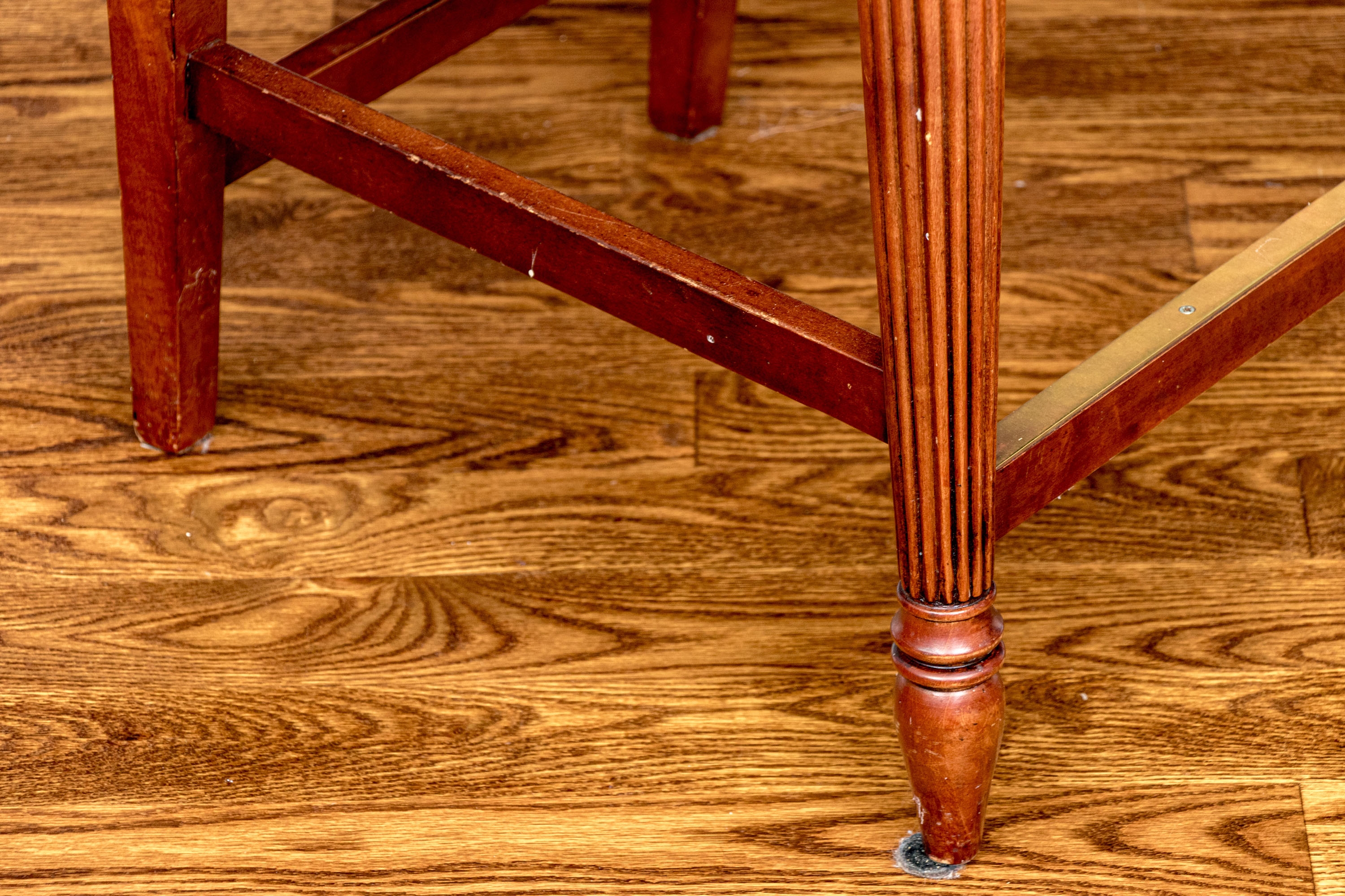 A handsome set of four Ethan Allen barstools with elegant classical influence, crafted in warm-toned medium brown veneered wood with matching leatherette upholstery. The backs are nicely scrolled and gently tapered, leading into curved arms with scrolled arm fronts. The seats feature subtle serpentine fronts supported by straight, tapered, and reeded legs with box stretchers over arrow feet.