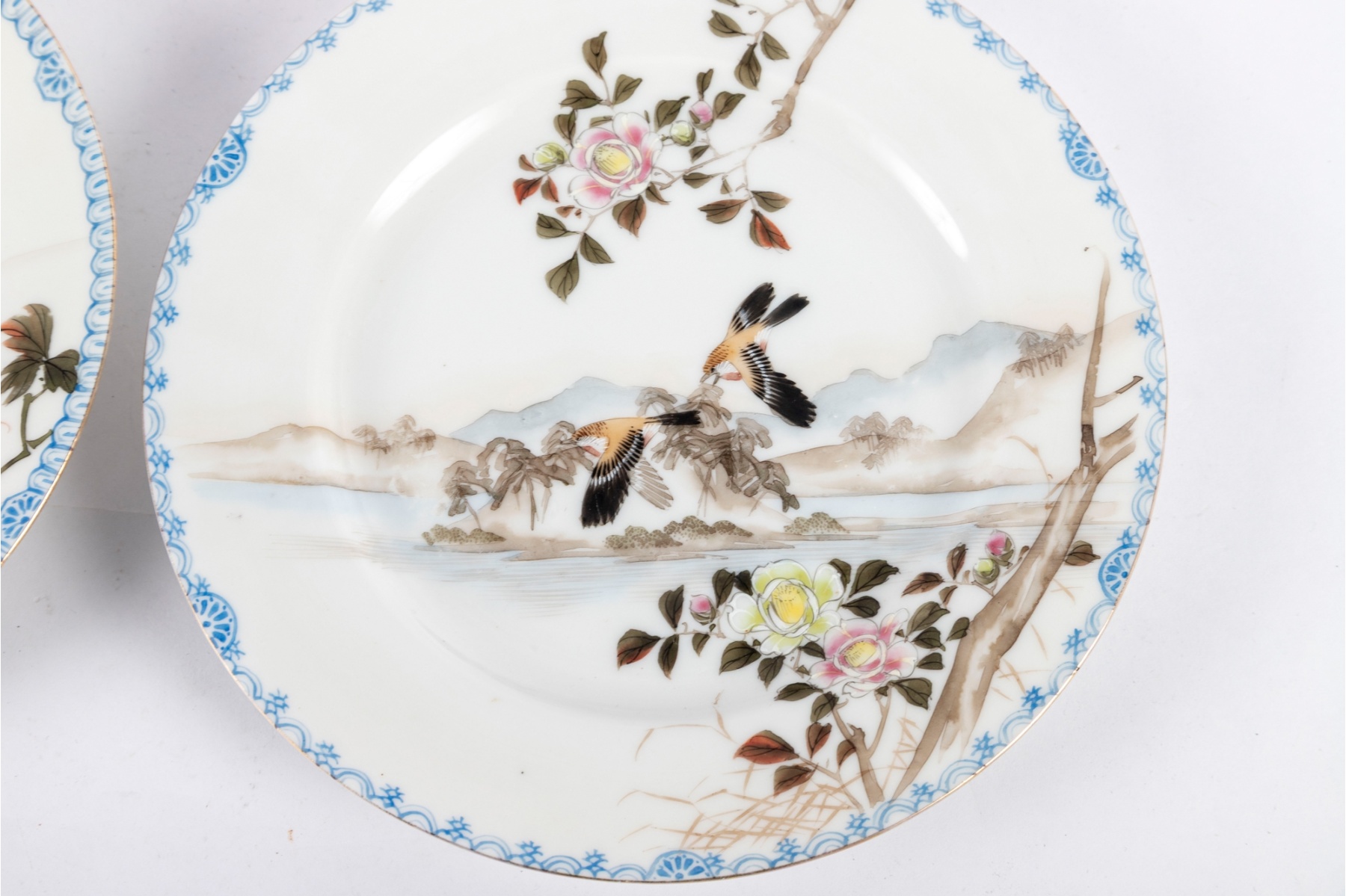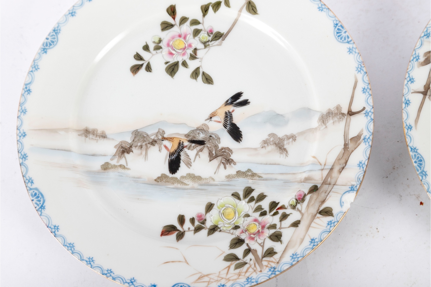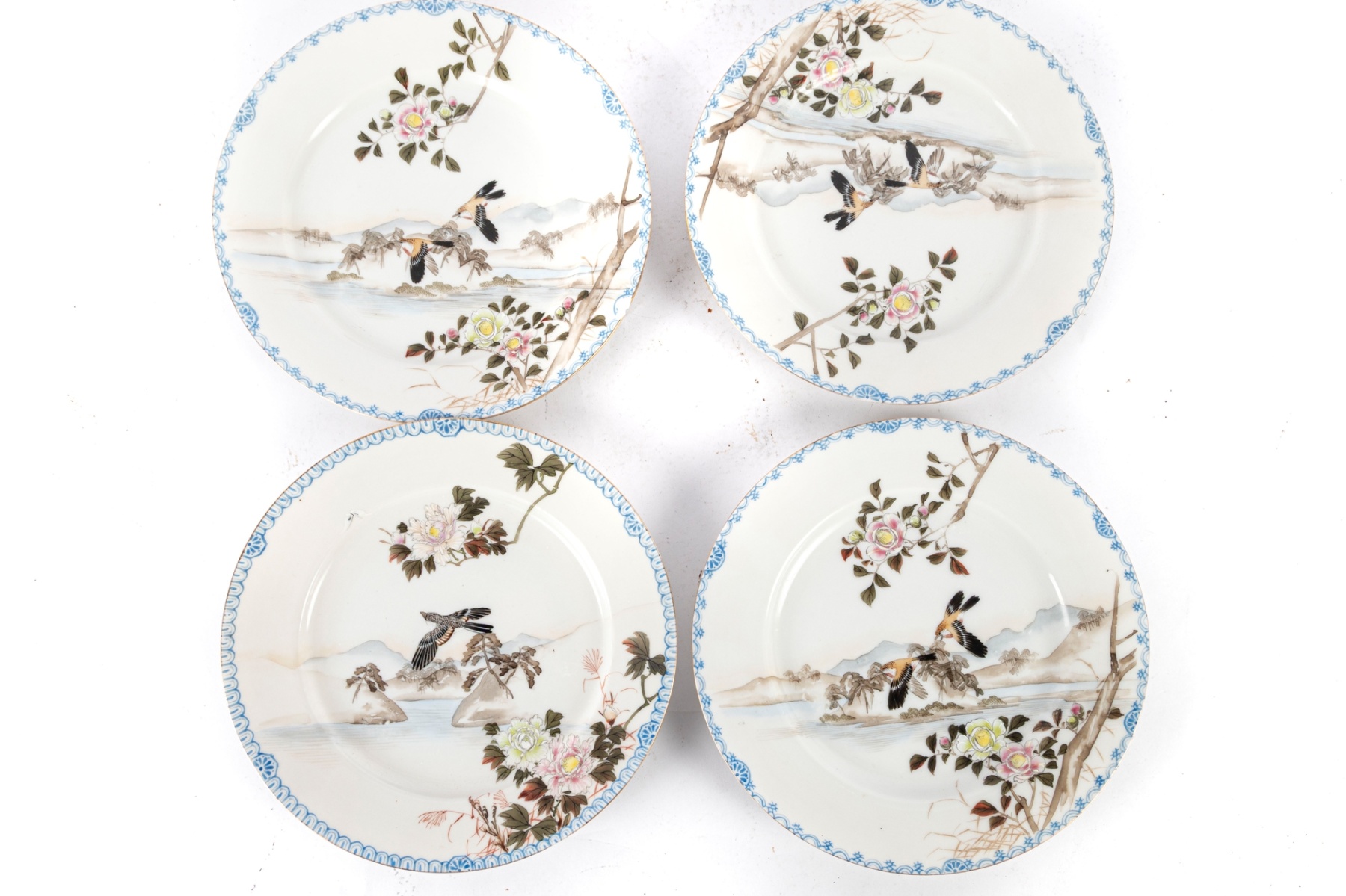 Elegant set of four hand-painted Japanese porcelain plates, each delicately decorated with a serene nature scene featuring colorful birds in flight among blooming branches and distant mountain landscapes. Each plate bears a red artist’s mark on the underside.