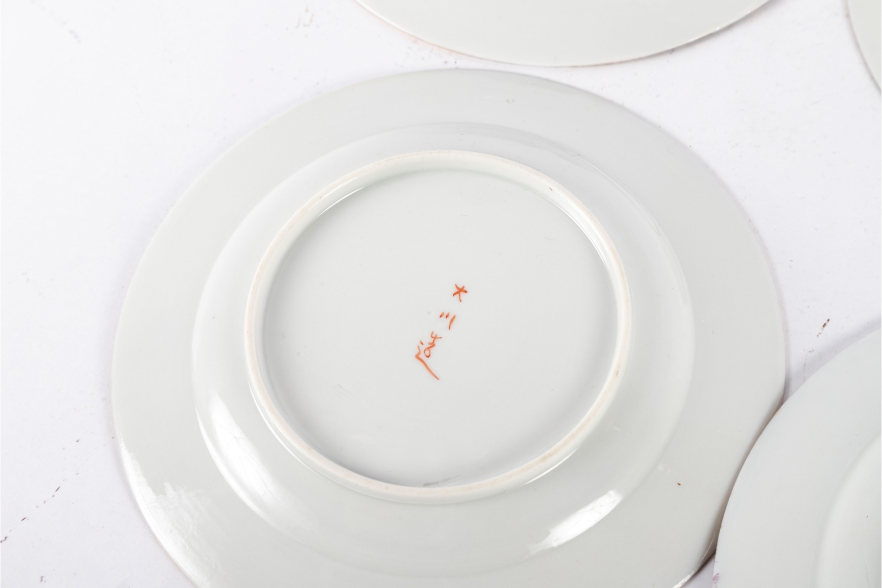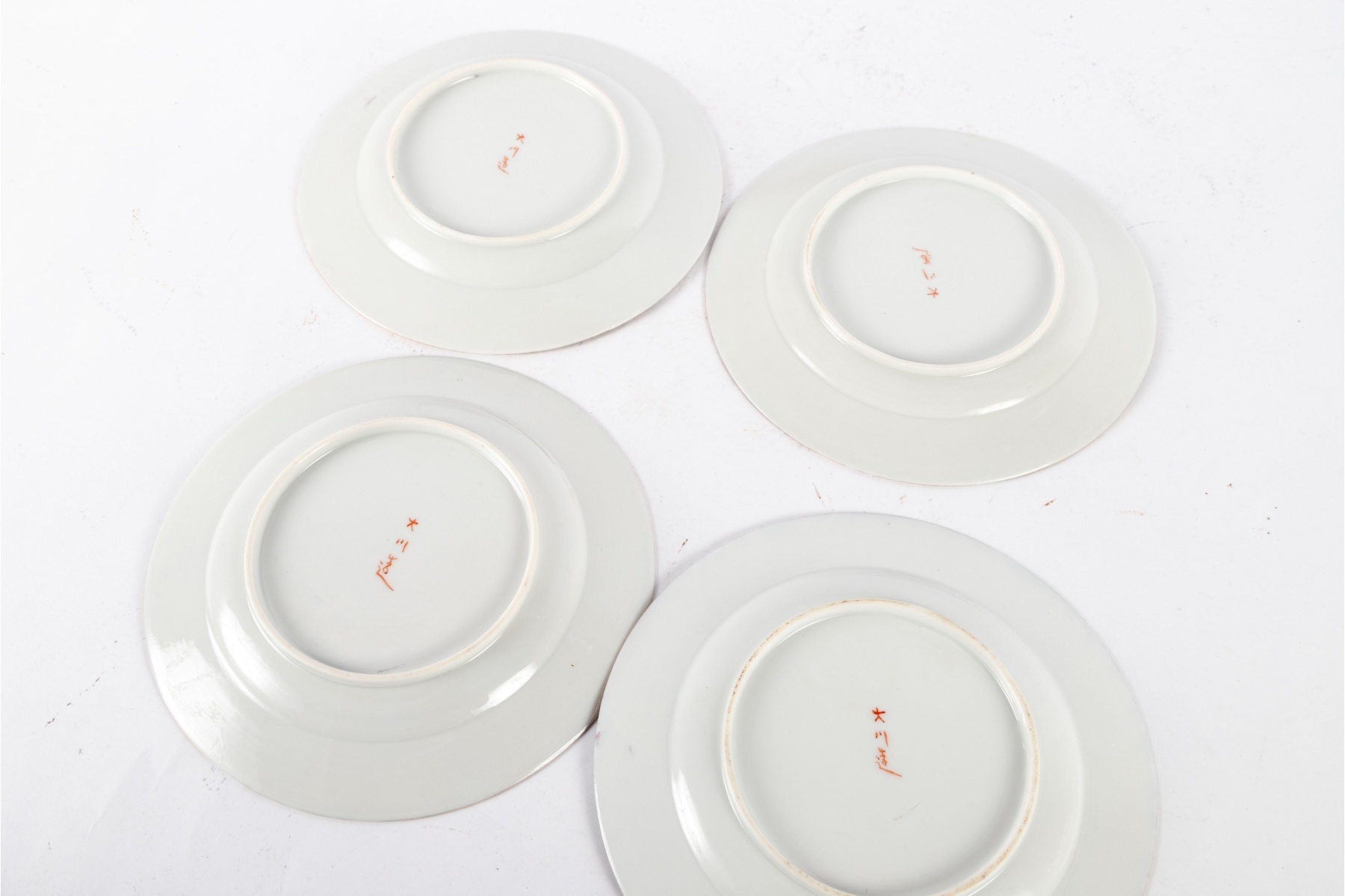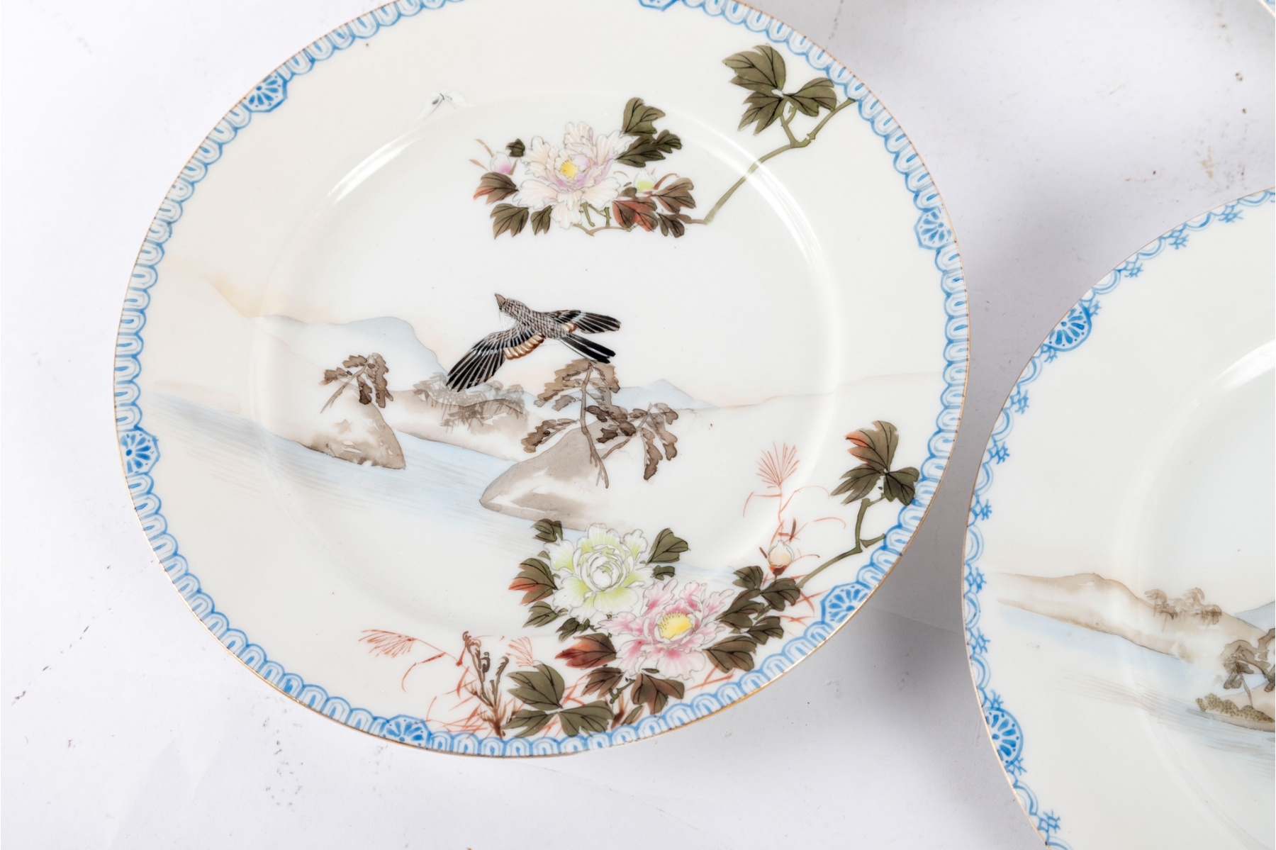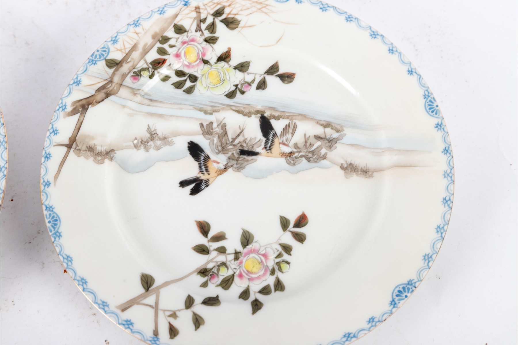 Elegant set of four hand-painted Japanese porcelain plates, each delicately decorated with a serene nature scene featuring colorful birds in flight among blooming branches and distant mountain landscapes. Each plate bears a red artist’s mark on the underside.