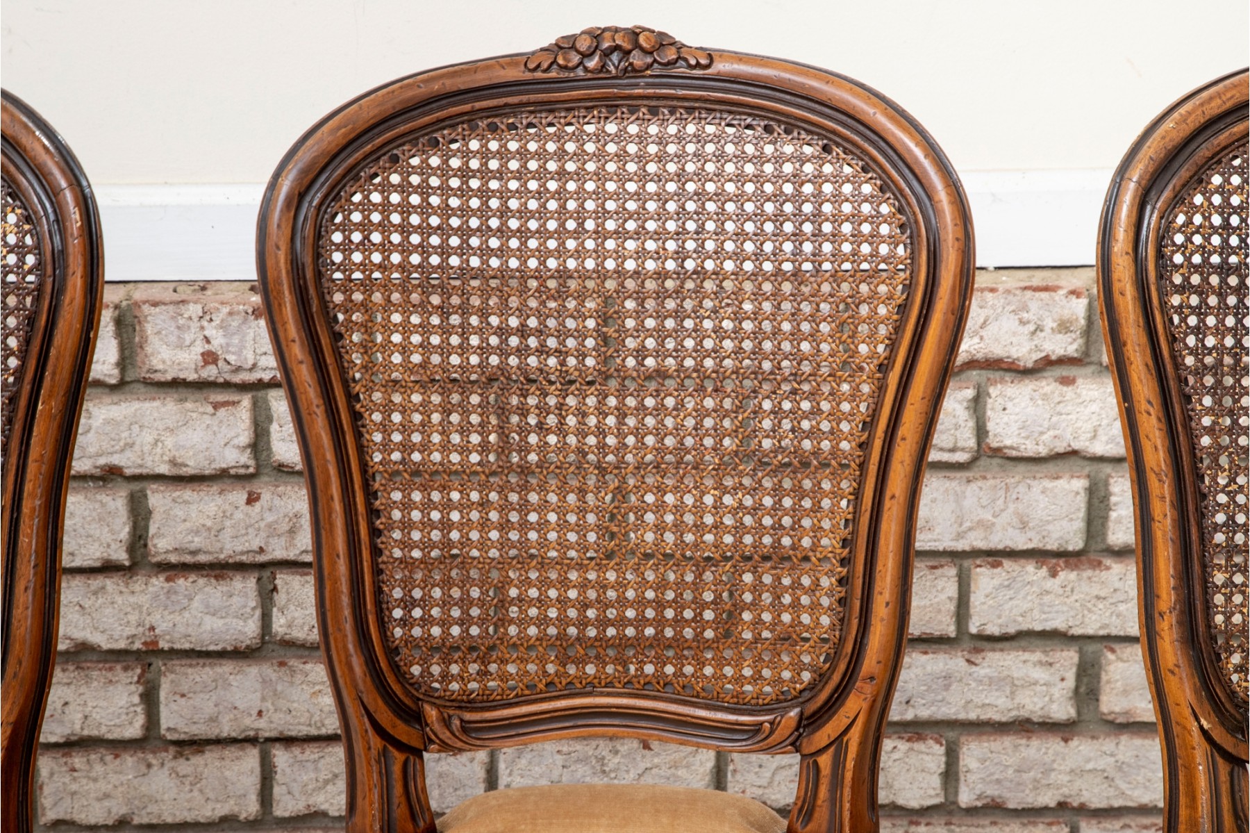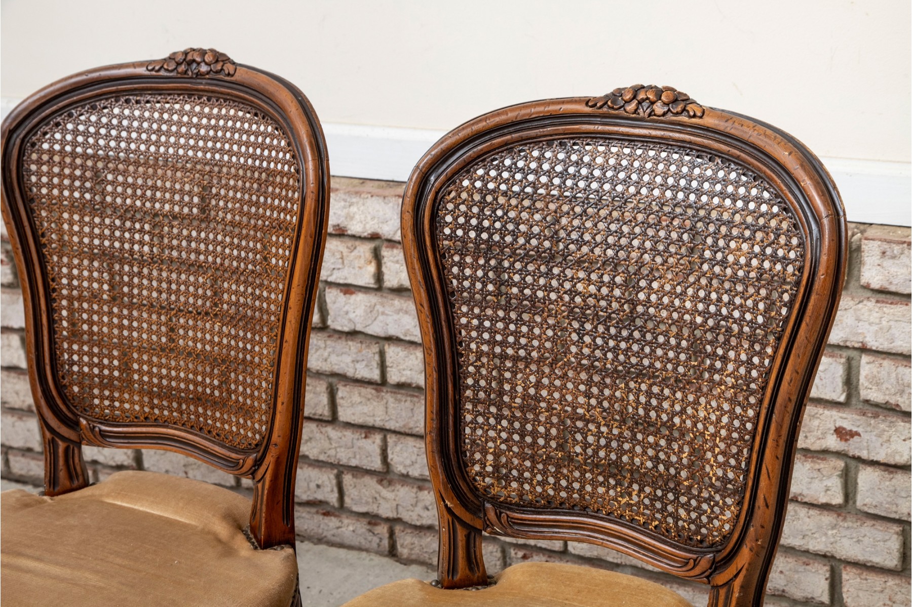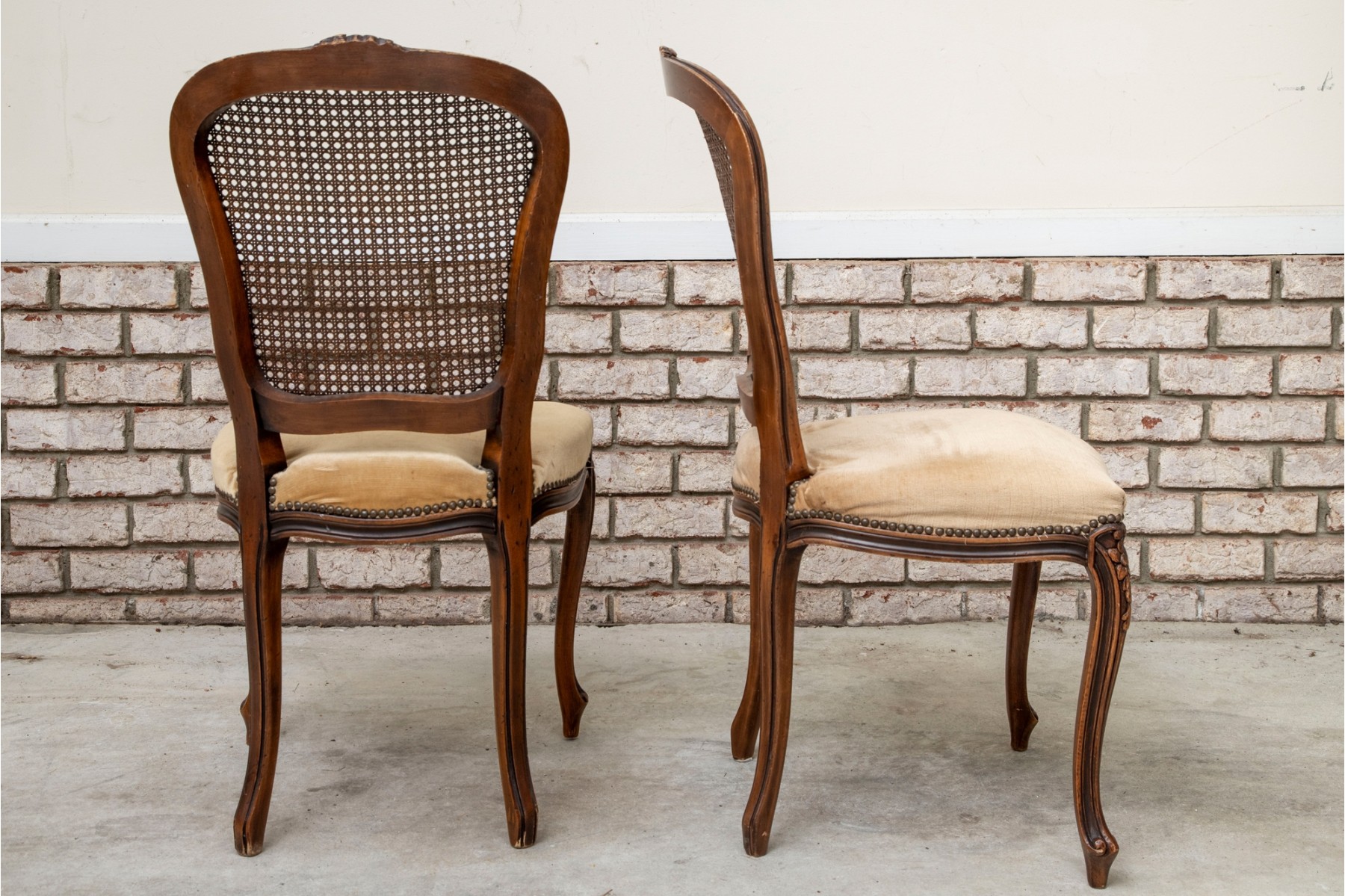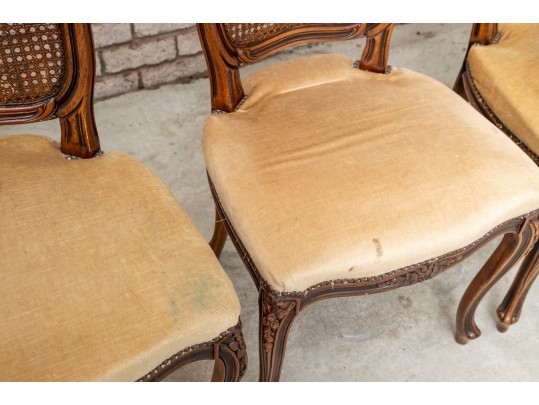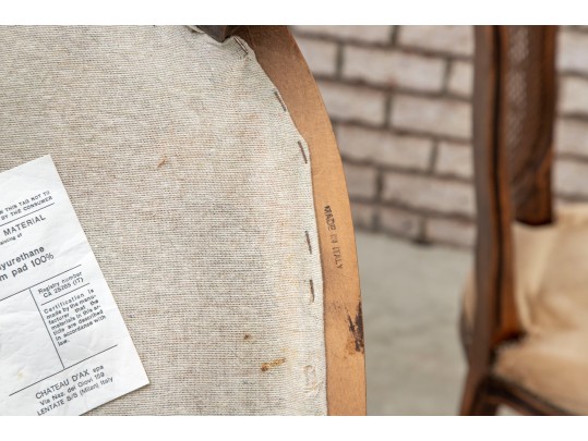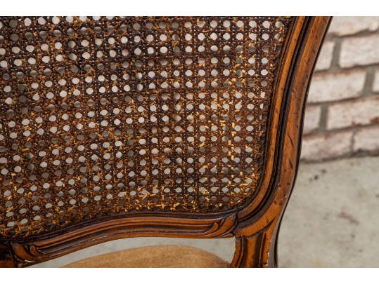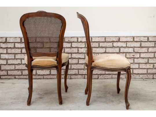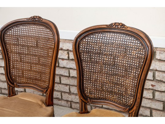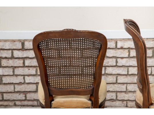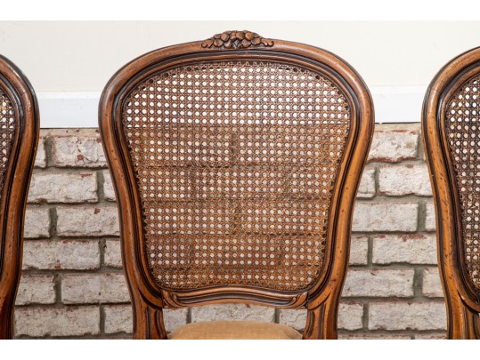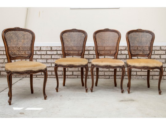 This set of four Italian Louis XV-style cane-back chairs features elegantly curved frames with intricate carvings along the crest rail, apron, and cabriole legs -- complete with hand-applied nail-head trim.