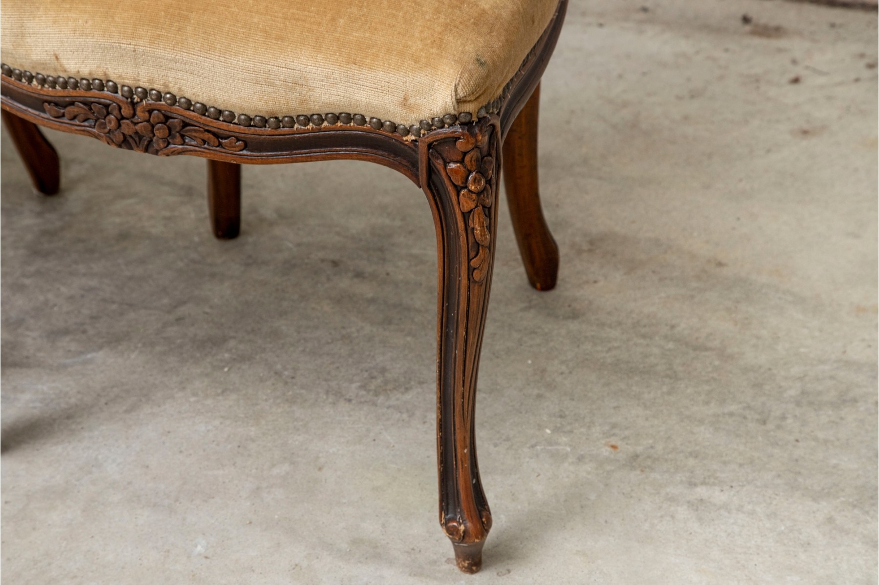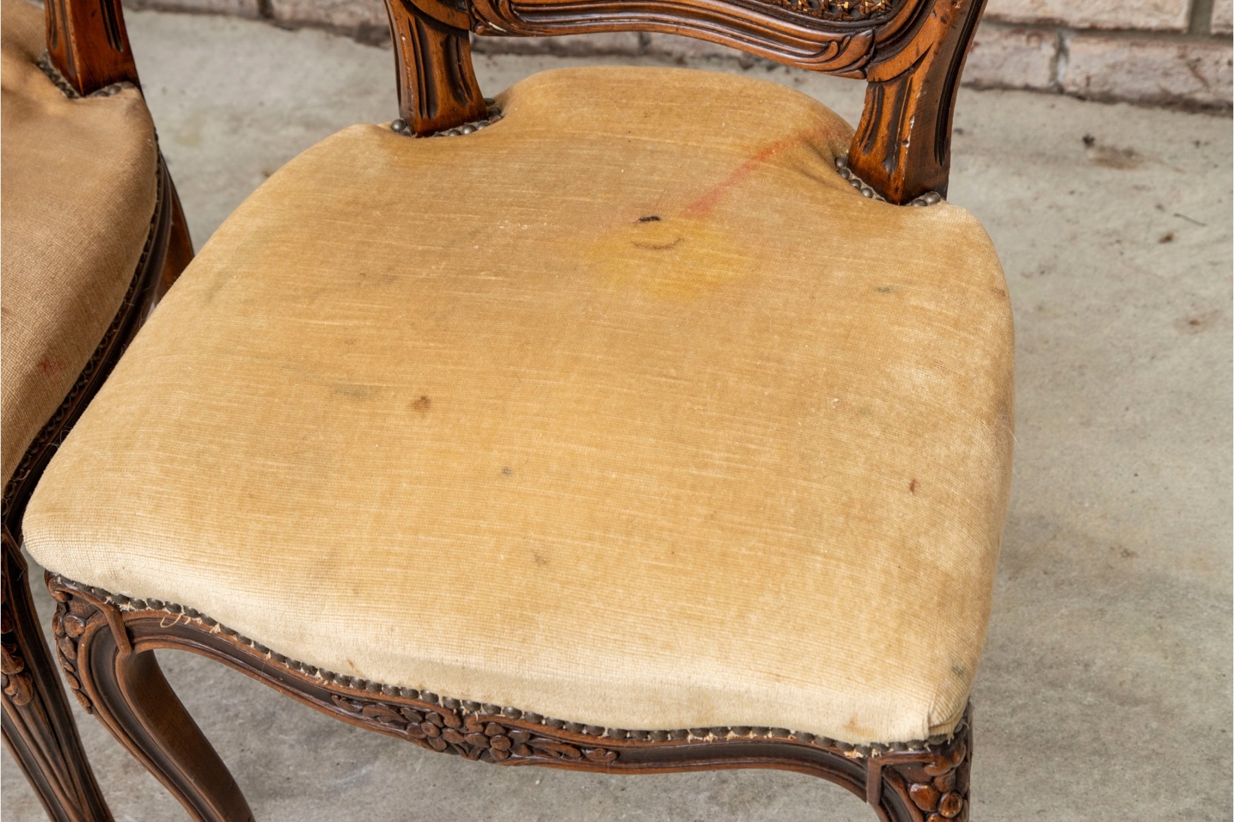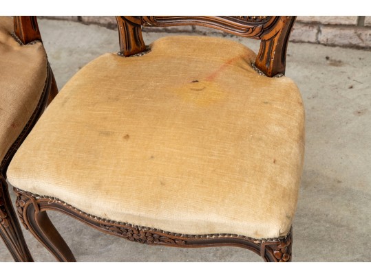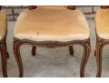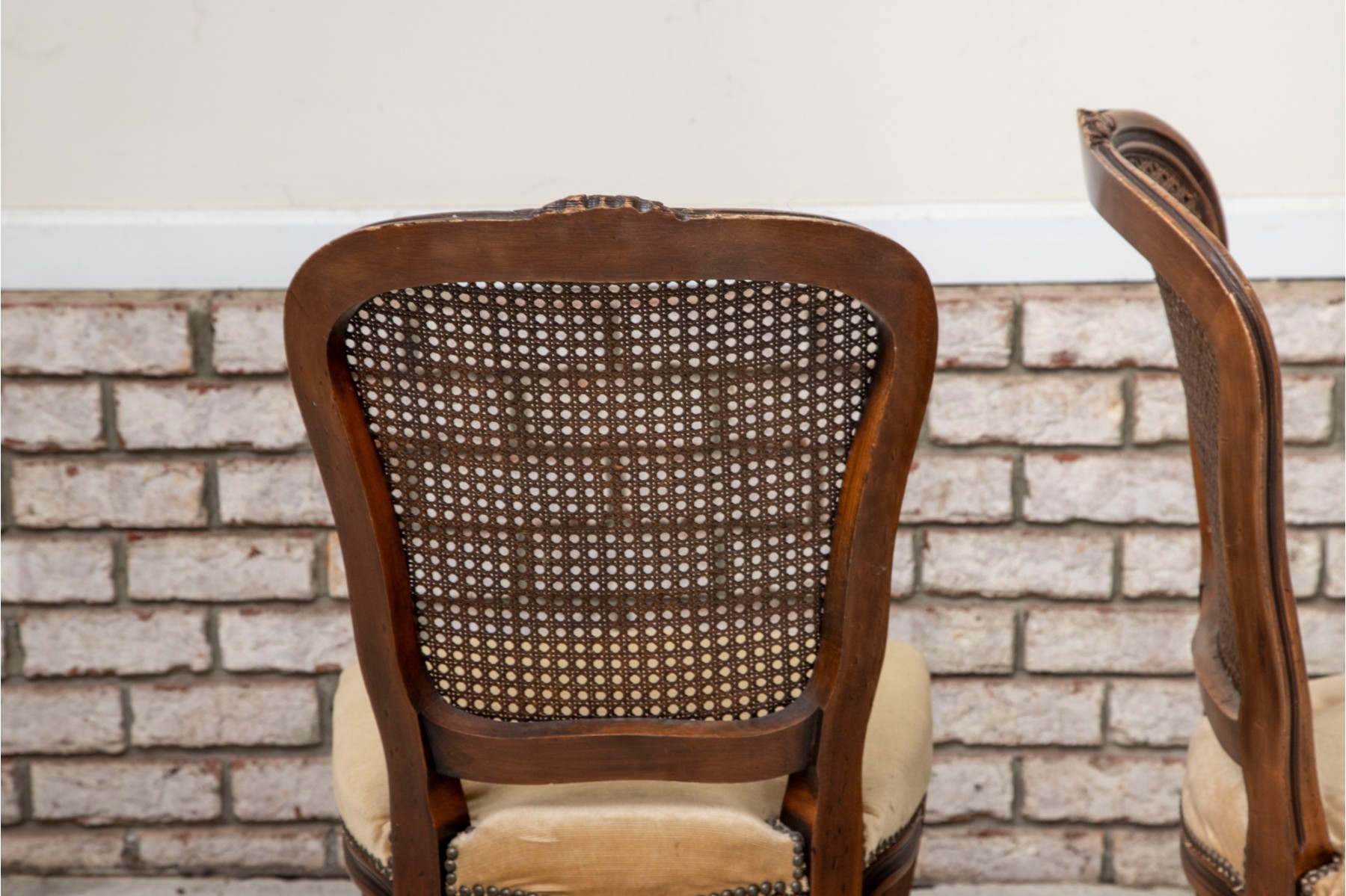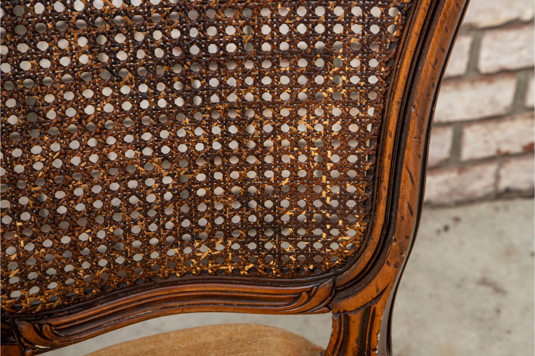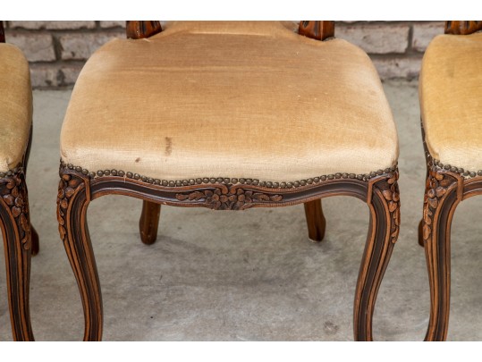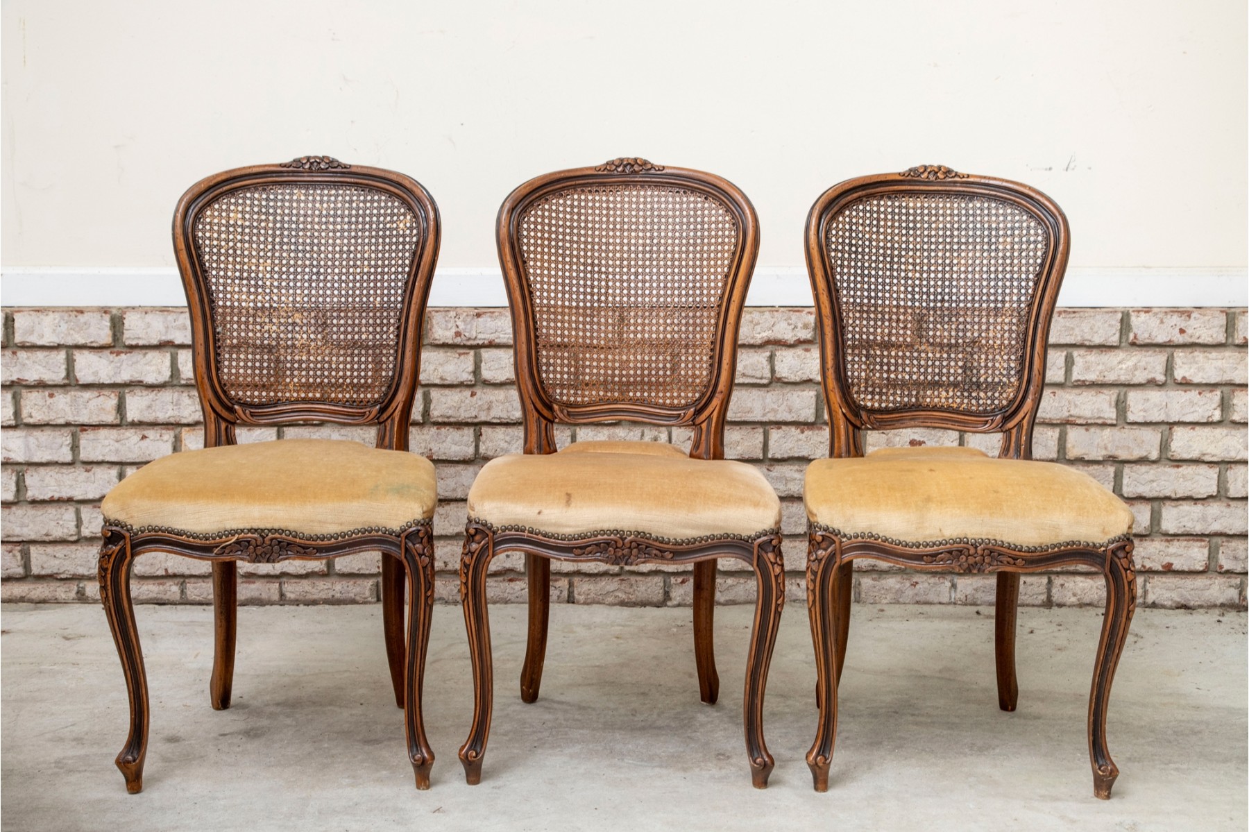 This set of four Italian Louis XV-style cane-back chairs features elegantly curved frames with intricate carvings along the crest rail, apron, and cabriole legs -- complete with hand-applied nail-head trim.