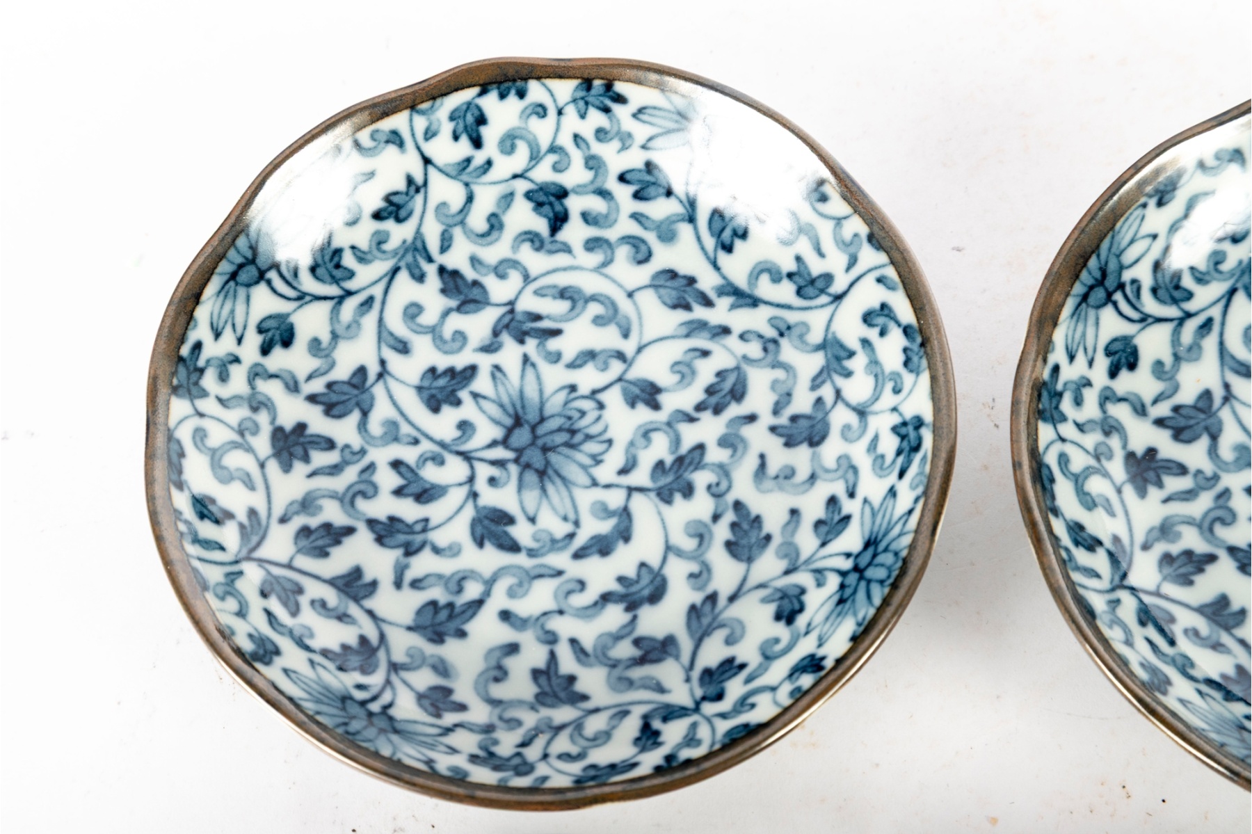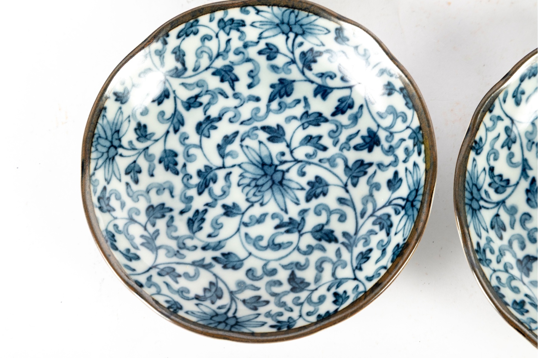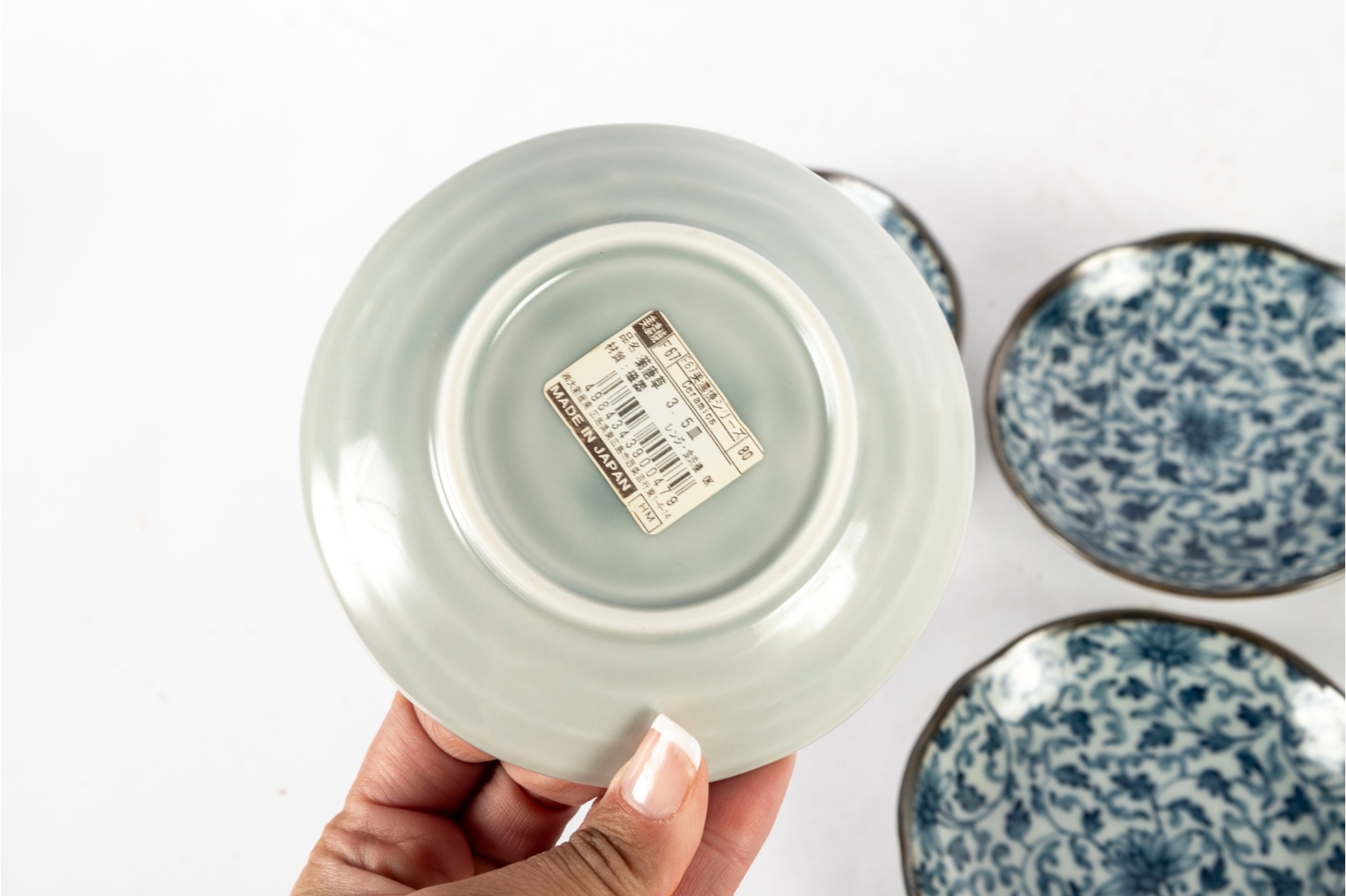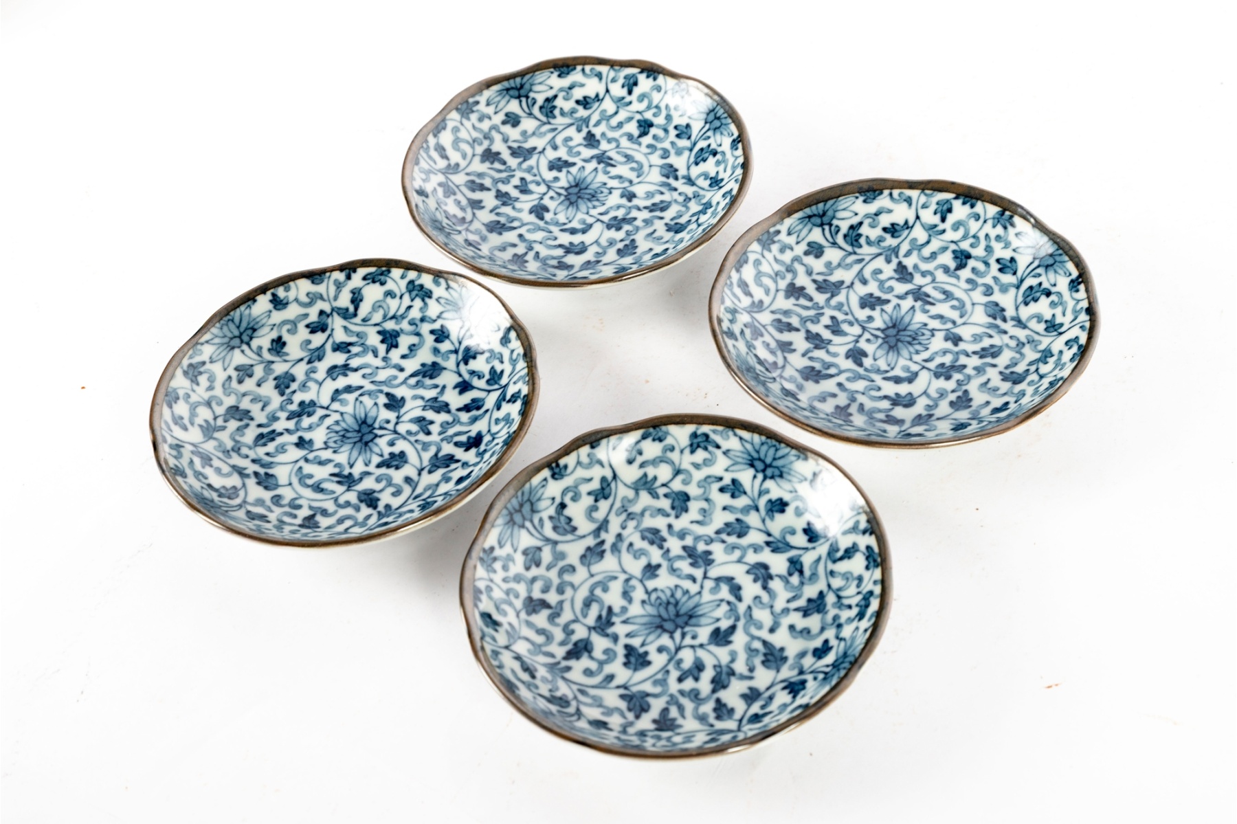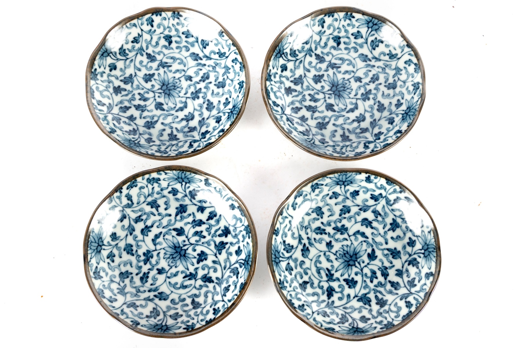 Elegant set of four Japanese porcelain dishes featuring an intricate blue floral and scrolling vine pattern on a white ground. Each dish has a scalloped rim and a slightly curved form. Retains original “Made in Japan” label to underside.