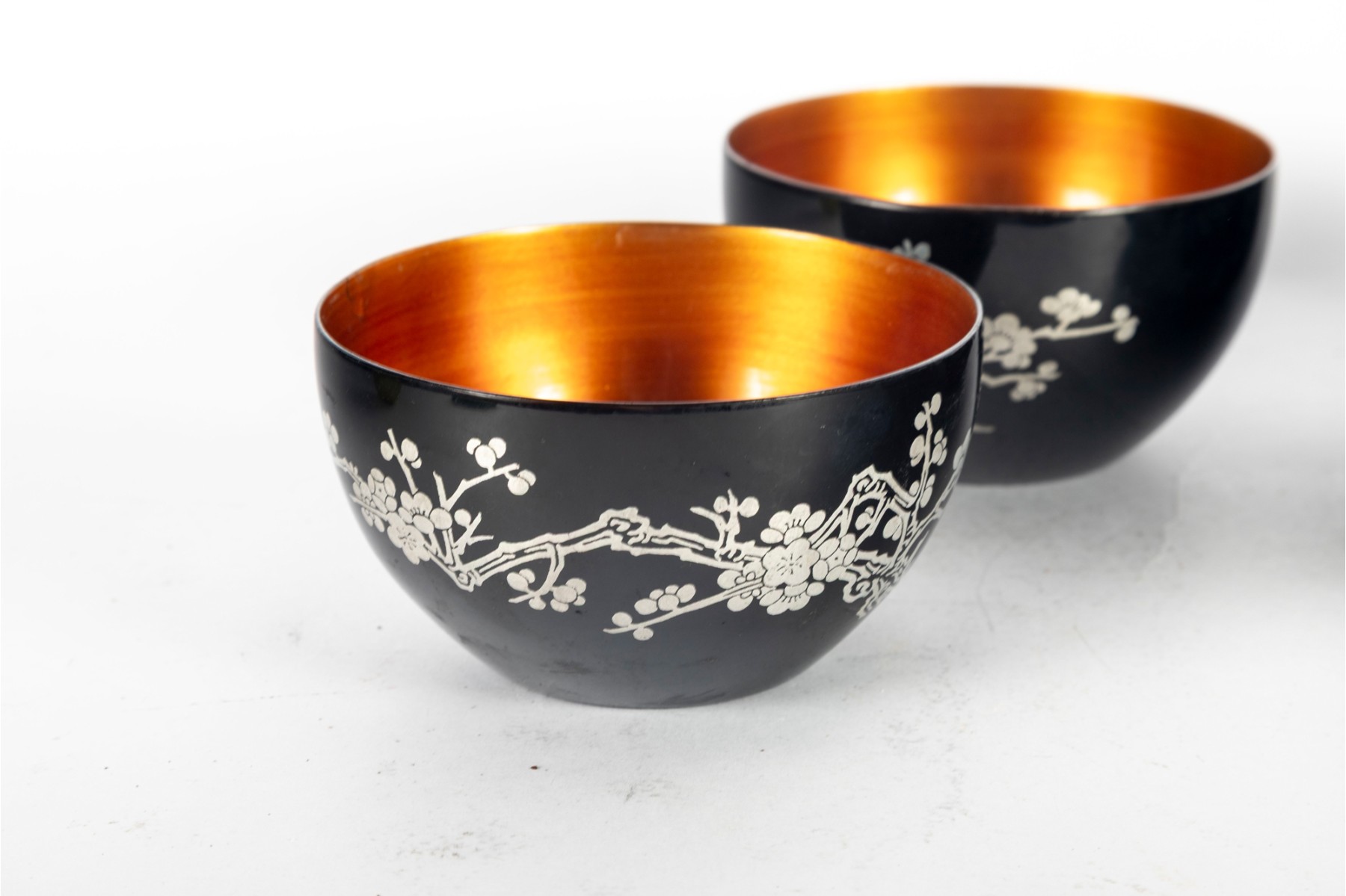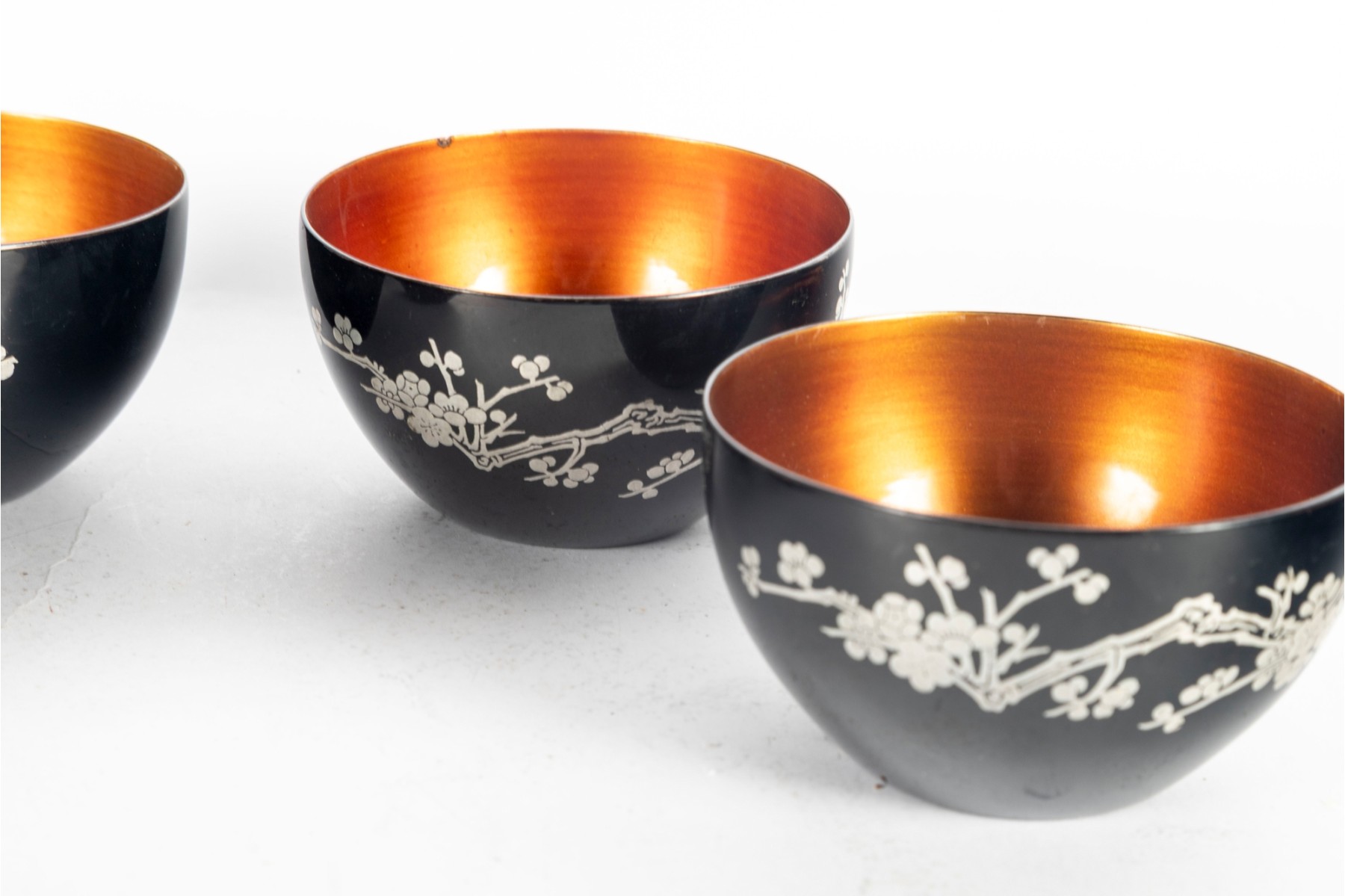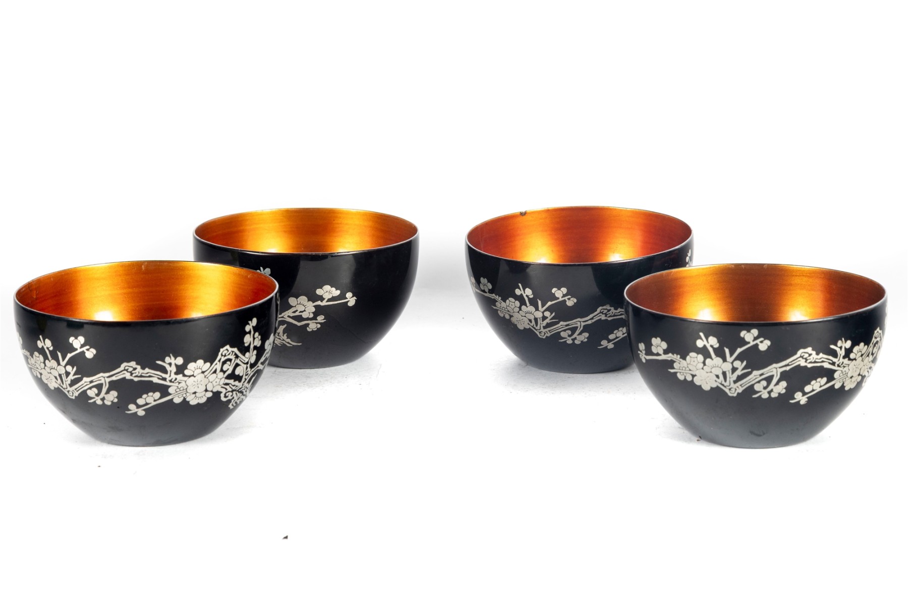 Set of four black lacquer bowls with gilt interiors and silver-tone plum blossom branch designs. Each bowl measures approximately 4.5" in diameter.