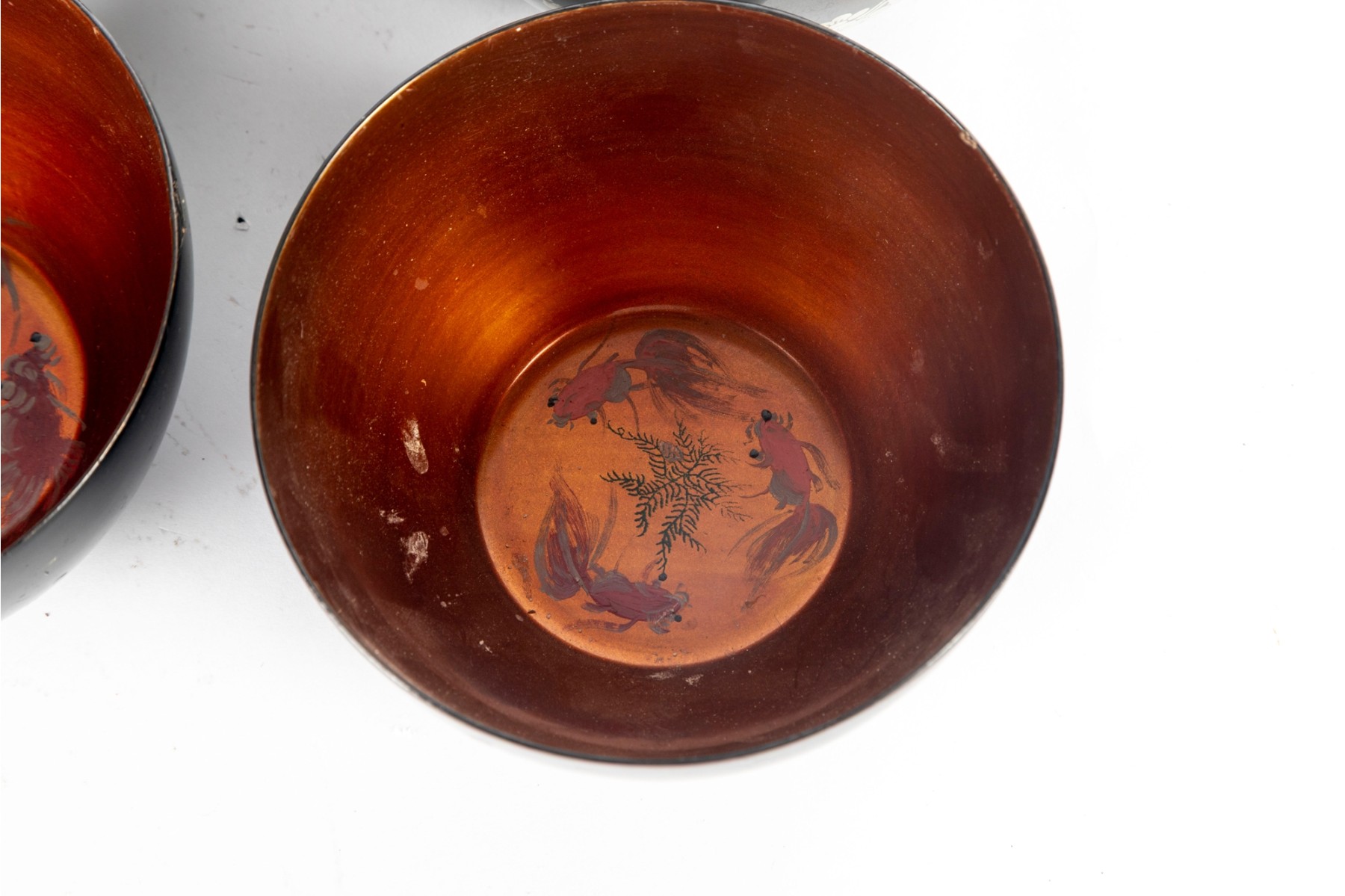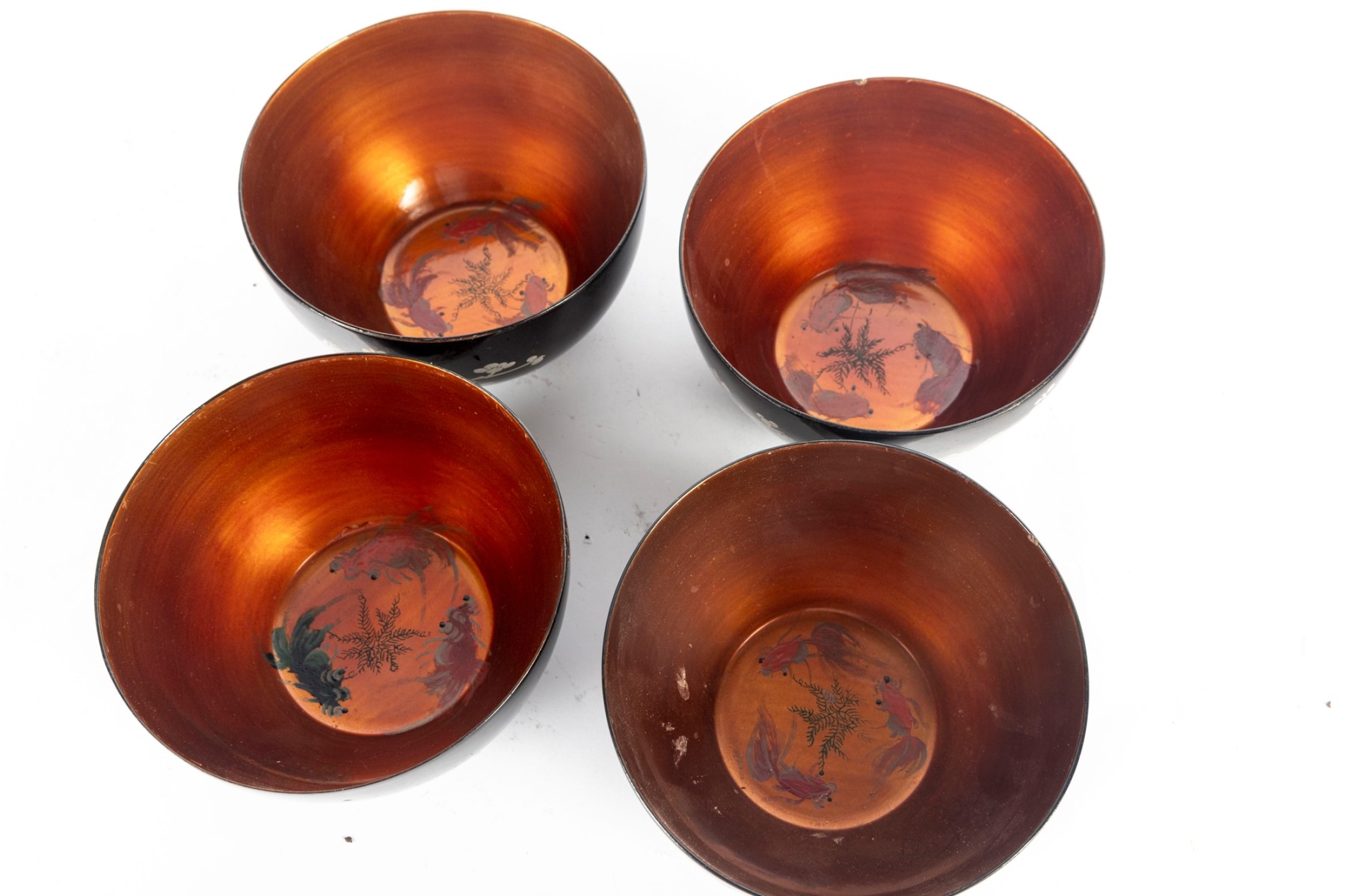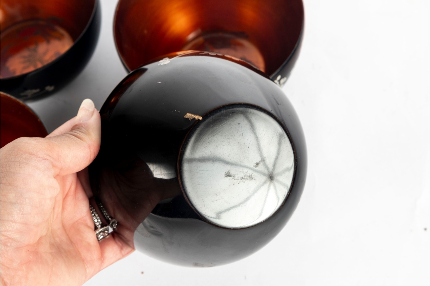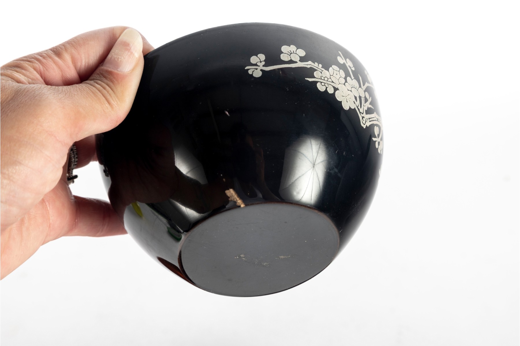 Set of four black lacquer bowls with gilt interiors and silver-tone plum blossom branch designs. Each bowl measures approximately 4.5" in diameter.