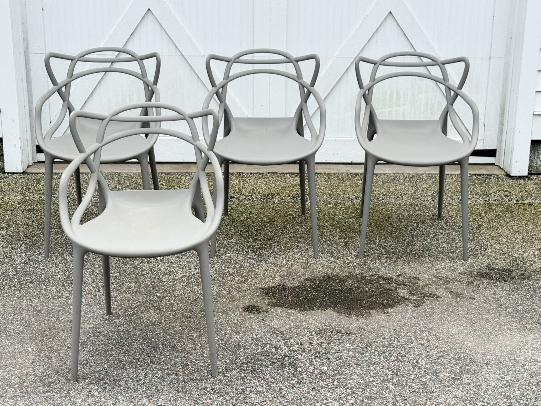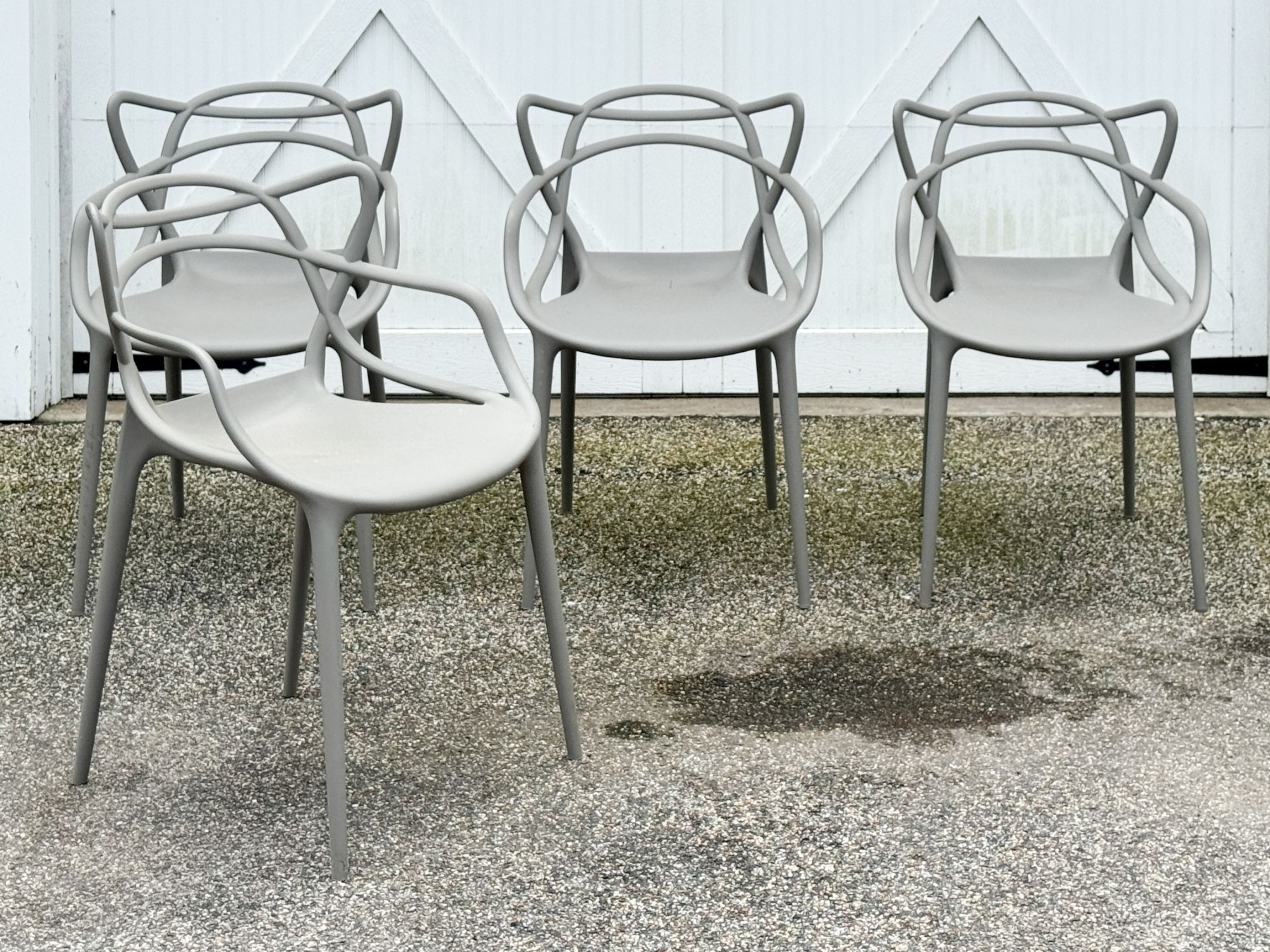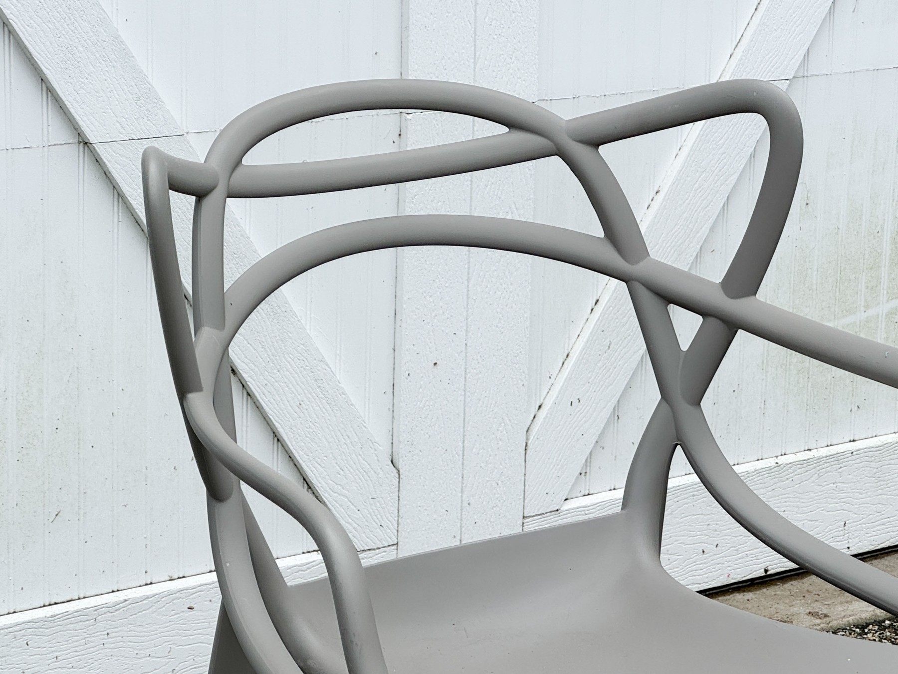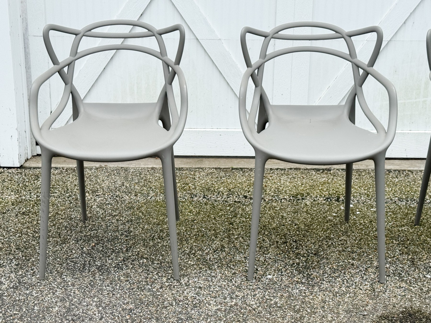 A stylish set of four Philippe Starck and Eugeni Quitllet for Kartell "Masters" stackable chairs suitable for both indoor and outdoor use, designed in gray polyethylene with an eye-catching openwork design taking a modern twist on the classic wingback profile with two intersecting rounded rails creating a tub form with rounded wings at the sides moulding into the gently curved seats. Raised over simple, straight tapered legs.