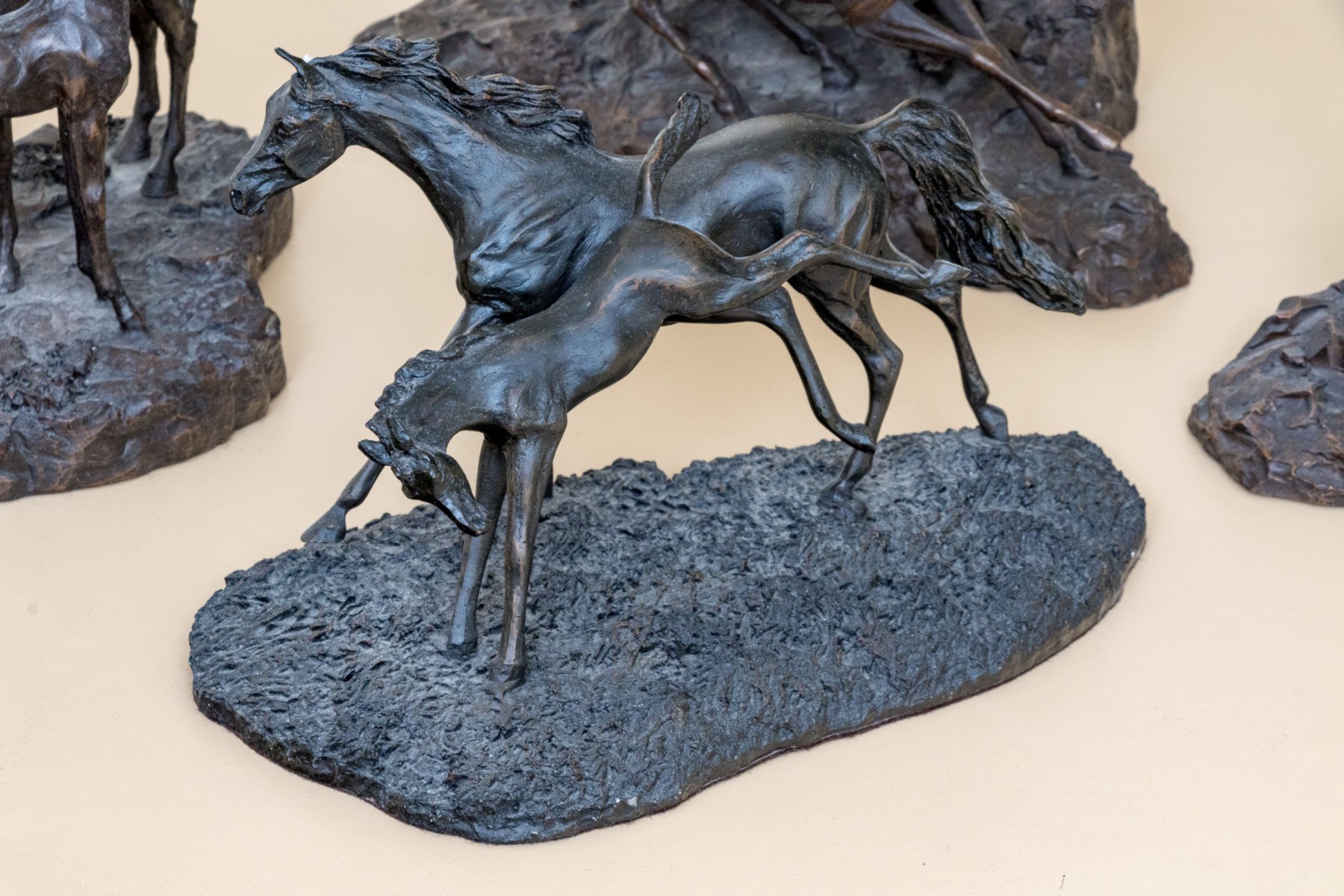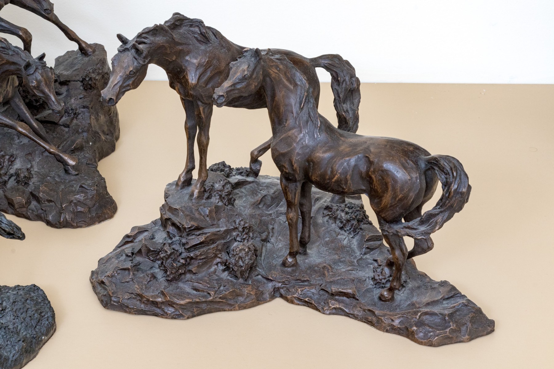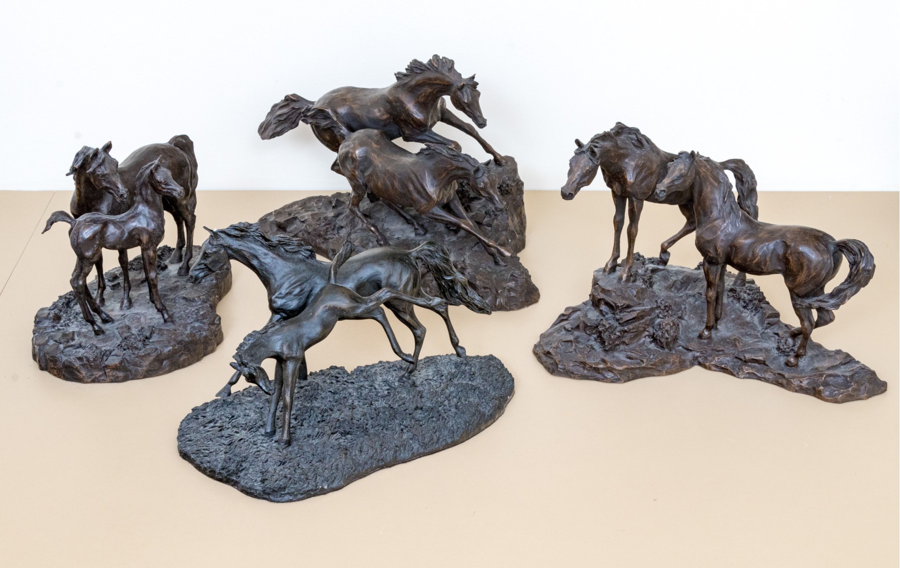 A fabulous set of four Landford Monroe (American, 1950-2000) for Franklin Mint cold cast bronze sculptures depicting horses on naturalistic bases. Includes "Foaling Time," "The Young Stallion," "Intruder," and "Morning On The Montana Plains."