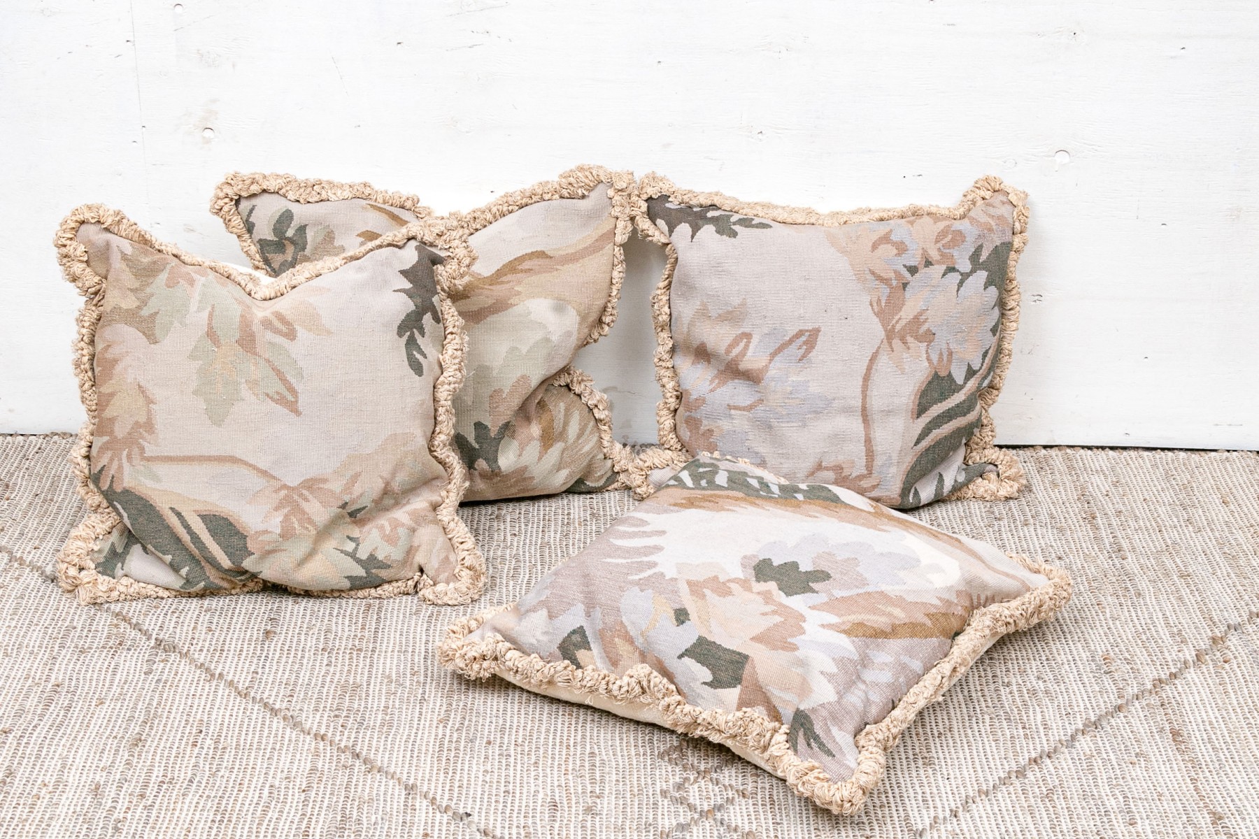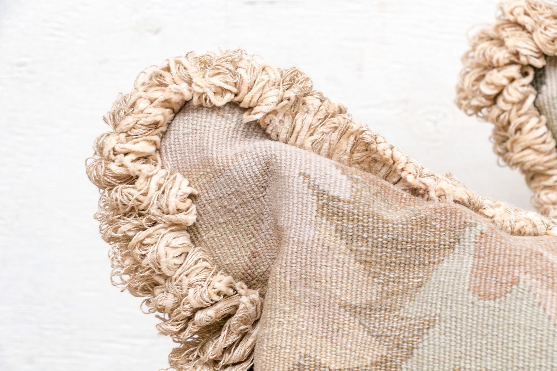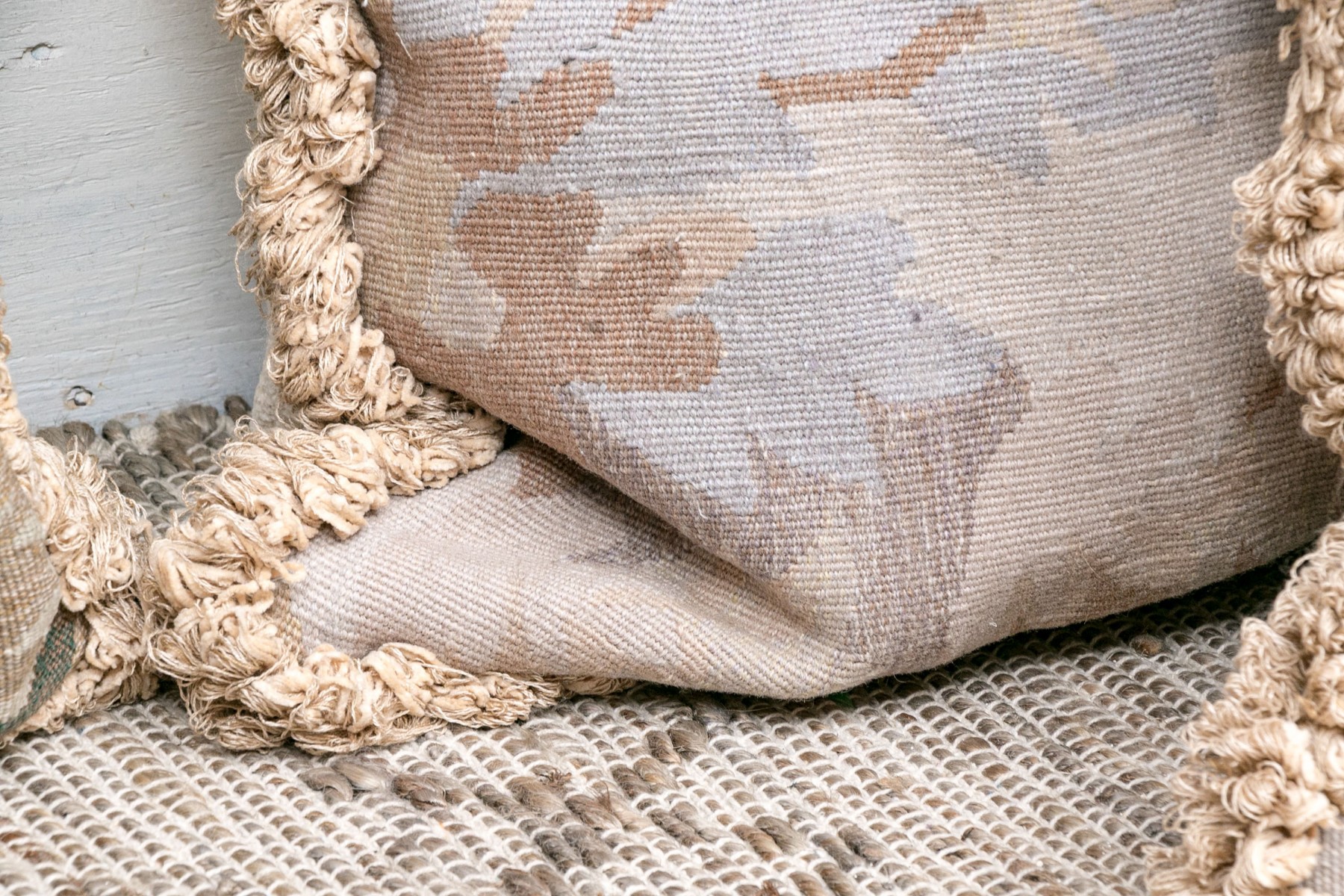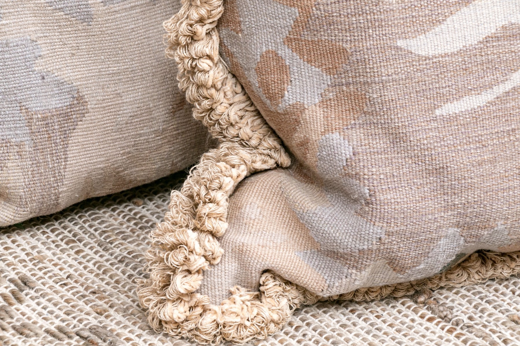 The tapestry in a tree limb pattern with leaves in tan, ecru and gray tones. With fine lush pale fringe and textured ecru fabric backs.