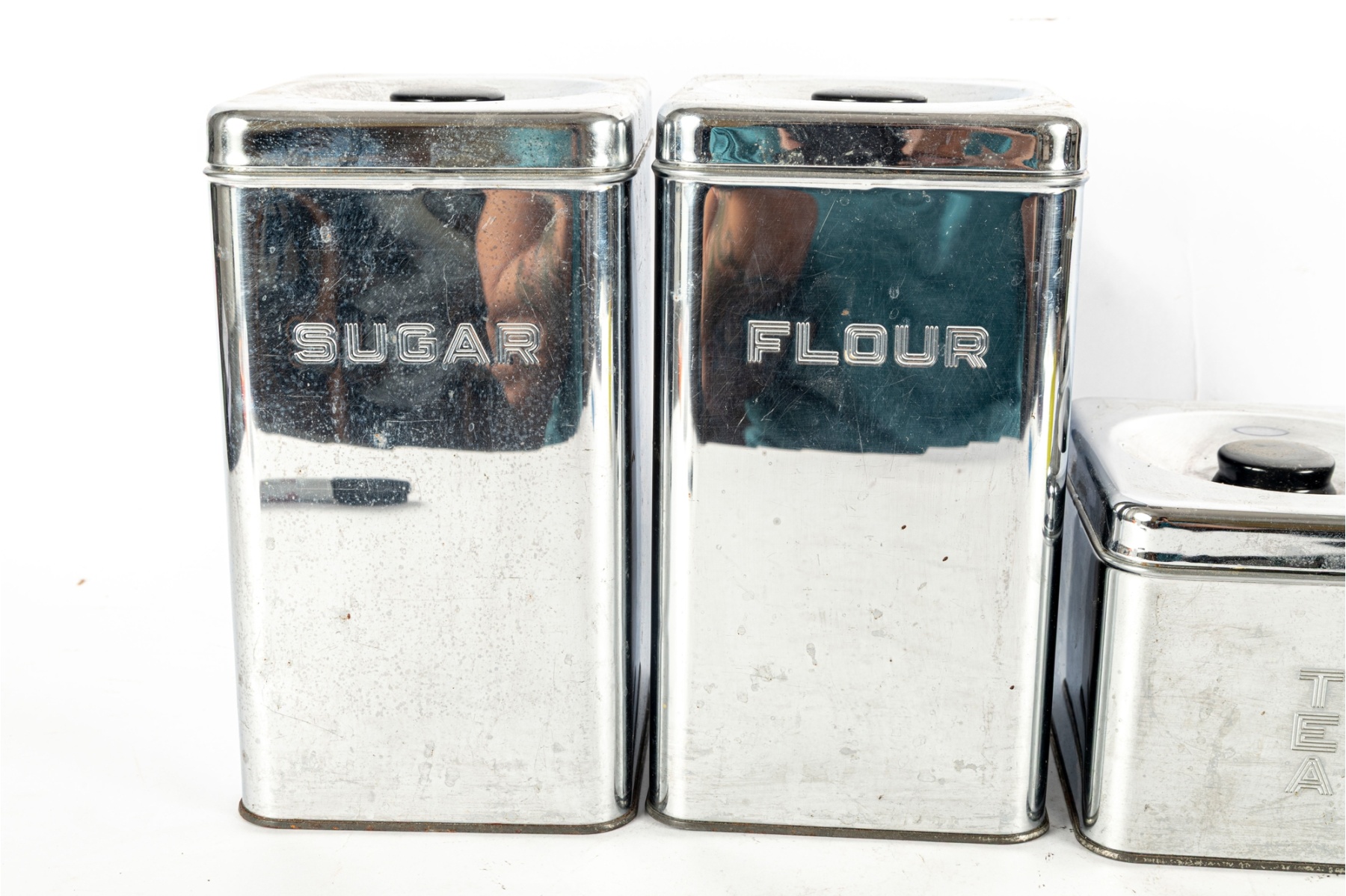 Mid-century modern Lincoln Beautyware chrome-plated canister set including Flour, Sugar, Coffee, and Tea containers. Each features black plastic knob lids and embossed lettering. Classic reflective finish and streamlined form, circa 1950sā60s.