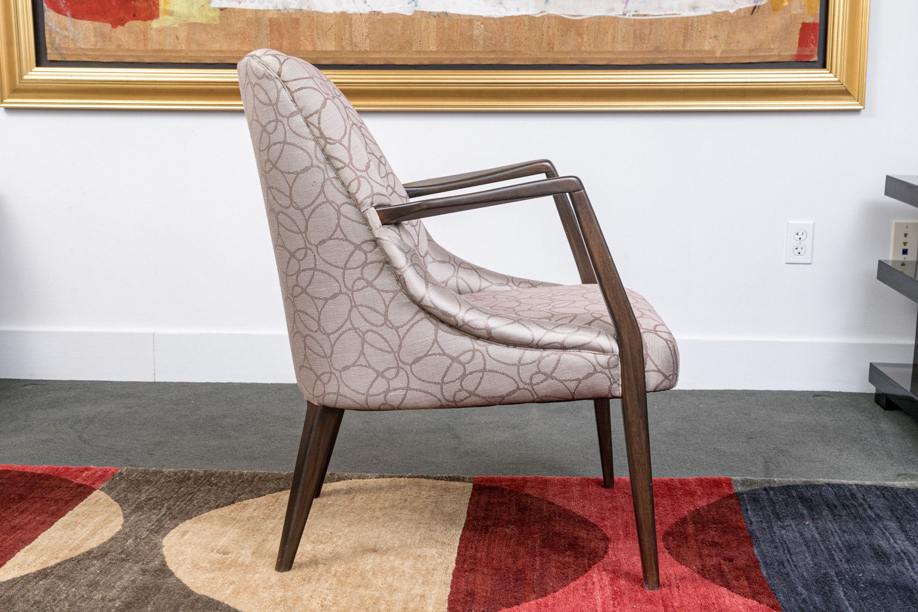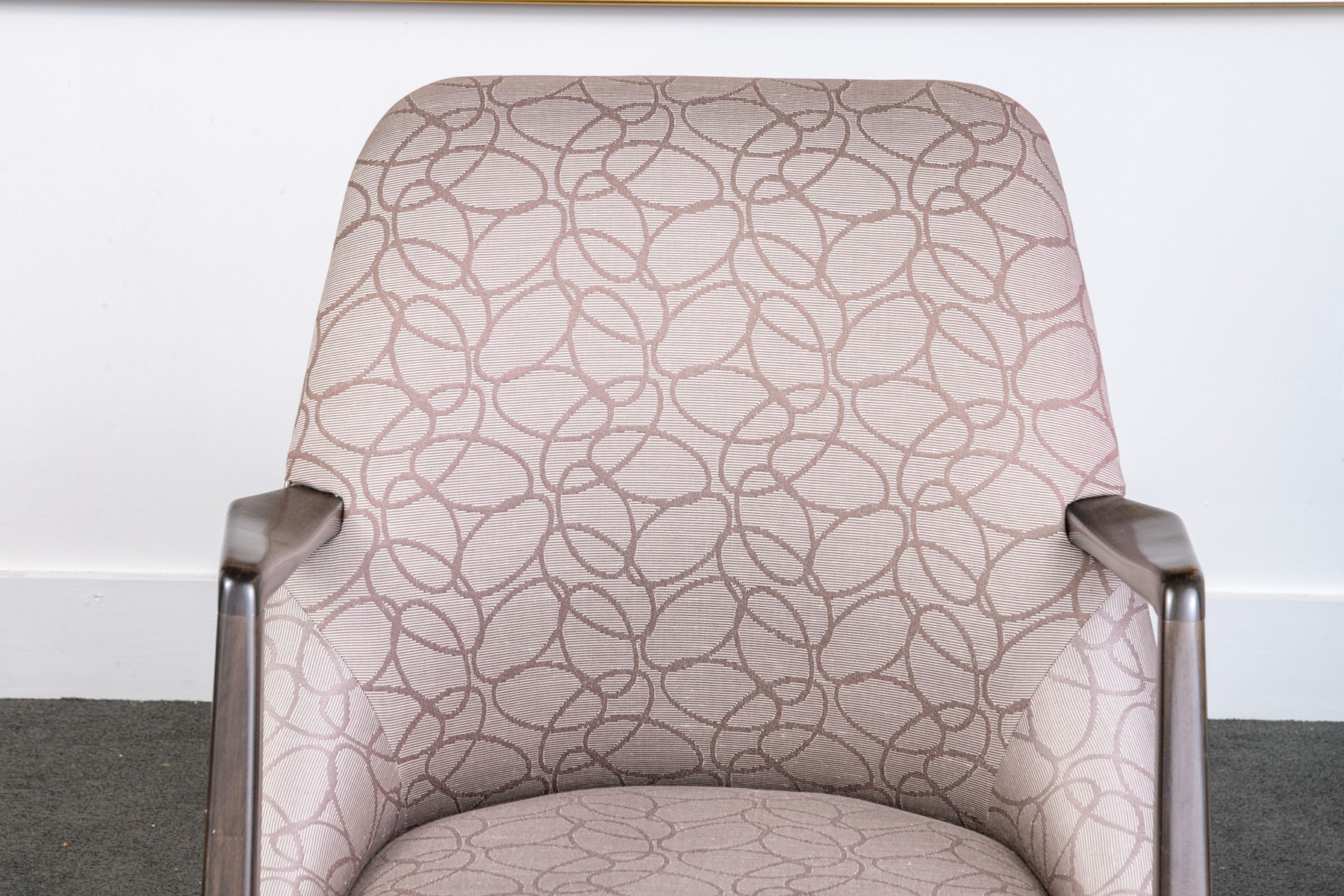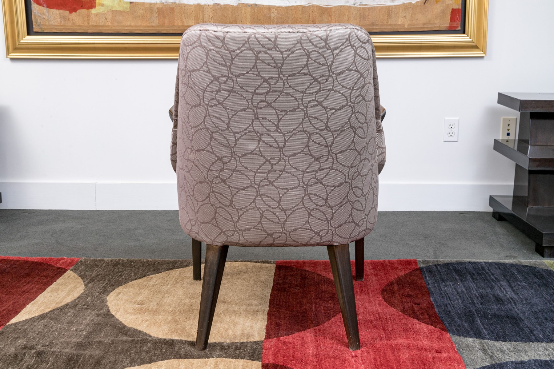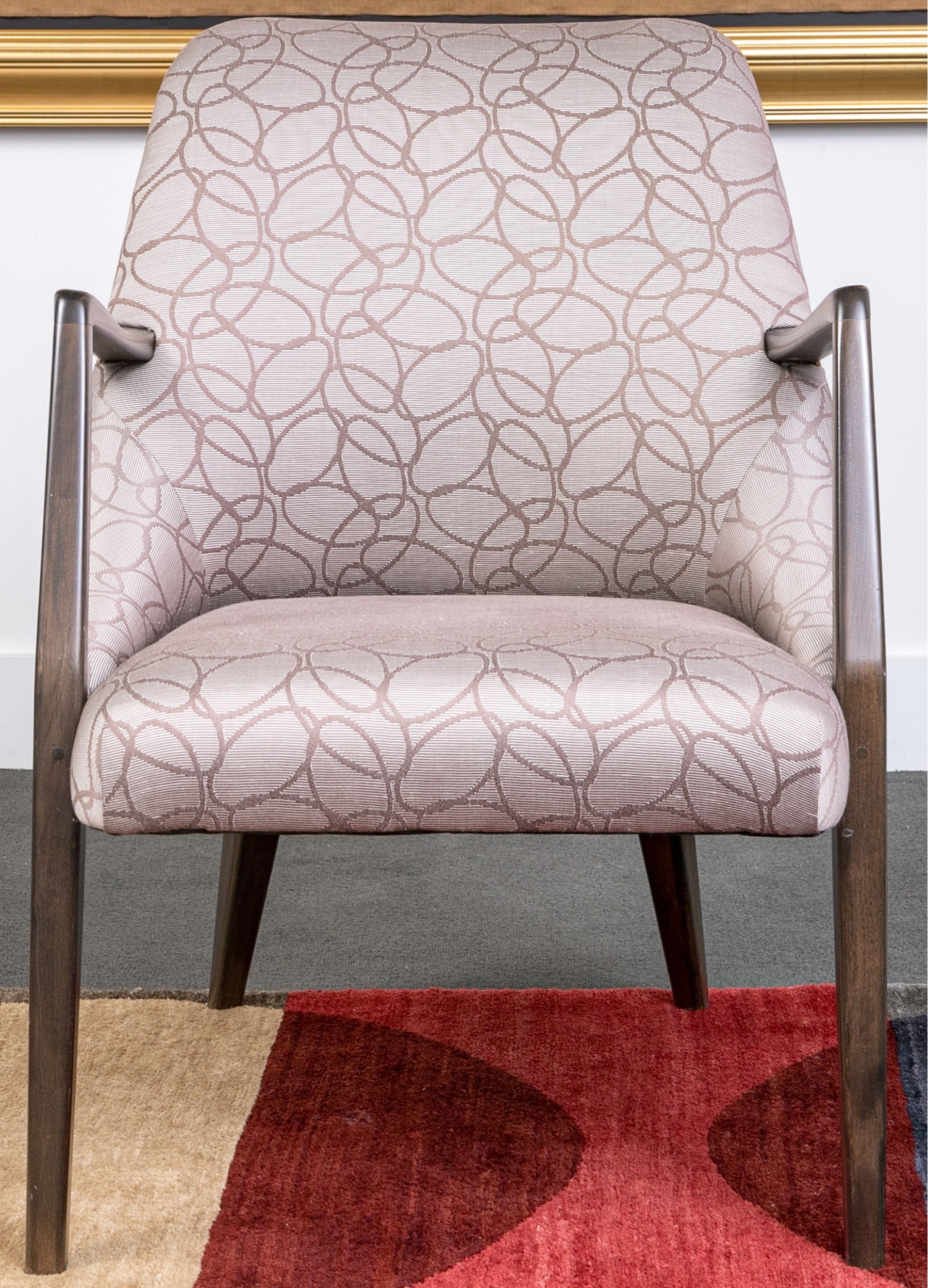 With sloping backs and sides tub form dark wood frames and open arms. Raised on tapering square splayed legs. Upholstered in a dark brown on gray-brown modern swirled print fabric.