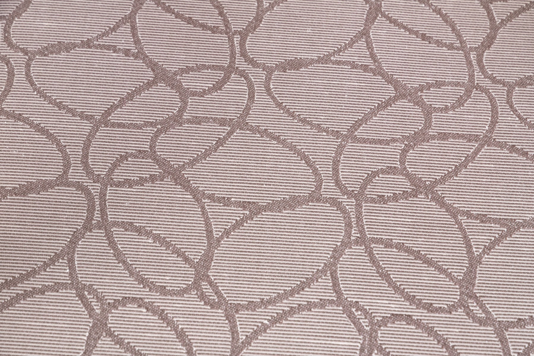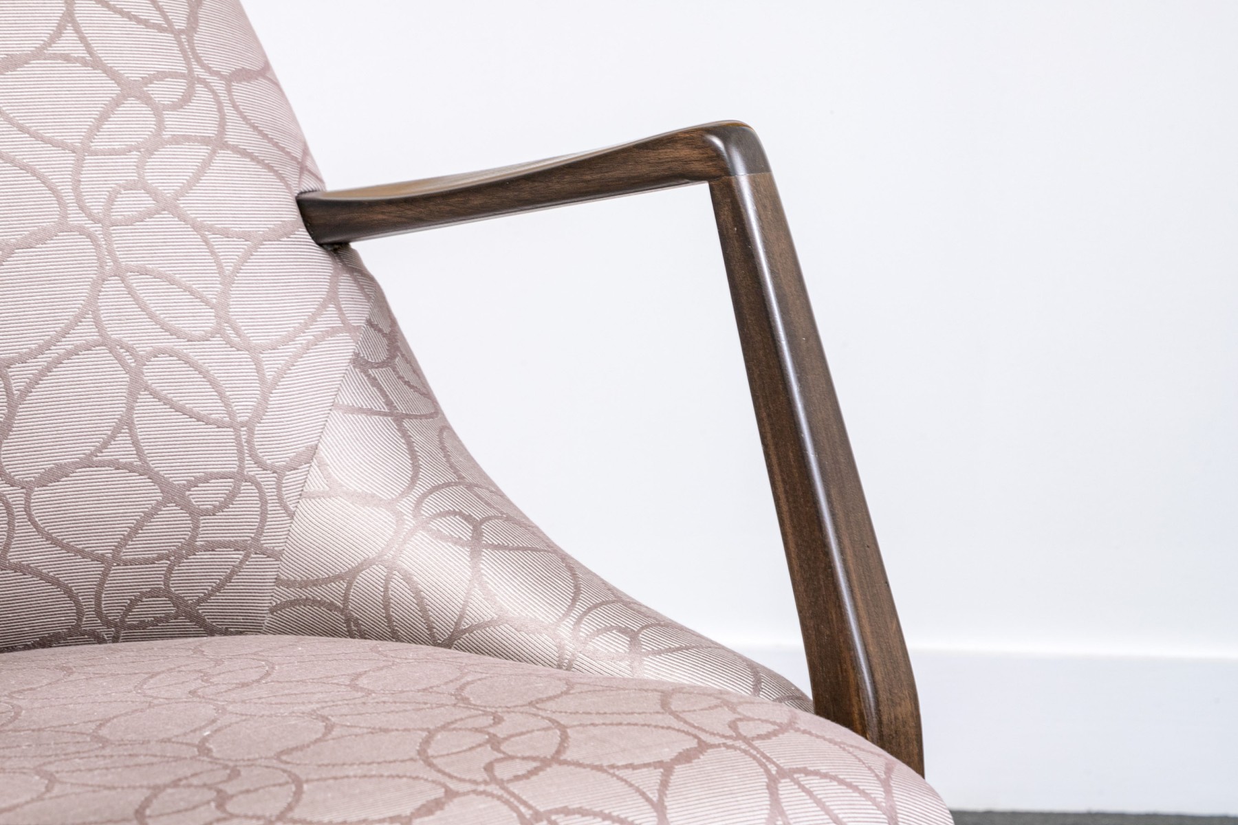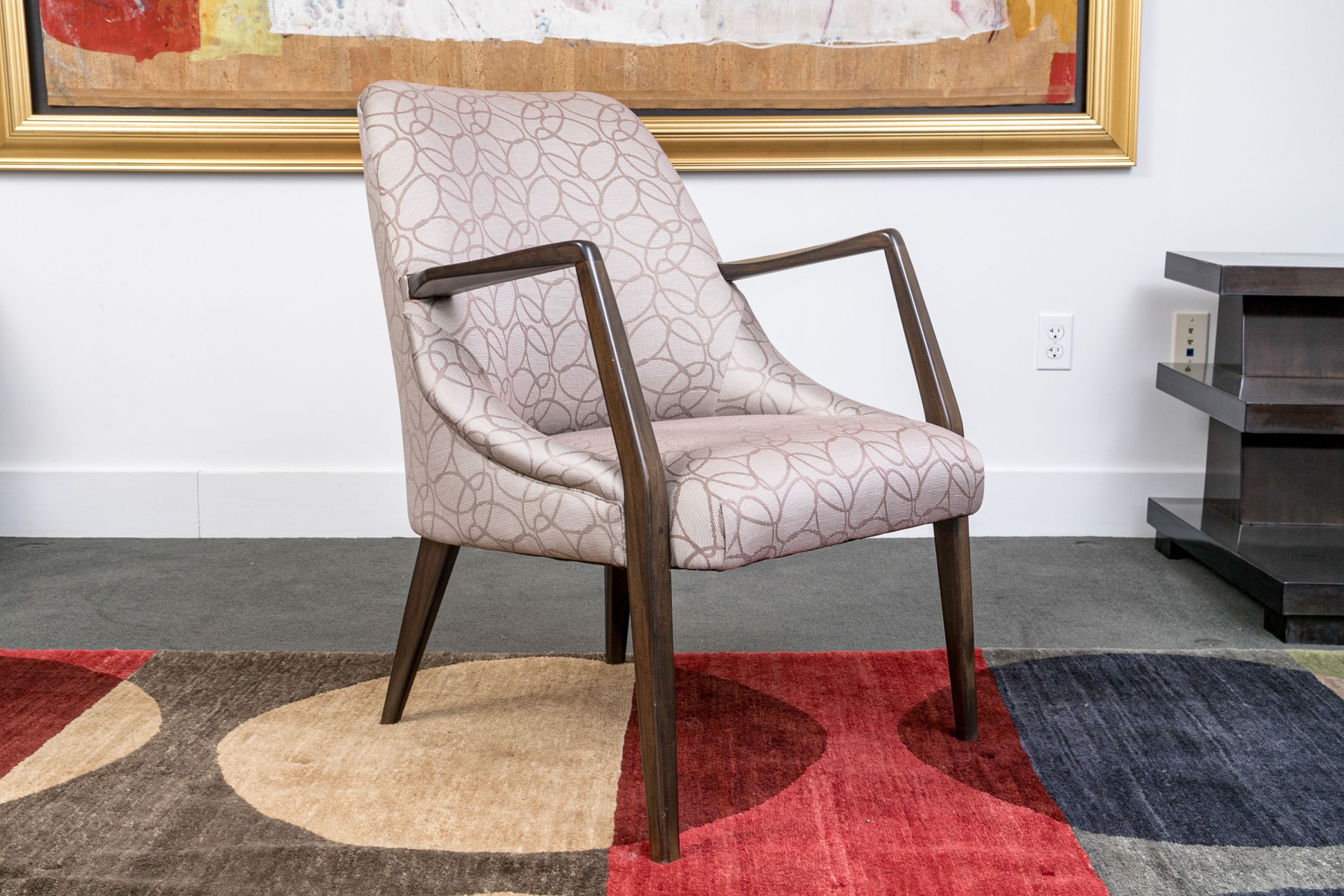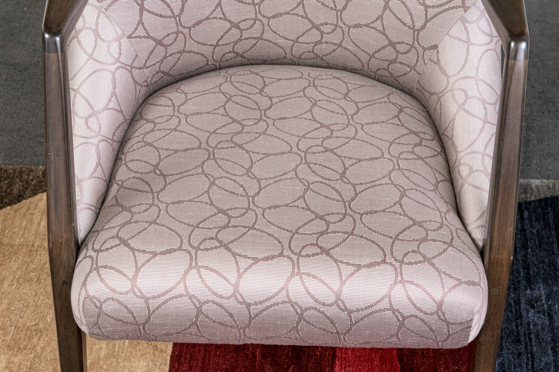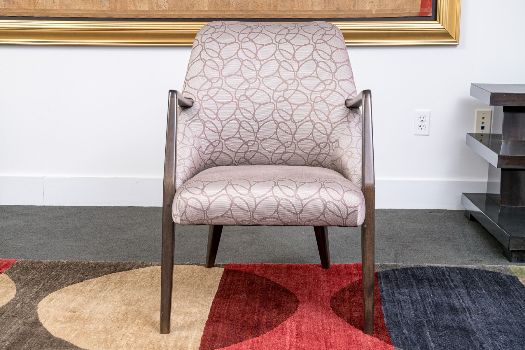 With sloping backs and sides tub form dark wood frames and open arms. Raised on tapering square splayed legs. Upholstered in a dark brown on gray-brown modern swirled print fabric.