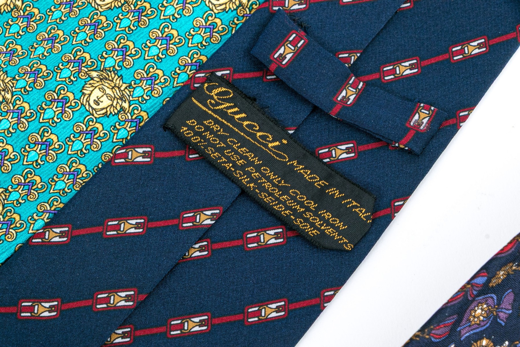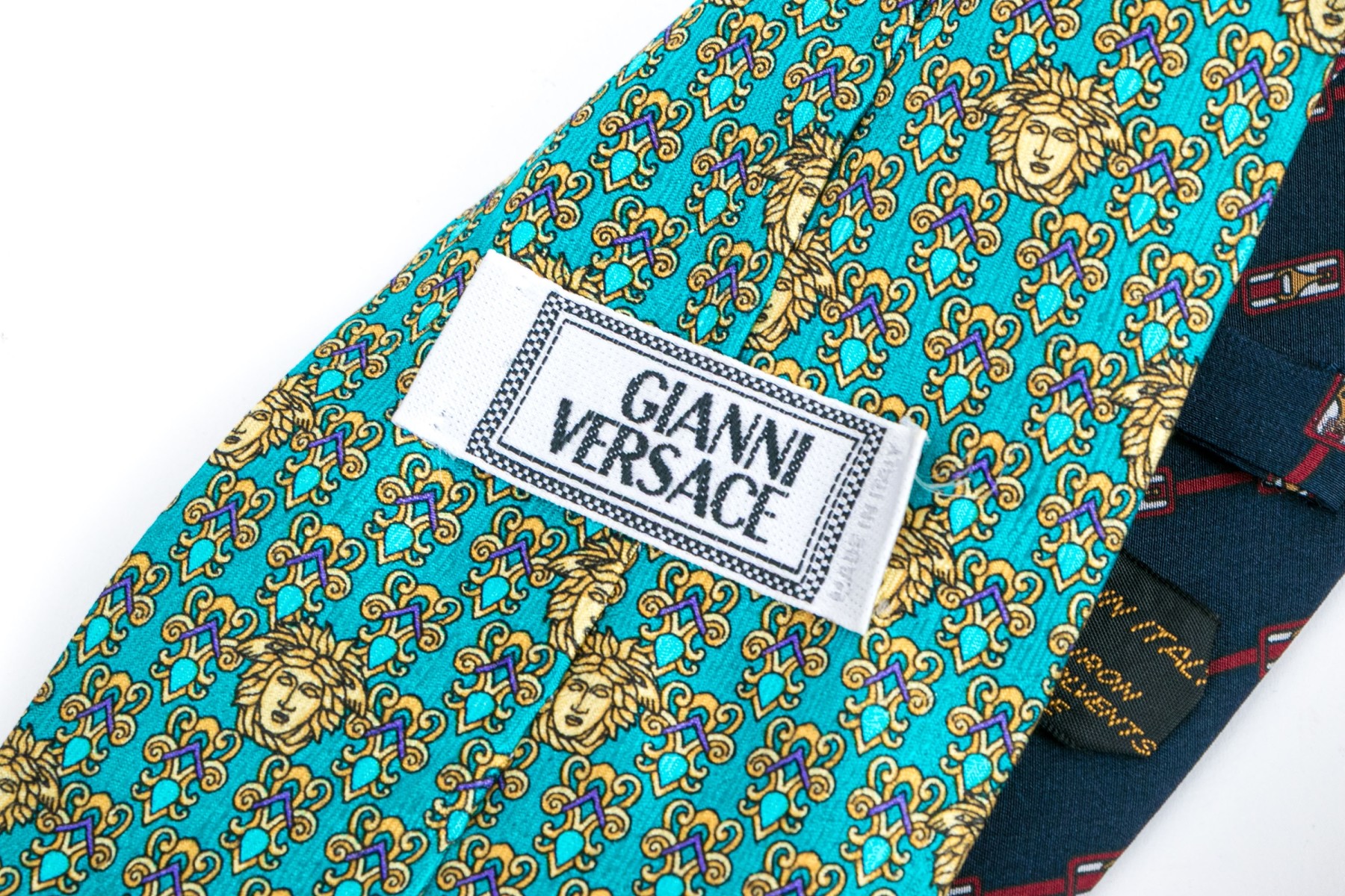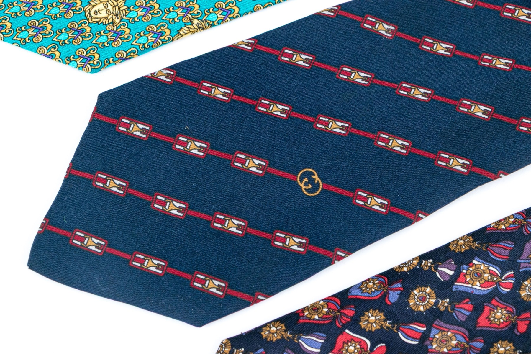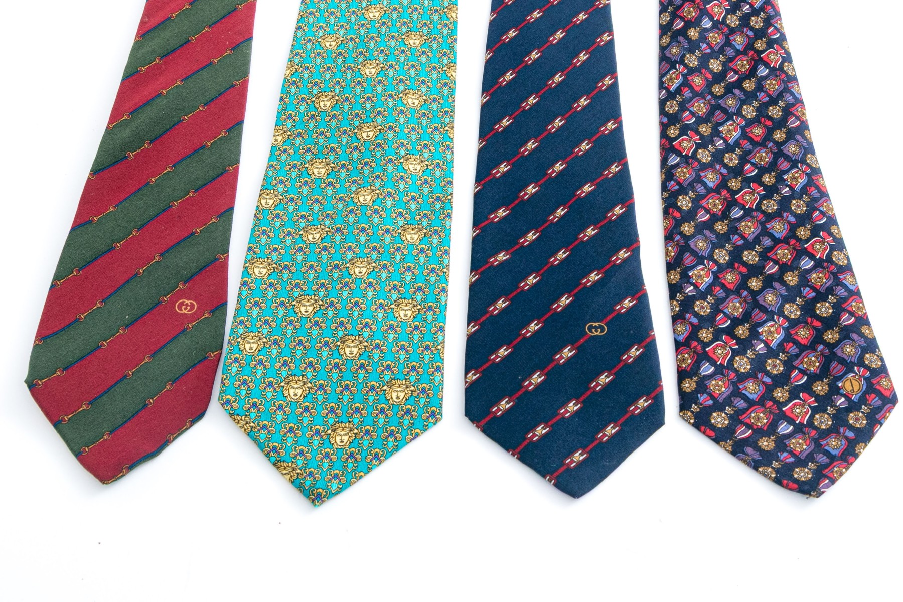 An excellent set of four high quality silk men's ties with makers including Gianni Versace, Gucci, and Dunhill. Each beautifully designed with classy patterns and vibrant colors.
