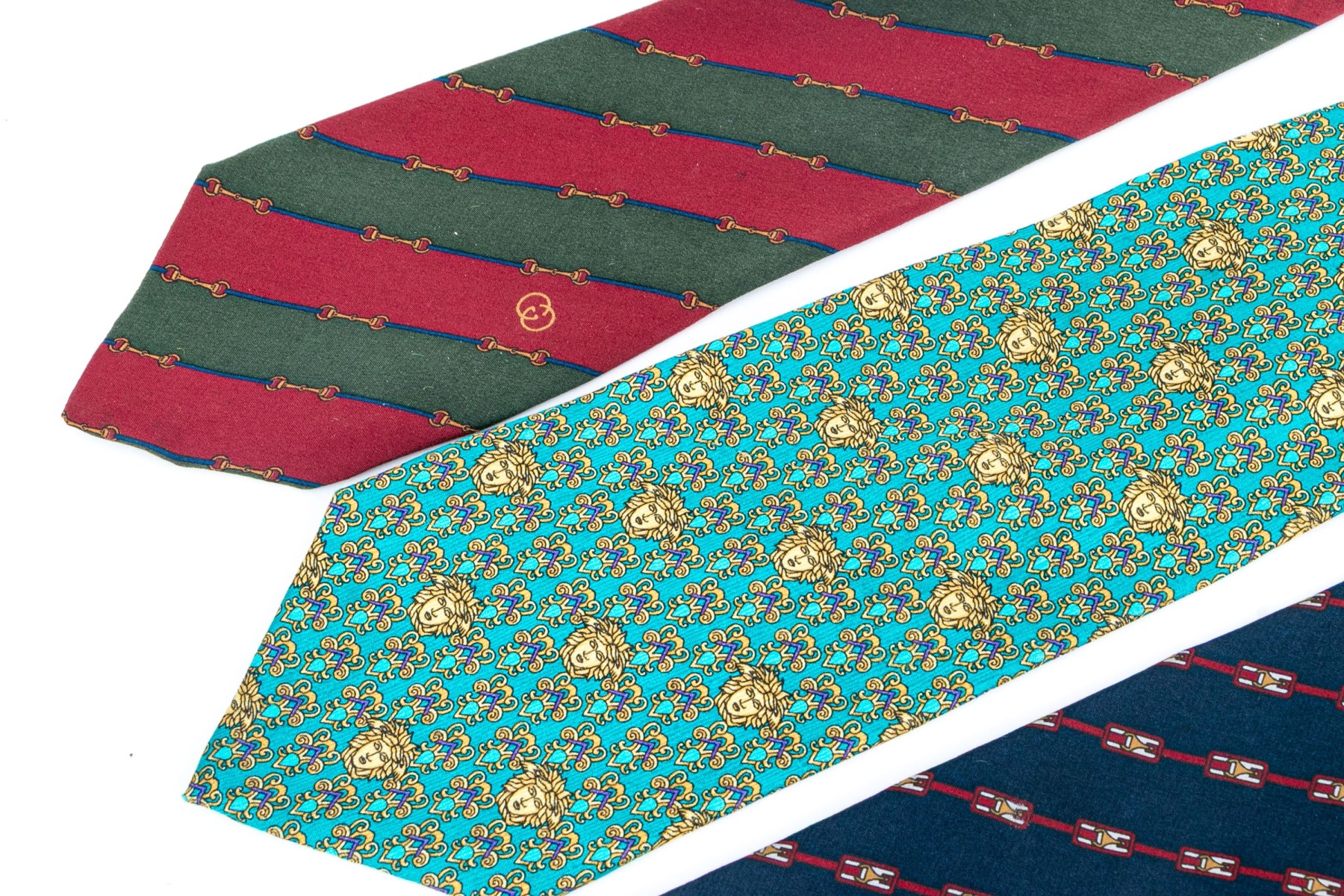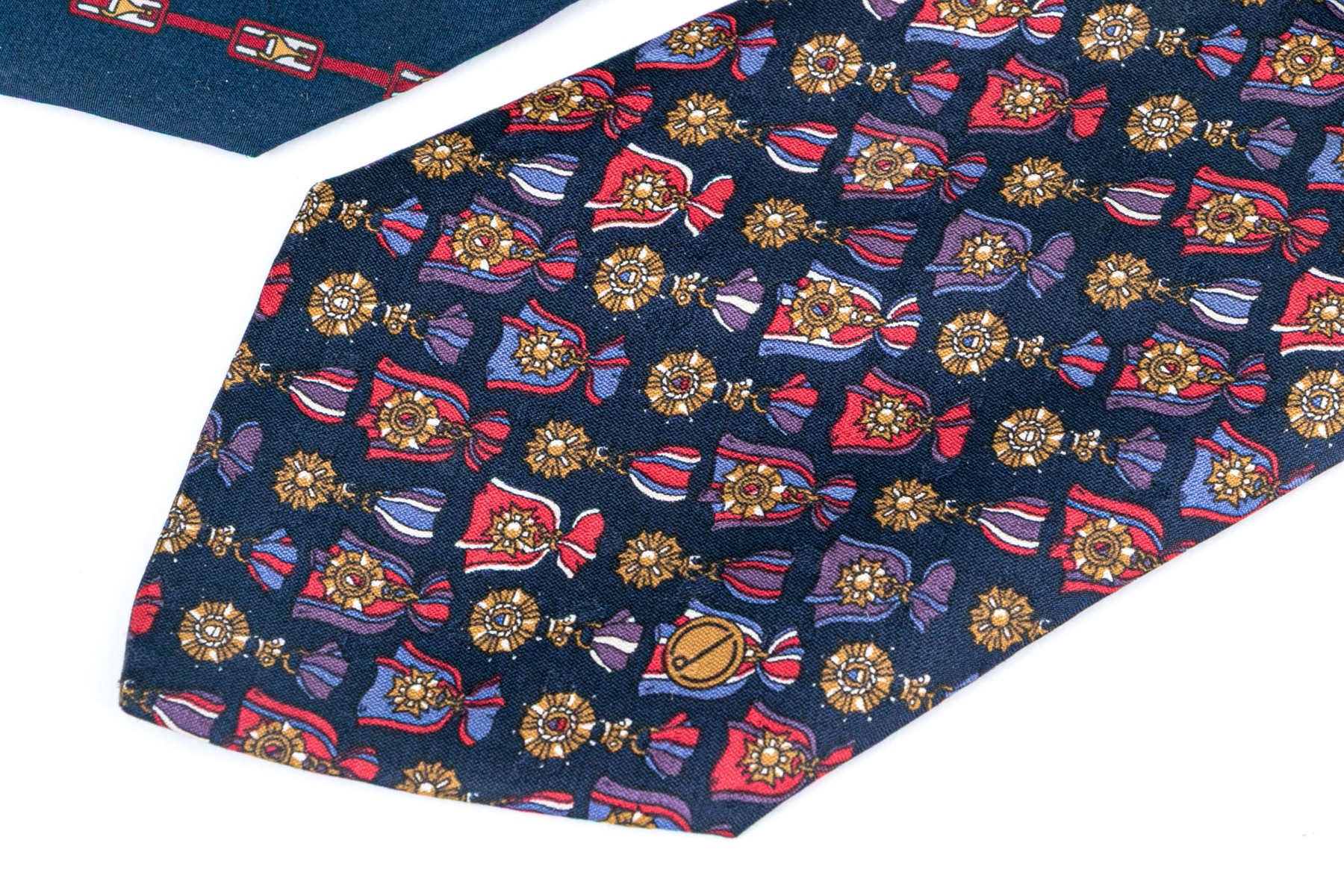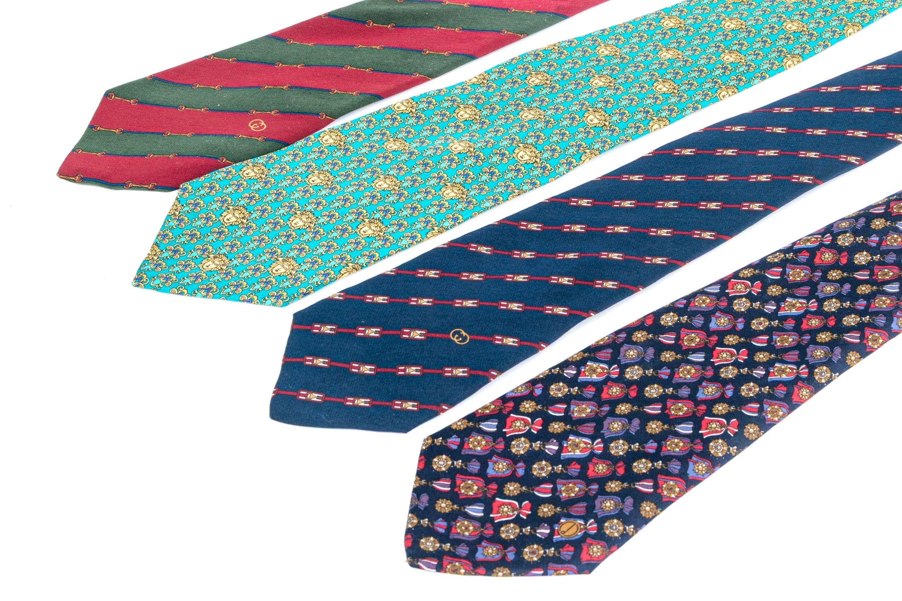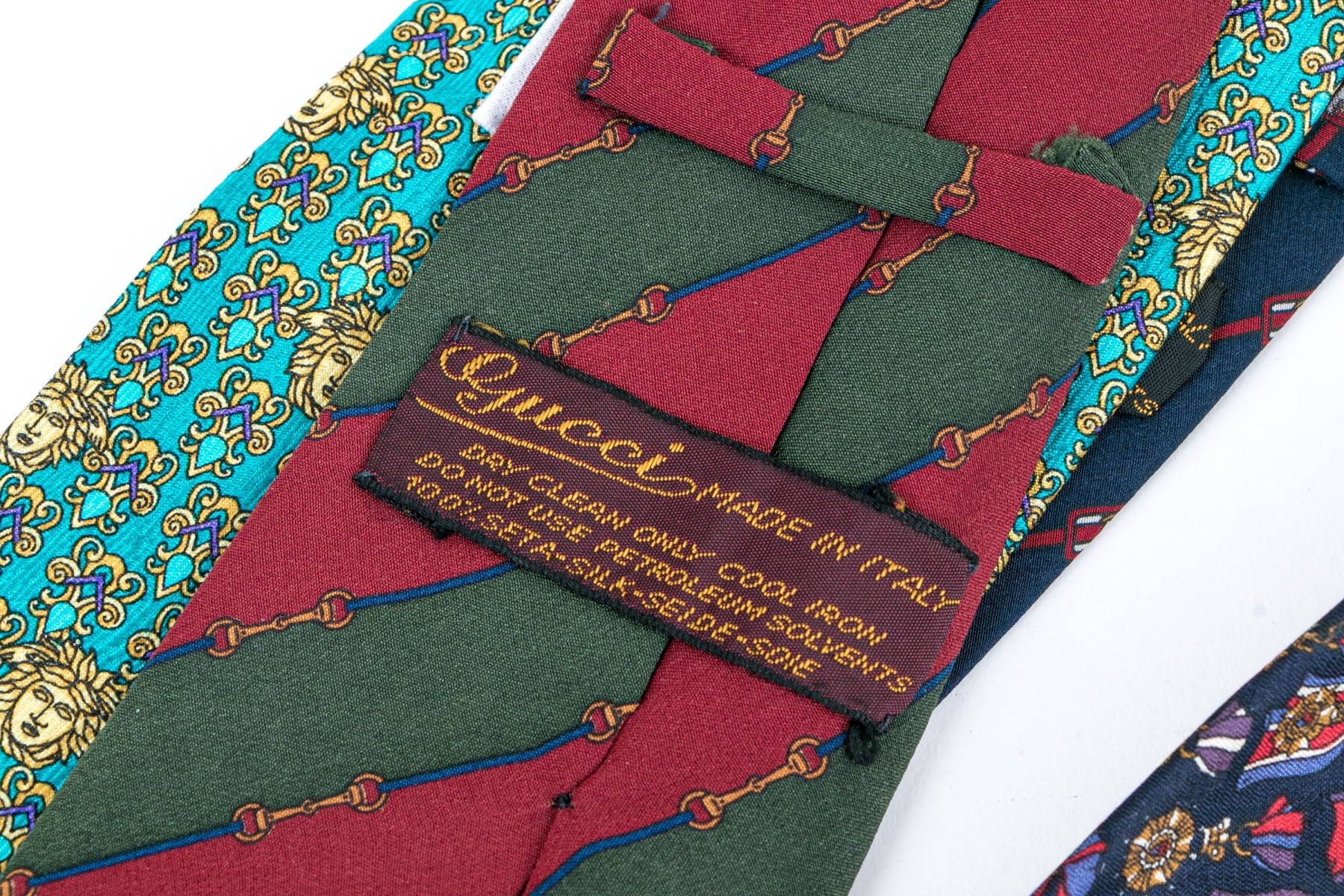 An excellent set of four high quality silk men's ties with makers including Gianni Versace, Gucci, and Dunhill. Each beautifully designed with classy patterns and vibrant colors.