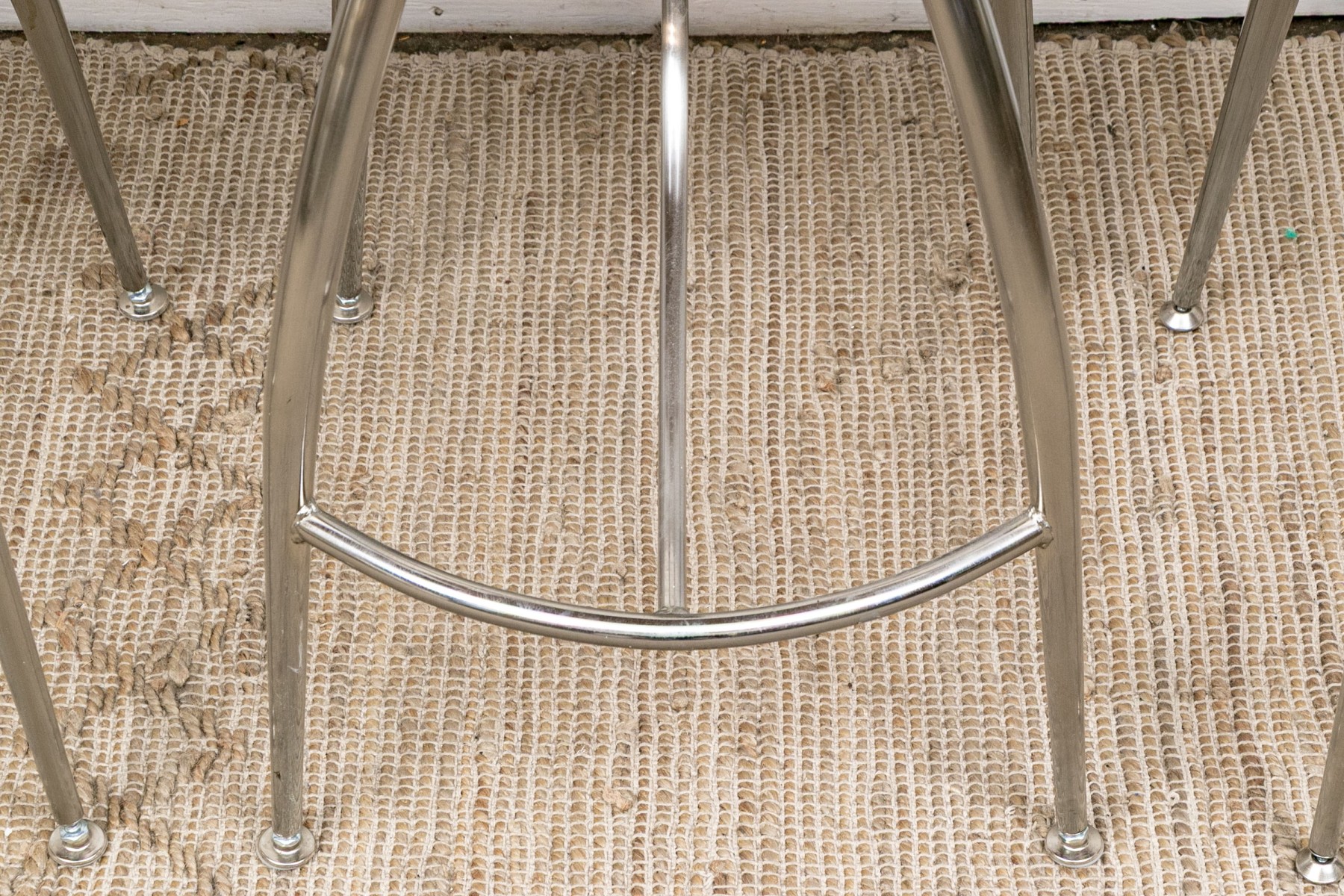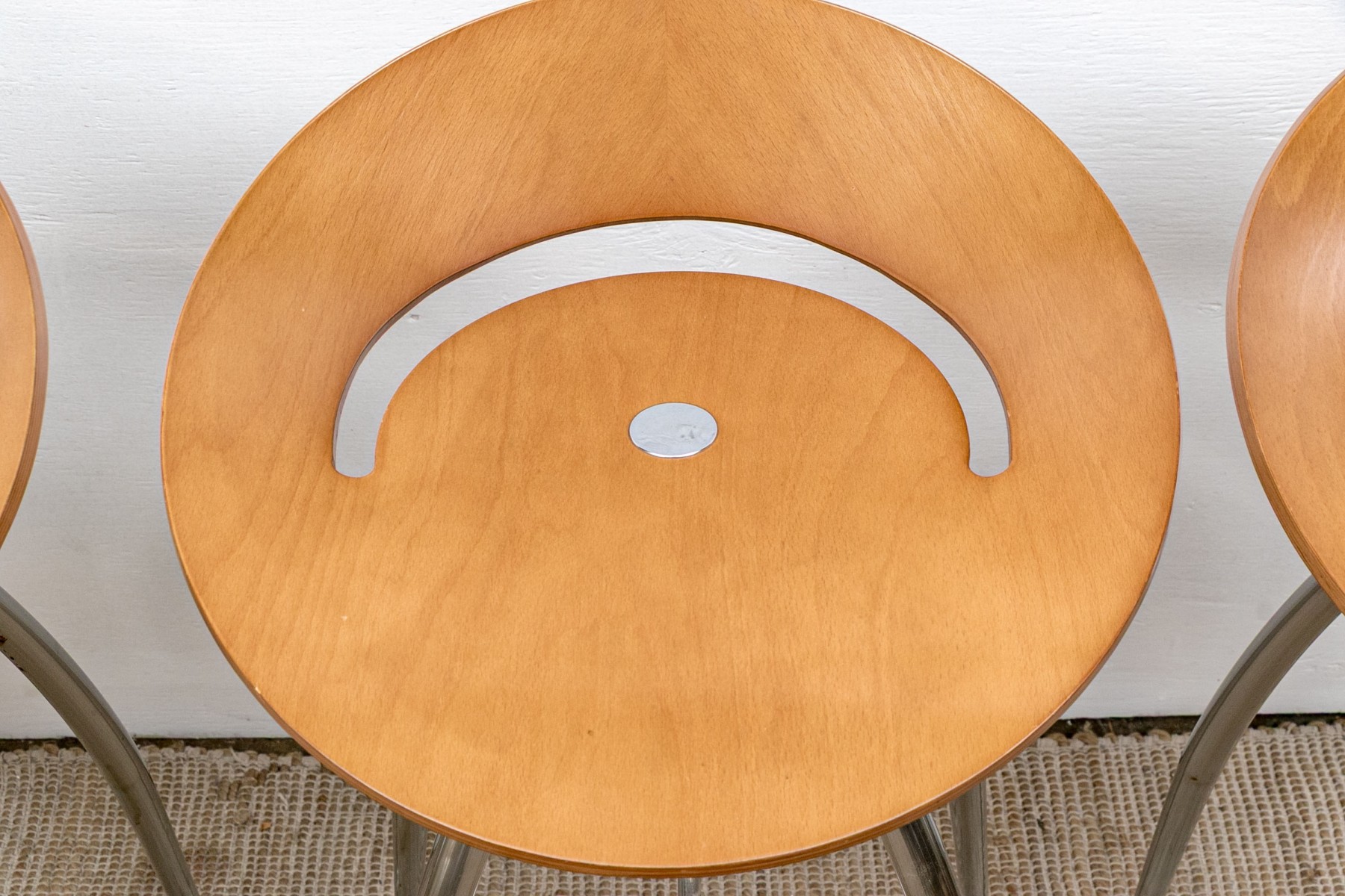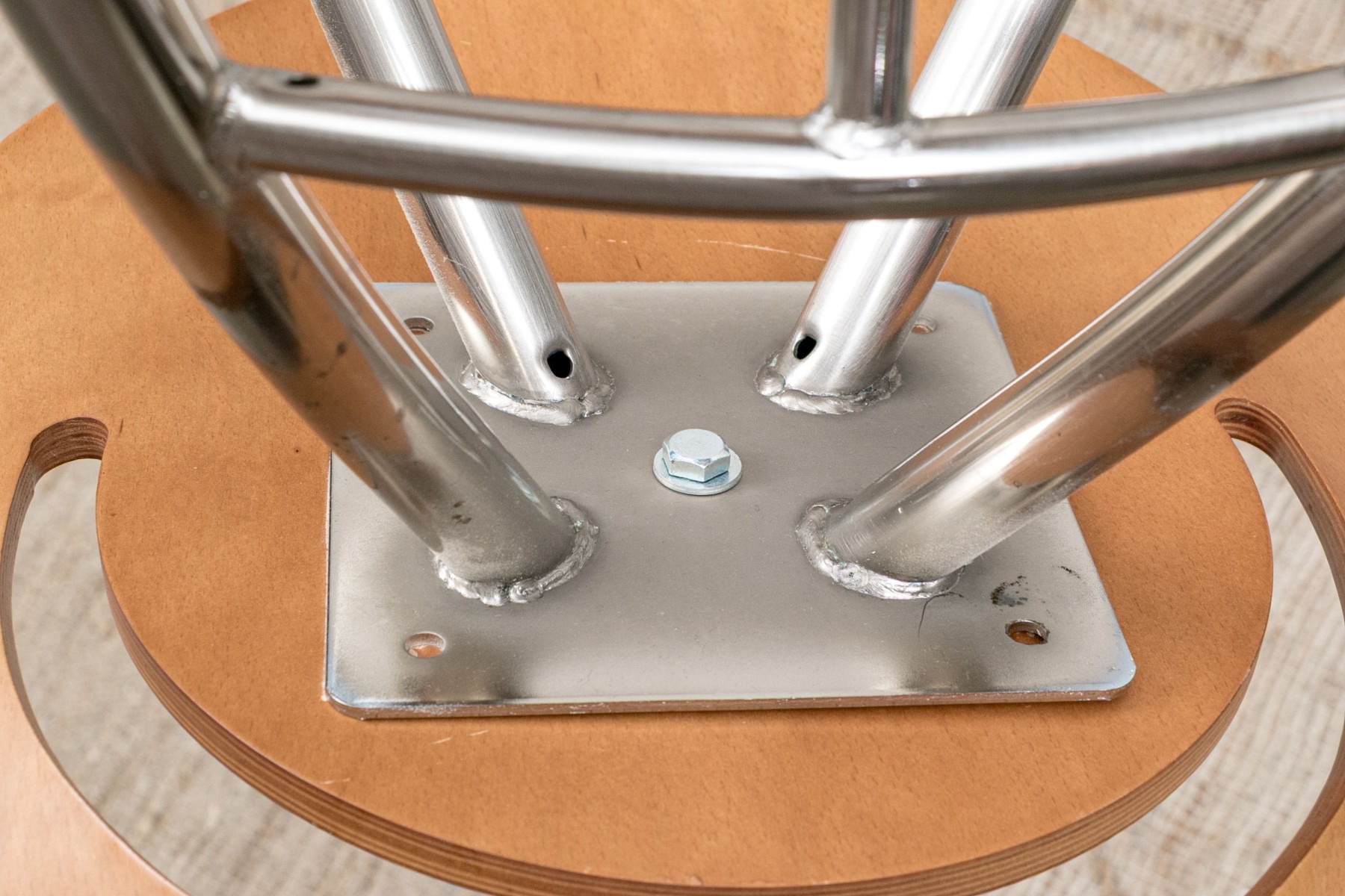 The round beech wood seat with a curved slit on the back and a center metal roundel for the base attachment. With a chrome plated steel frame, raised on four curved metal legs with outcurved front and back stretchers and a center arched stretcher.