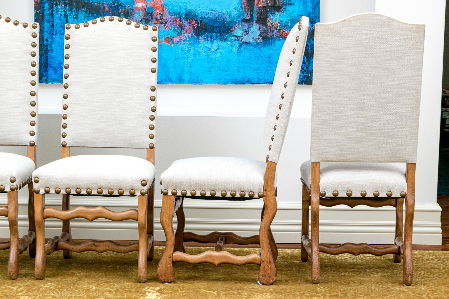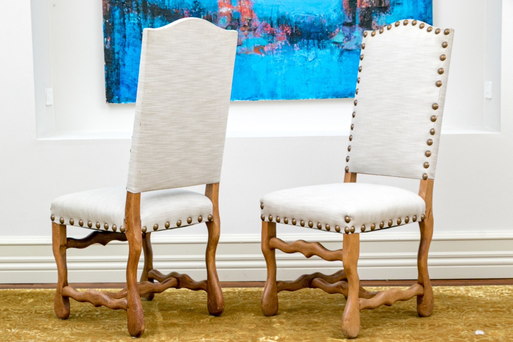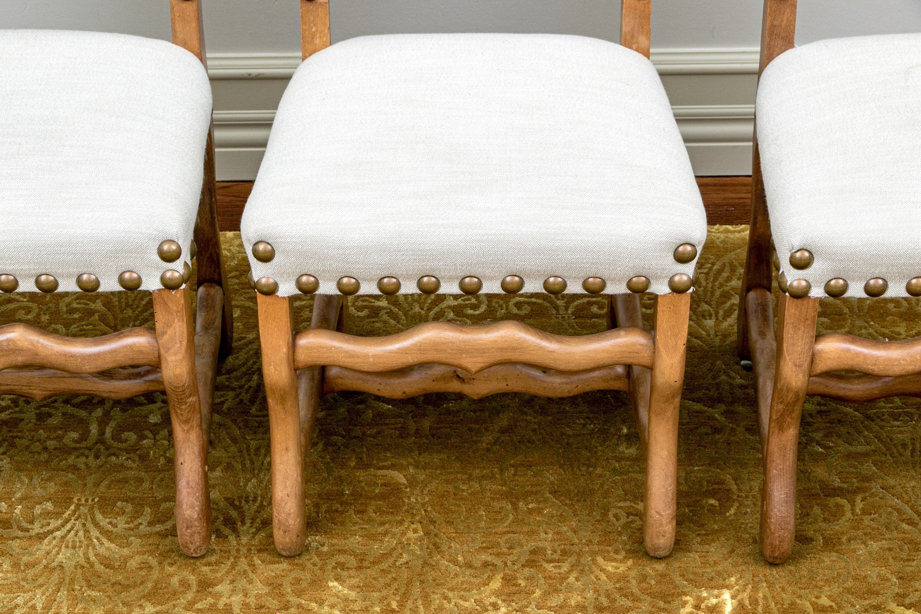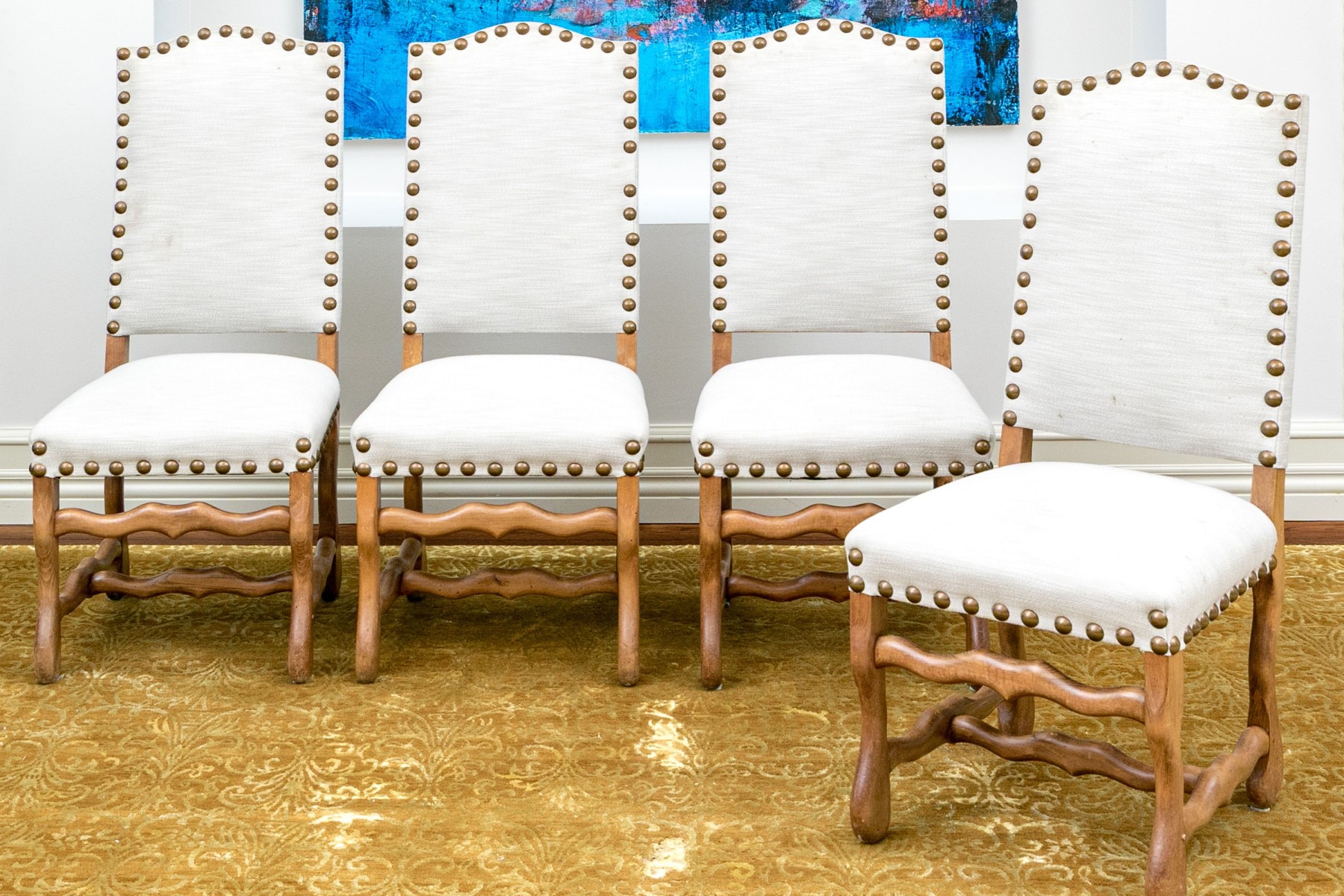 A fabulous set of four Louis XIII style dining chairs beautifully designed with tall camel backs and nicely plumped seats upholstered in flaxen white fabric with statement oversized brass nailhead trims. Chairs are supported by solid fruitwood frames in appealing honeyed brown hues, well carved with mutton legs and shapely H-stretchers with additional rails along the fronts.