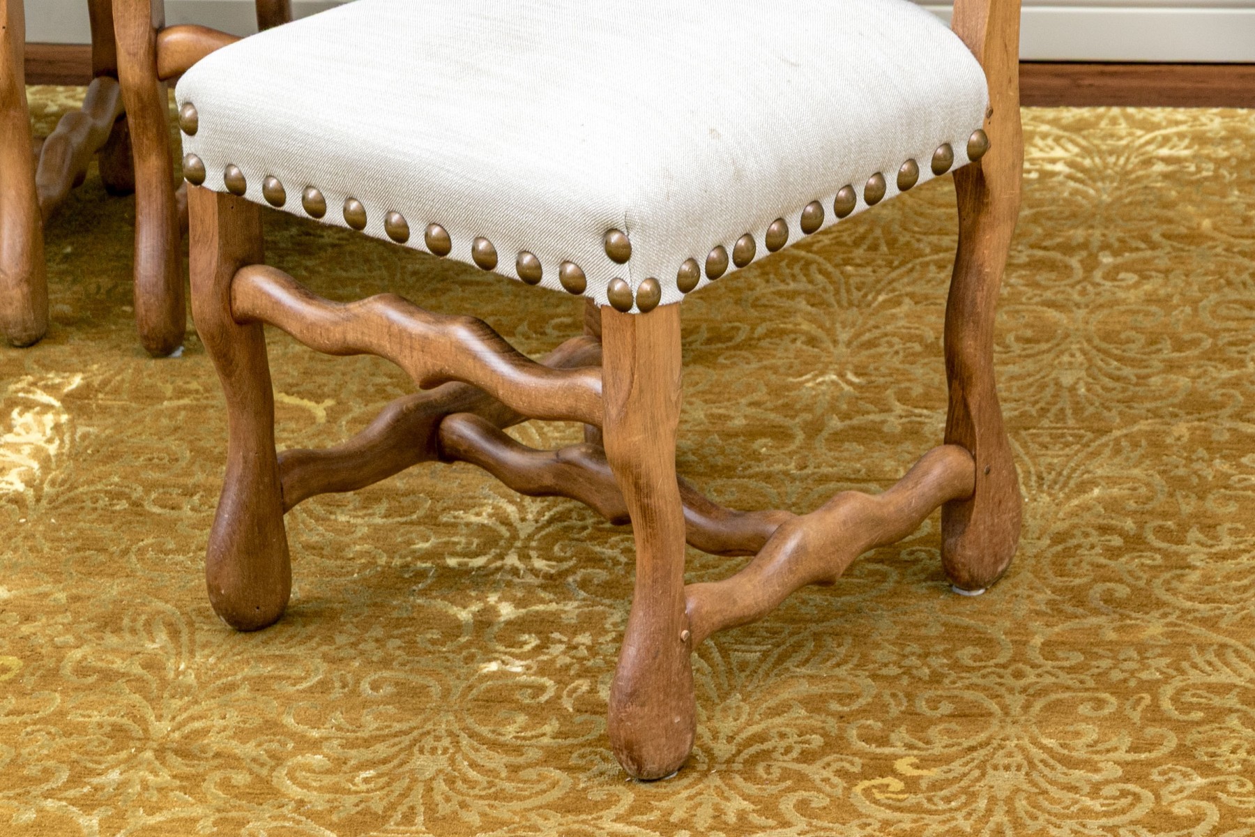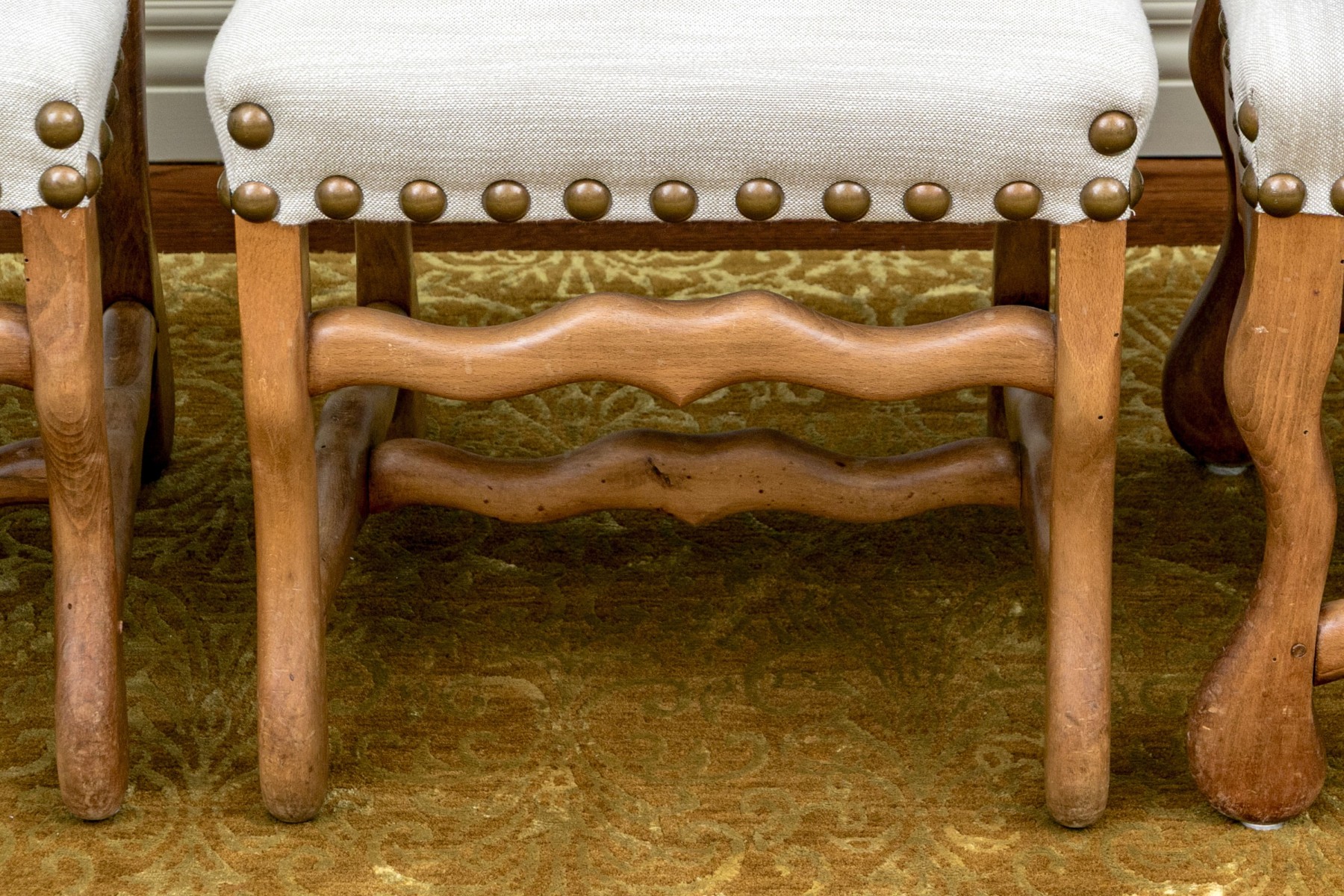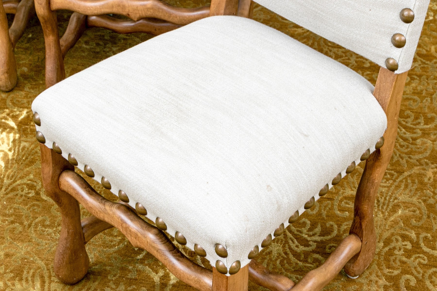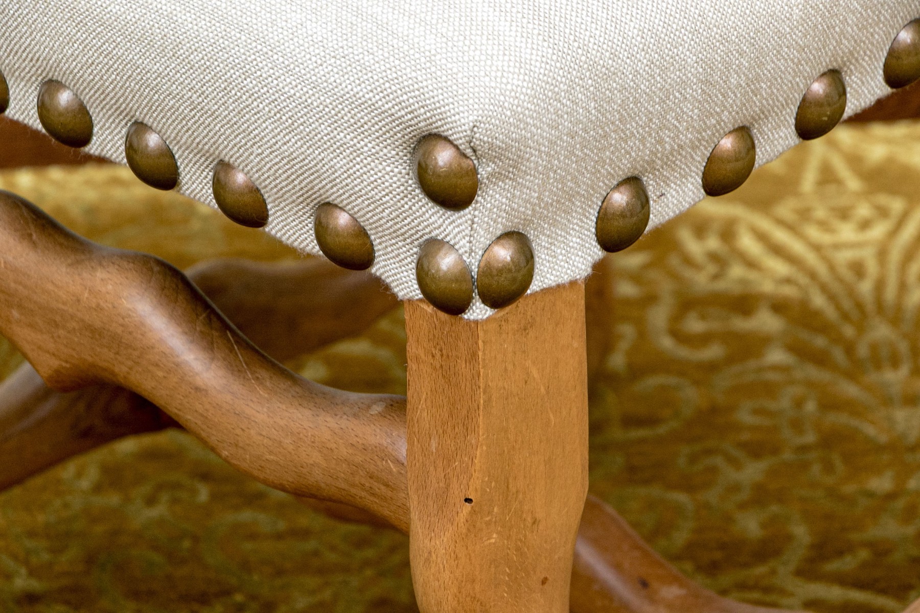 A fabulous set of four Louis XIII style dining chairs beautifully designed with tall camel backs and nicely plumped seats upholstered in flaxen white fabric with statement oversized brass nailhead trims. Chairs are supported by solid fruitwood frames in appealing honeyed brown hues, well carved with mutton legs and shapely H-stretchers with additional rails along the fronts.