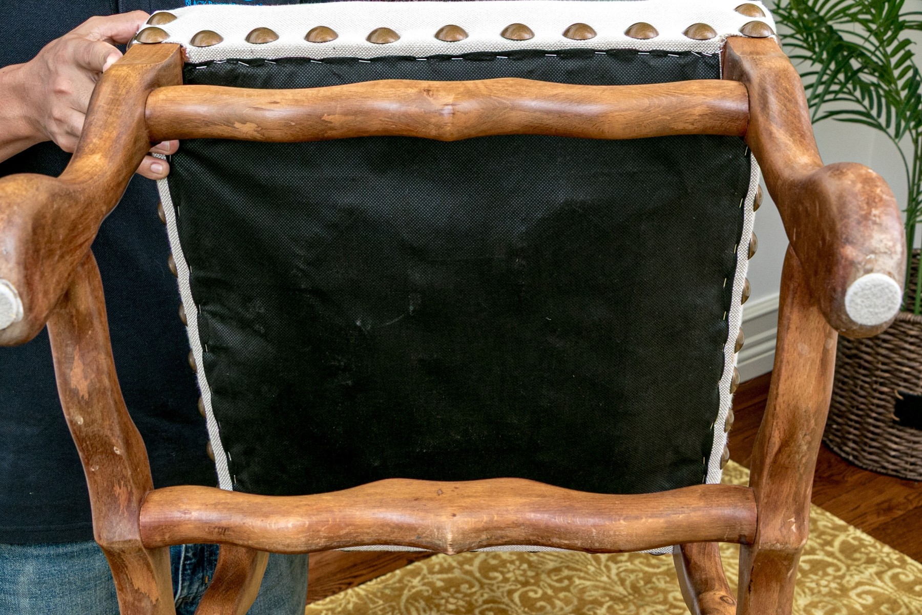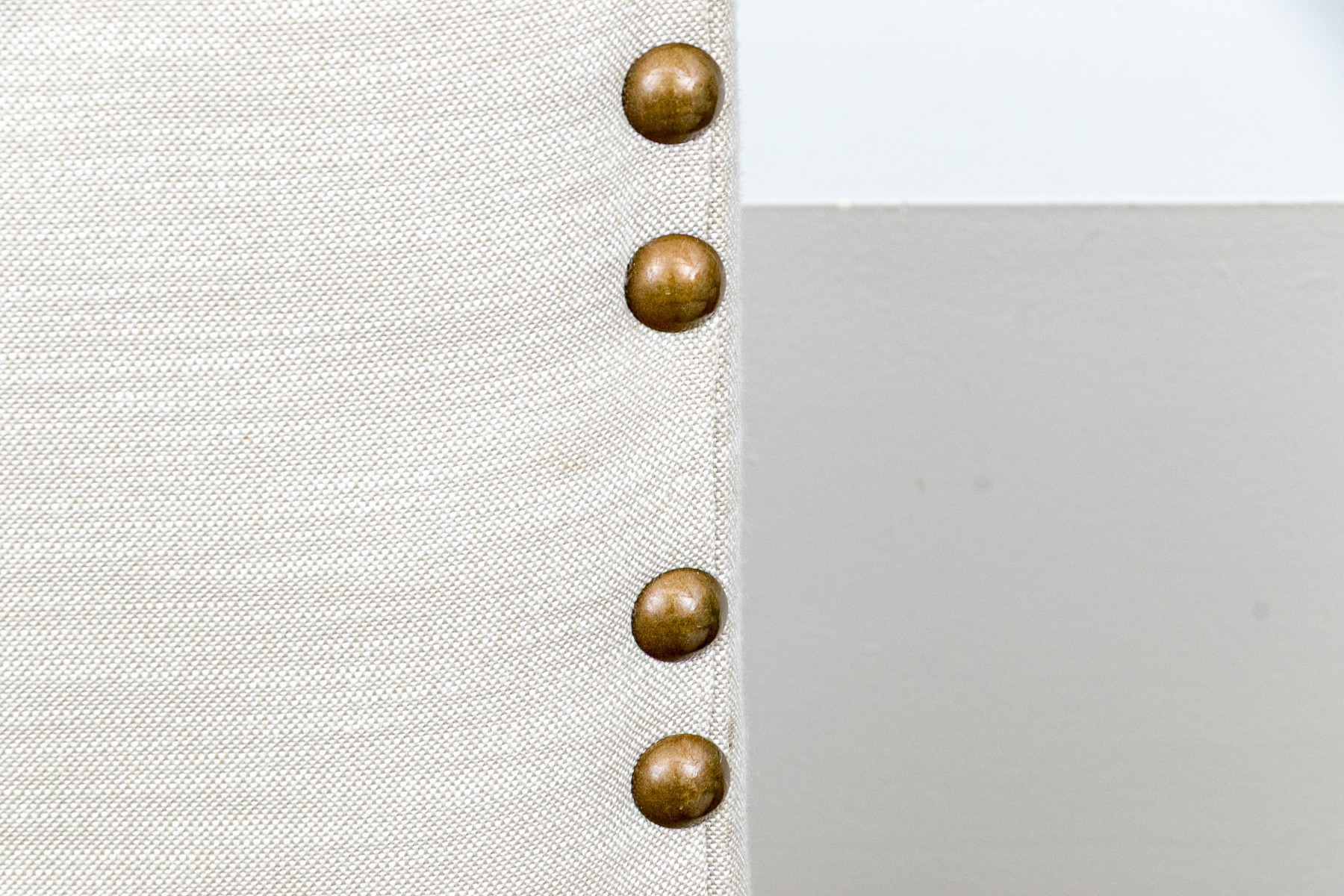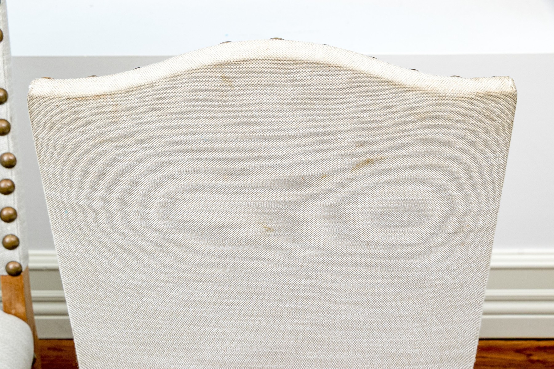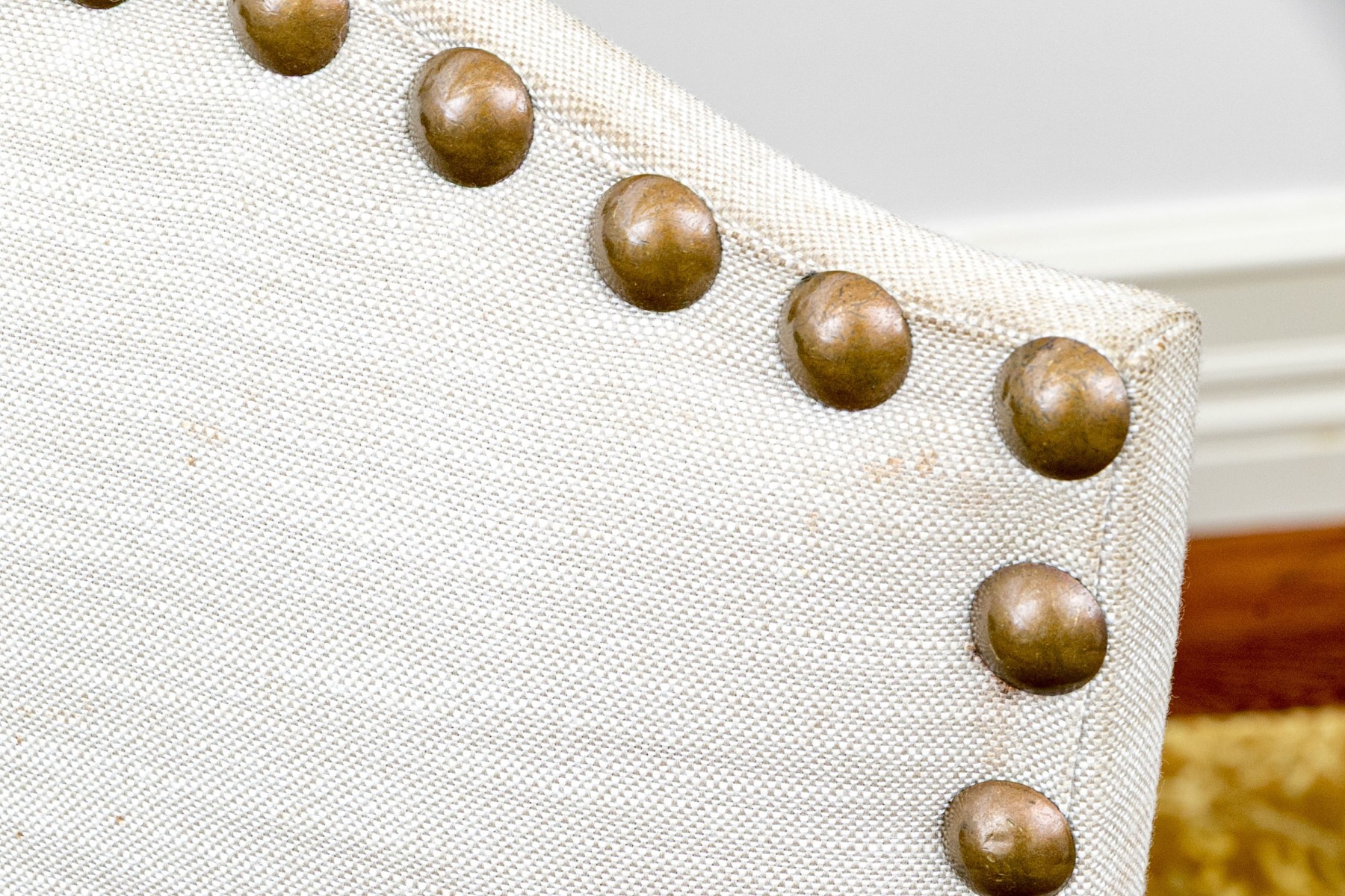 A fabulous set of four Louis XIII style dining chairs beautifully designed with tall camel backs and nicely plumped seats upholstered in flaxen white fabric with statement oversized brass nailhead trims. Chairs are supported by solid fruitwood frames in appealing honeyed brown hues, well carved with mutton legs and shapely H-stretchers with additional rails along the fronts.